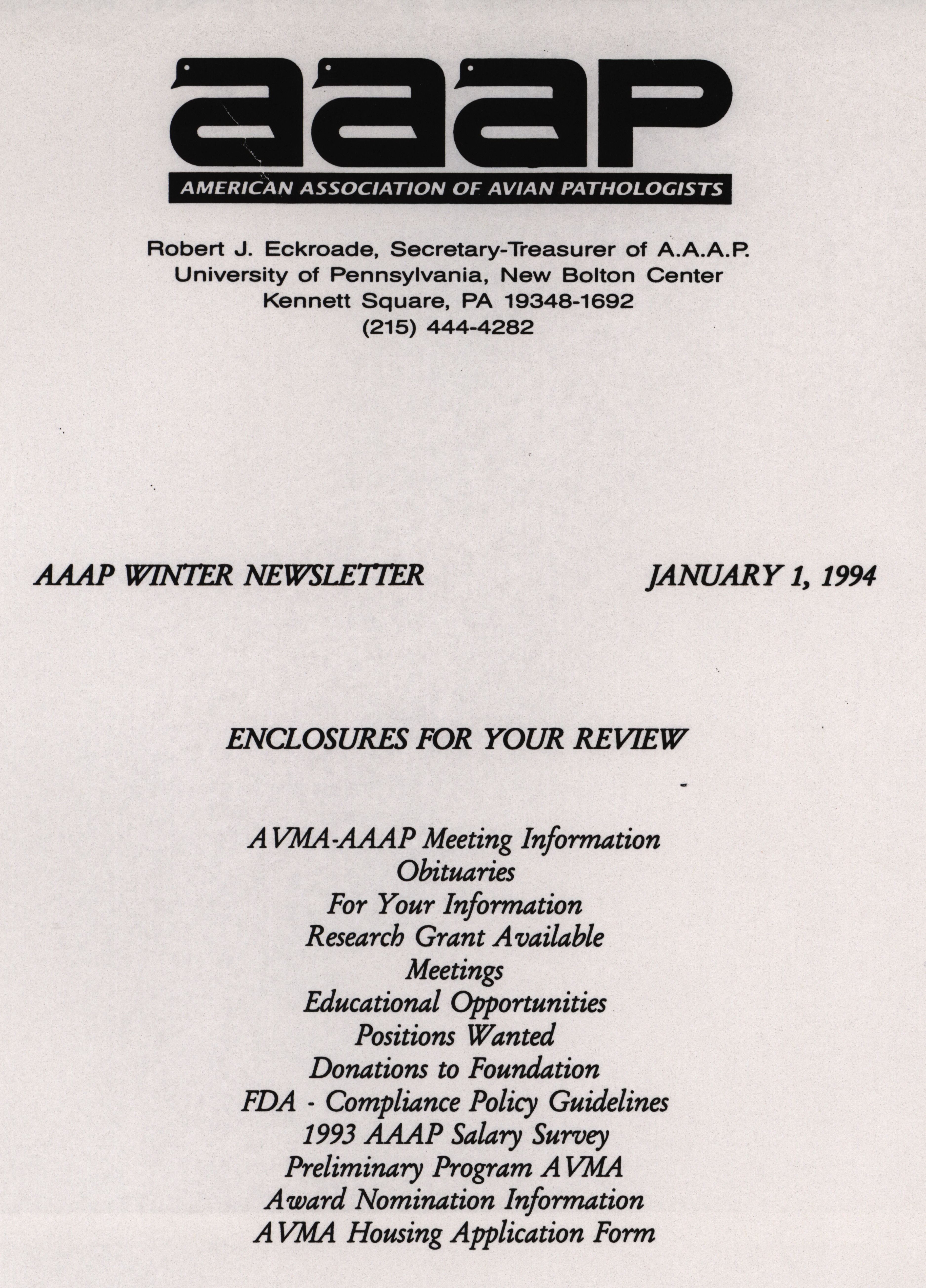 - The winter newsletter of the American Association of Avian Pathologists, January 1, 1994. The quarterly newsletter features several different topics, including AVMA (American Veterinary Medical Association)-AAAP meeting information and preliminary program, FDA compliance policy guidelines and the 1993 AAAP salary survey.