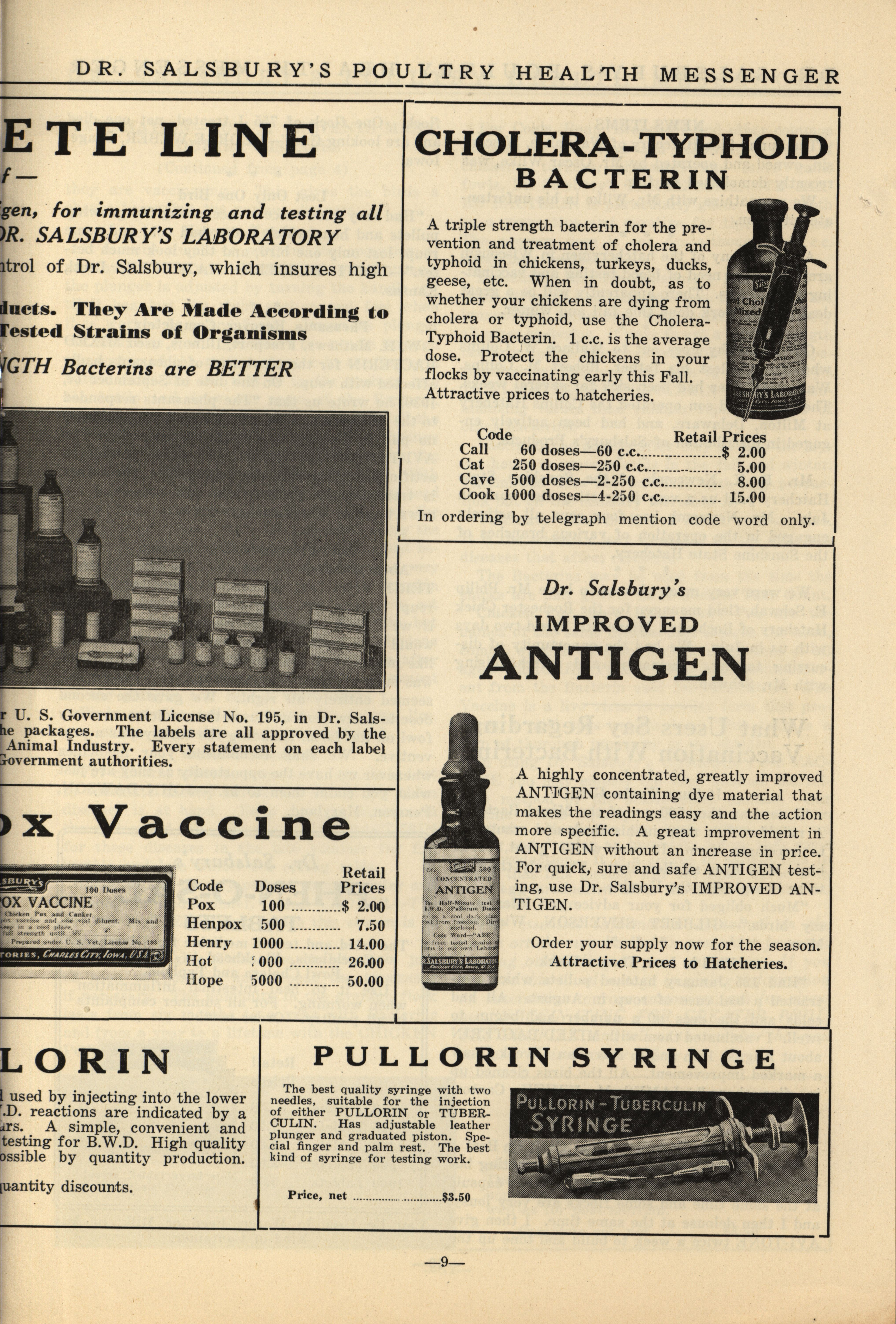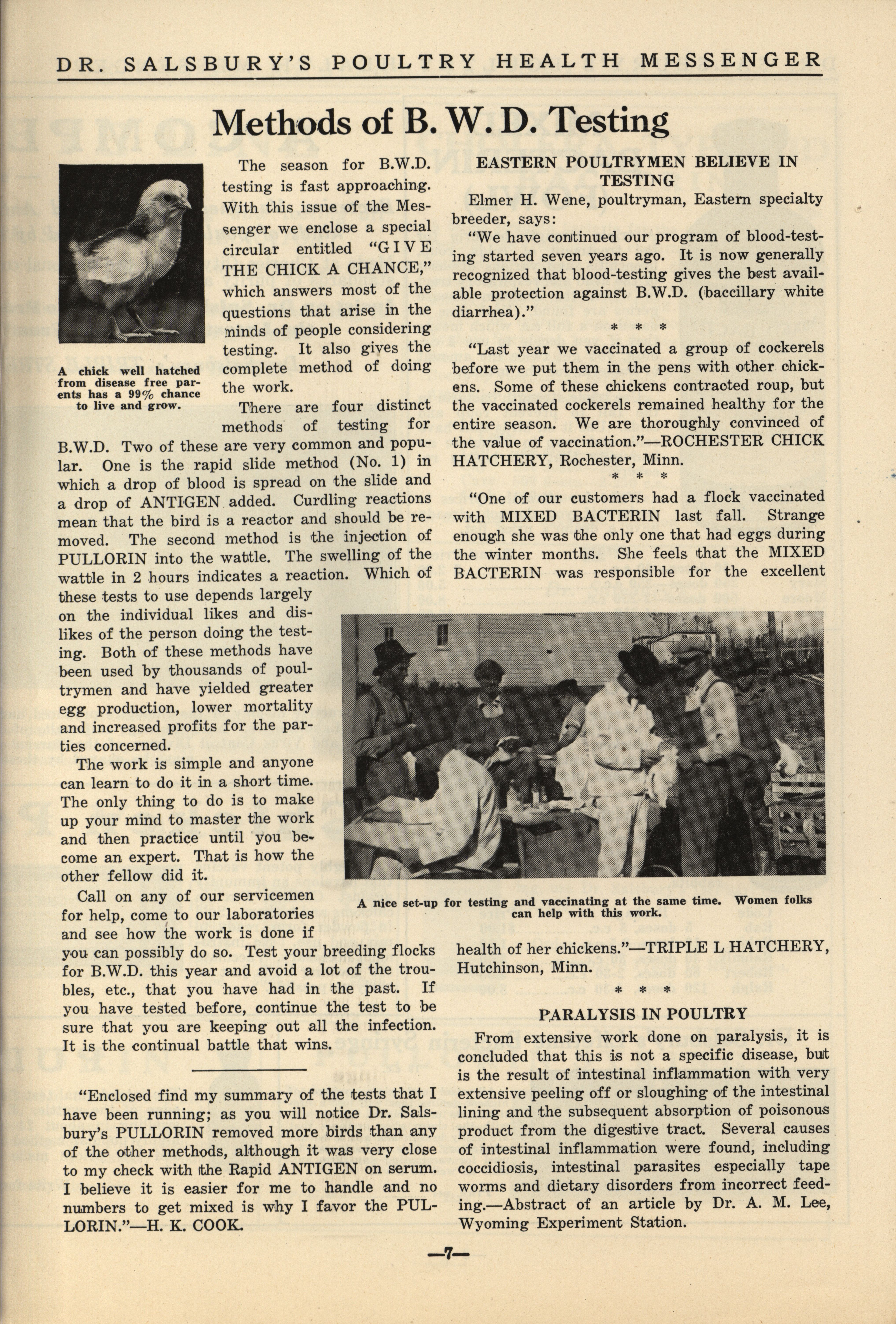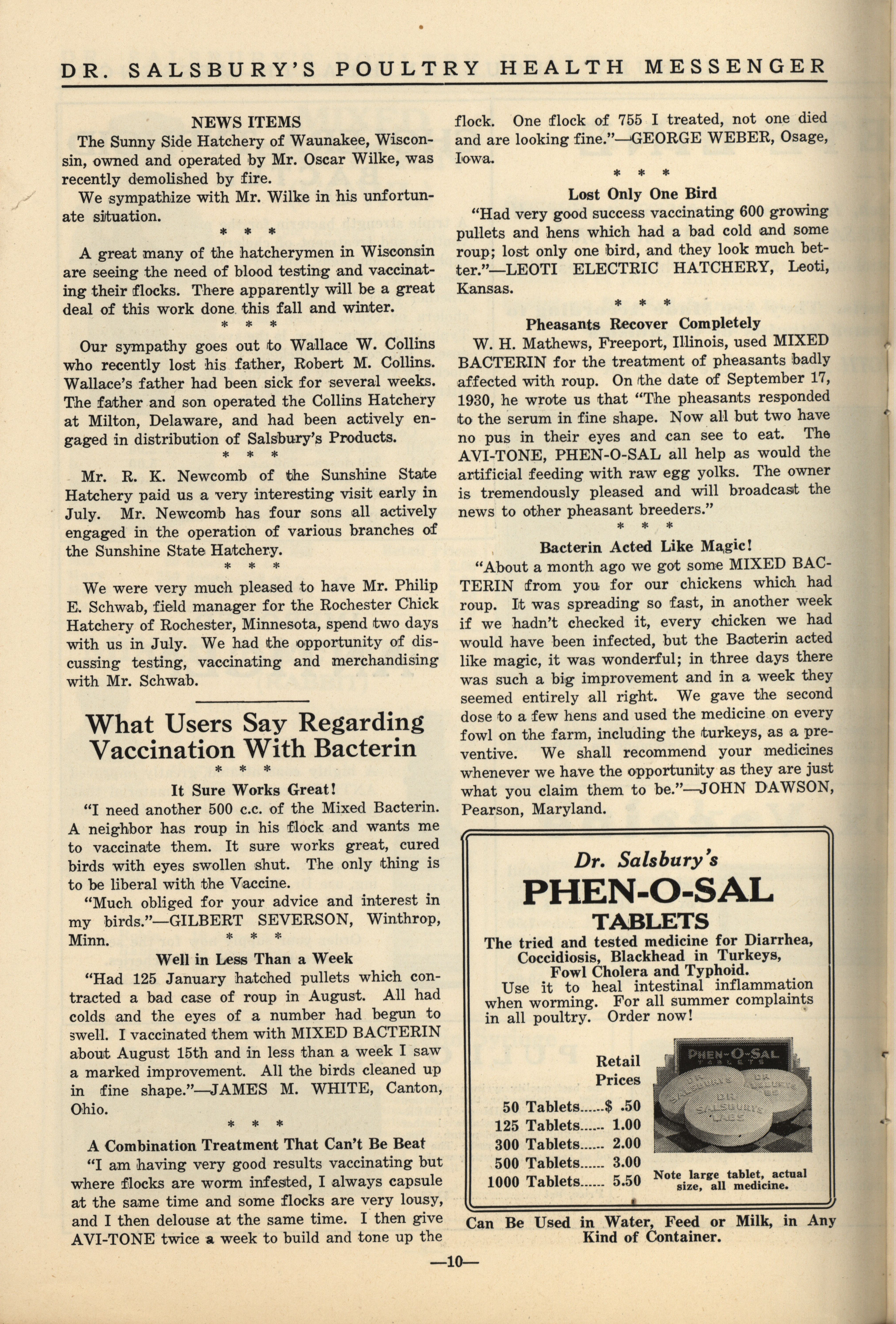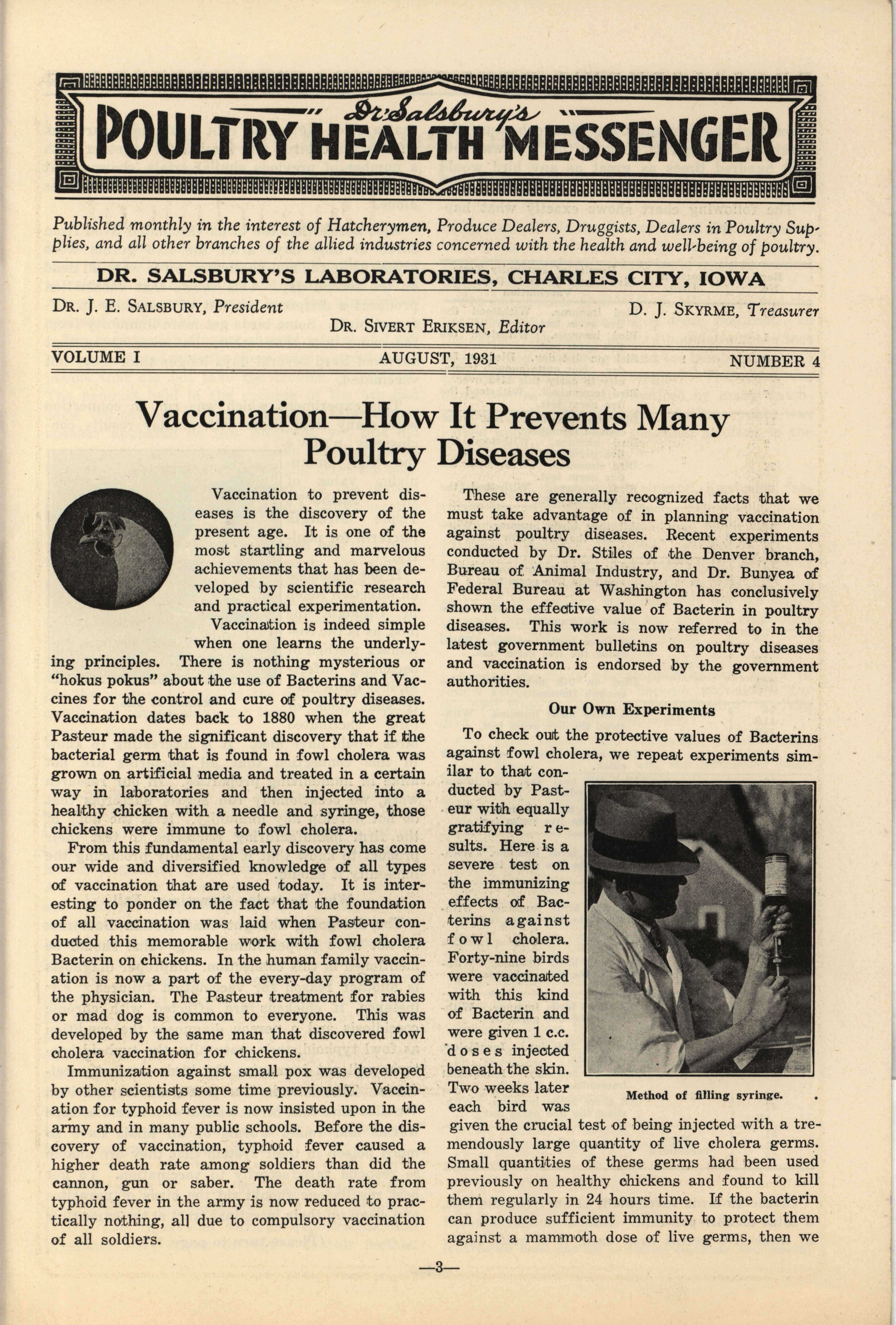 - "Dr. Salsbury's poultry health messenger, August 1931", American Association of Avian Pathologists Collection, Iowa State University Library Digital Collections