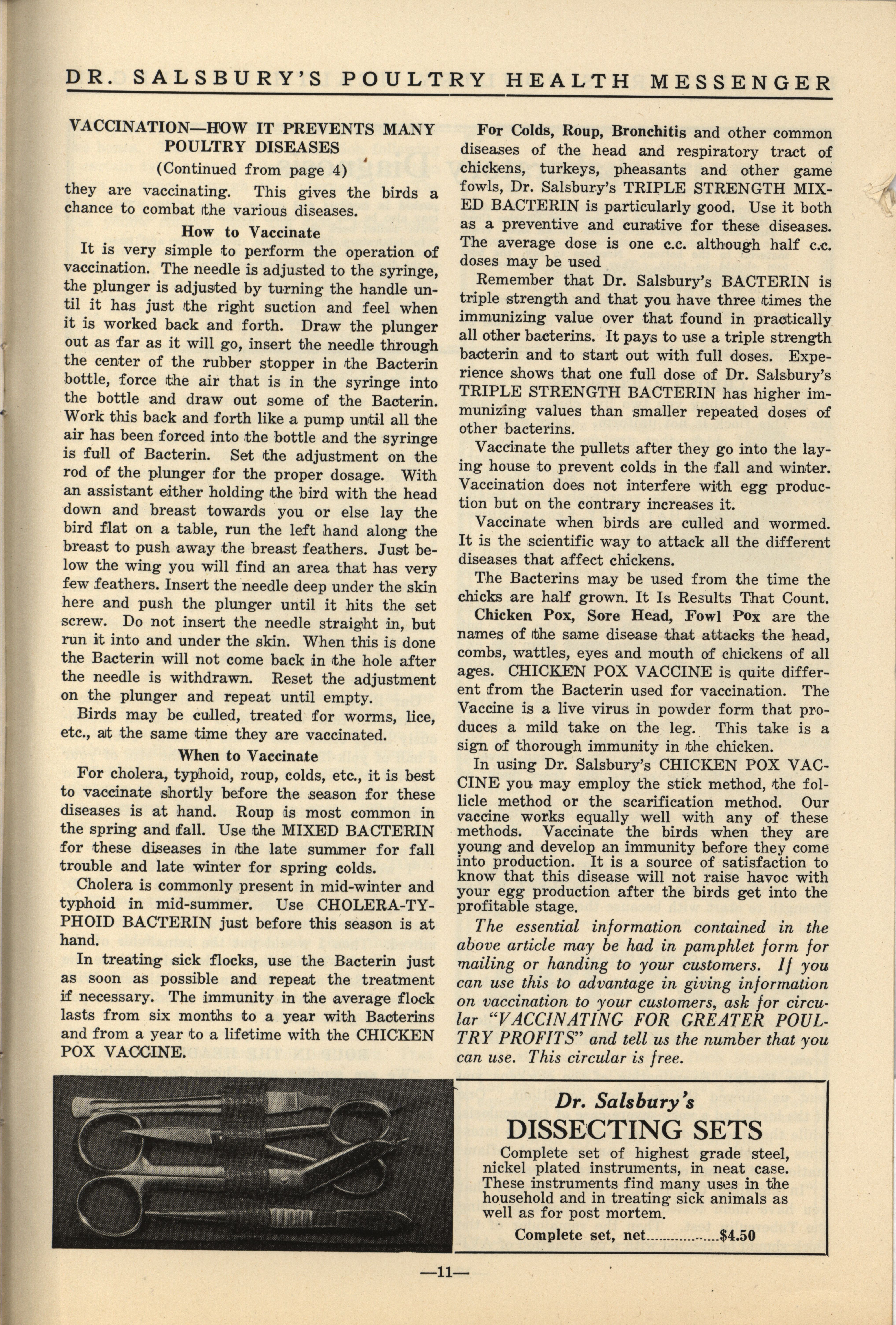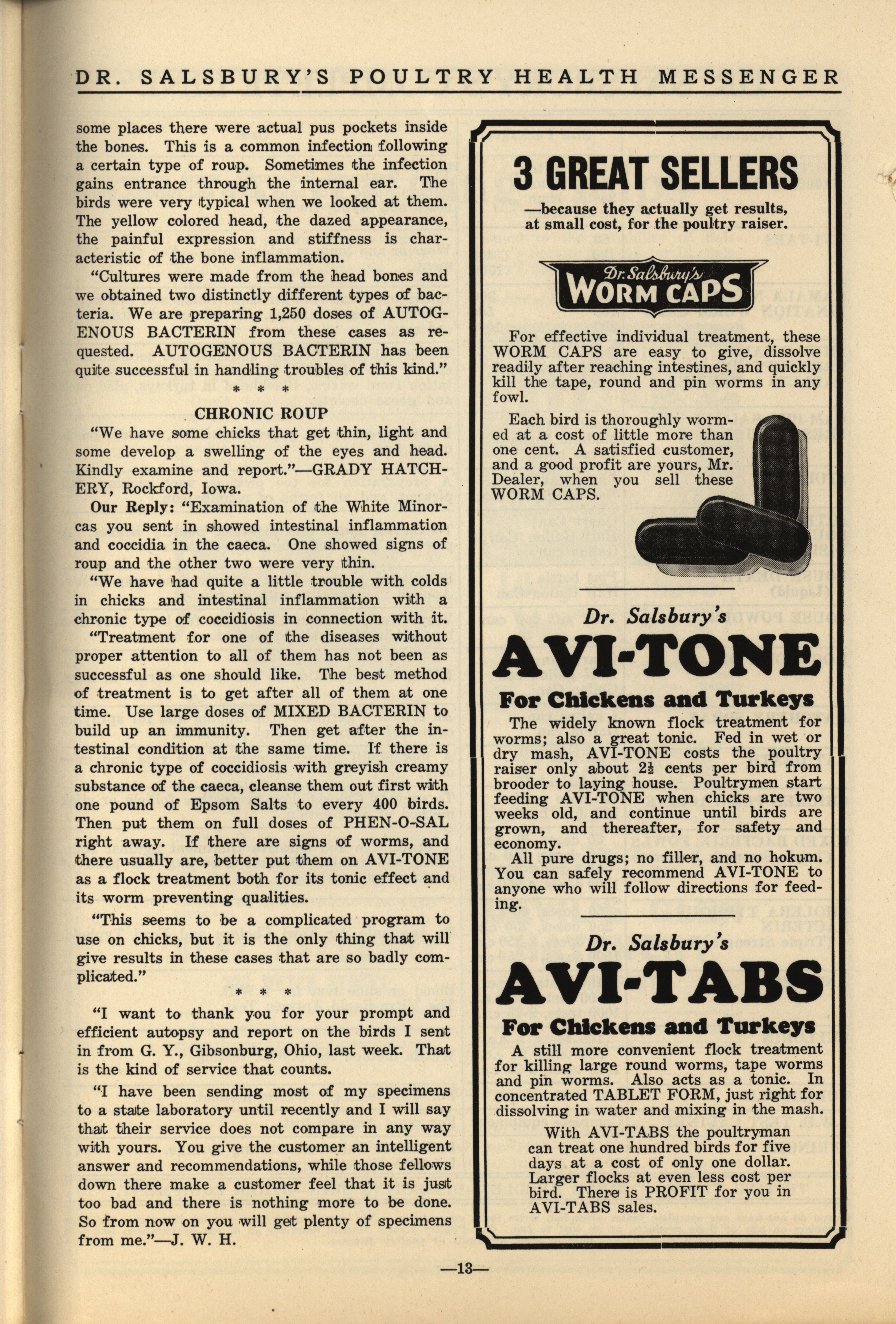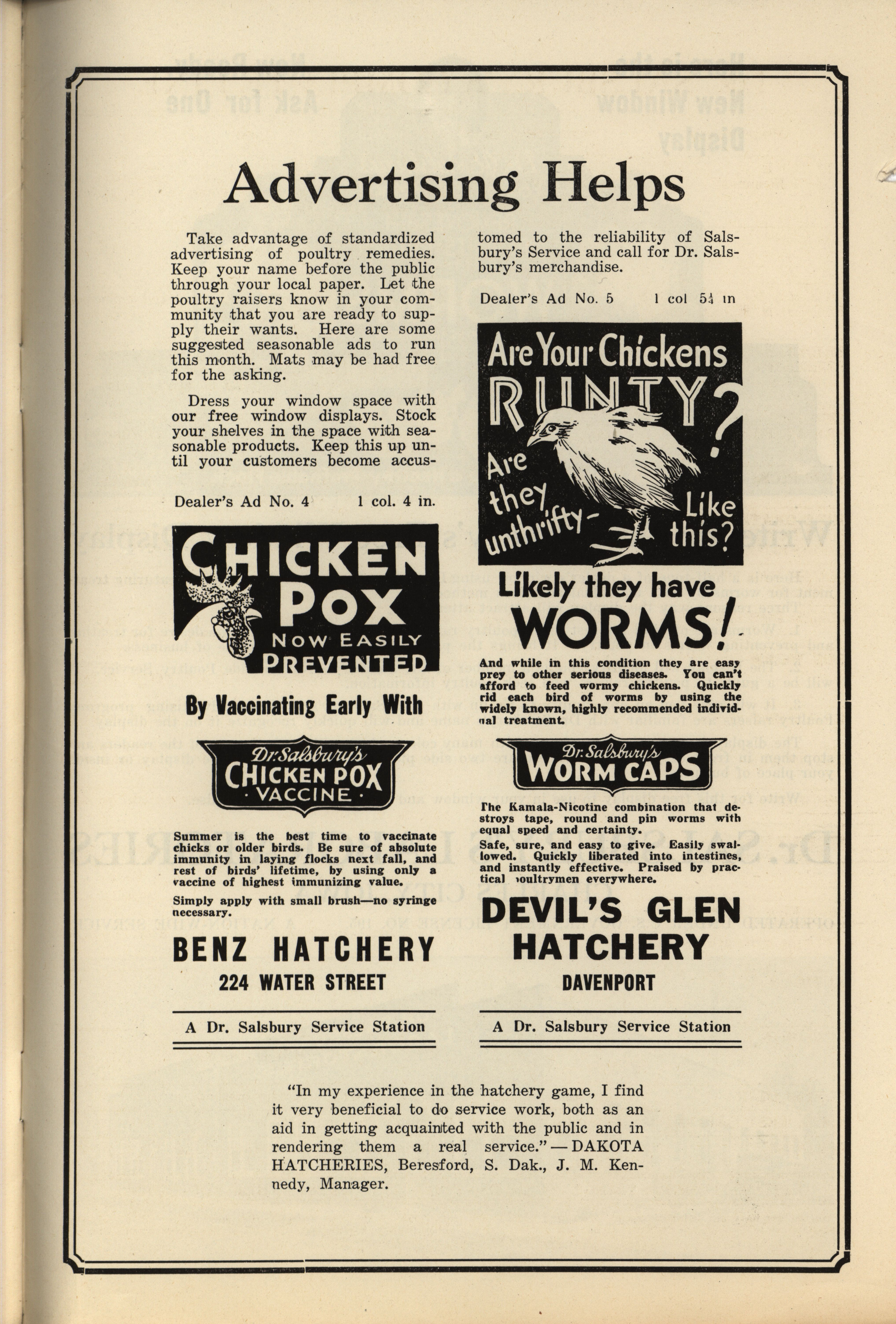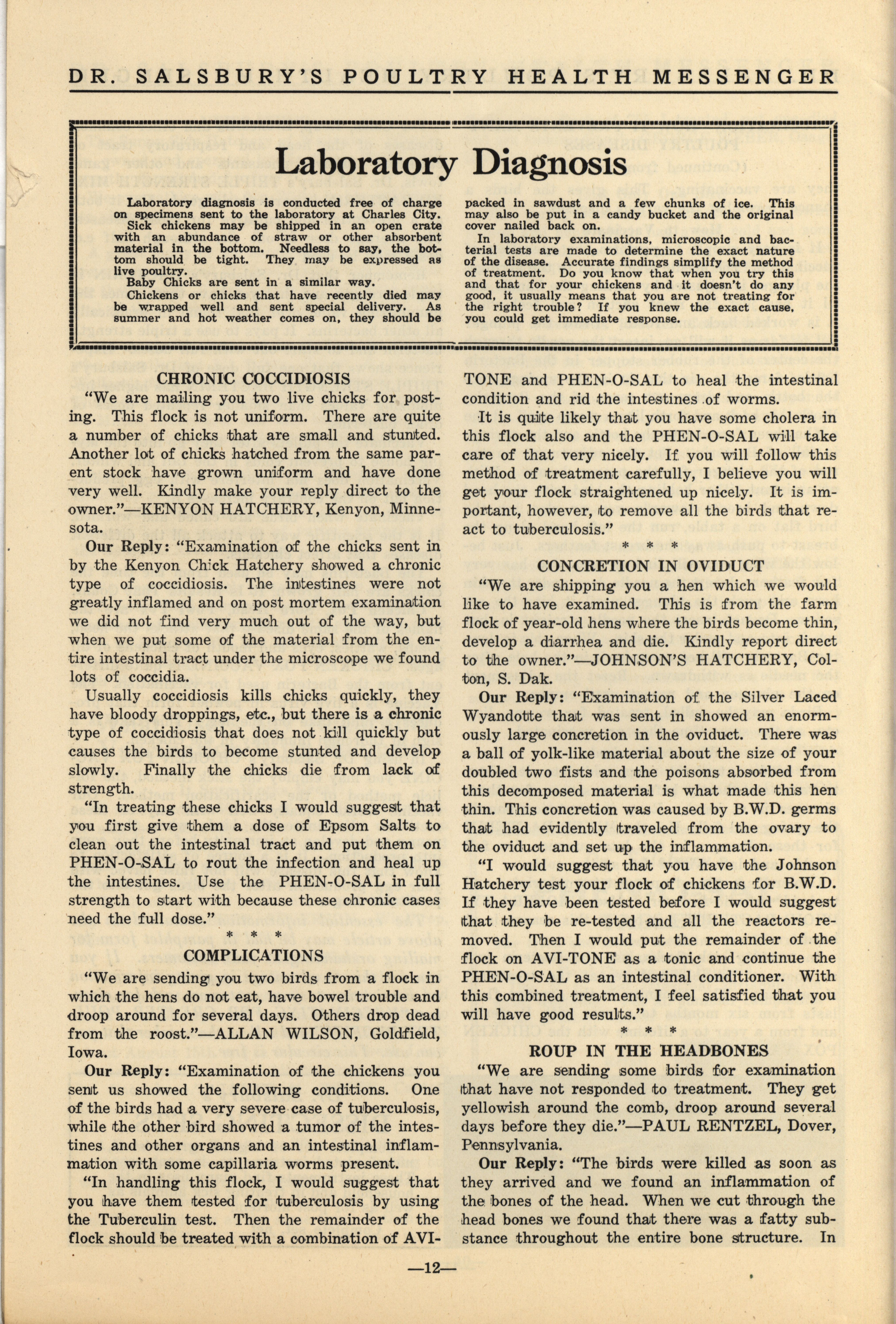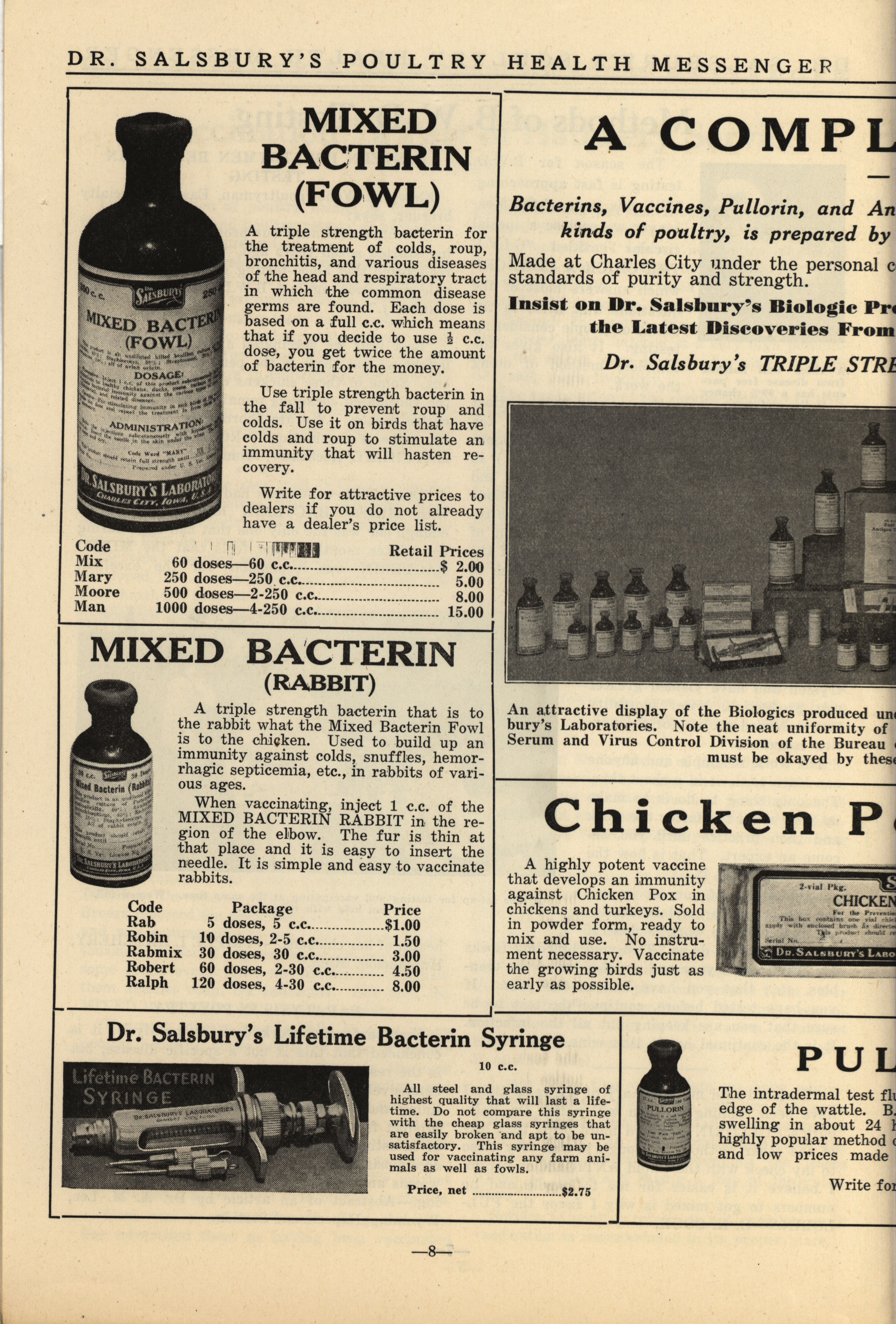 - "Dr. Salsbury's poultry health messenger, August 1931", American Association of Avian Pathologists Collection, Iowa State University Library Digital Collections