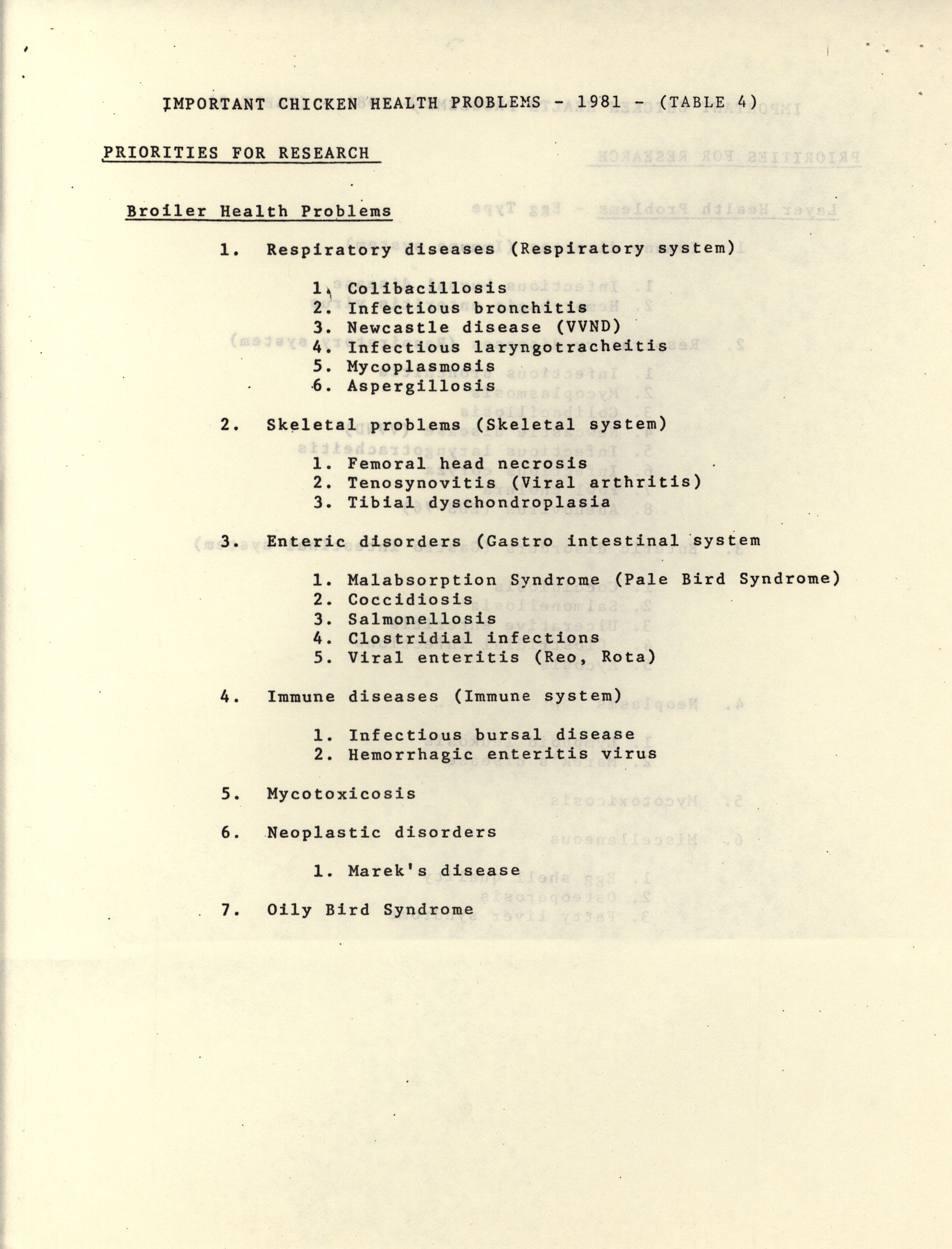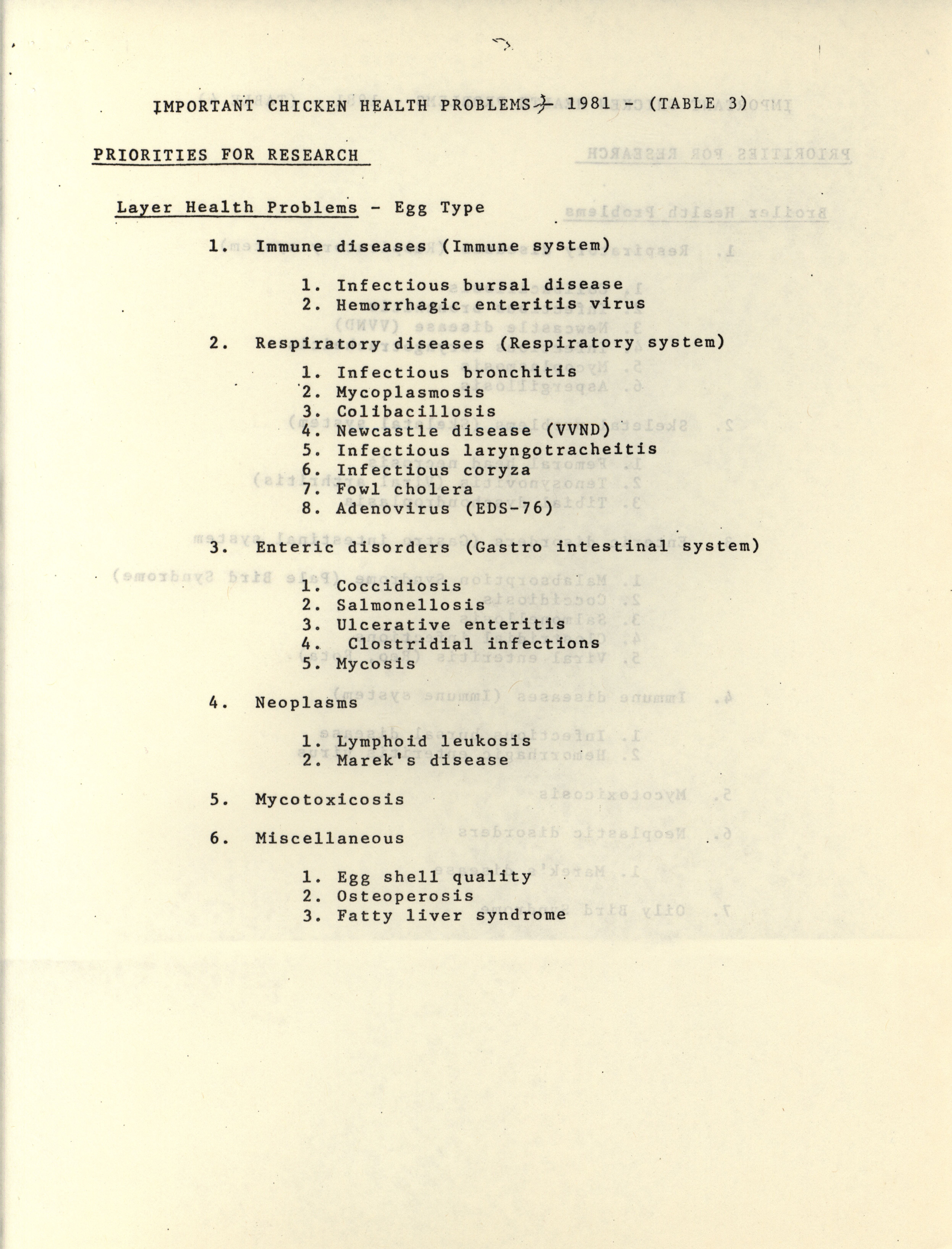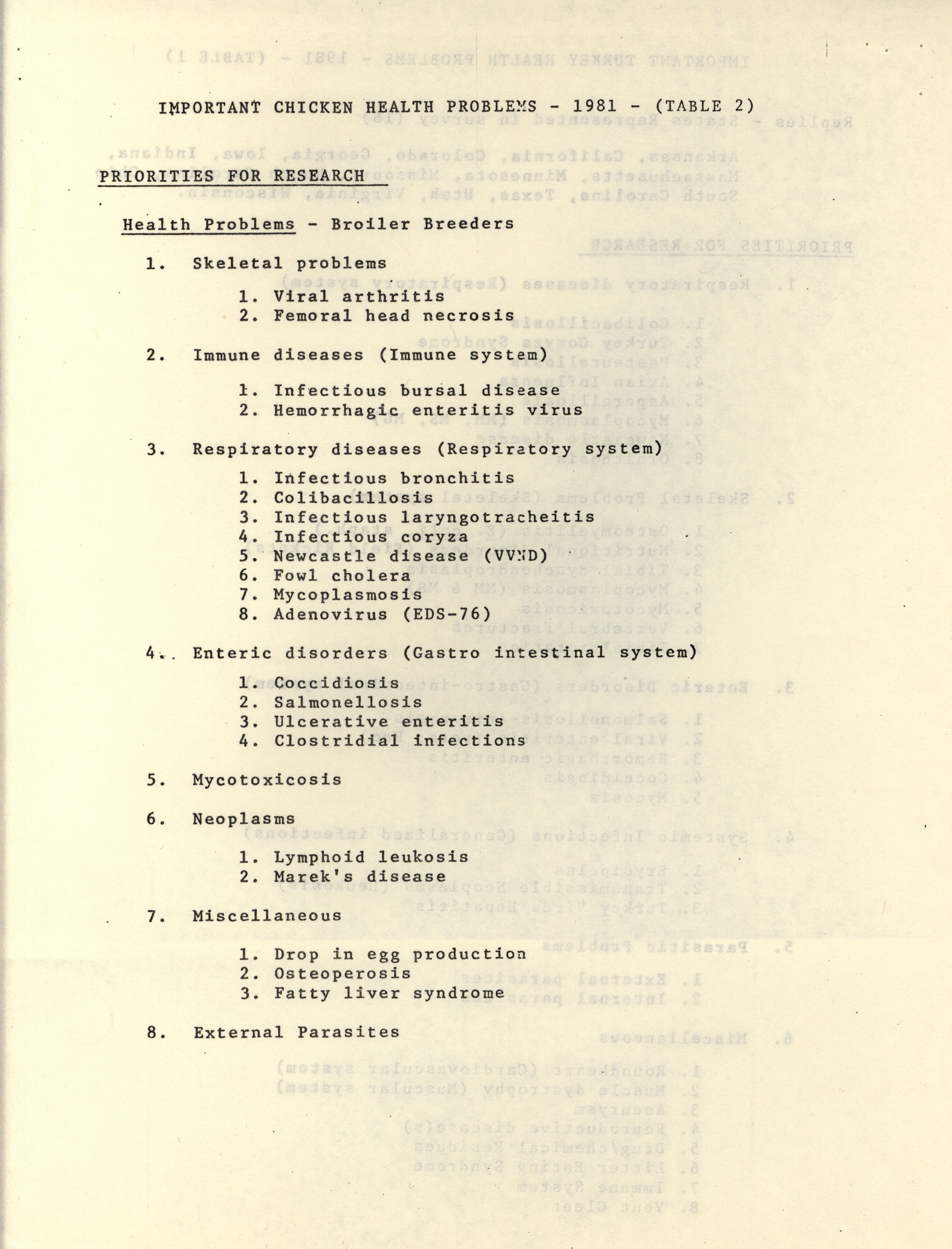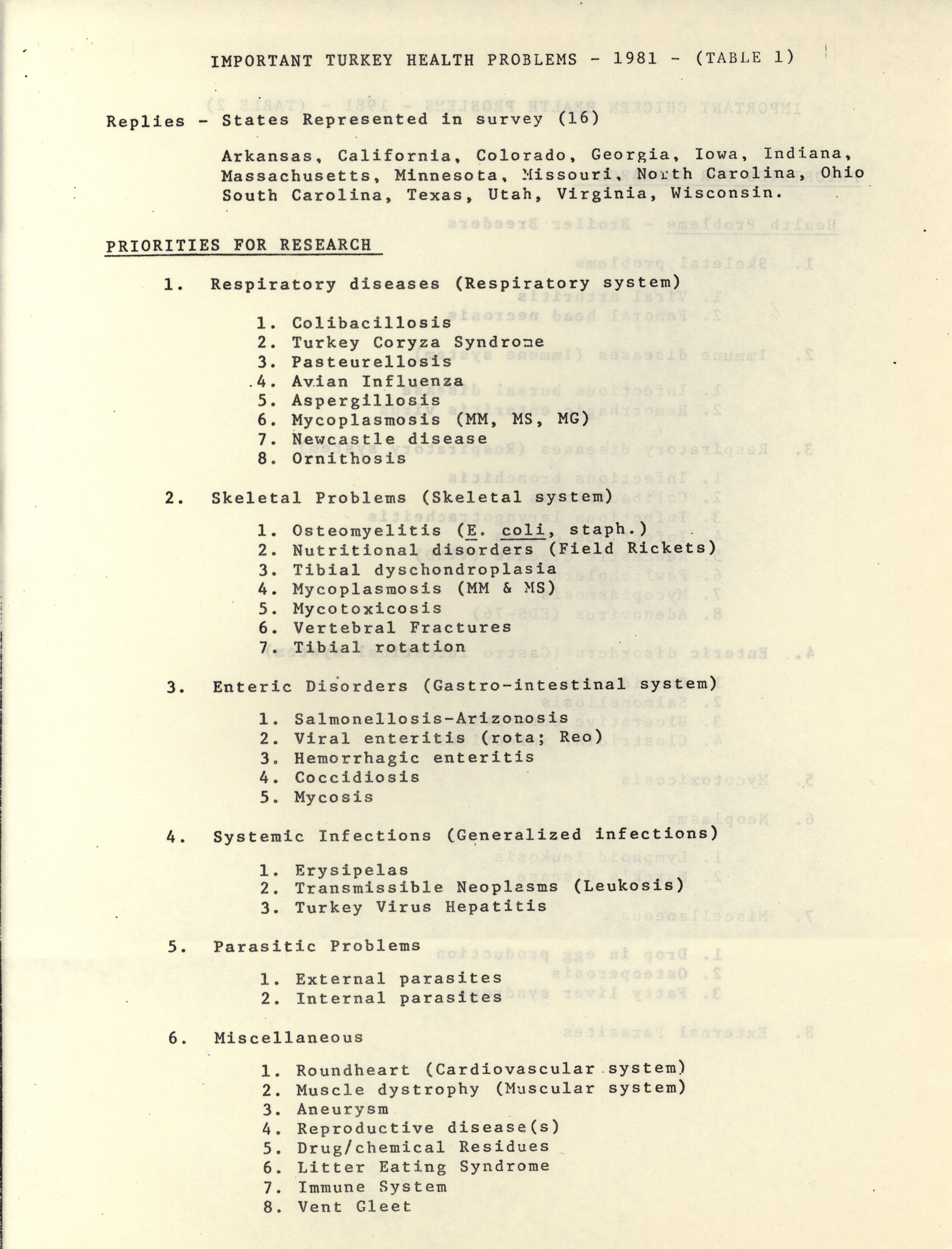 - A 1981 American Association of Avian Pathologists report describing the priorities of veterinary research in turkeys and chickens.
