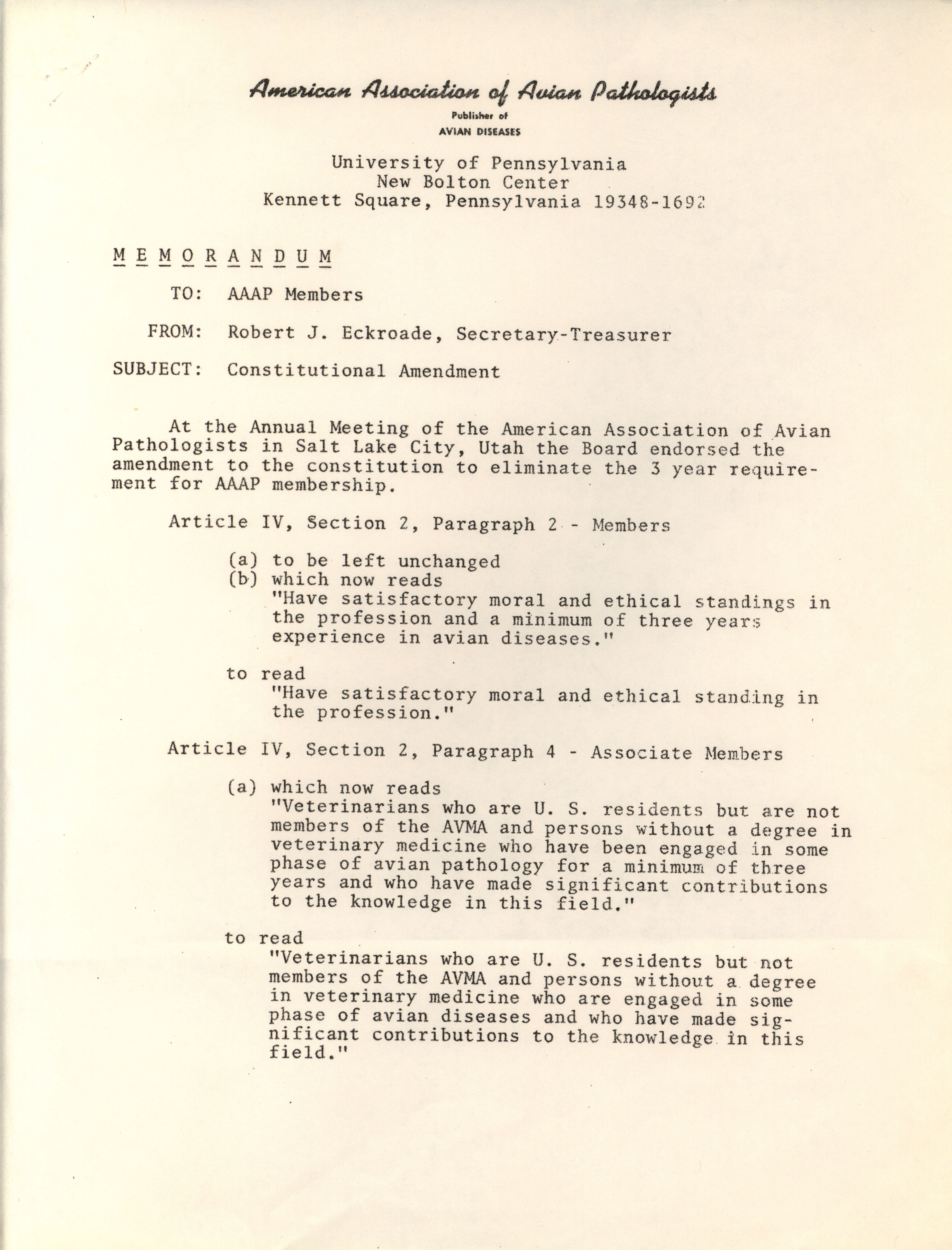 American Association of Avian Pathologists memorandum on a constitutional amendment Item Info