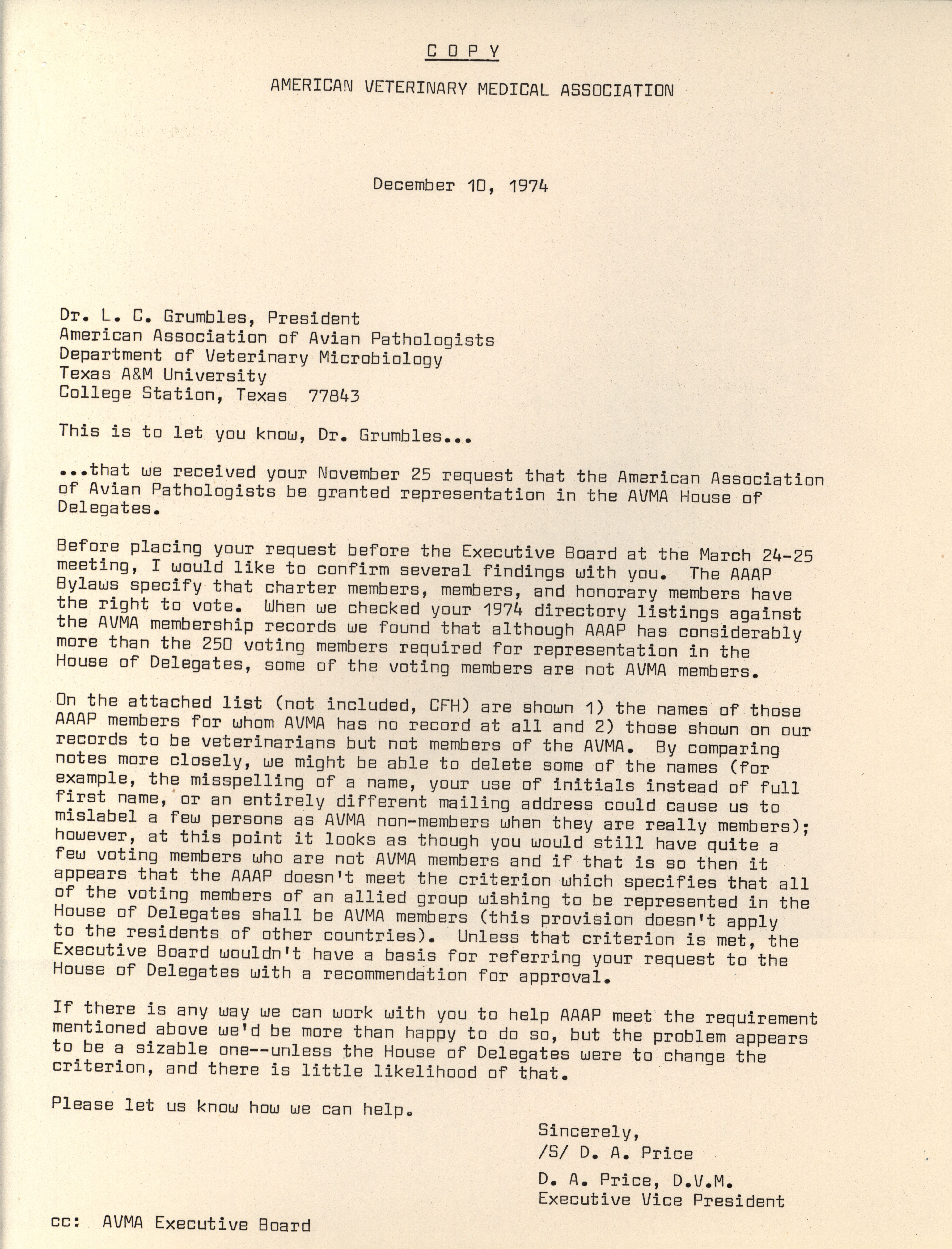 - Letter from the American Veterinary Medical Association to the American Association of Avian Pathologists, December 10, 1974