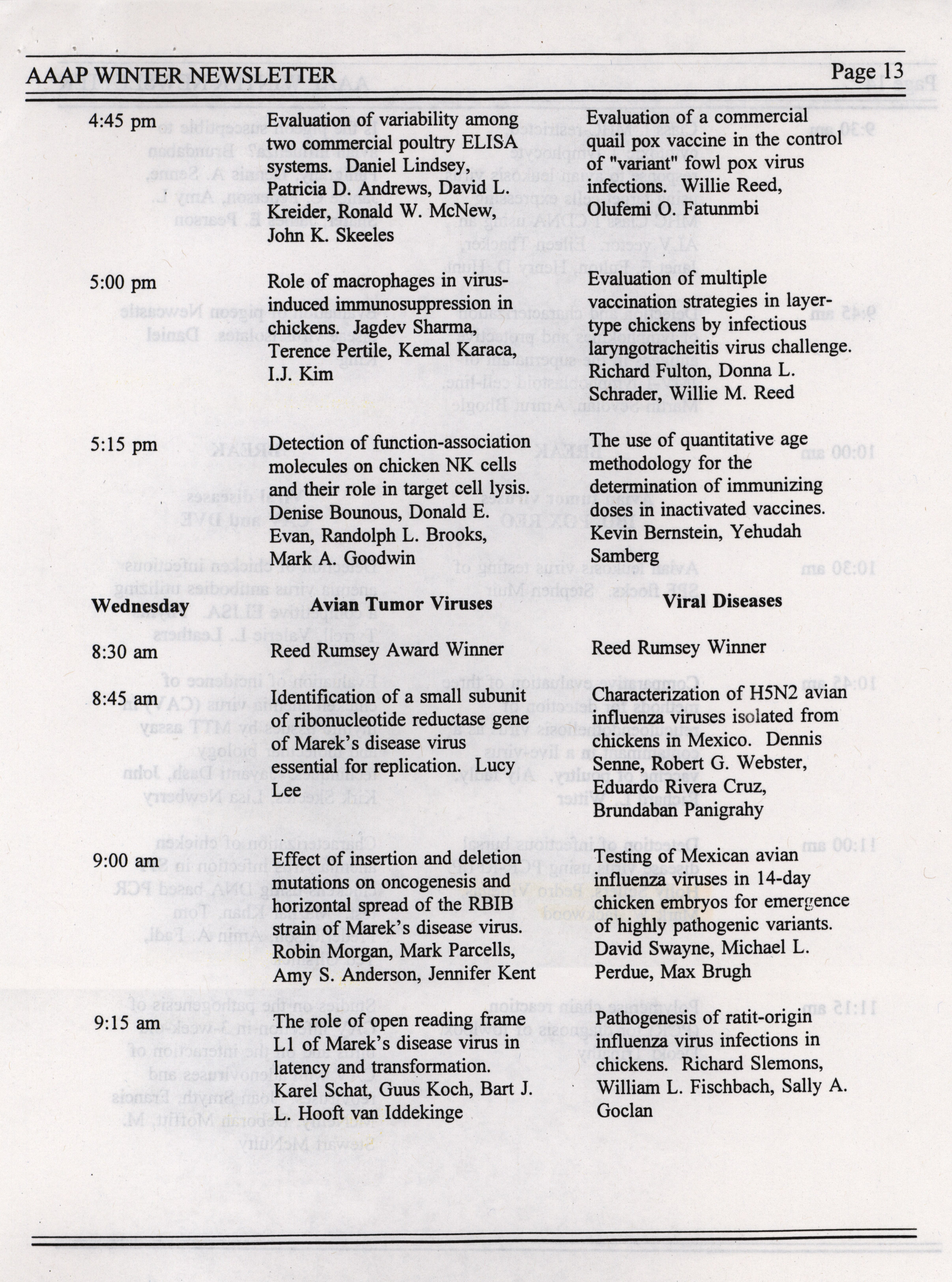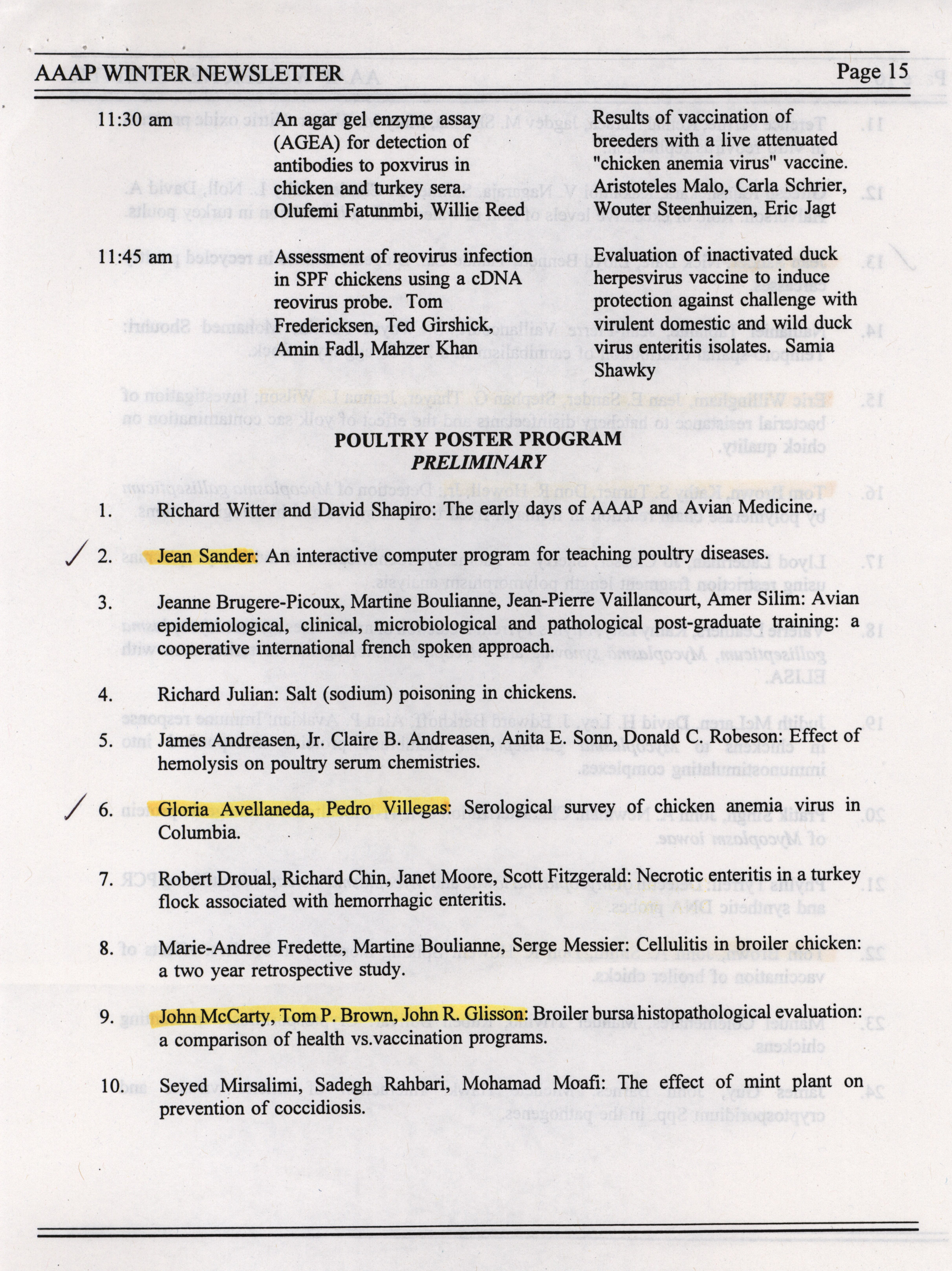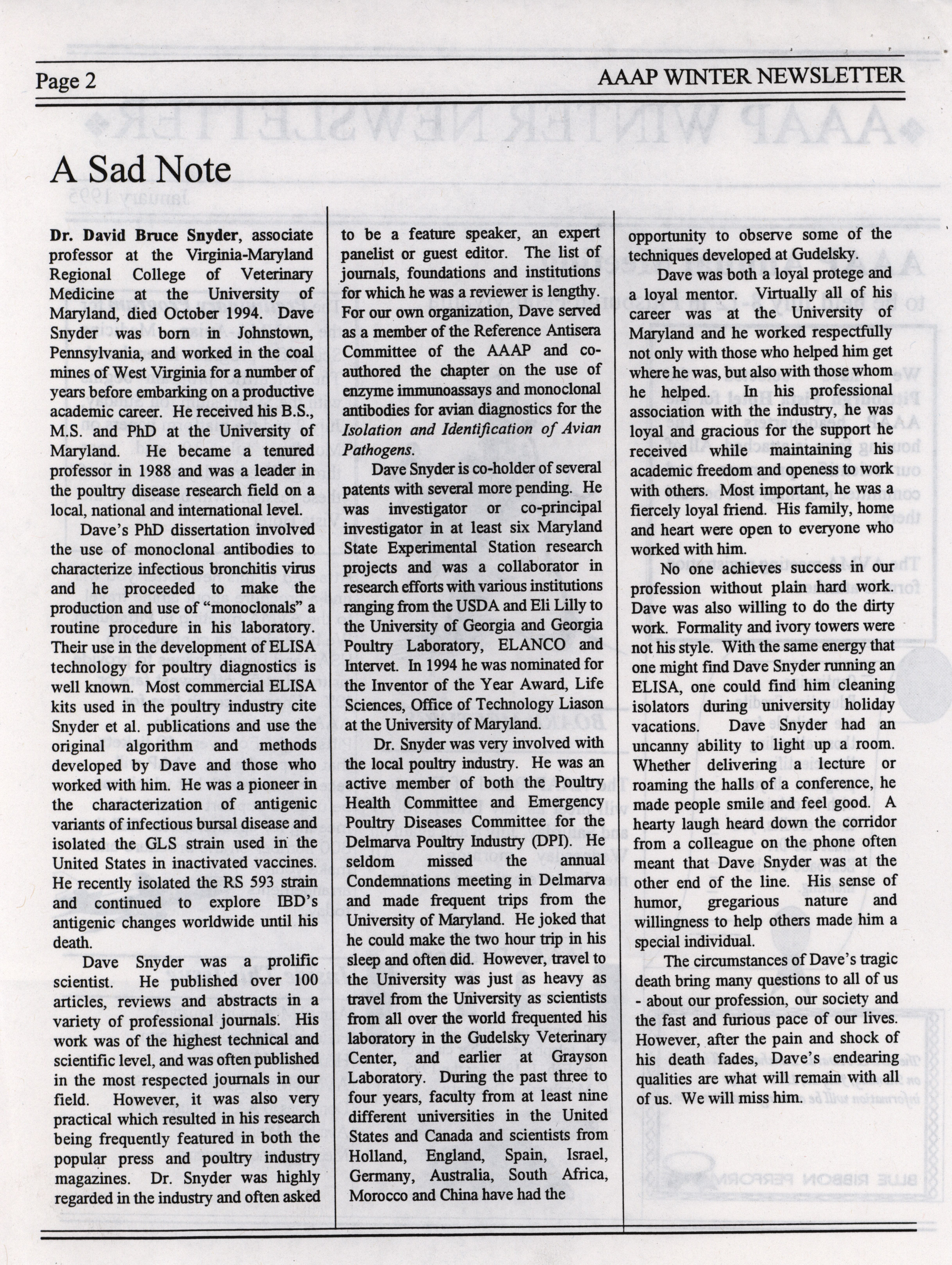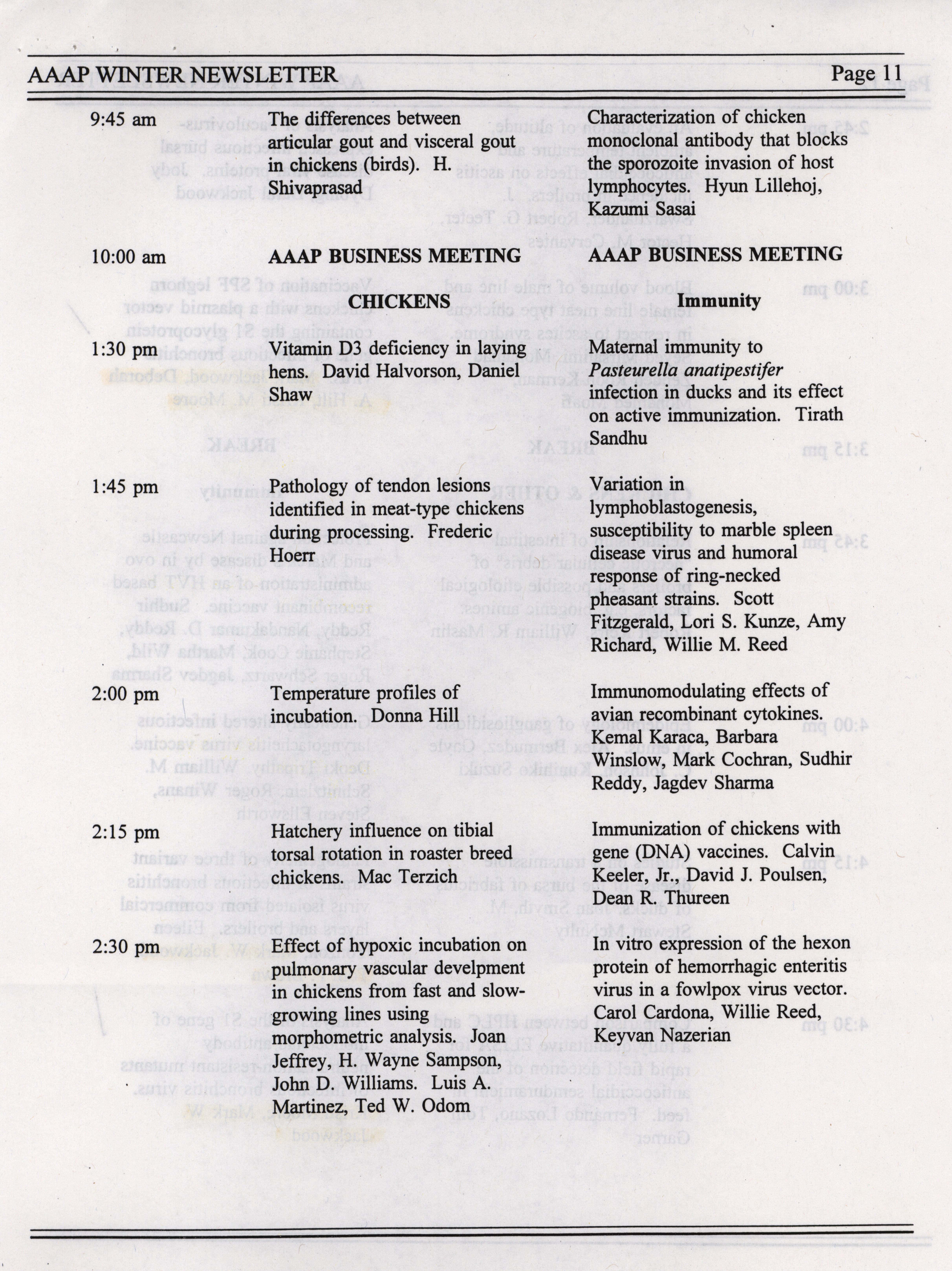 - The winter newsletter of the American Association of Avian Pathologists, January 1995. The quarterly newsletter features several different topics, including annual meeting information, the preliminary AAAP scientific program, donations to the AAAP foundation and meeting announcements.