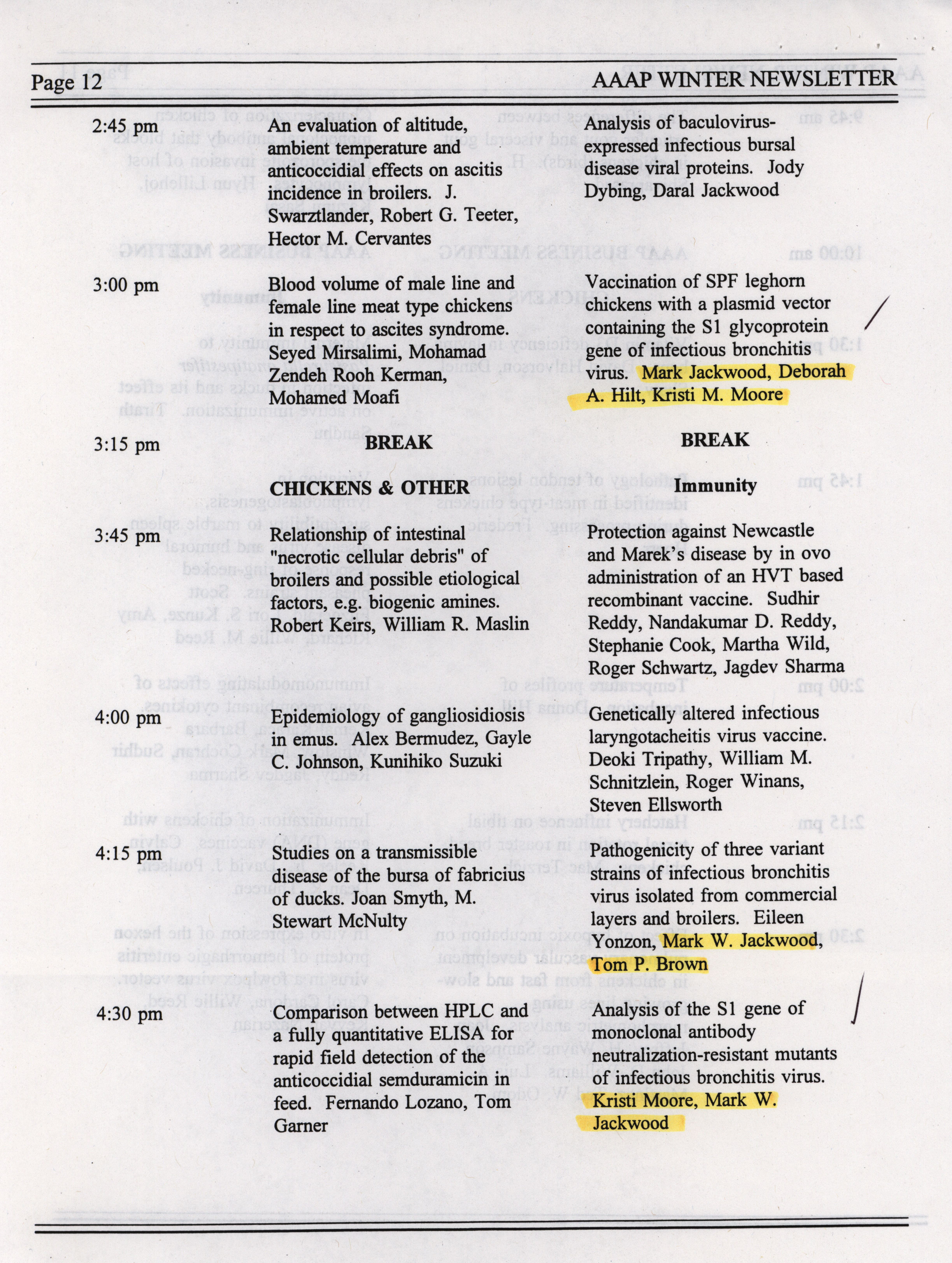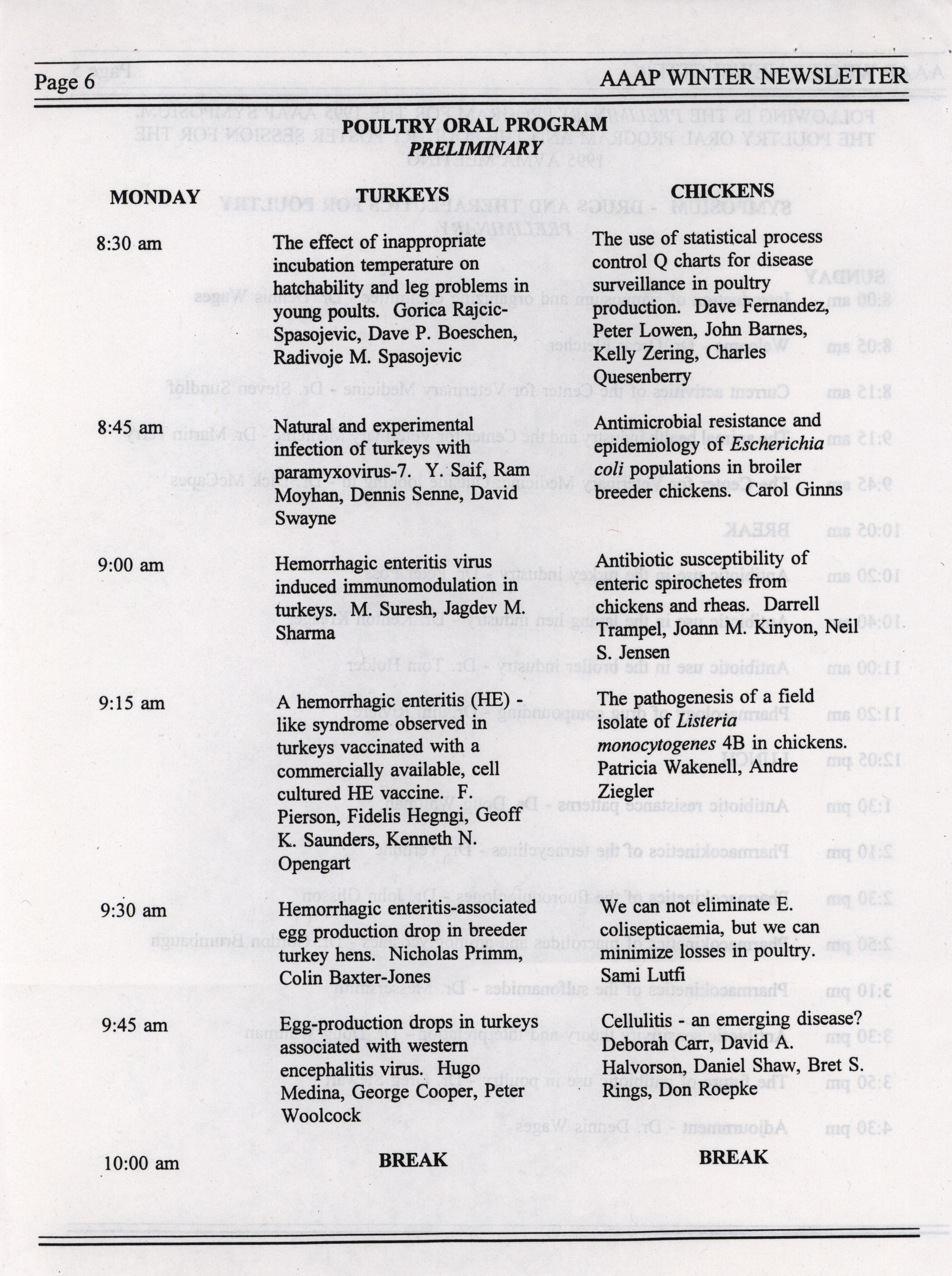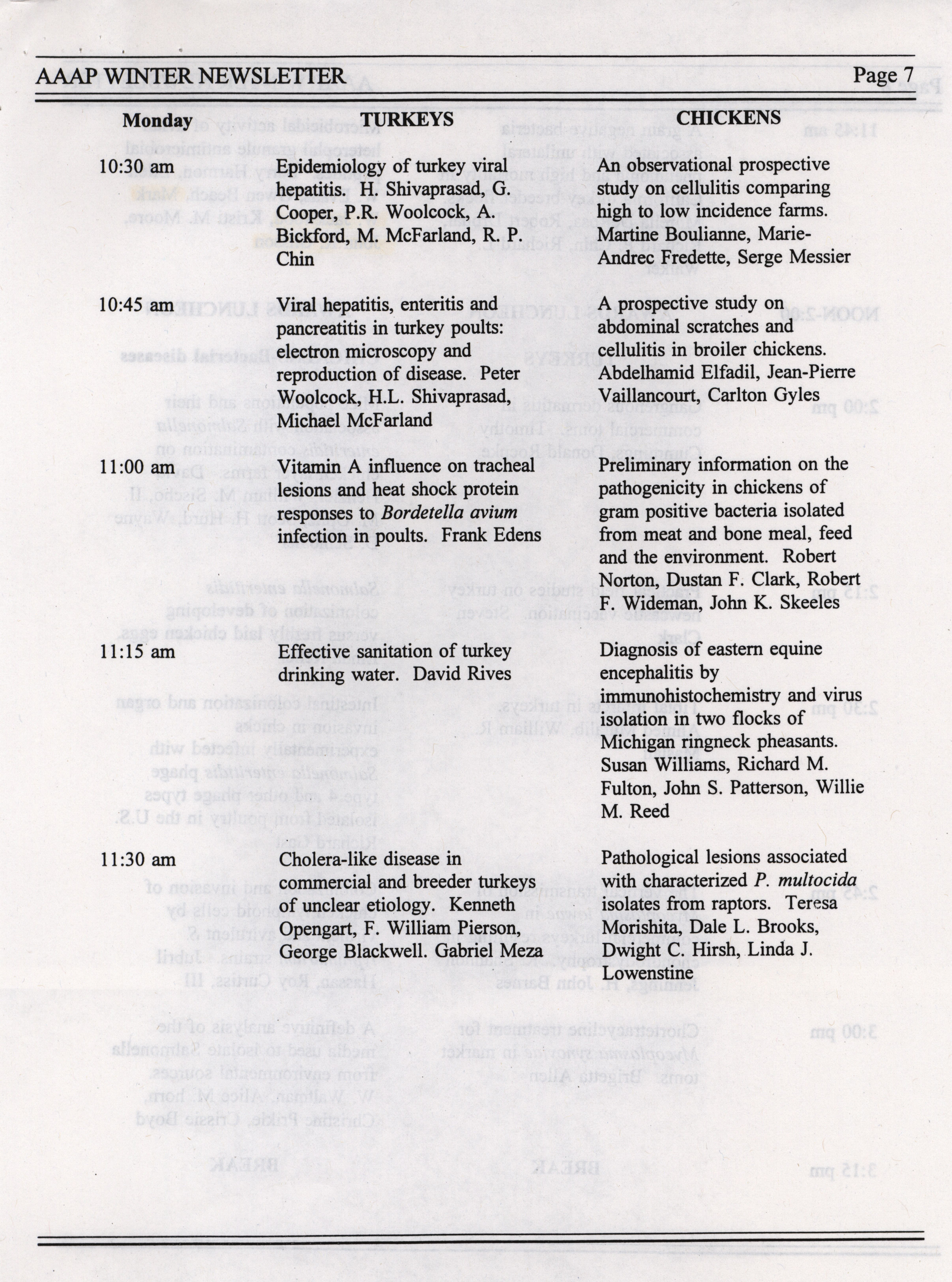 - The winter newsletter of the American Association of Avian Pathologists, January 1995. The quarterly newsletter features several different topics, including annual meeting information, the preliminary AAAP scientific program, donations to the AAAP foundation and meeting announcements.