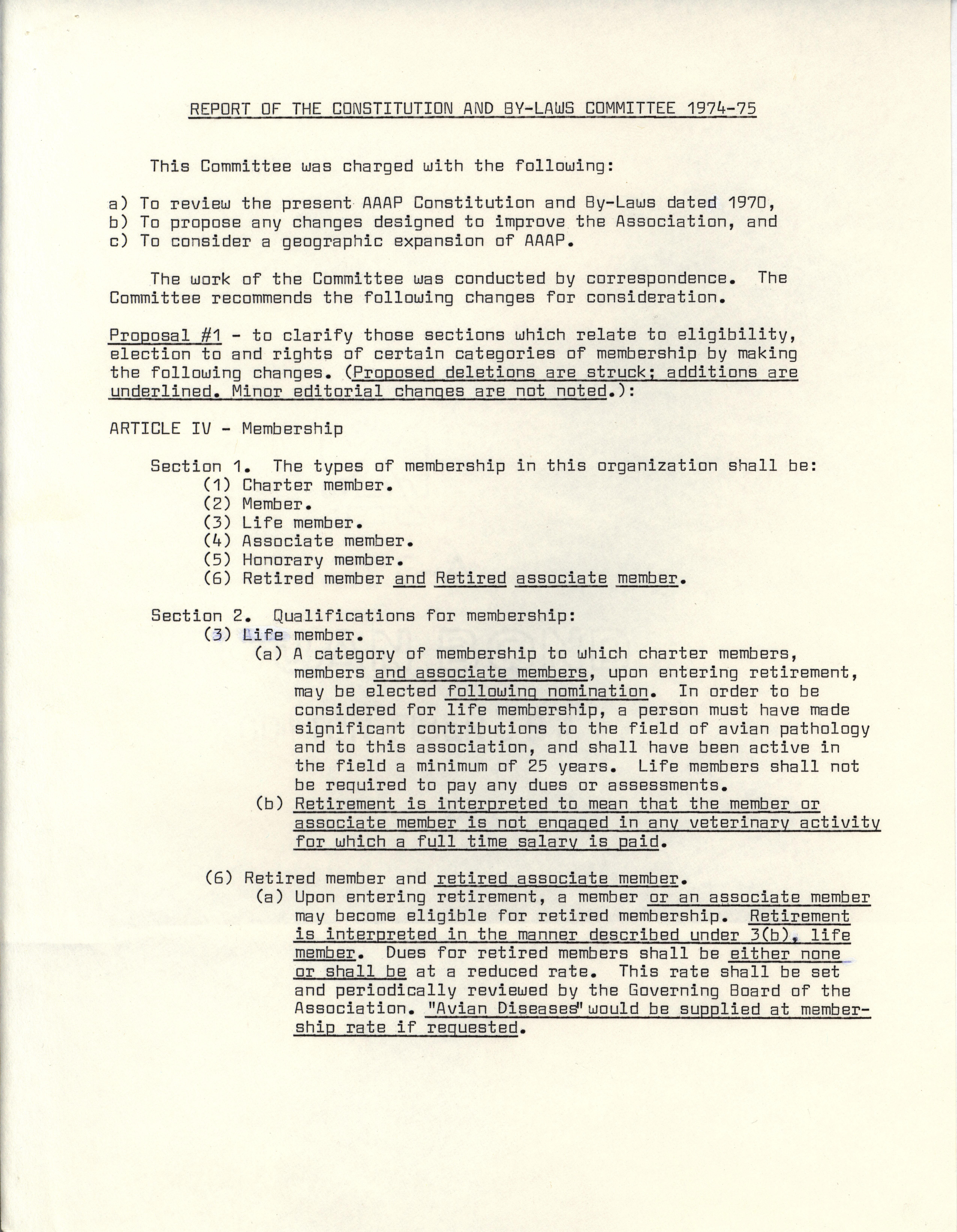 - "American Association of Avian Pathologists report from the constitution and by-laws committee, 1974-1975", American Association of Avian Pathologists Collection, Iowa State University Library Digital Collections