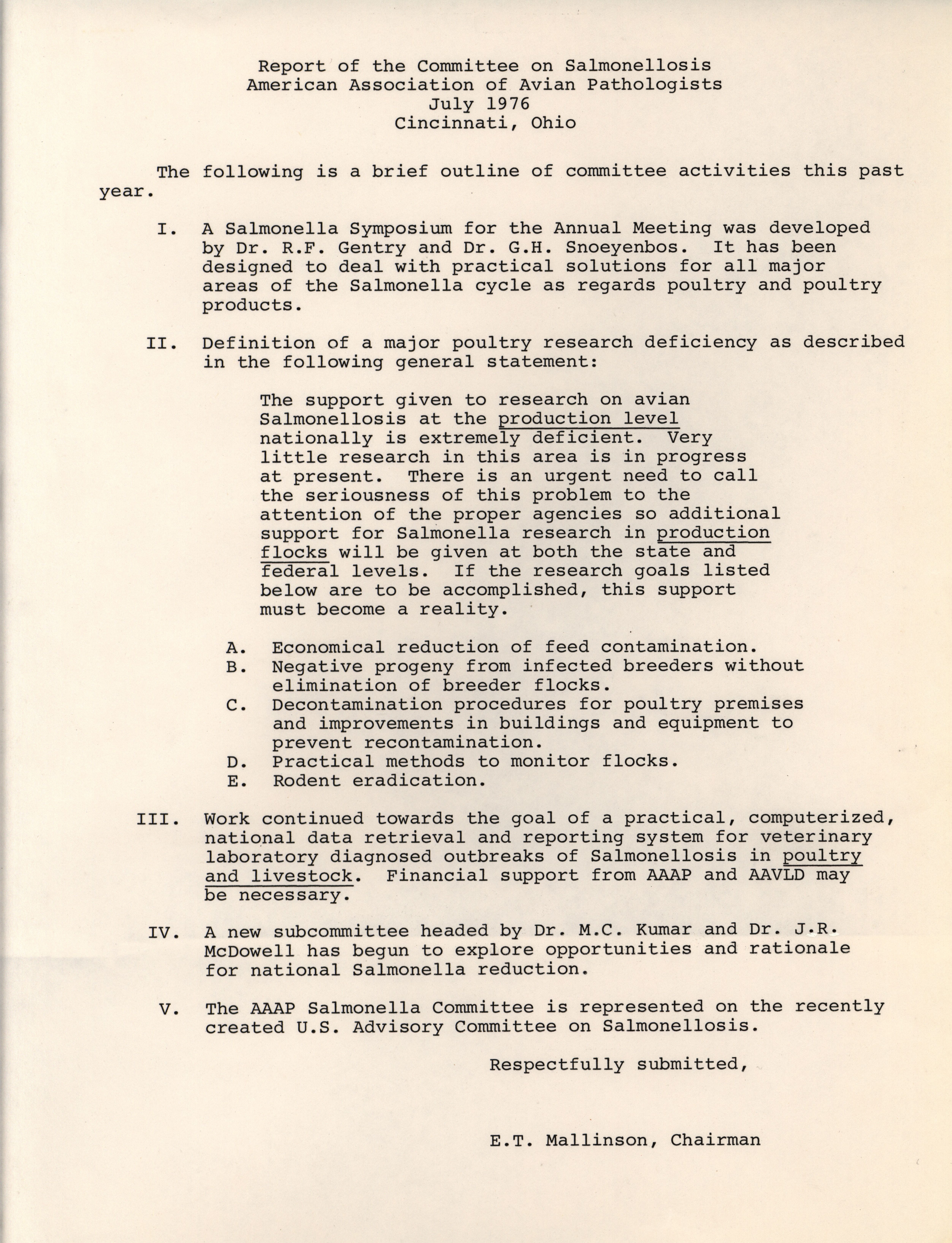 - Report describing the actions and goals of the Committee on Salmonellosis of the American Association of Avian Pathologists from July 1976 in Cincinnati, Ohio.