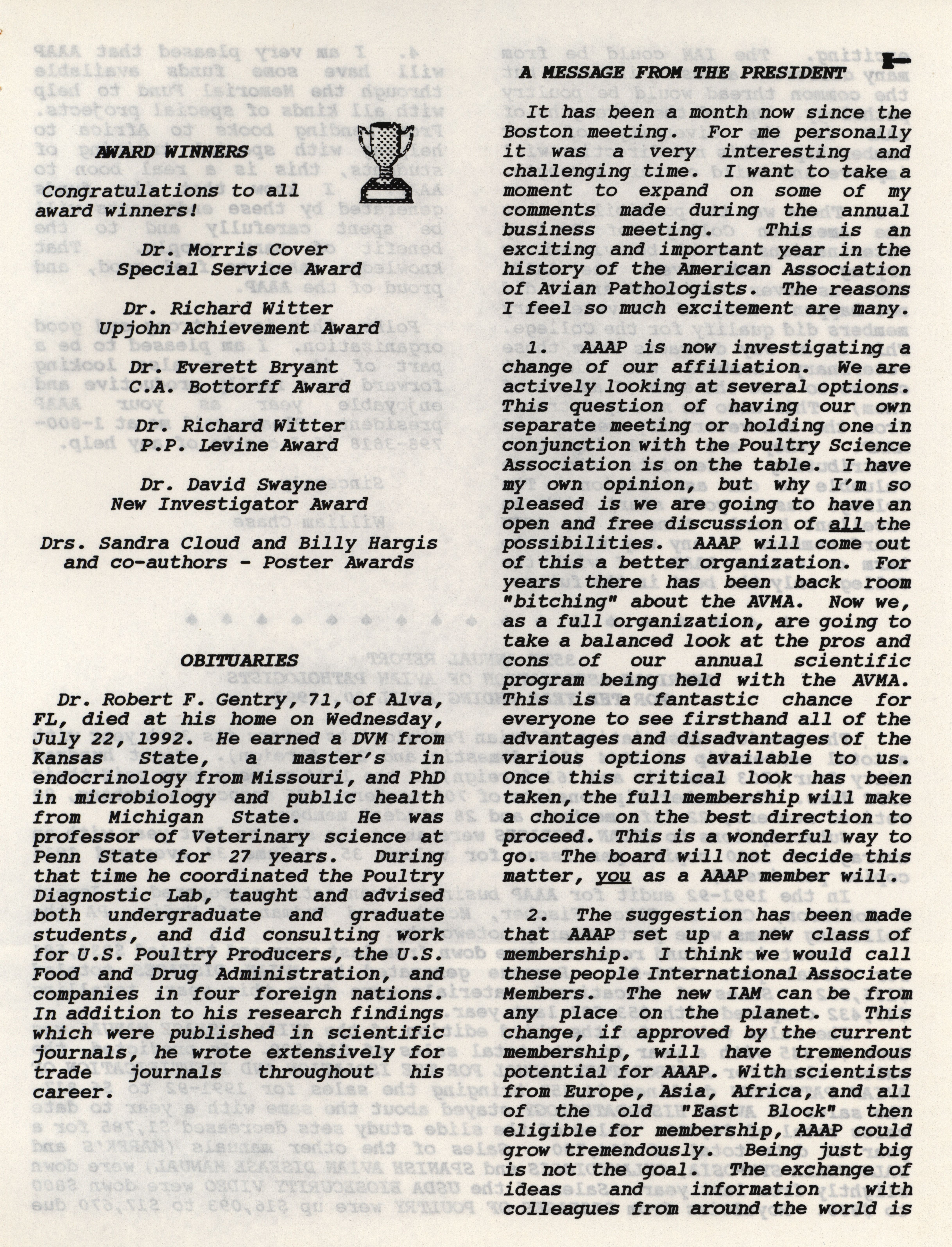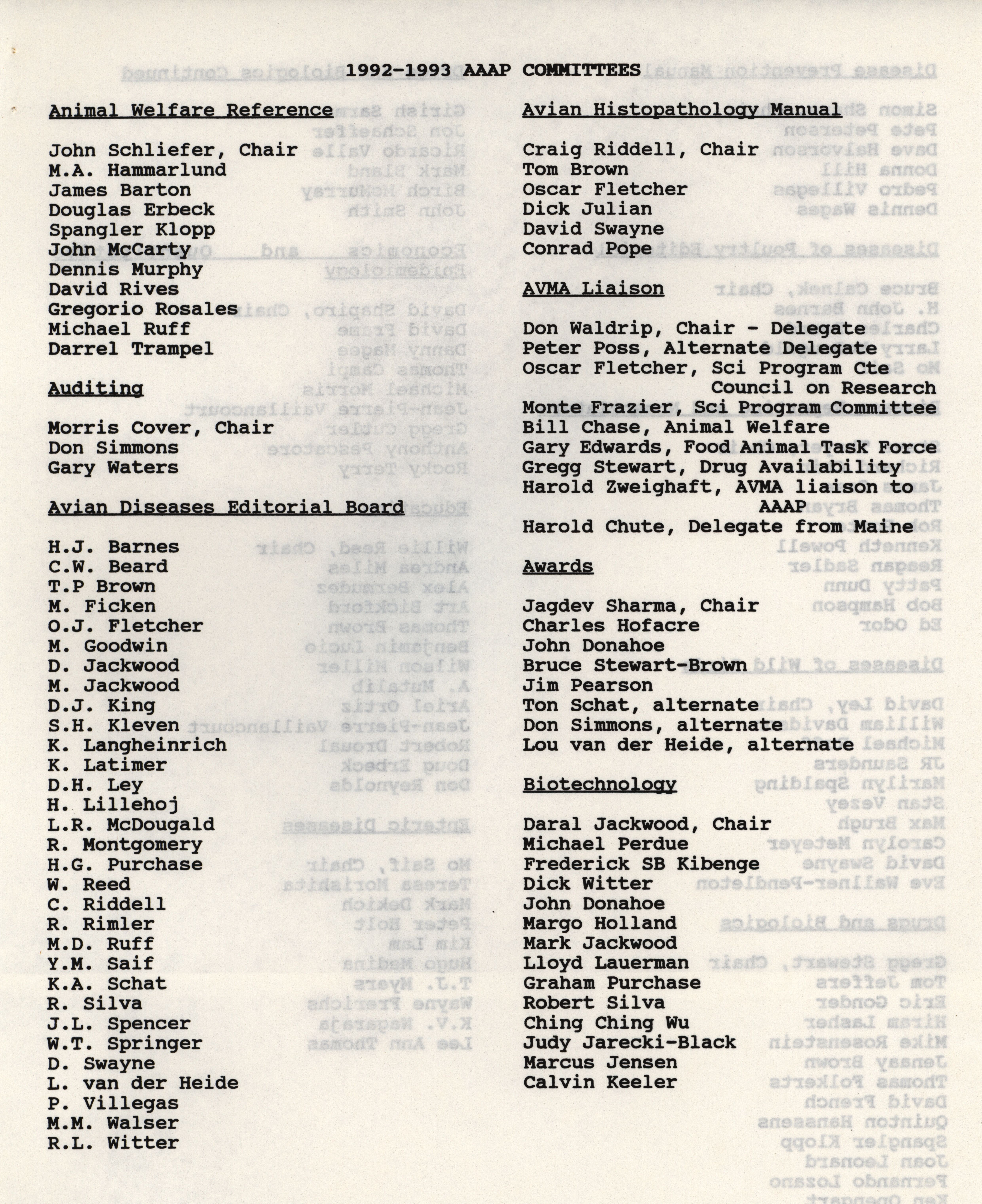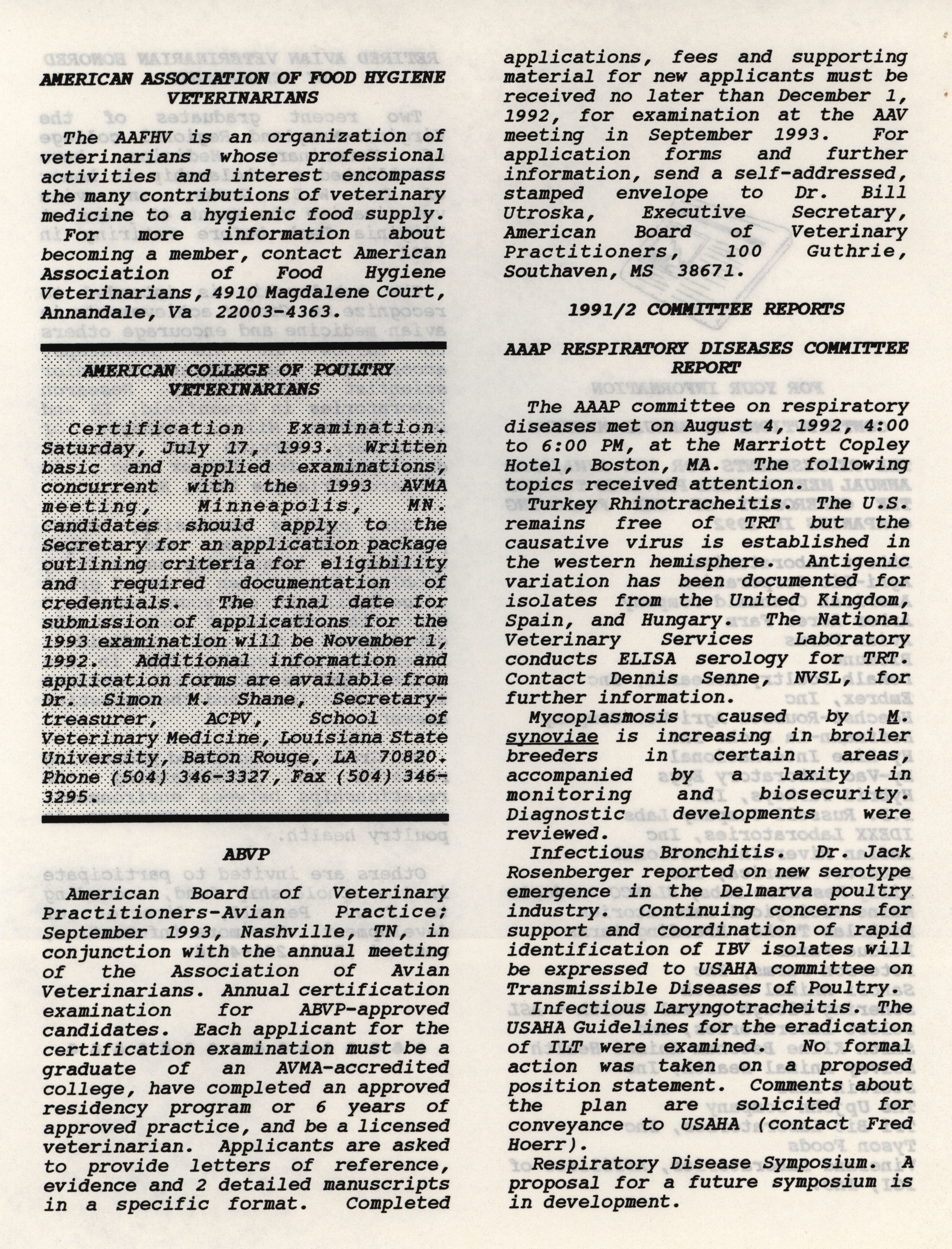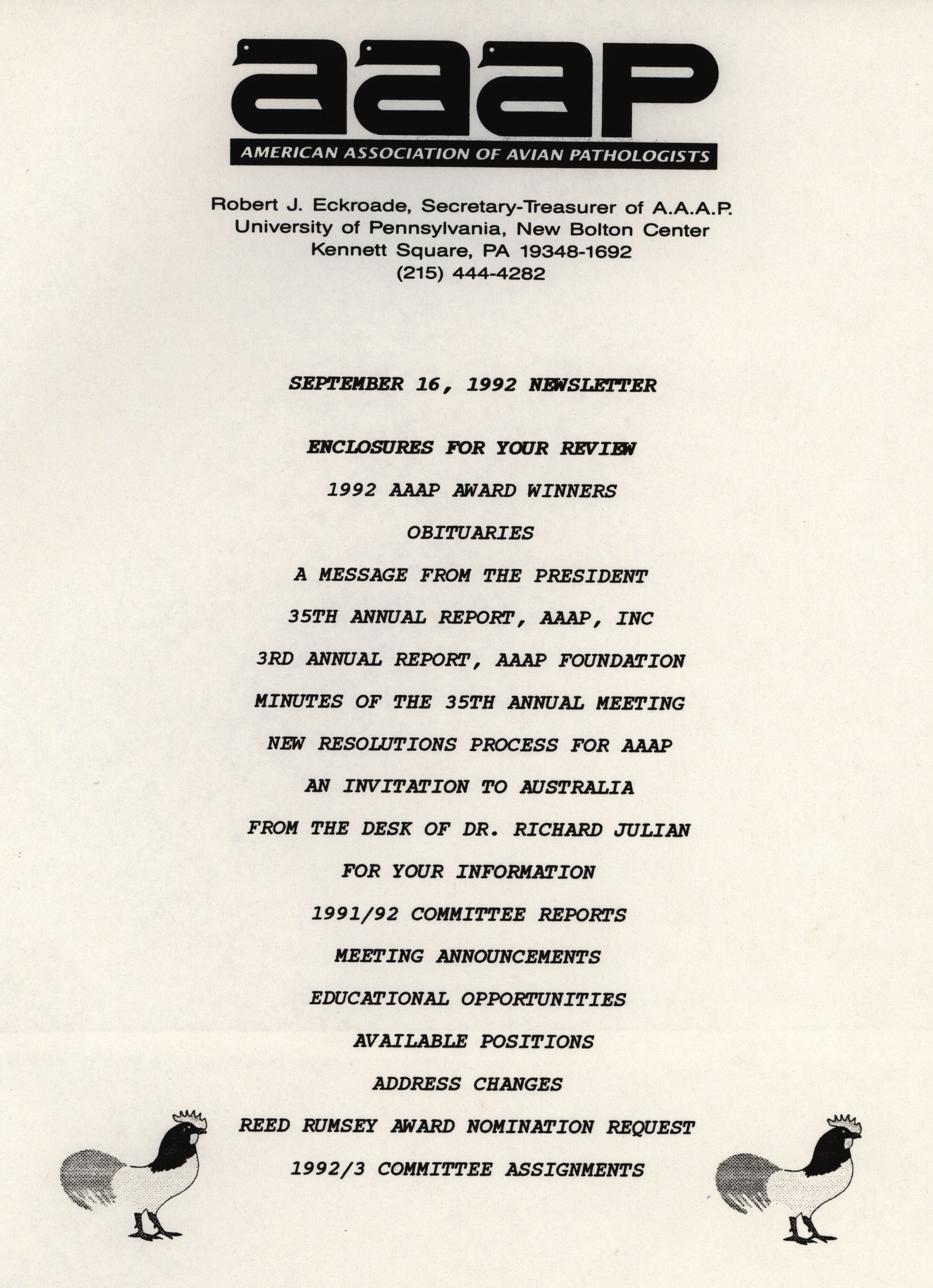 - The newsletter of the American Association of Avian Pathologists, September 16, 1992. The quarterly newsletter features several different topics, including minutes of the 35th annual meeting of the AAAP, new resolutions process for the AAAP and 1991/1992 committee reports.
