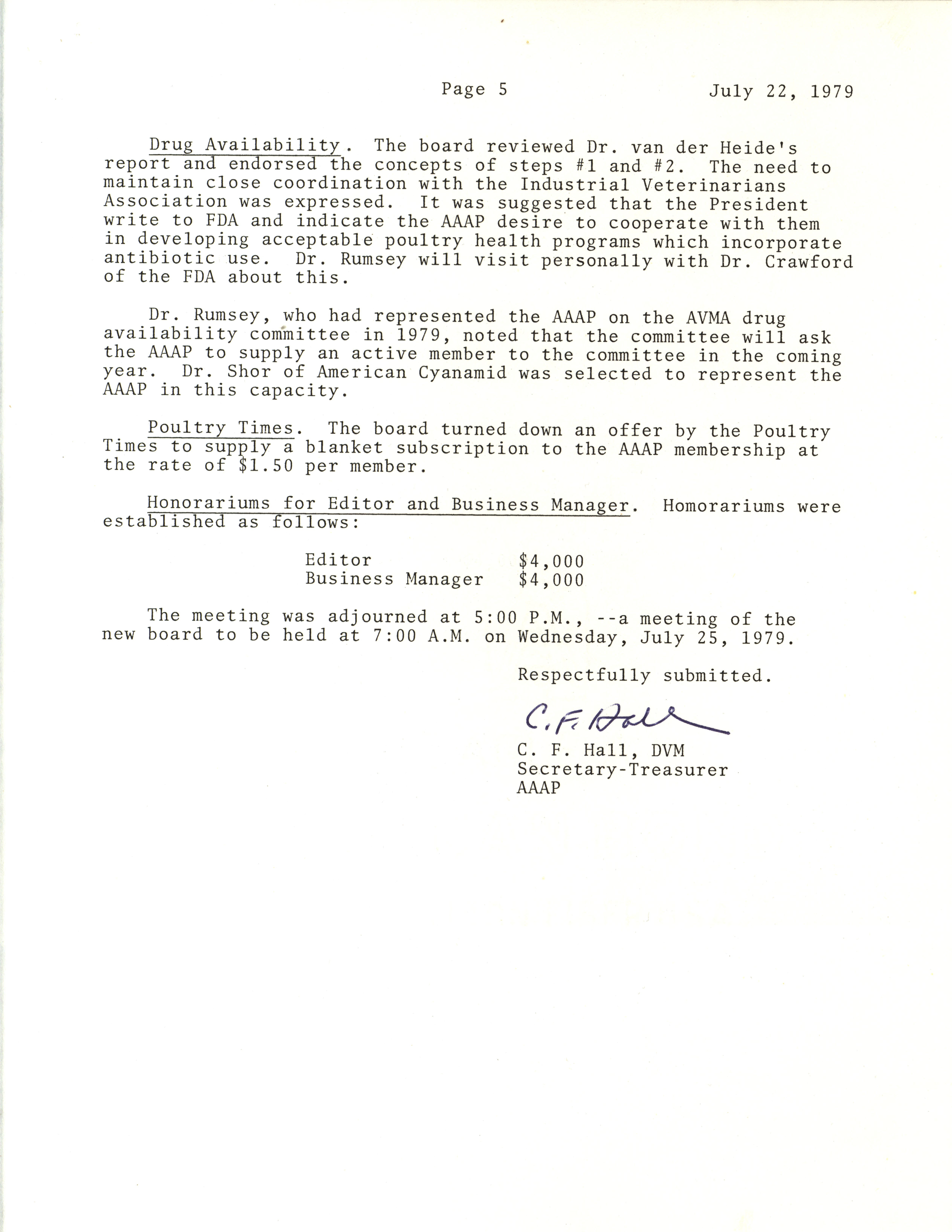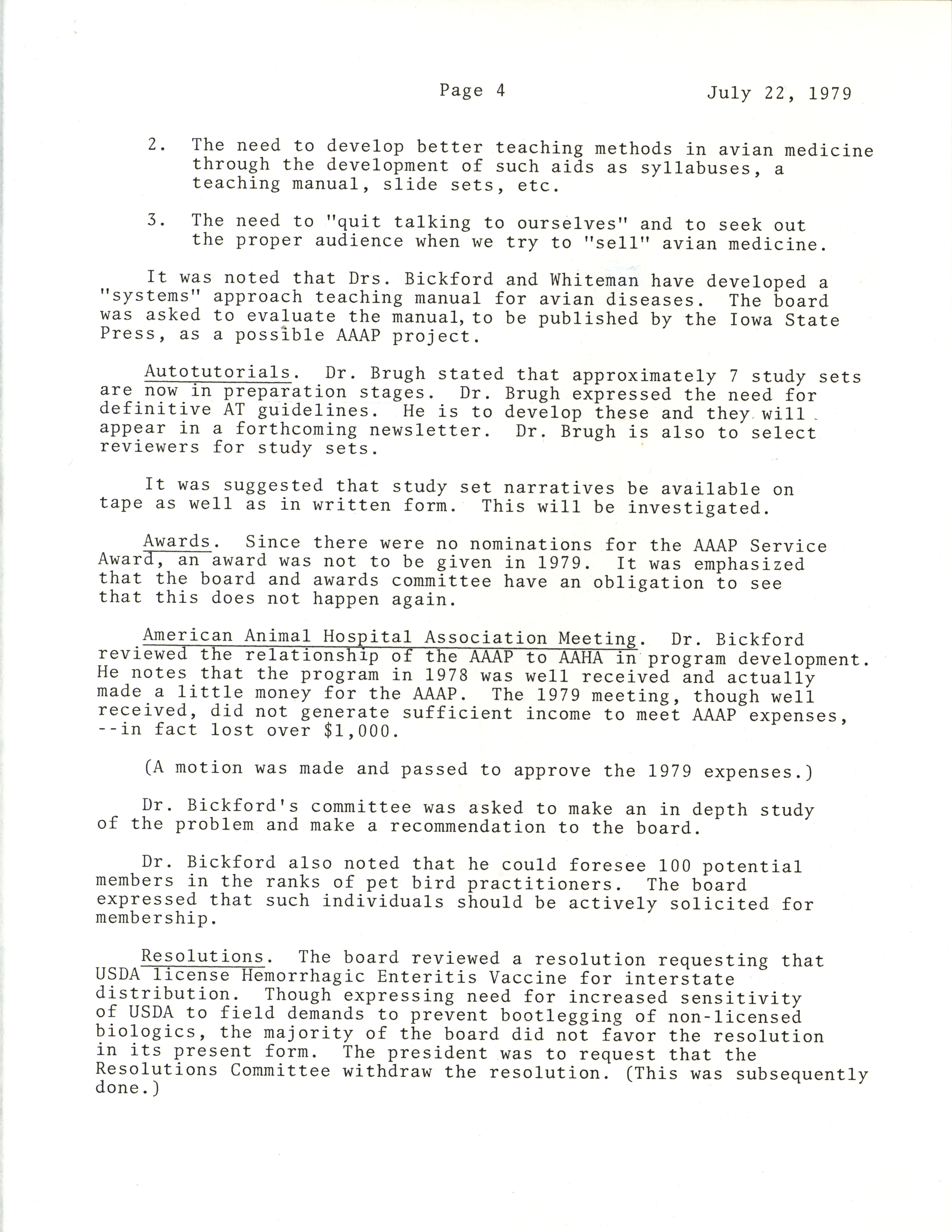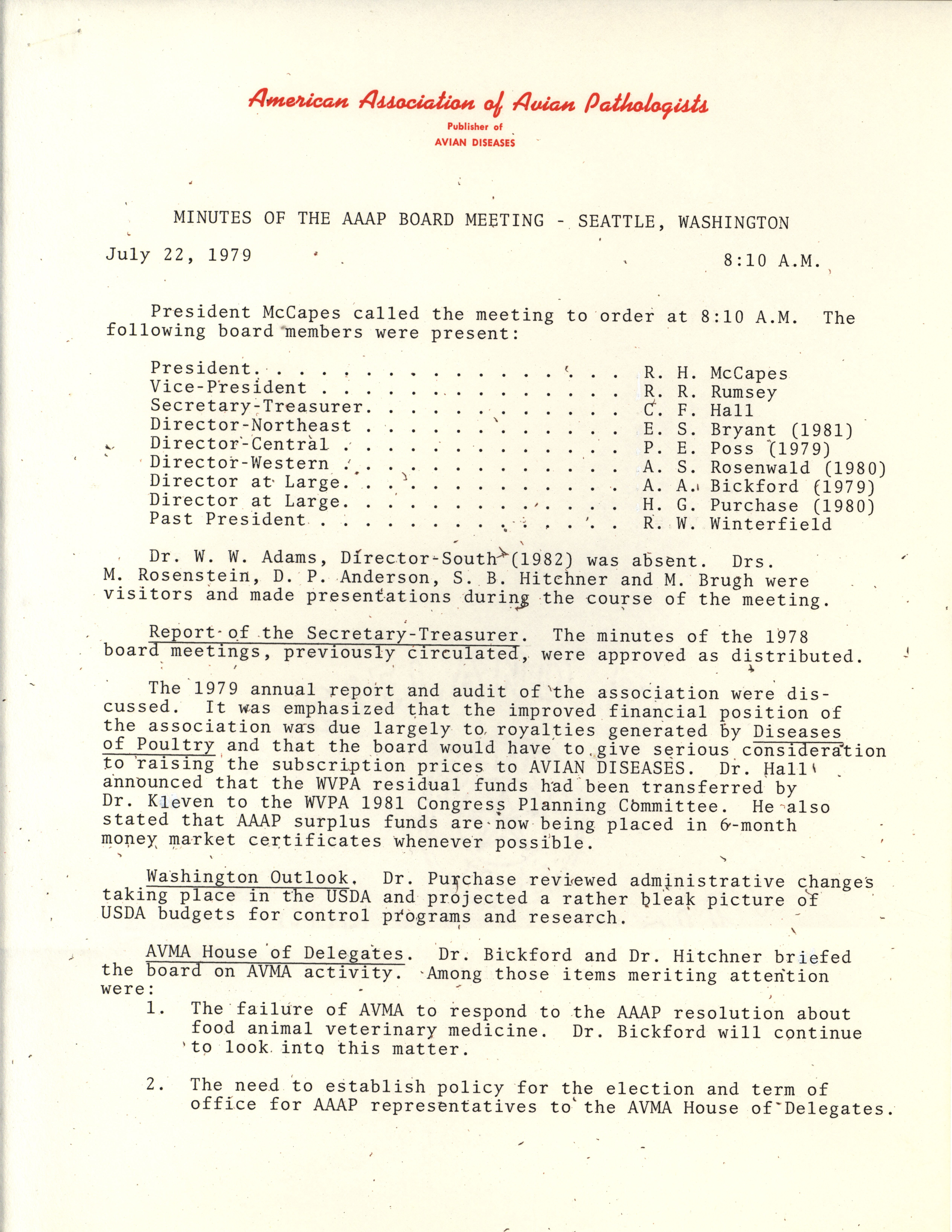 - Minutes of the July 22, 1979 American Association of Avian Pathologists Board Meeting held in Seattle, Washington. The minutes detail the report of the Secretary-Treasurer, the actions of the American Veterinary Medical Association and other topics of interest.