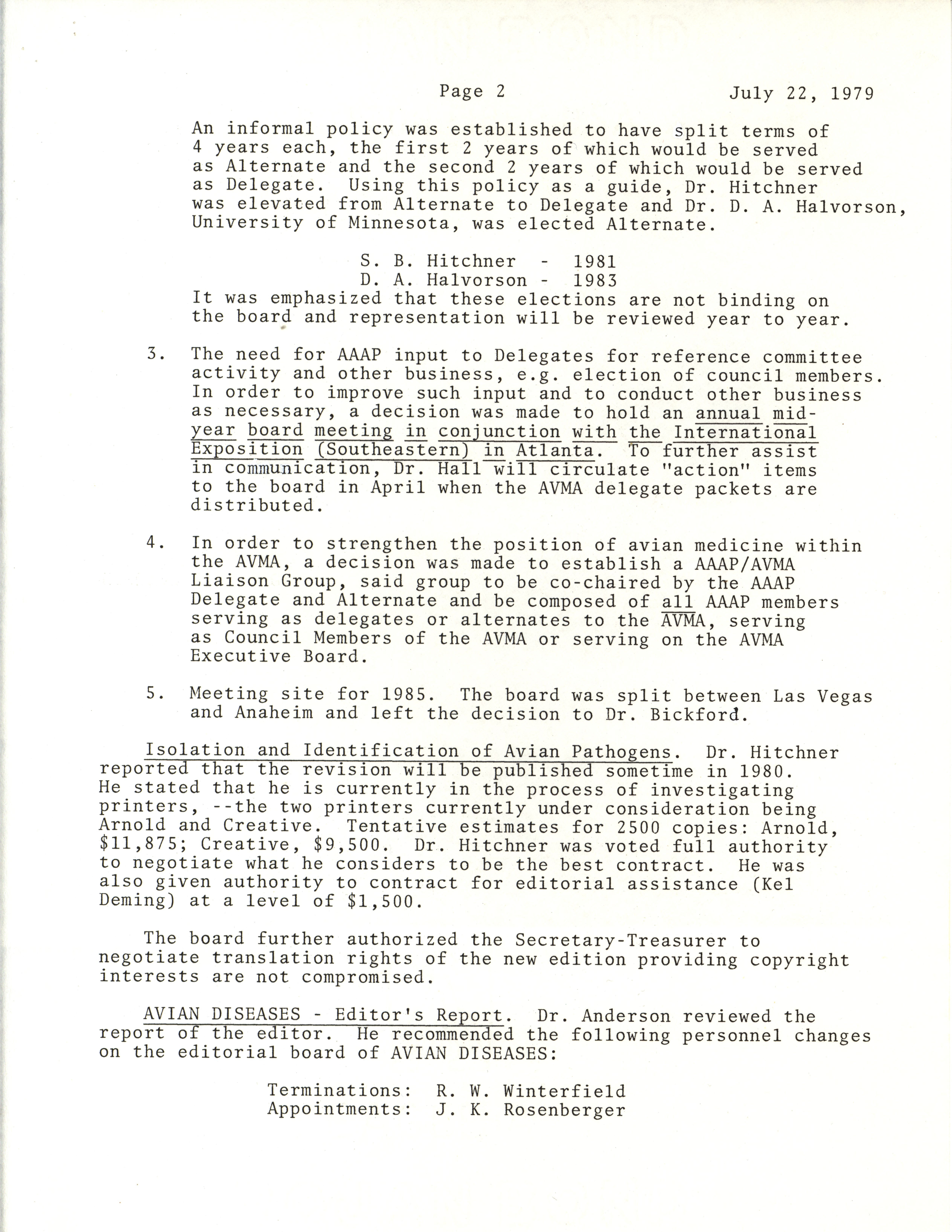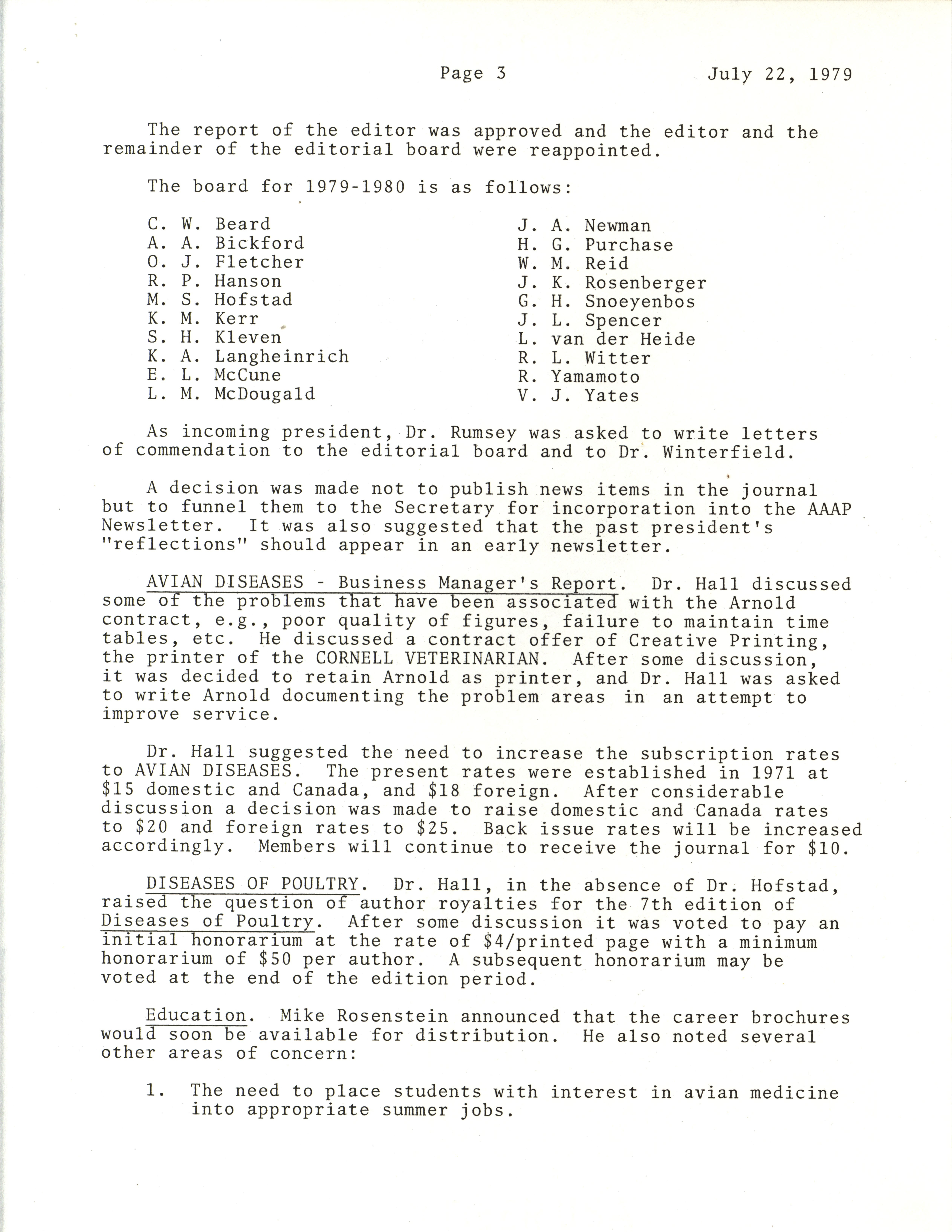 - "Minutes of the American Association of Avian Pathologists board meeting, July 22, 1979", American Association of Avian Pathologists Collection, Iowa State University Library Digital Collections