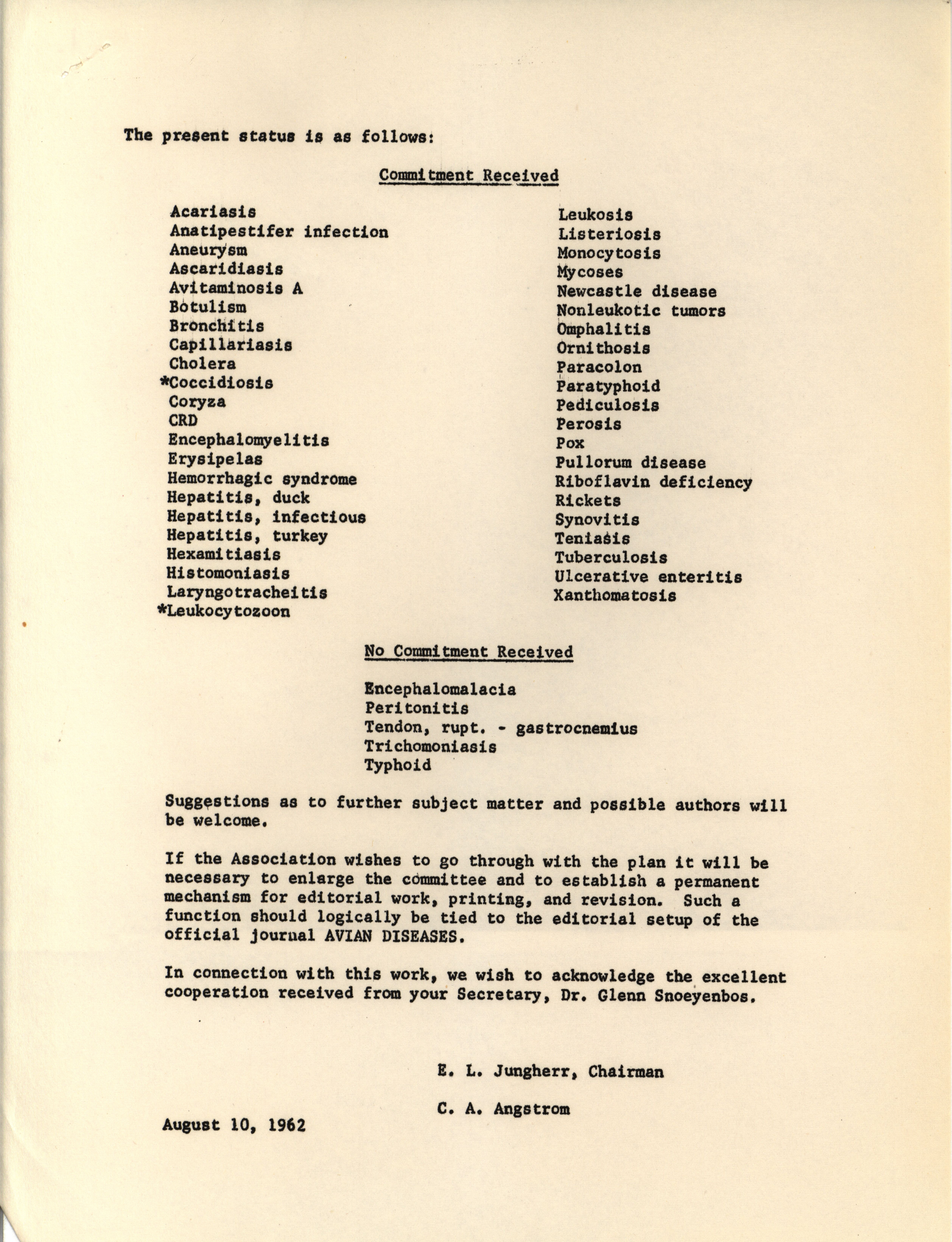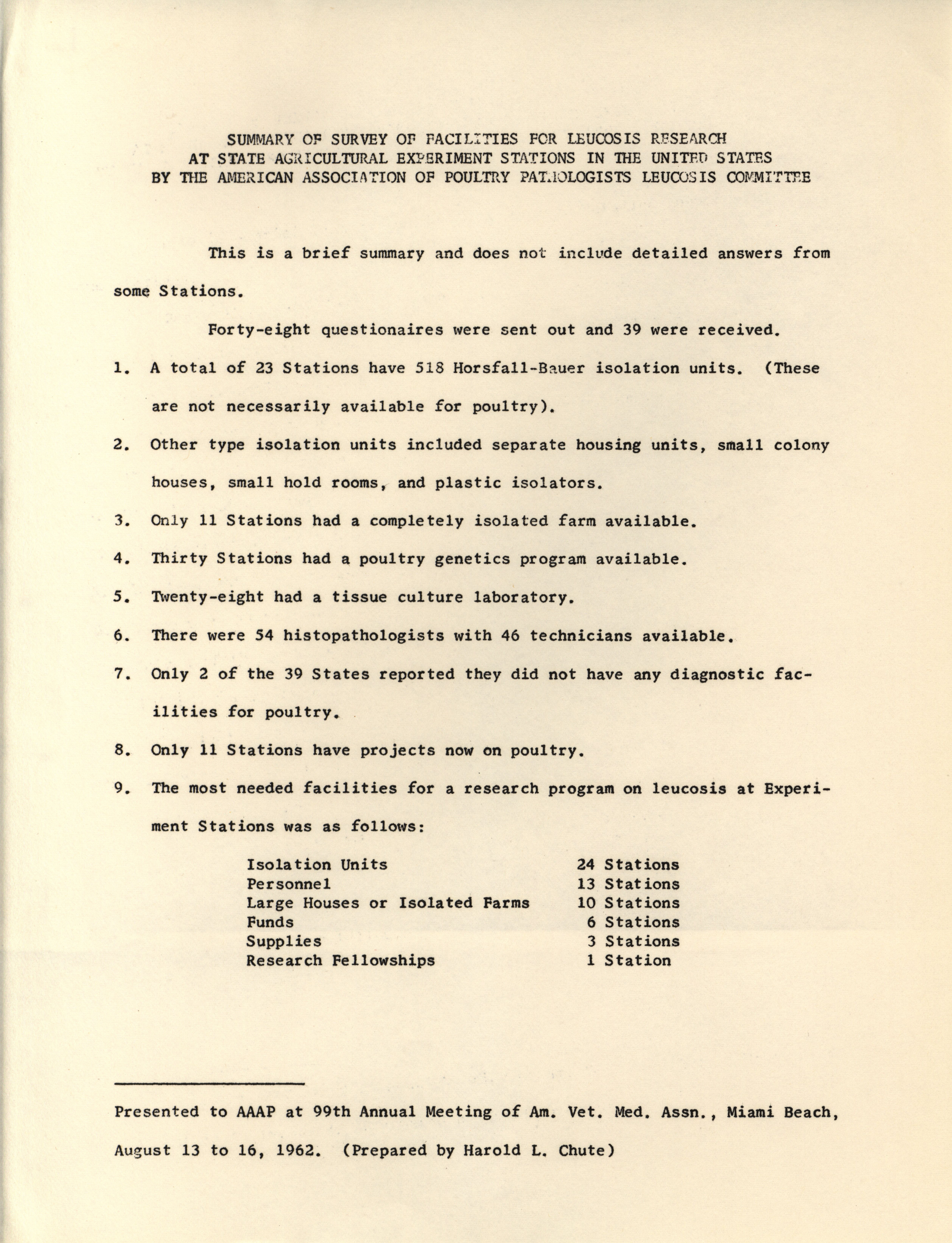- "American Association of Avian Pathologists report of the leukosis committee, August 13, 1962", American Association of Avian Pathologists Collection, Iowa State University Library Digital Collections
