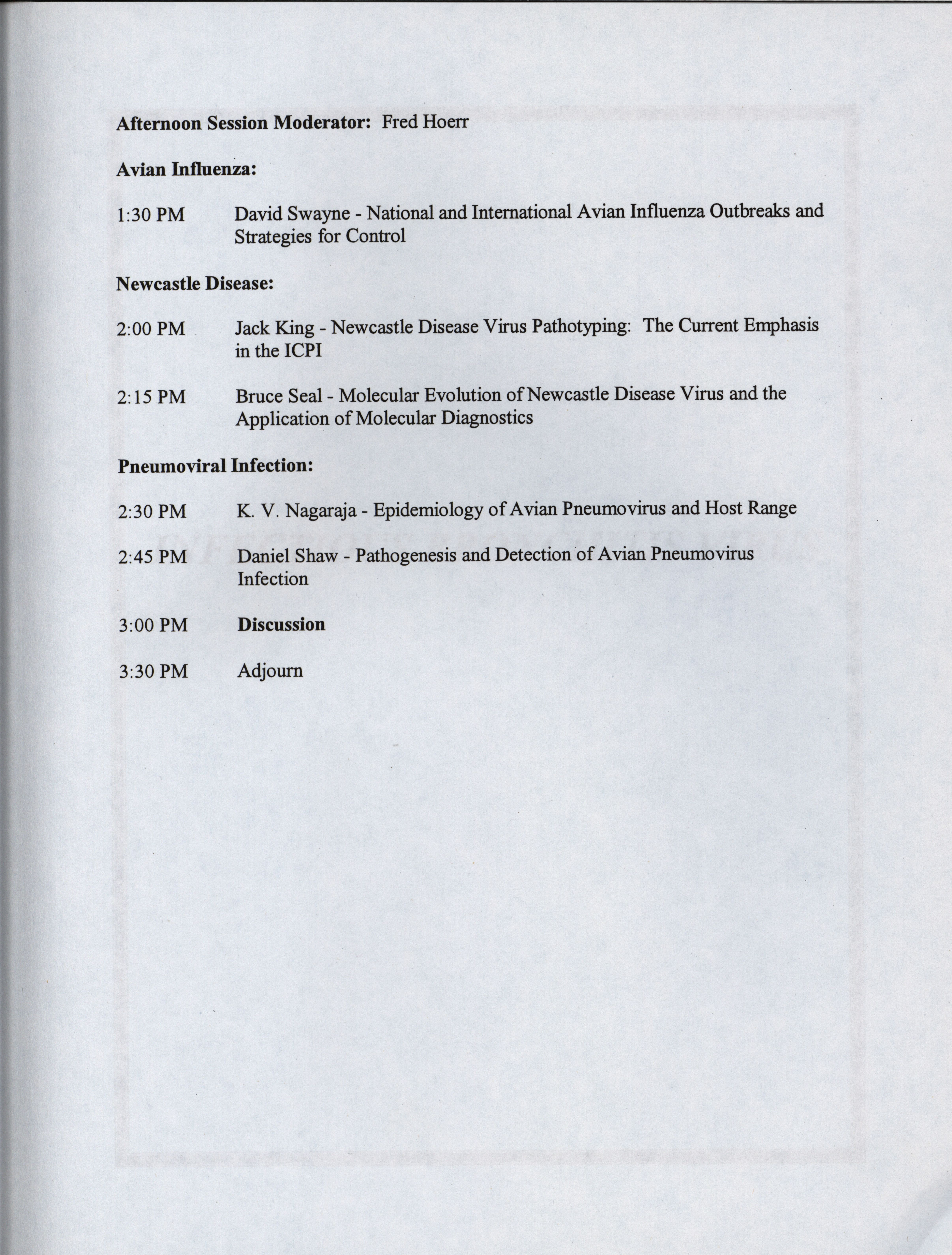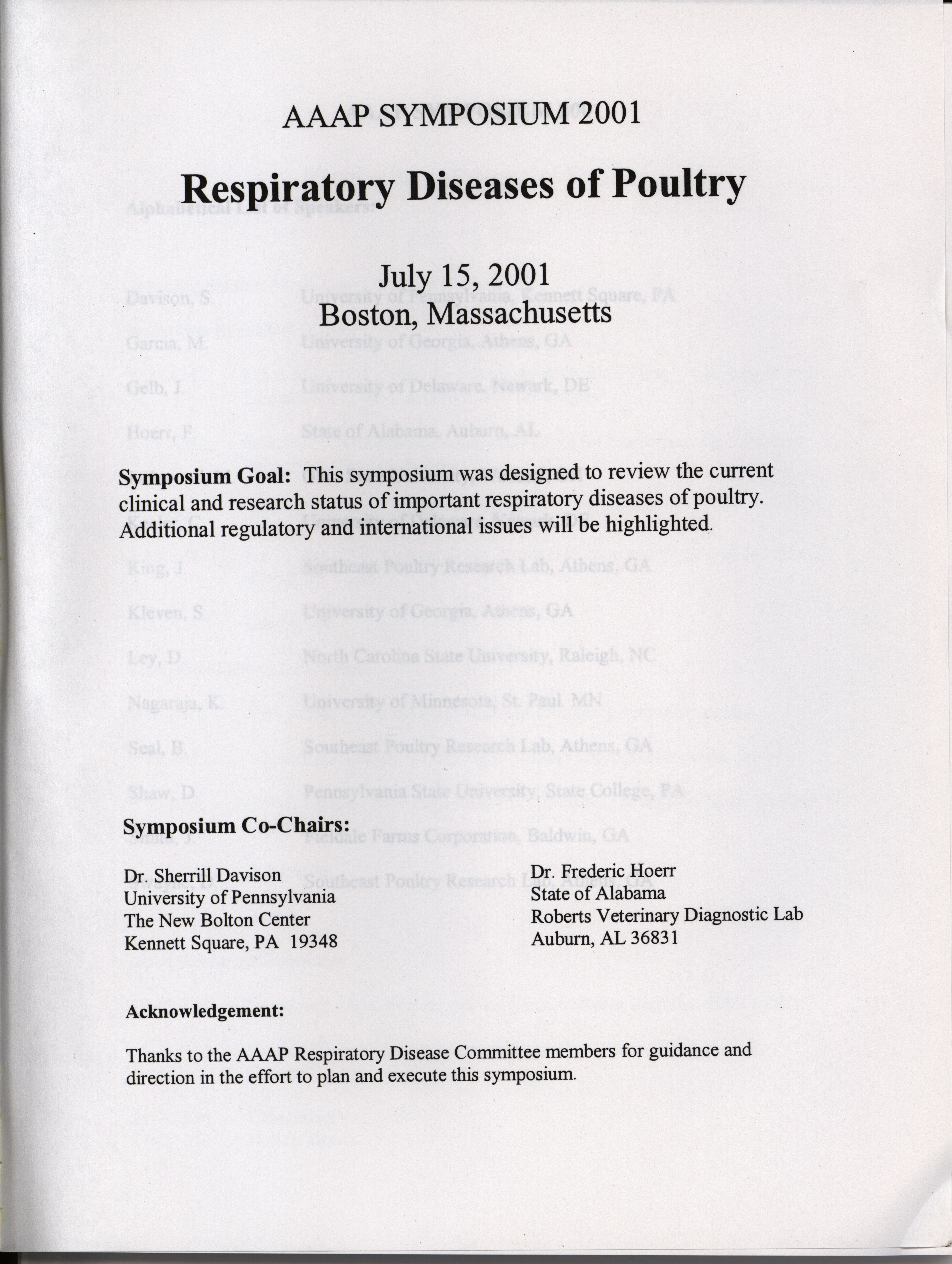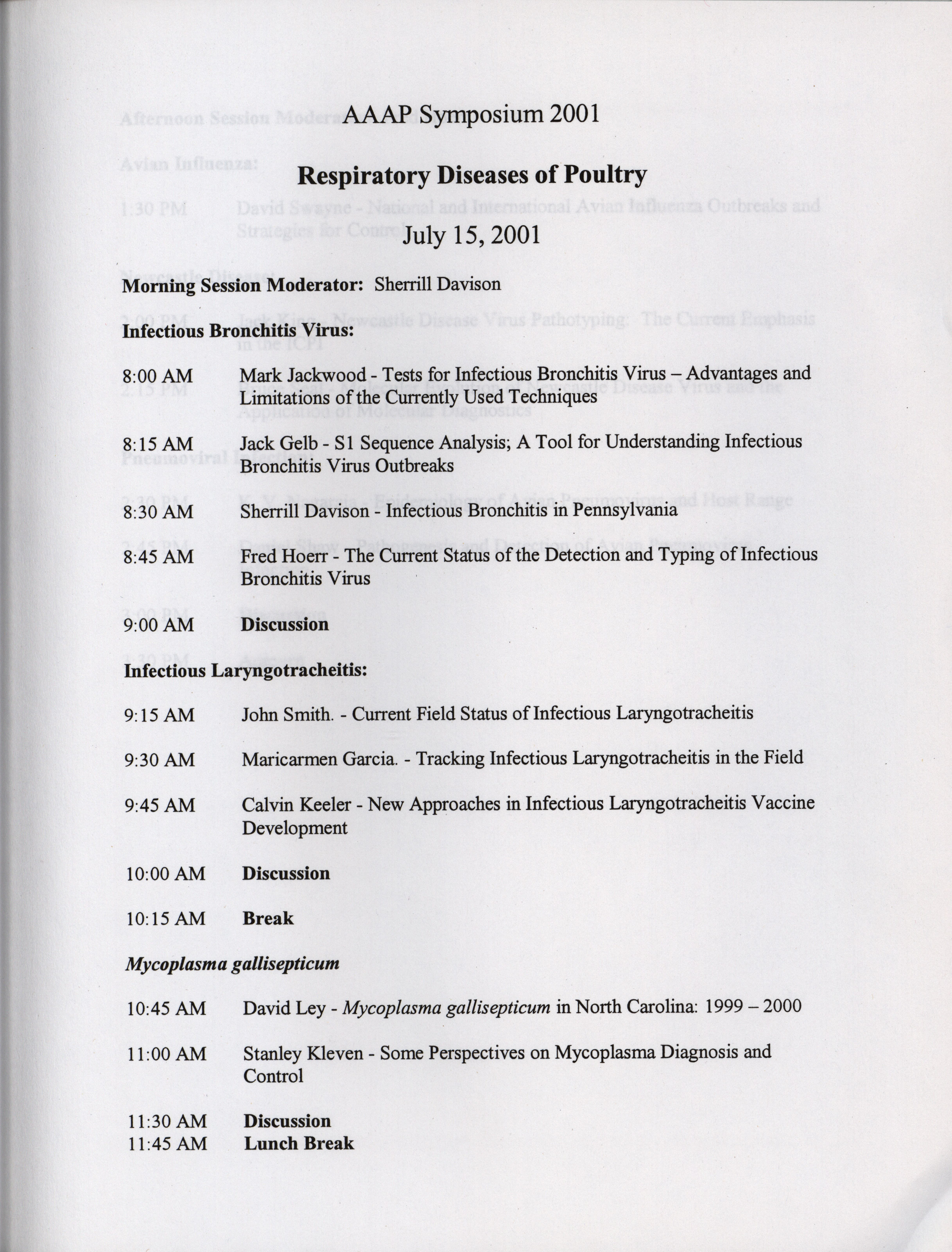 - Schedule and abstracts for a symposium on respiratory diseases of poultry from July 15, 2001 hosted by the American Association of Avian Pathologists in Boston, Massachusetts.