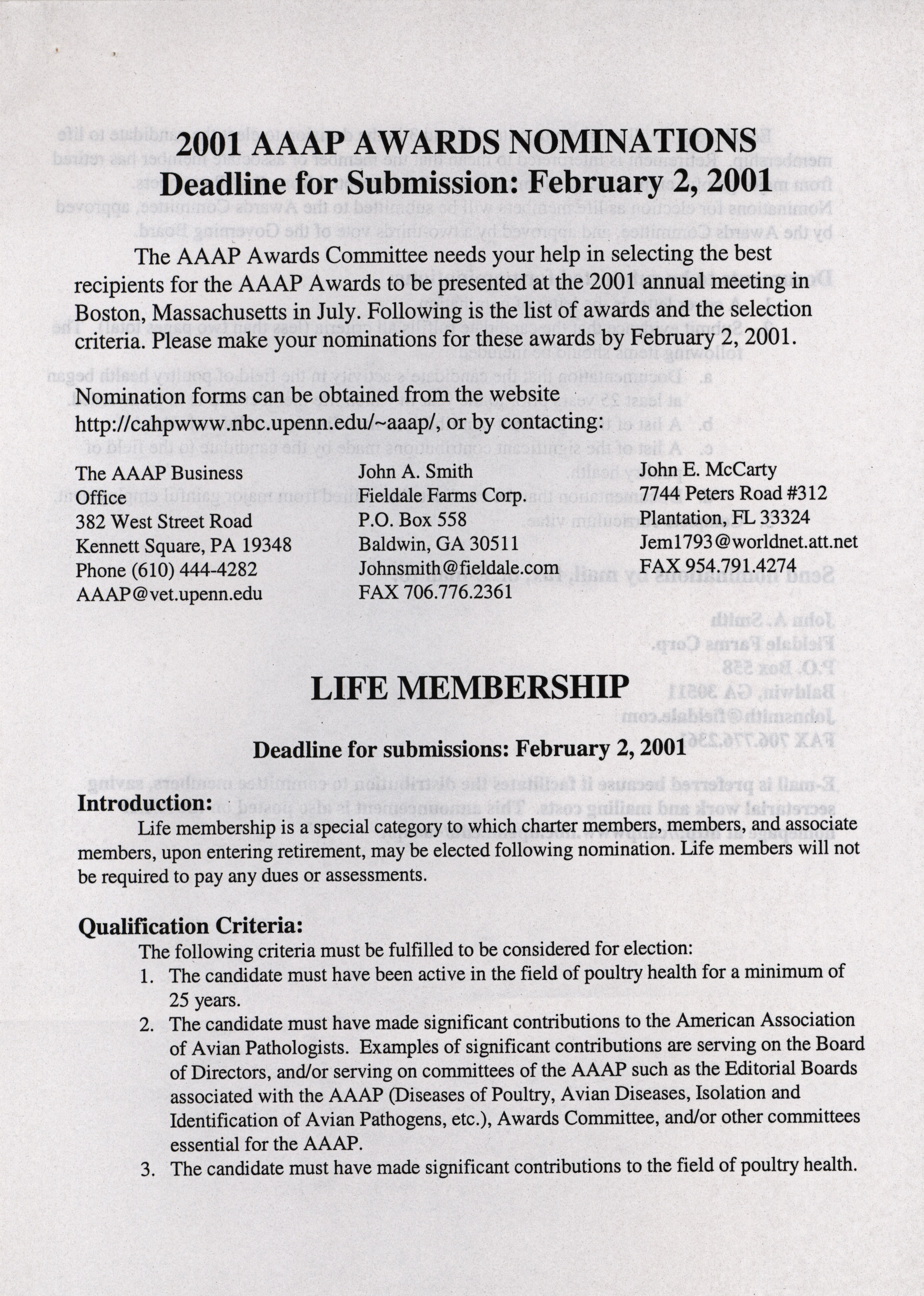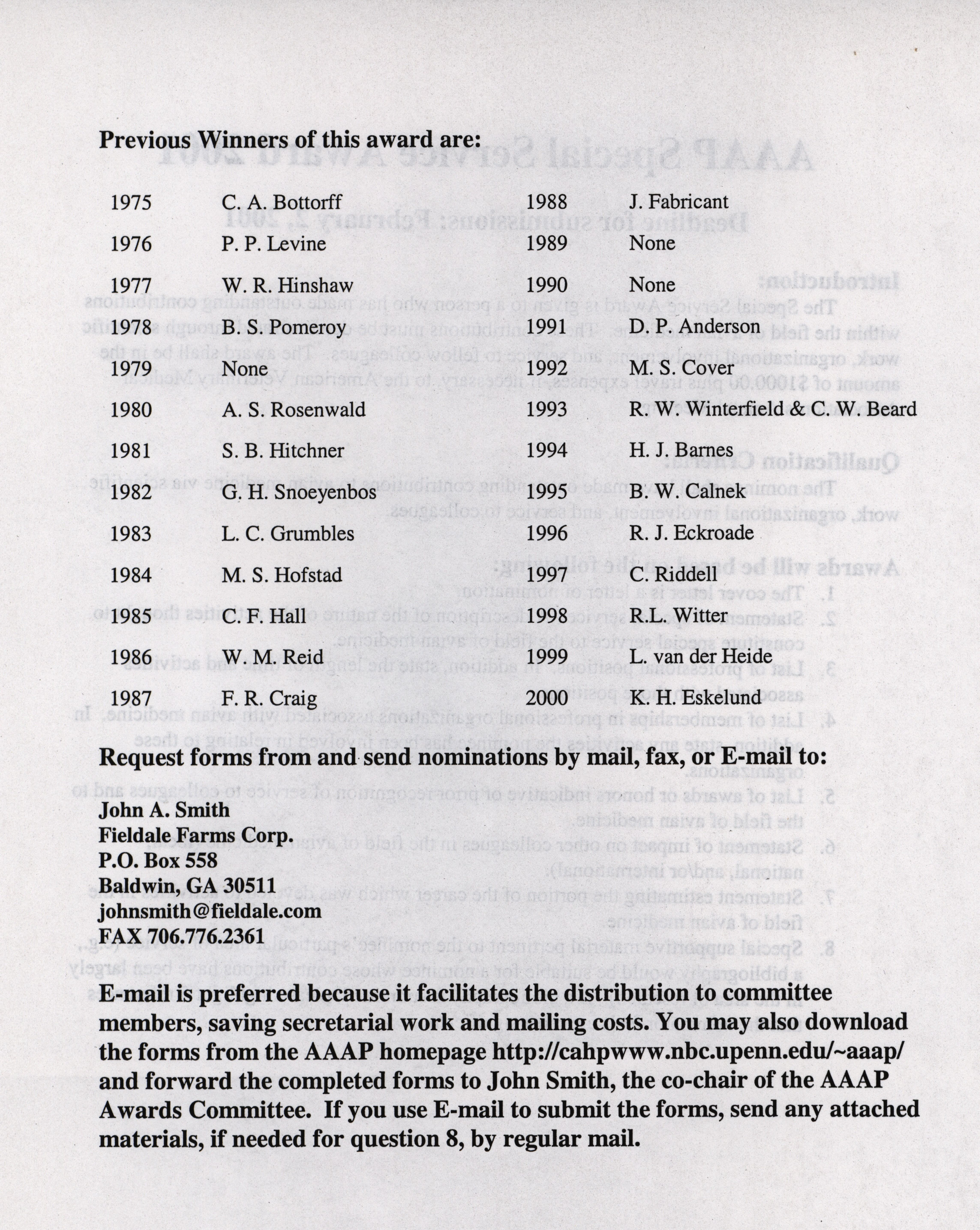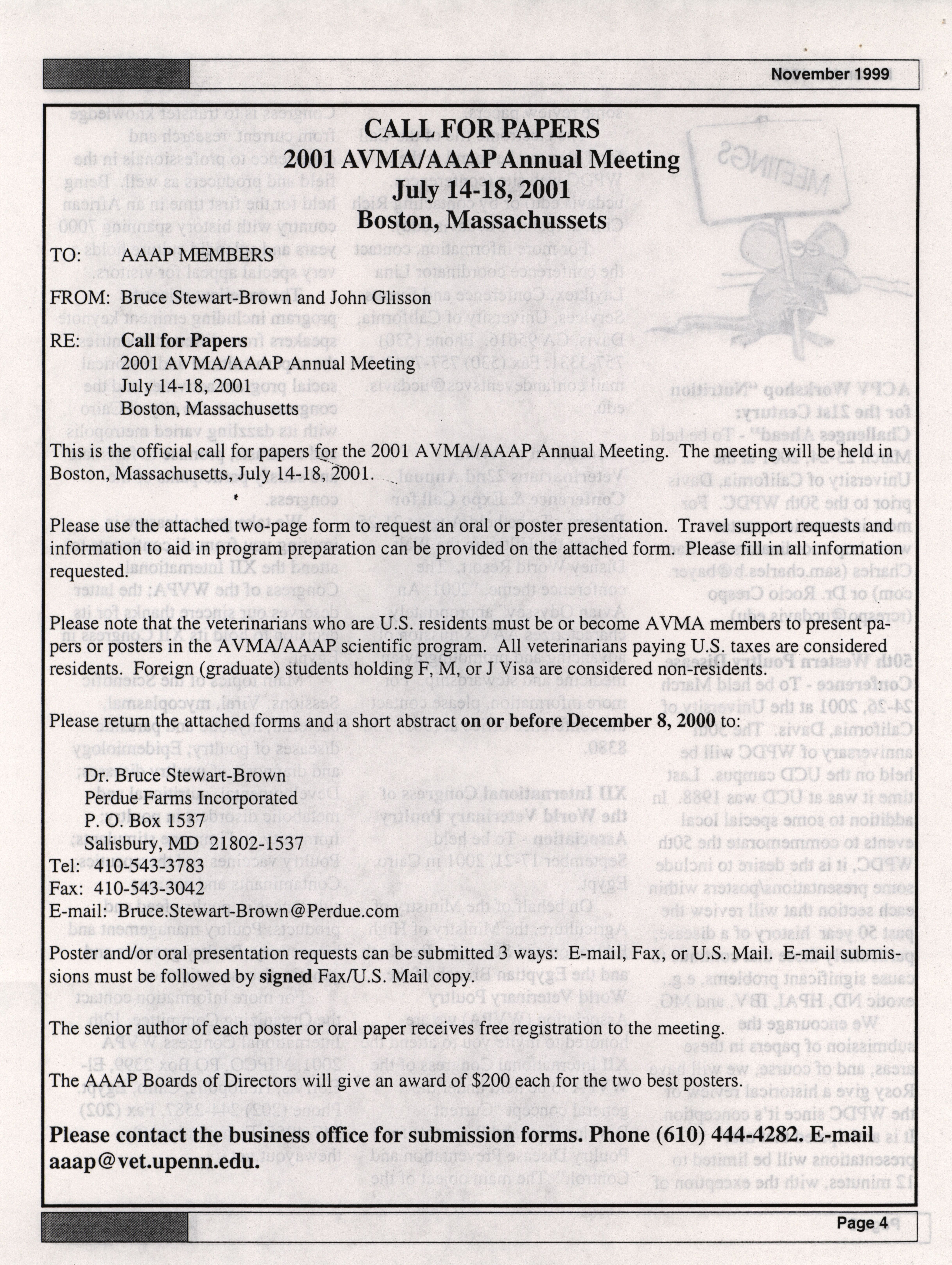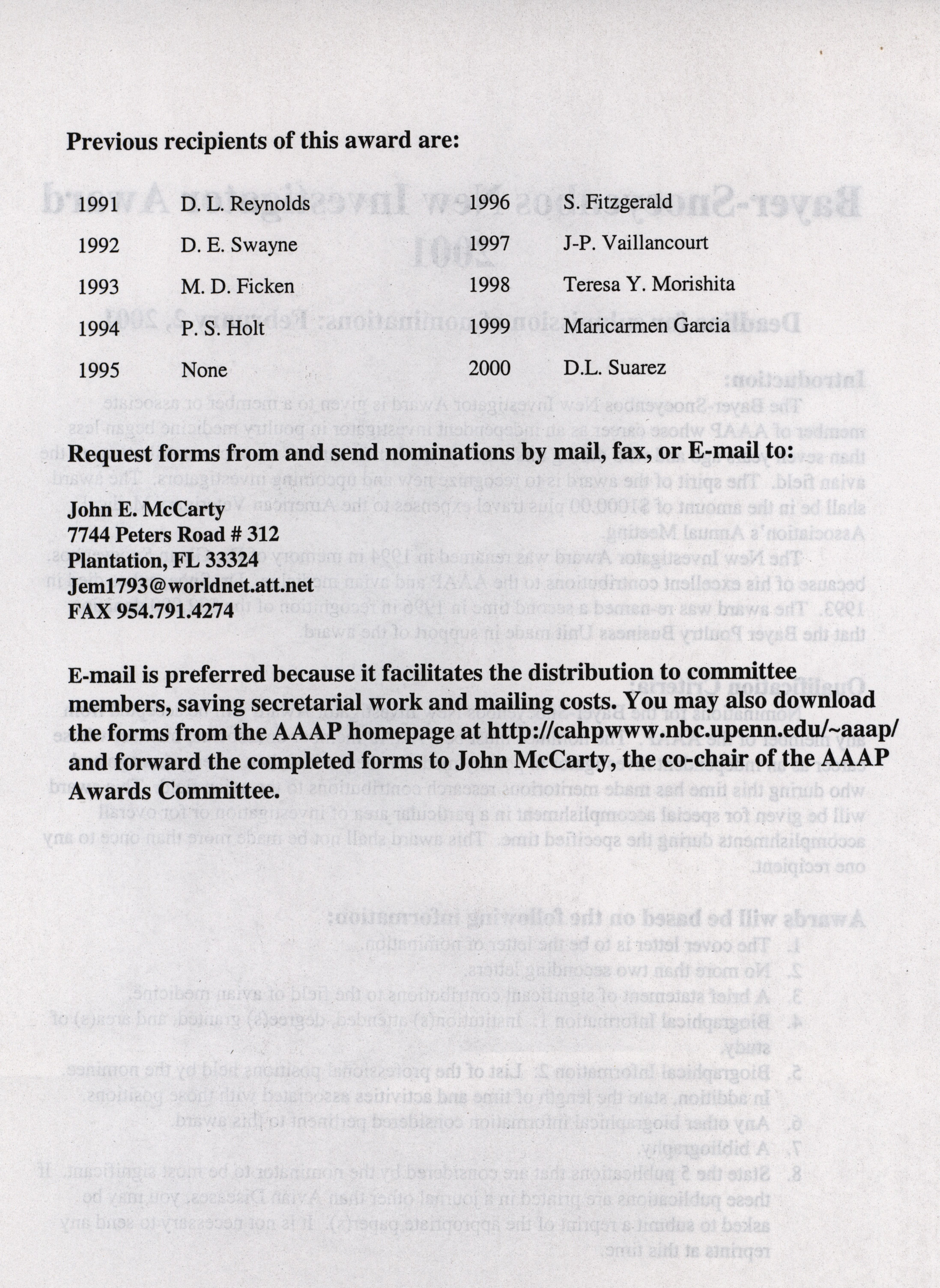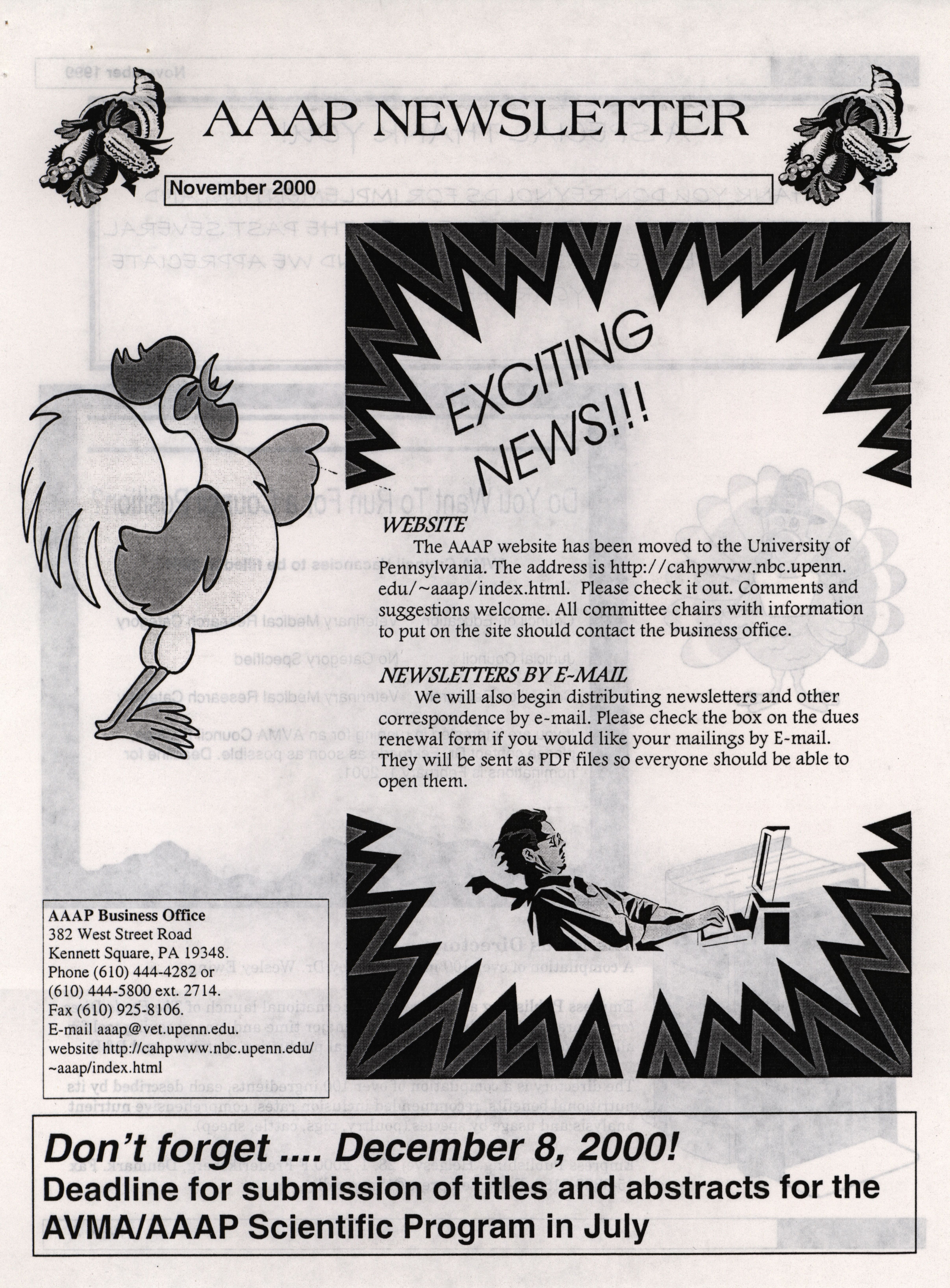 - The newsletter of the American Association of Avian Pathologists, November 2000. The quarterly newsletter features several different topics, including meeting schedules, a call for papers for the 2001 AVMA (American Veterinary Medical Association)/AAAP annual meeting, and a request for nominations for various 2001 AAAP awards.