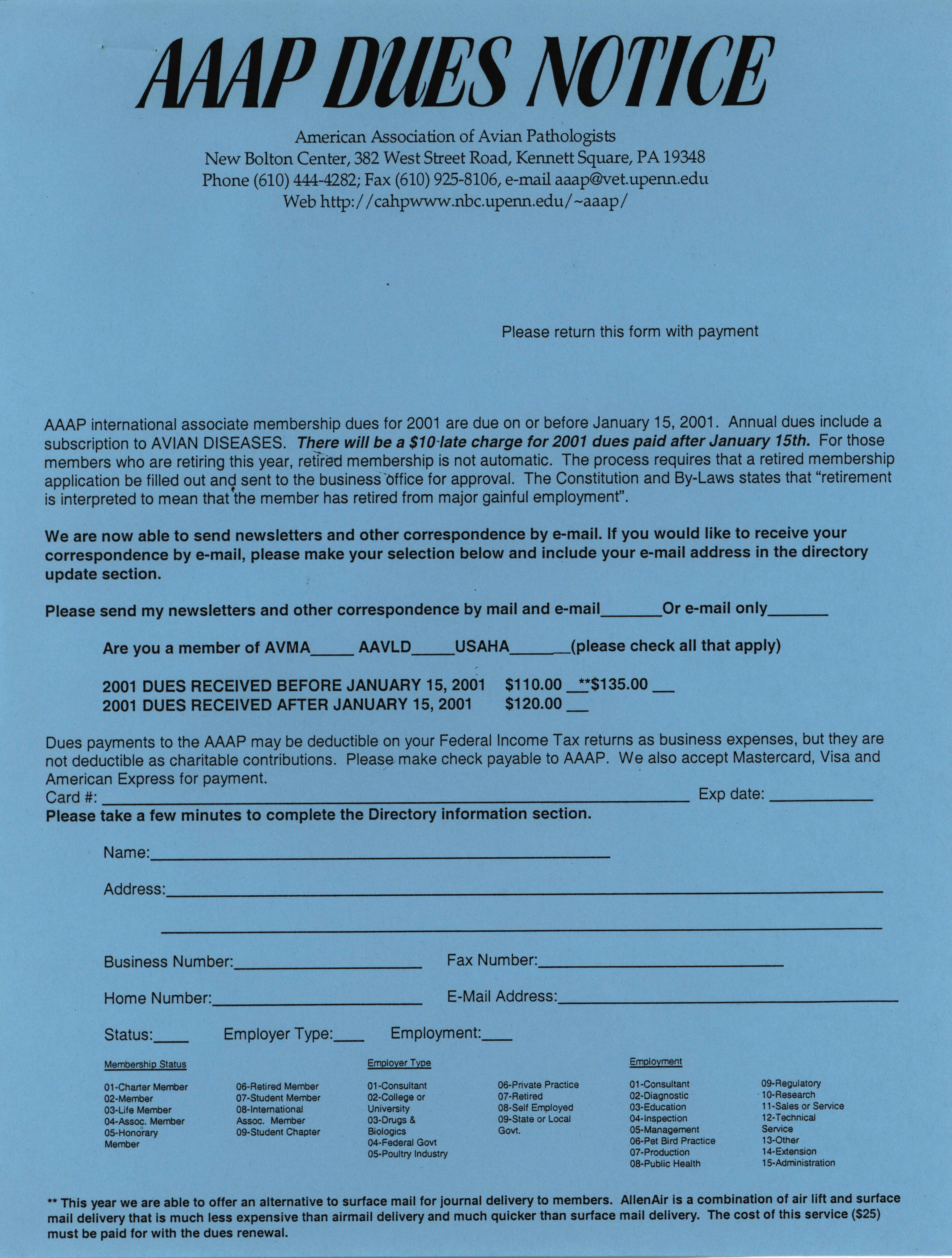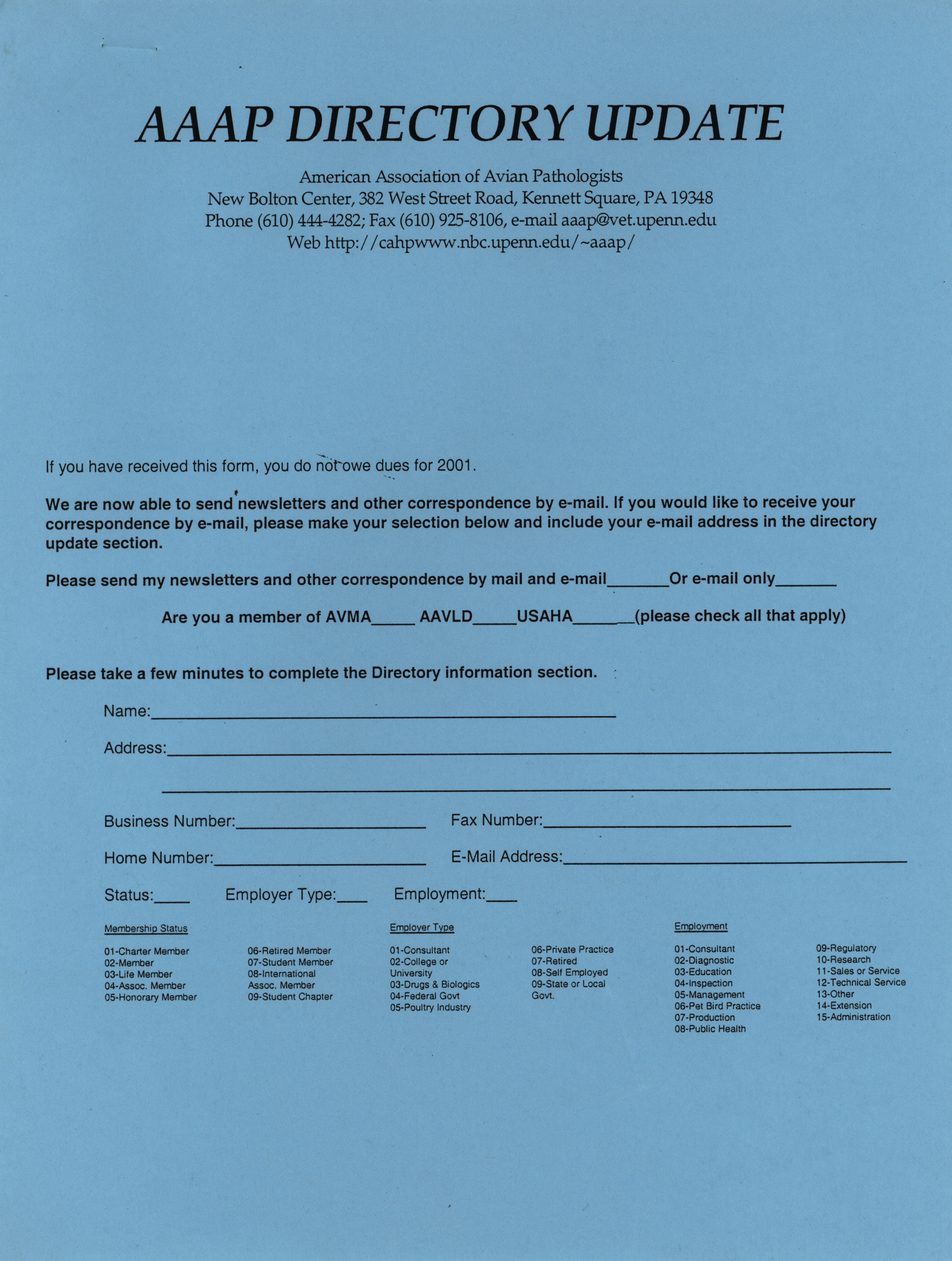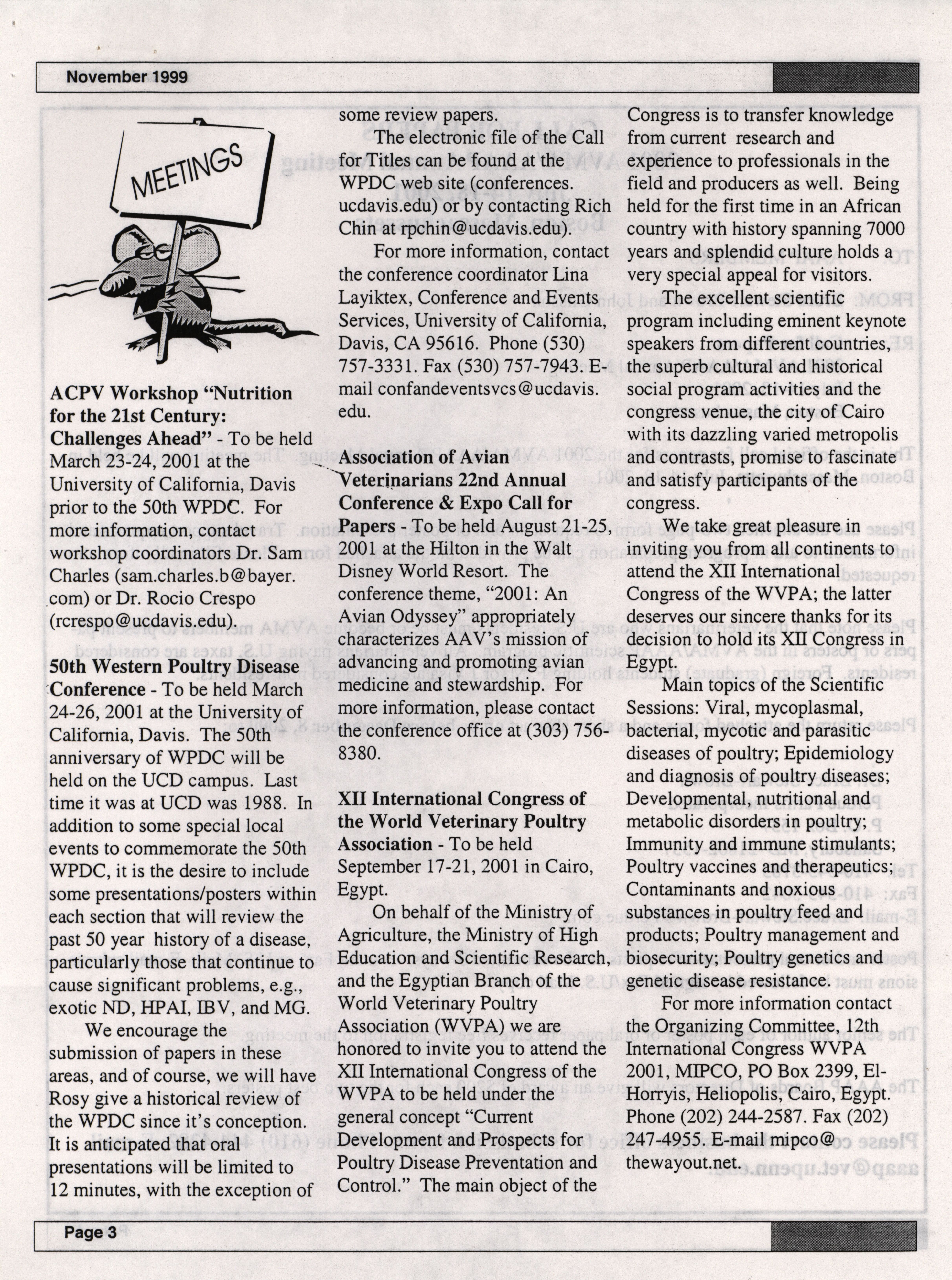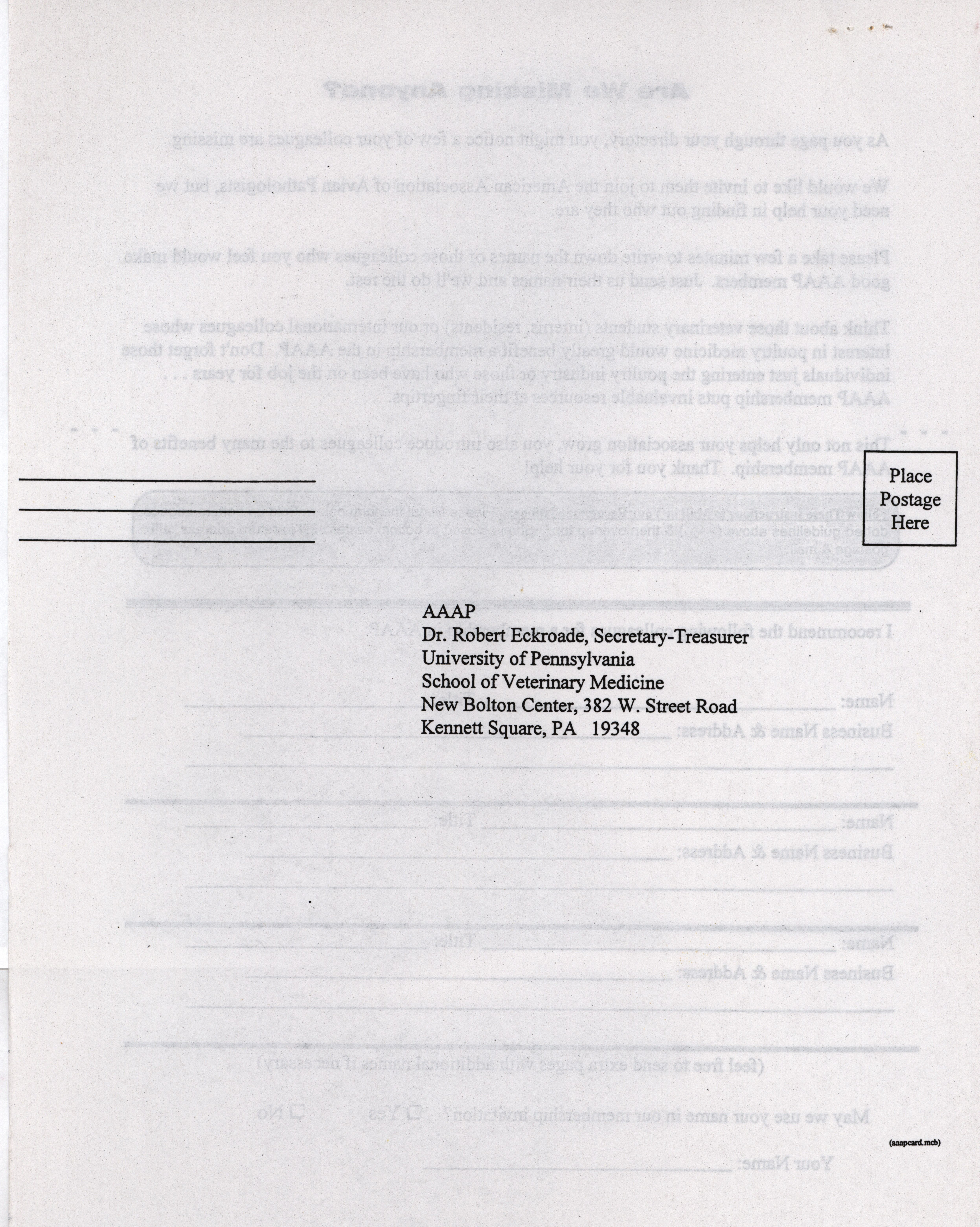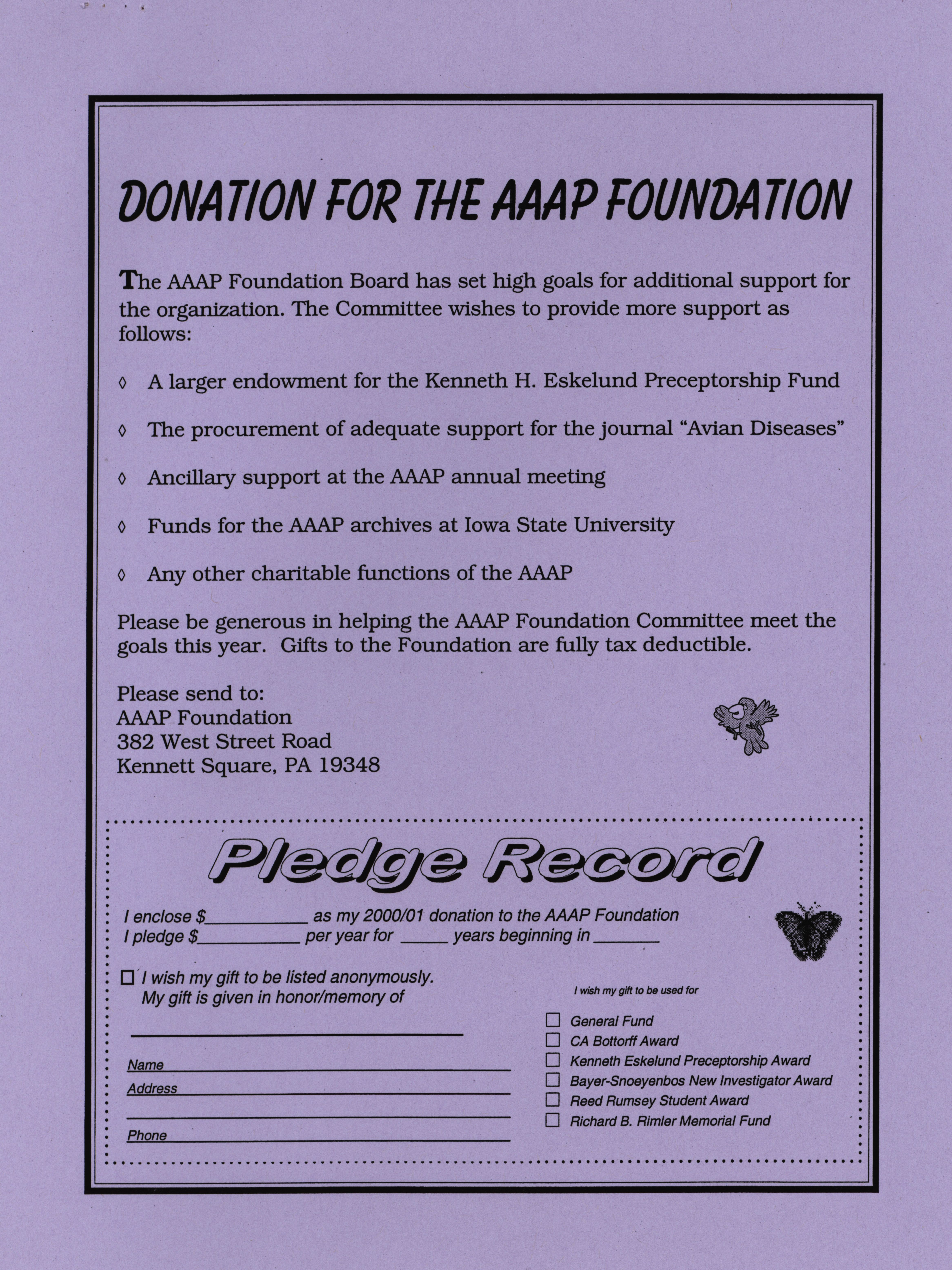 - The newsletter of the American Association of Avian Pathologists, November 2000. The quarterly newsletter features several different topics, including meeting schedules, a call for papers for the 2001 AVMA (American Veterinary Medical Association)/AAAP annual meeting, and a request for nominations for various 2001 AAAP awards.
