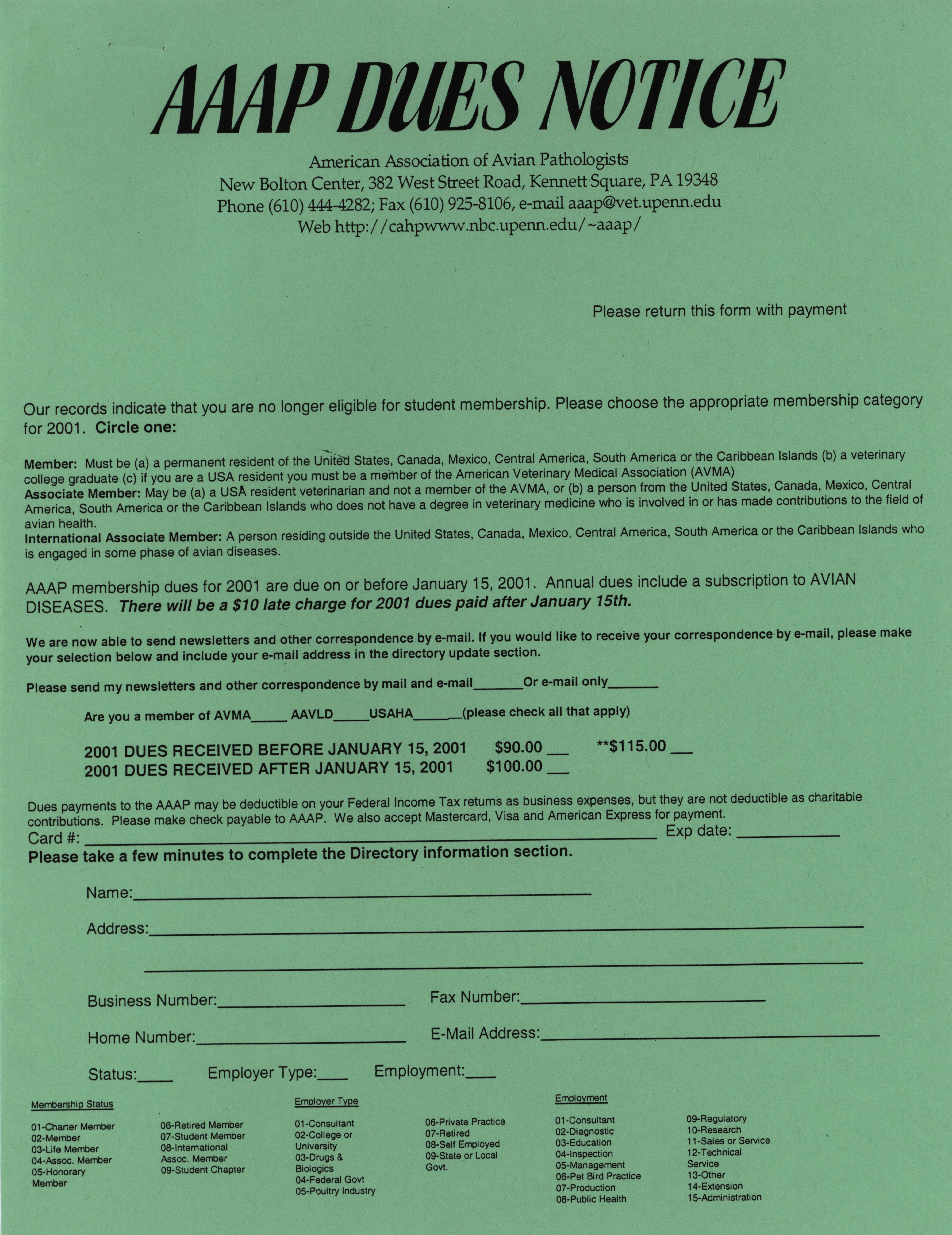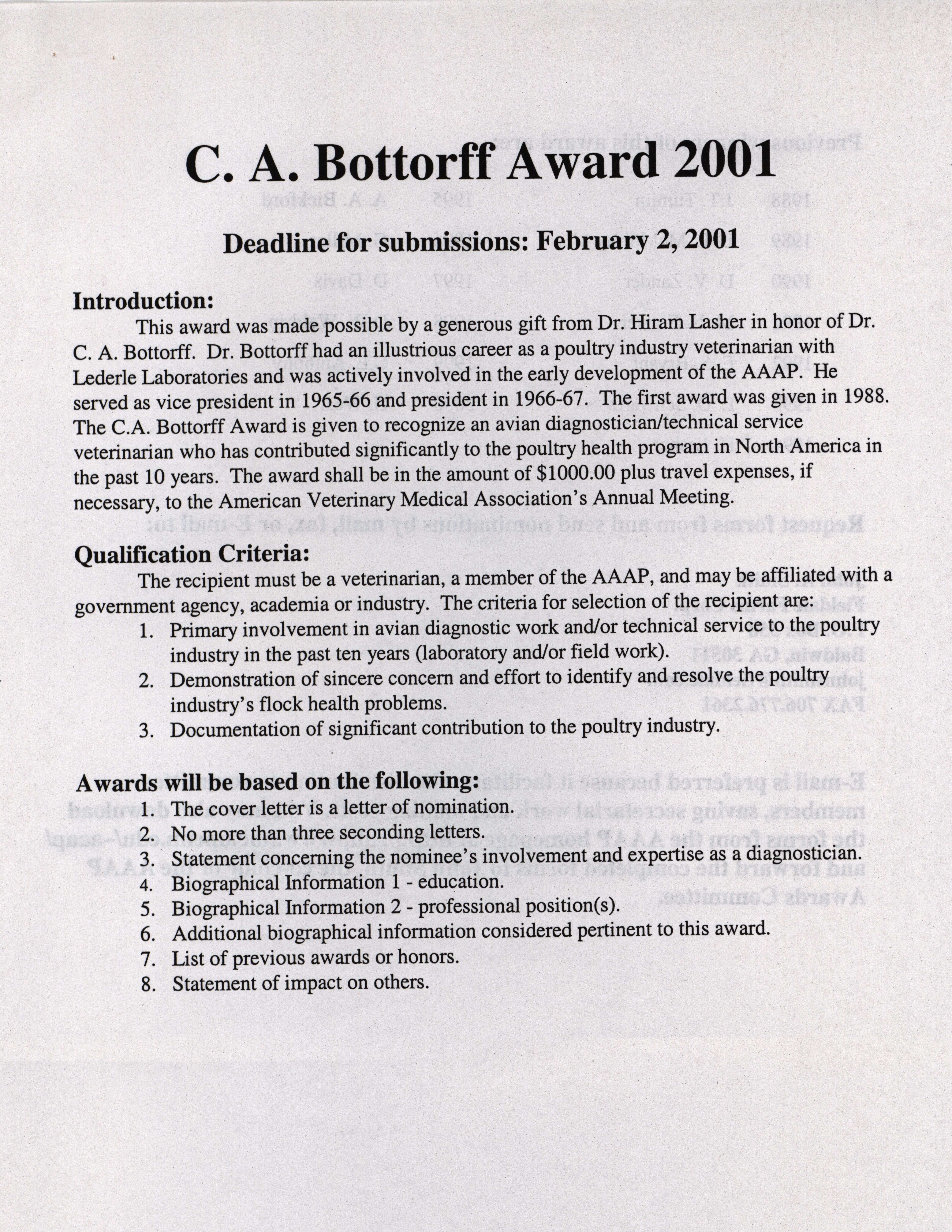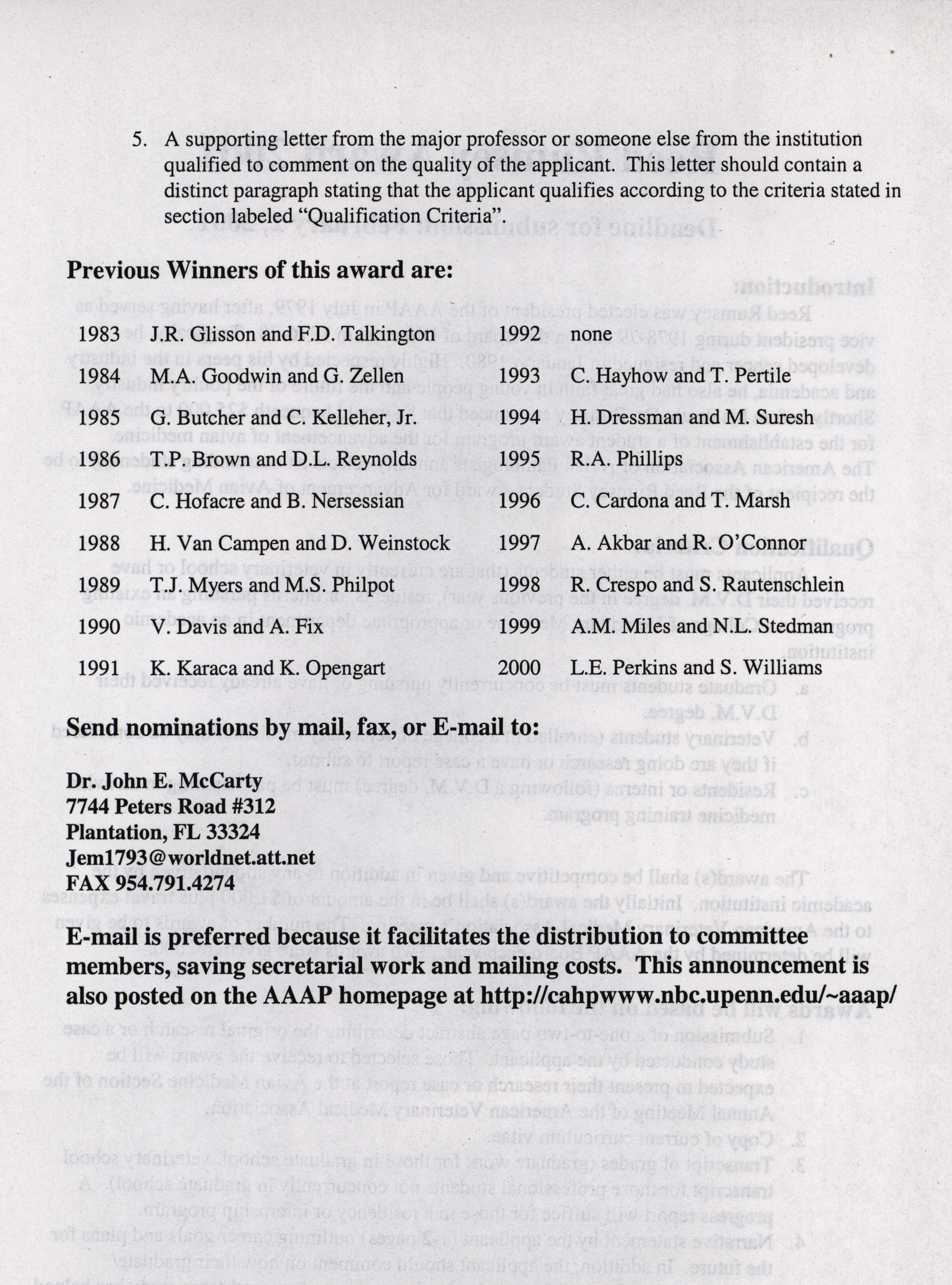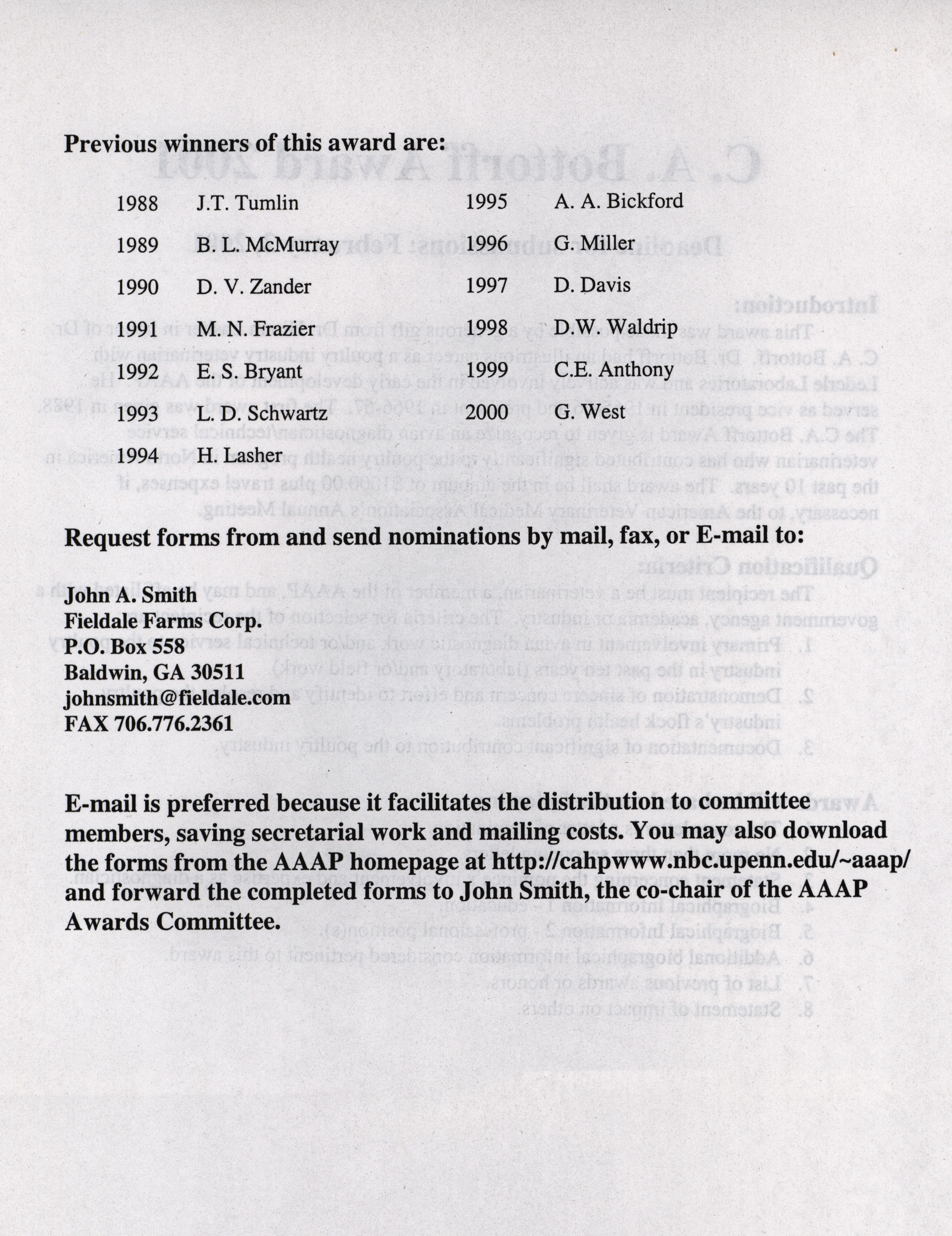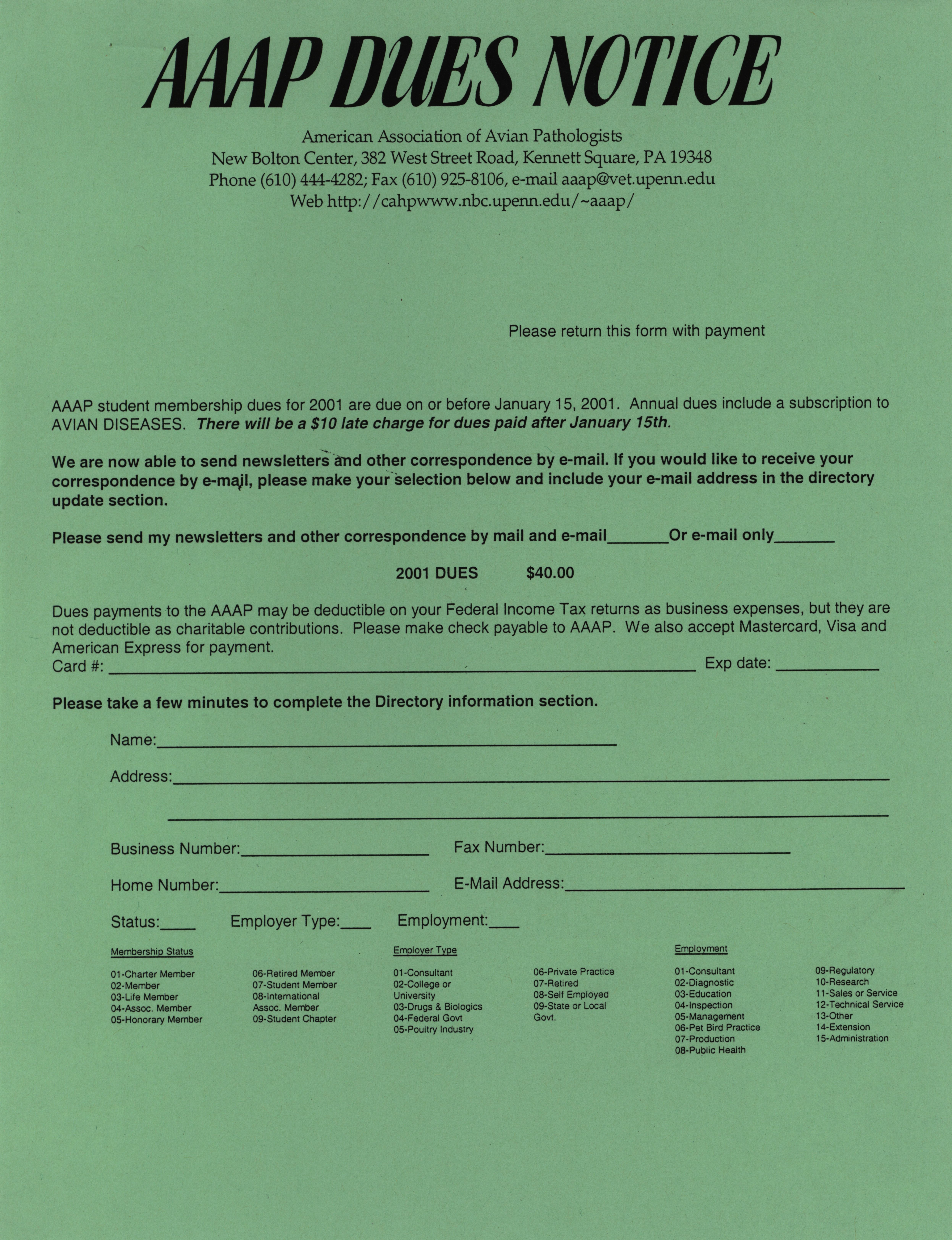 - The newsletter of the American Association of Avian Pathologists, November 2000. The quarterly newsletter features several different topics, including meeting schedules, a call for papers for the 2001 AVMA (American Veterinary Medical Association)/AAAP annual meeting, and a request for nominations for various 2001 AAAP awards.