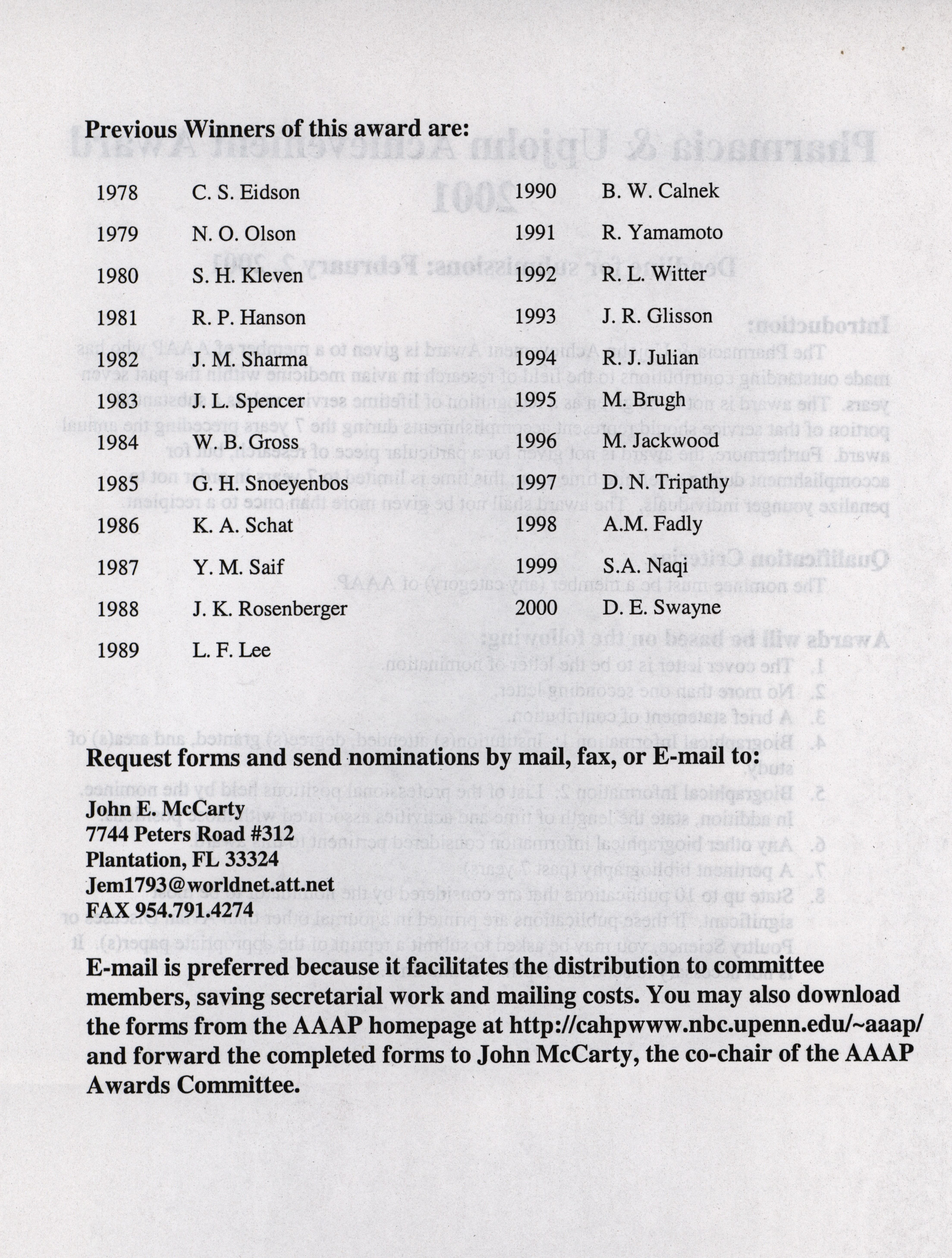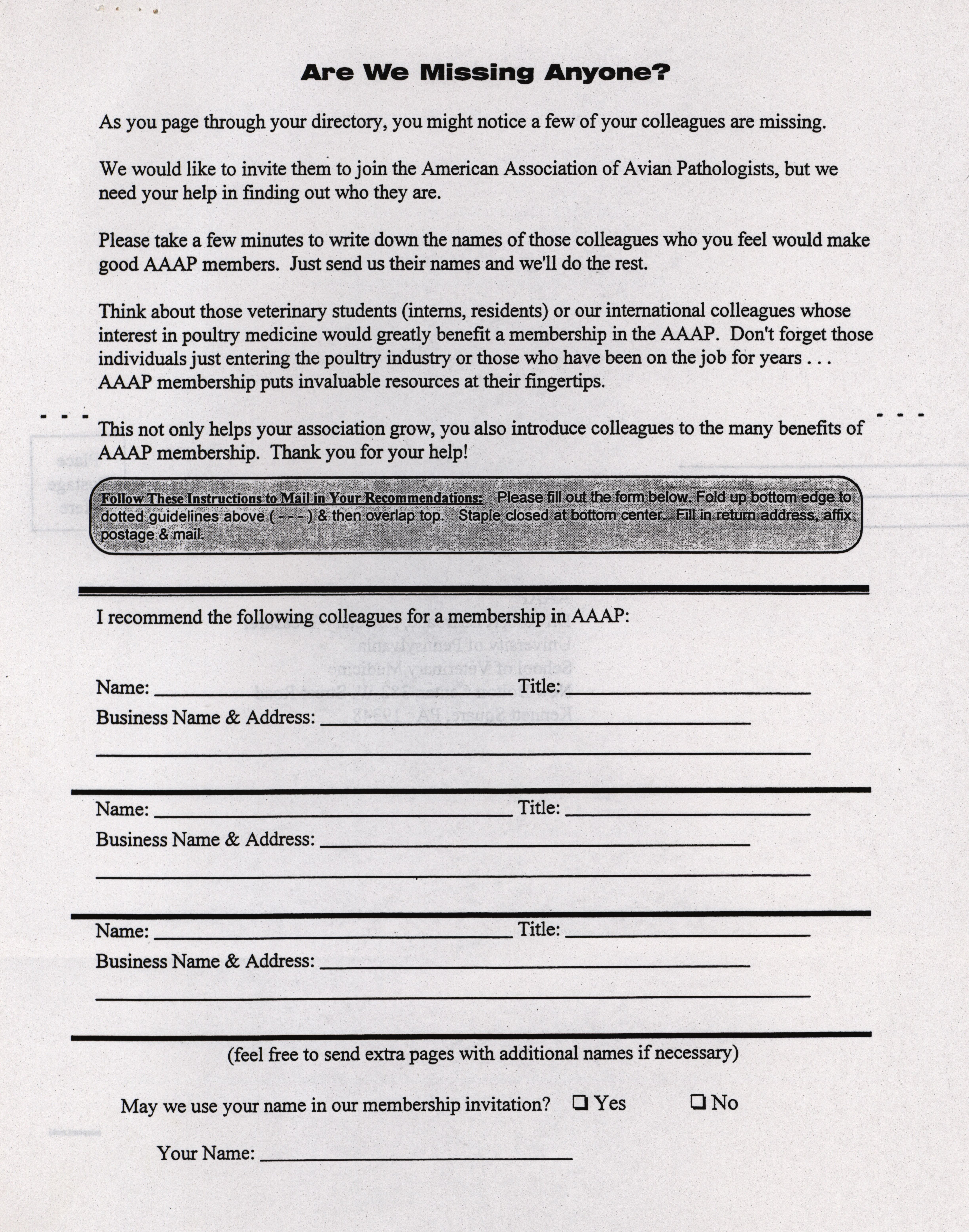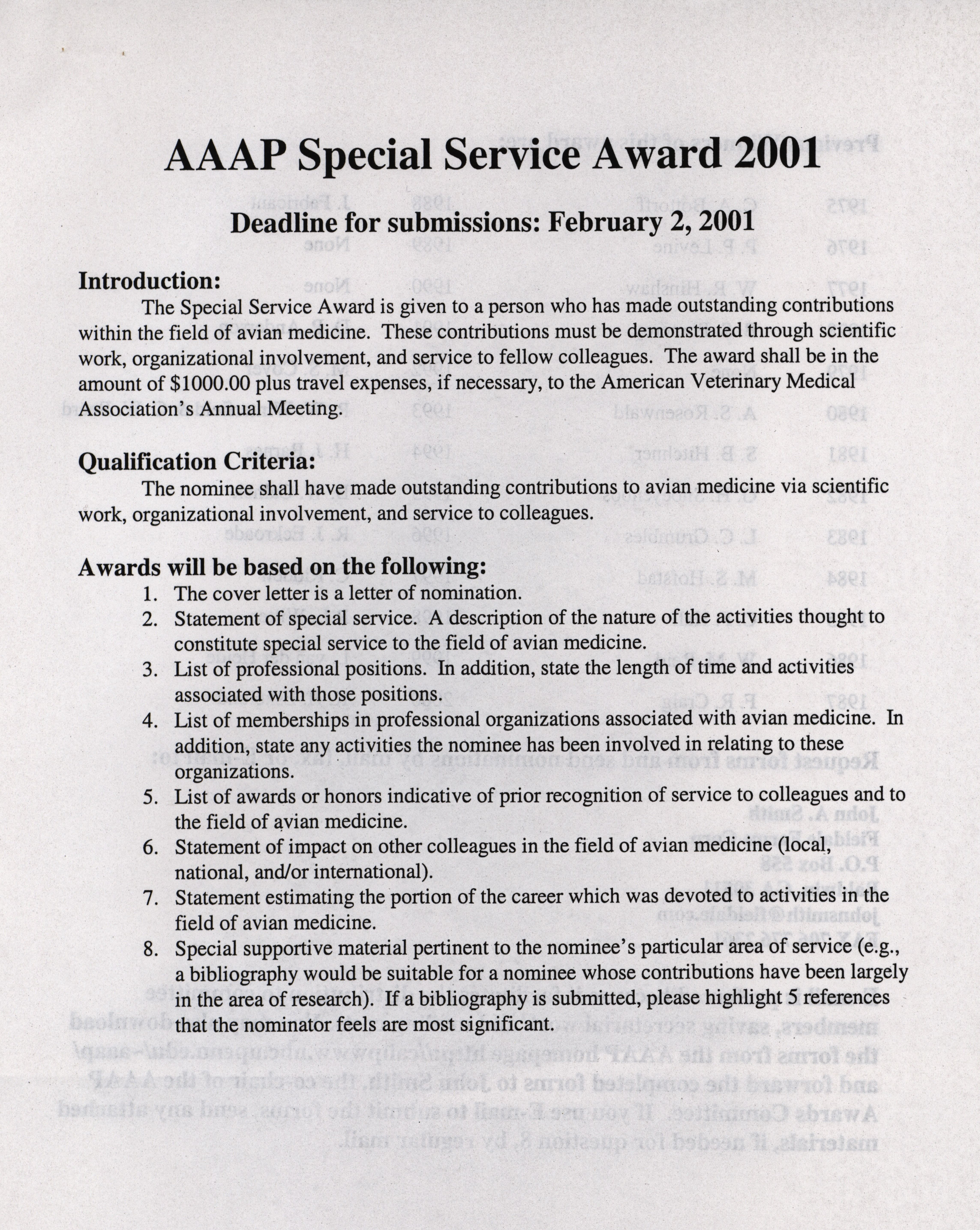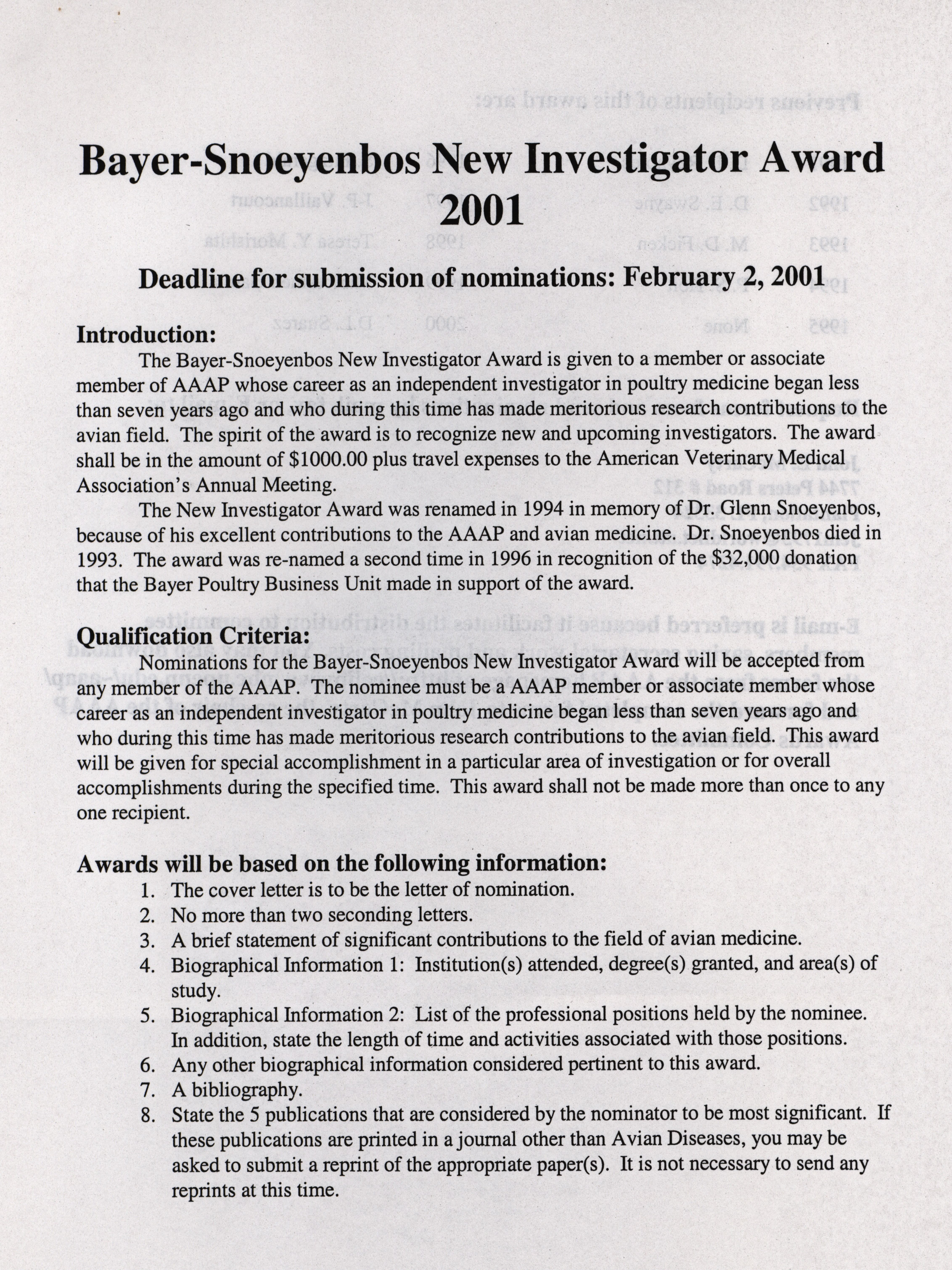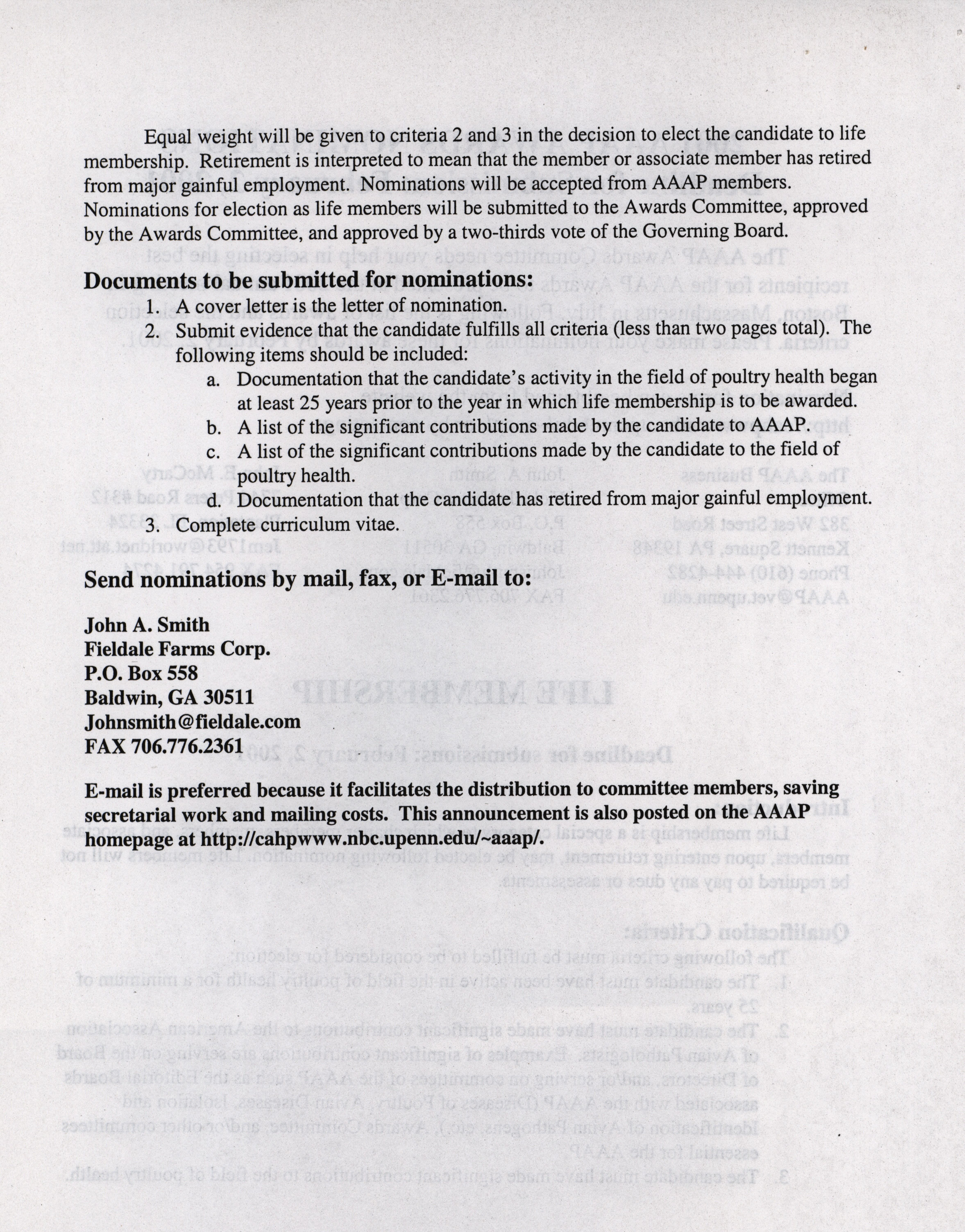 - The newsletter of the American Association of Avian Pathologists, November 2000. The quarterly newsletter features several different topics, including meeting schedules, a call for papers for the 2001 AVMA (American Veterinary Medical Association)/AAAP annual meeting, and a request for nominations for various 2001 AAAP awards.