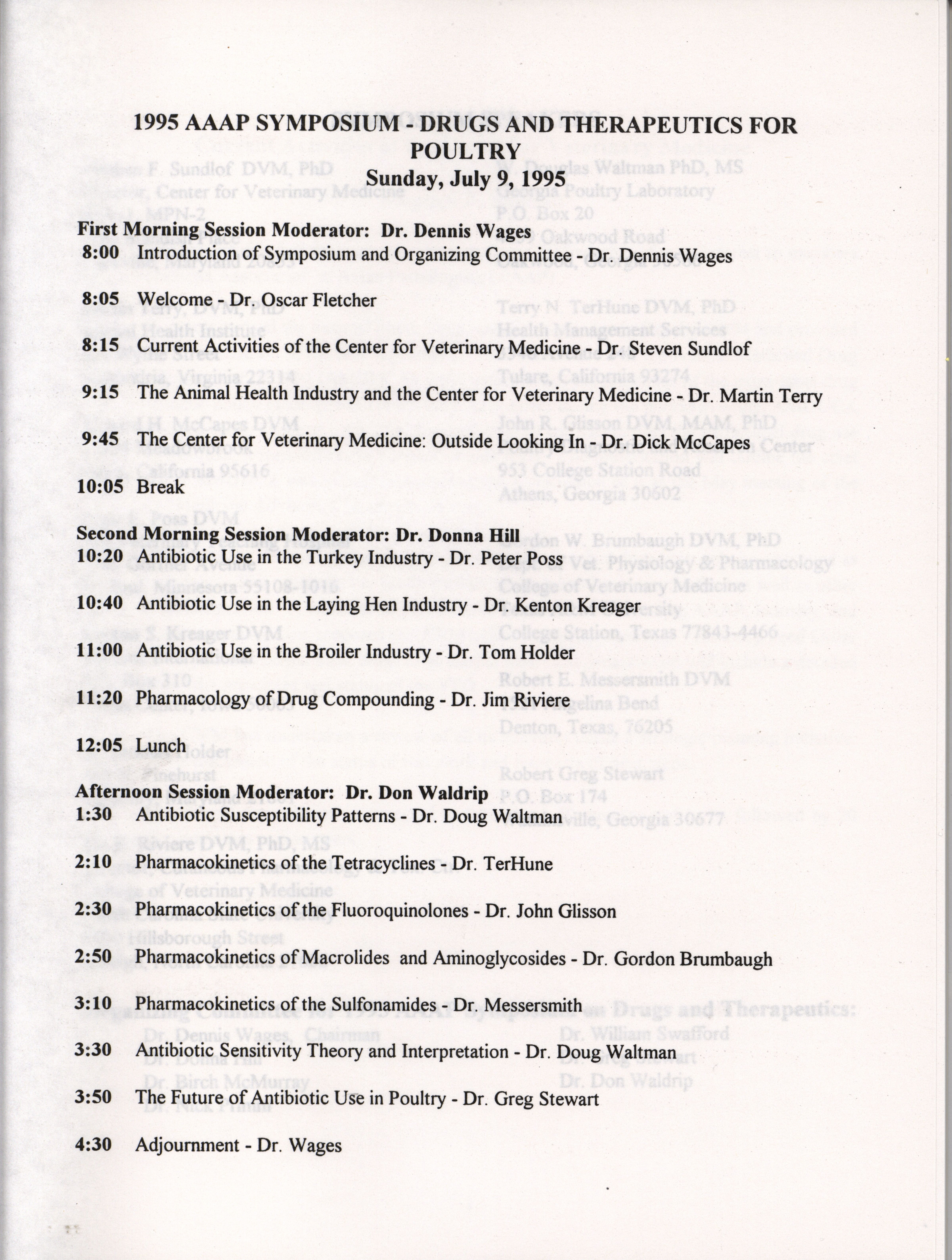 - Schedule, program and abstracts for the American Association of Avian Pathologists Symposium on Drugs and Therapeutics for Poultry on July 9, 1995.