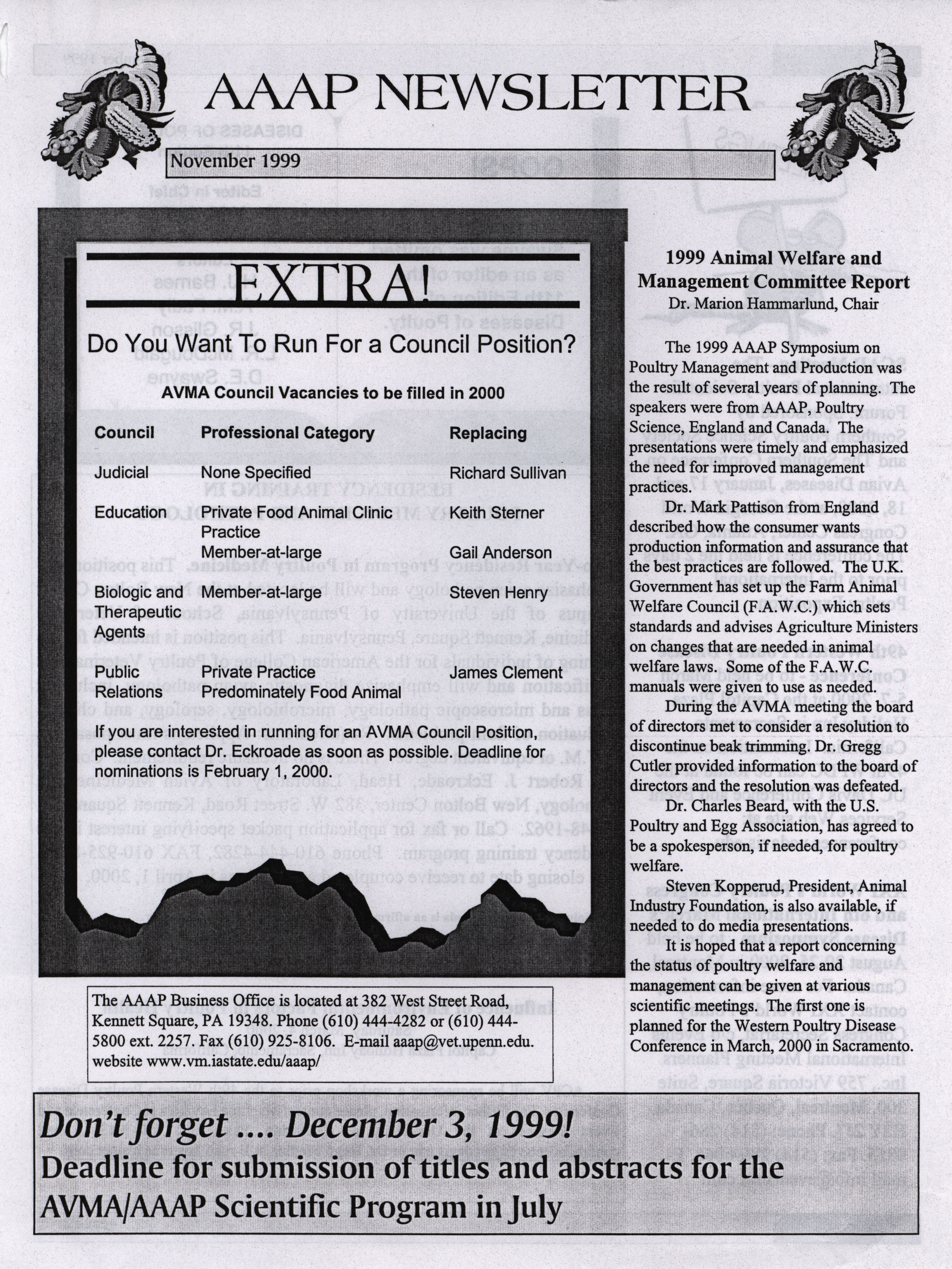 - American Association of Avian Pathologists newsletter, including meeting schedule, open positions and other announcements.
