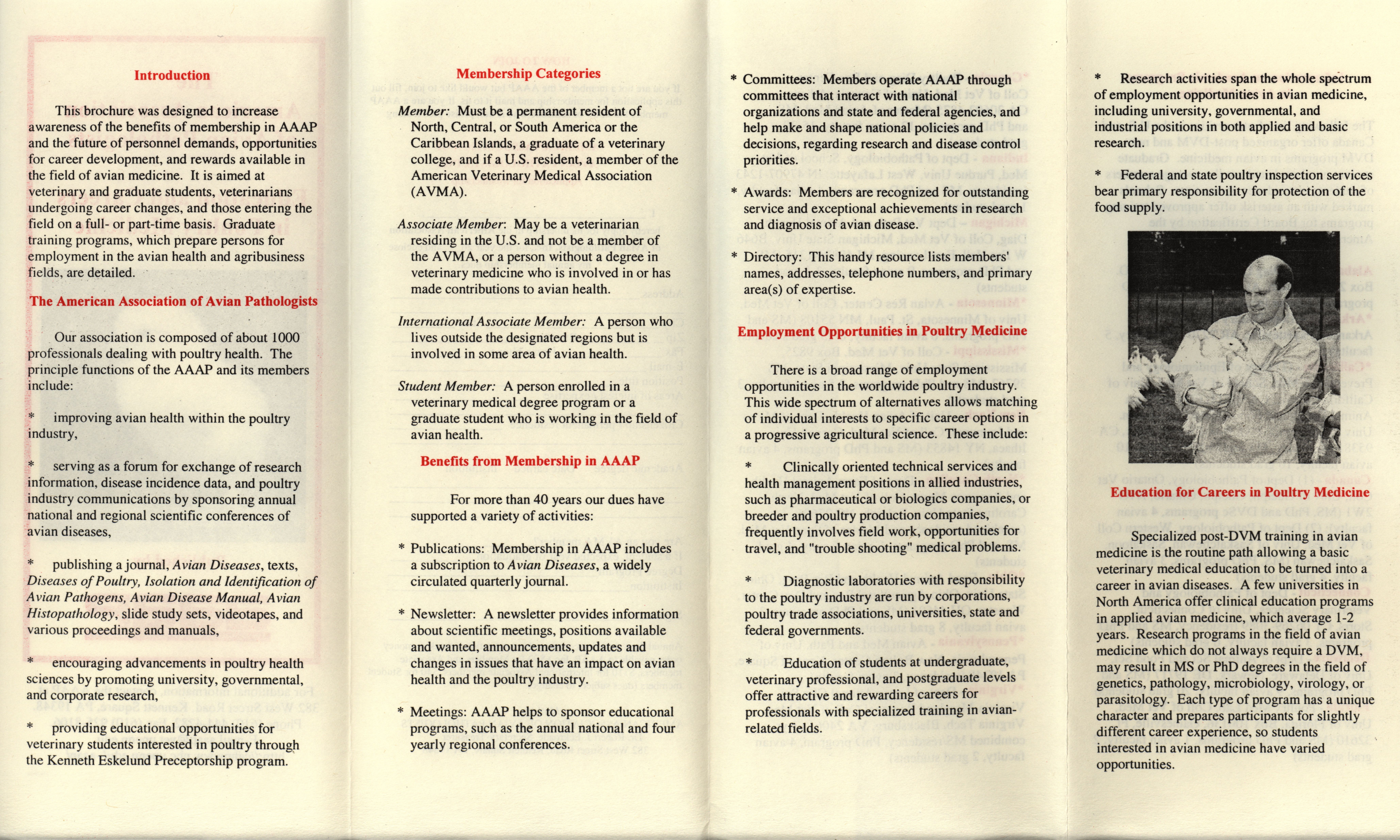 - Pamphlet by the American Association of Avian Pathologists describing the potential career paths for individuals interested in poultry medicine and the benefits offered by membership to the AAAP.