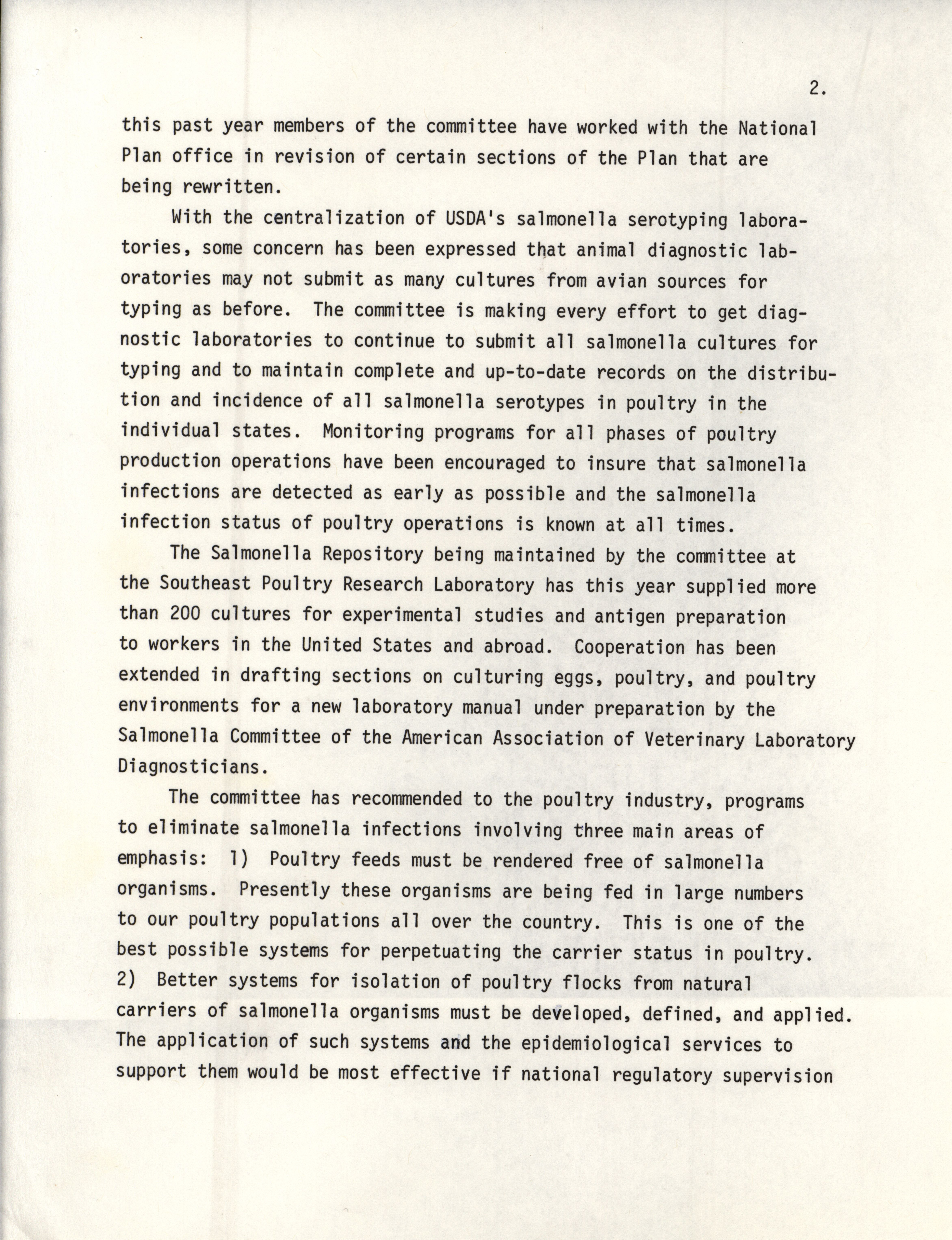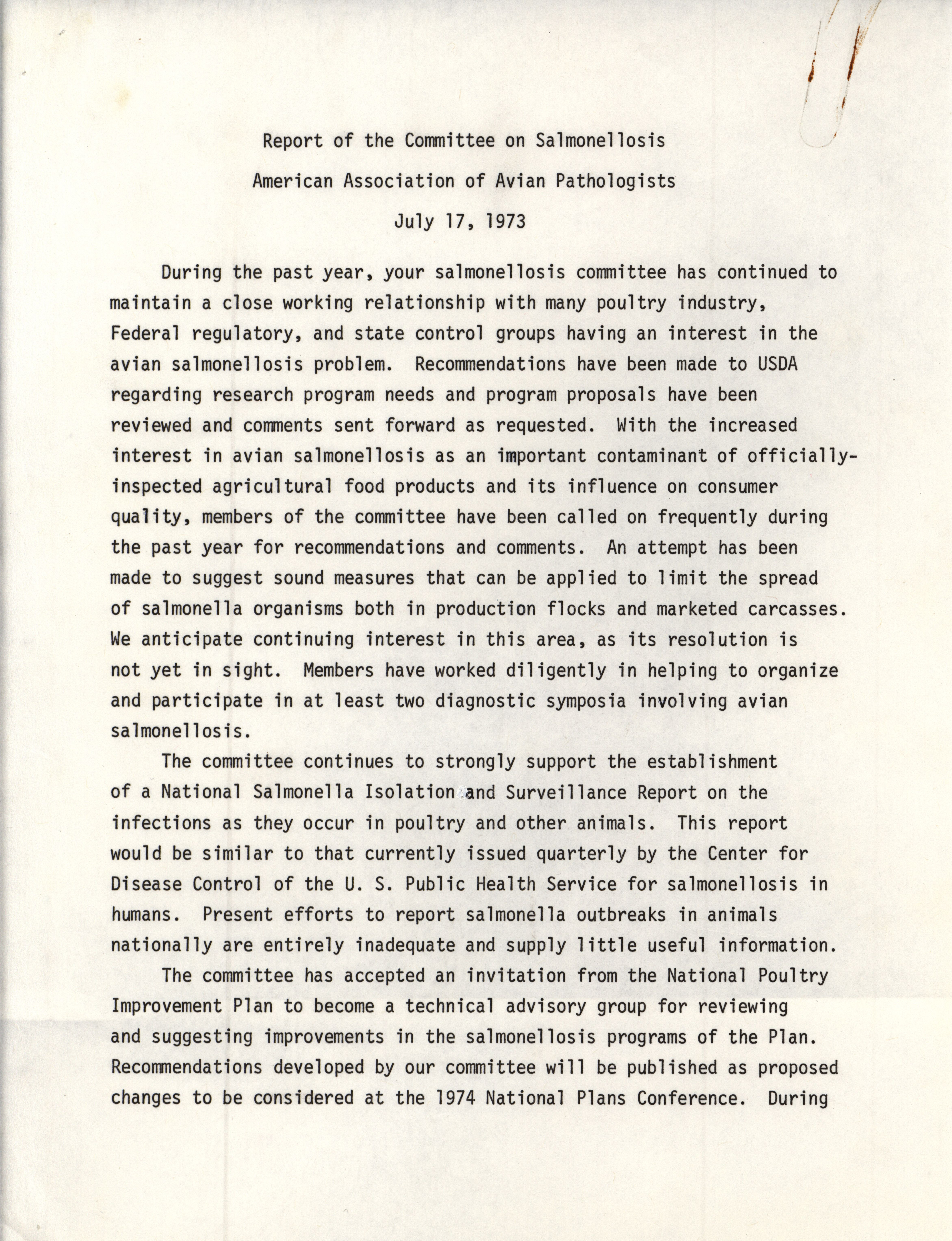 - A July 17, 1973 report from the American Association of Avian Pathologists Committee on Salmonellosis describing the actions of the committee over the past year.