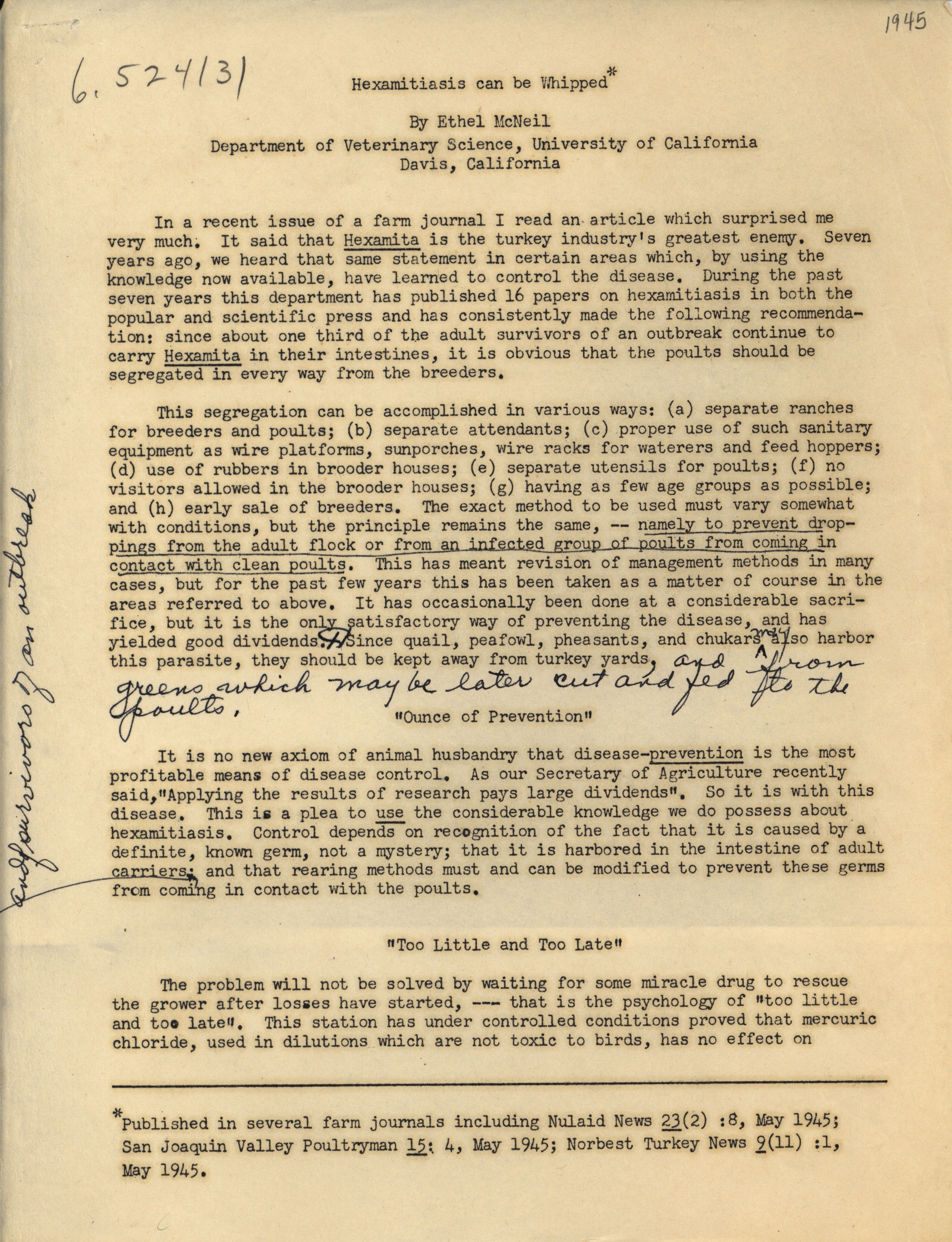 - Report on the treatment and prevention of hexamitiasis in turkeys from 1945.