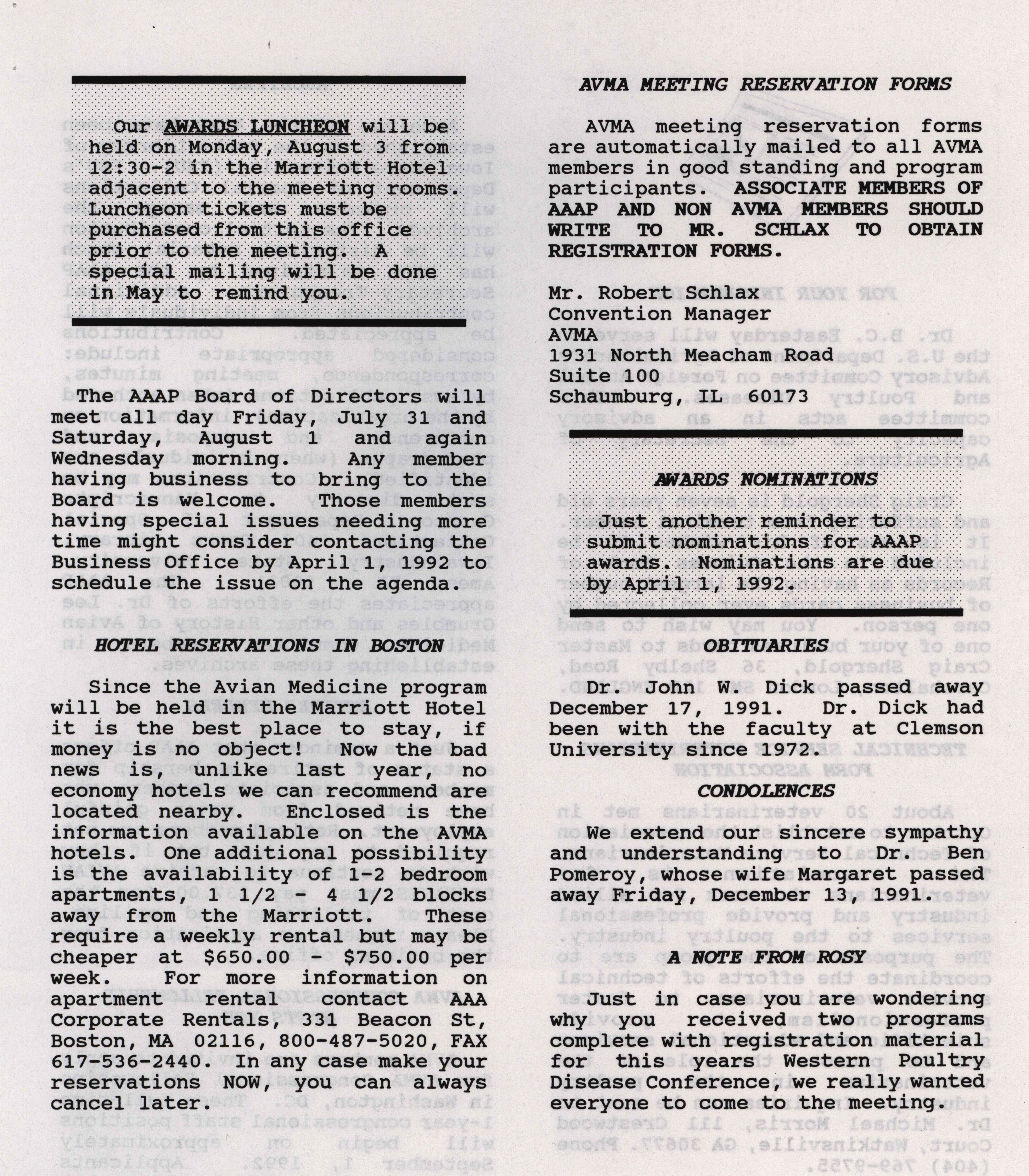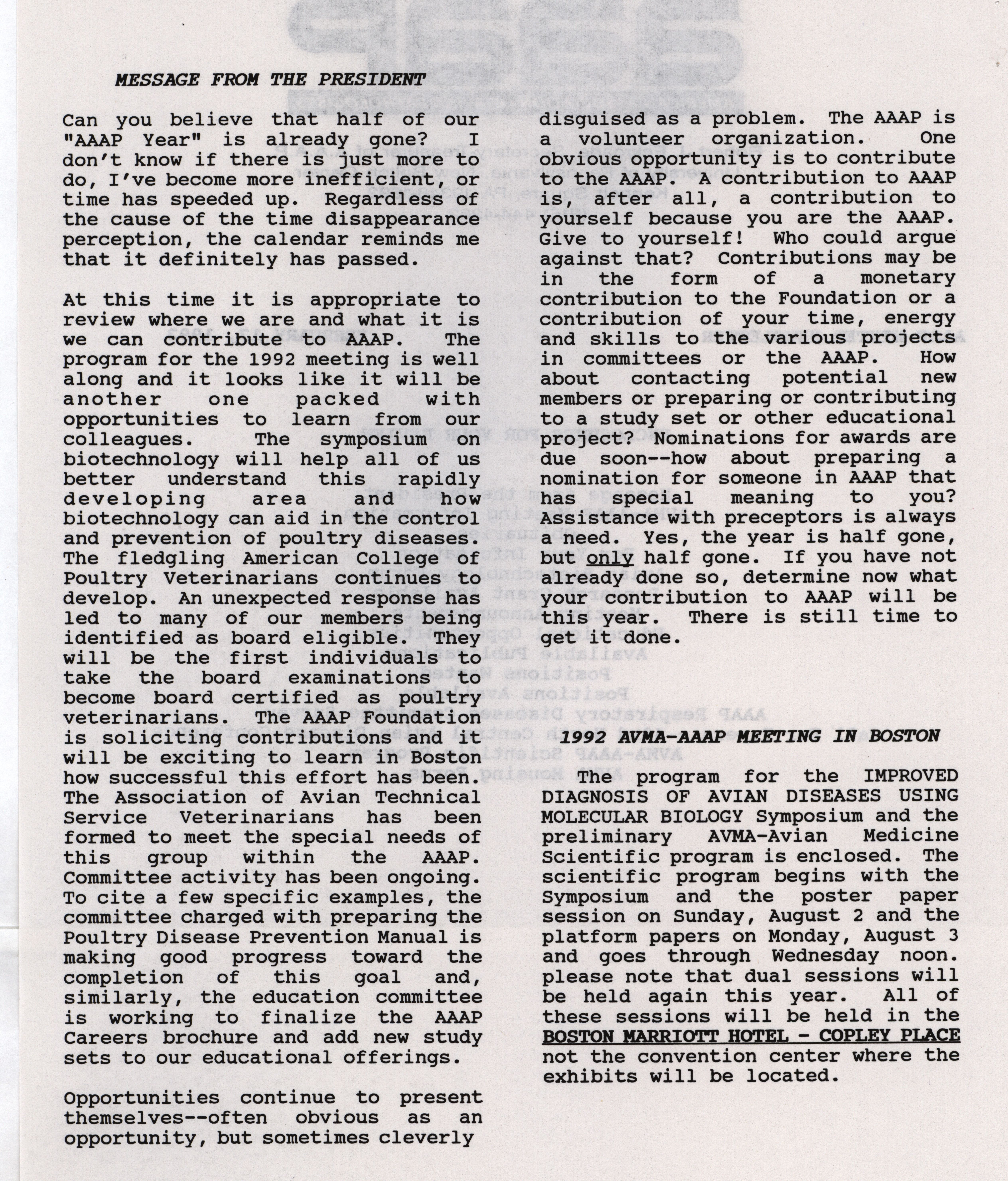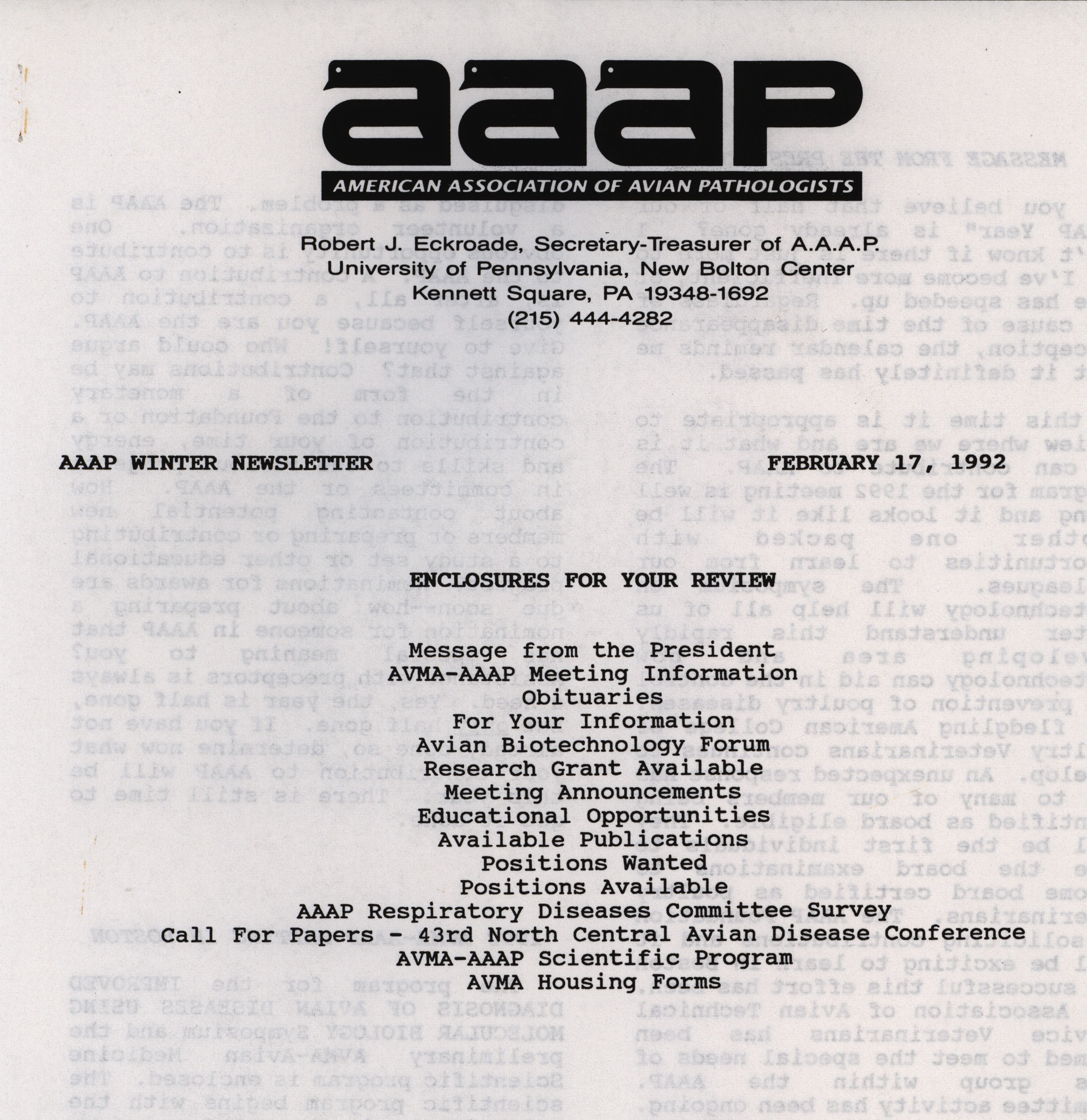 - The winter newsletter of the American Association of Avian Pathologists, February 17, 1992. The quarterly newsletter features several different topics, including meeting announcements, and AVMA (American Veterinary Medical Association)-AAAP meeting information and scientific programs.
