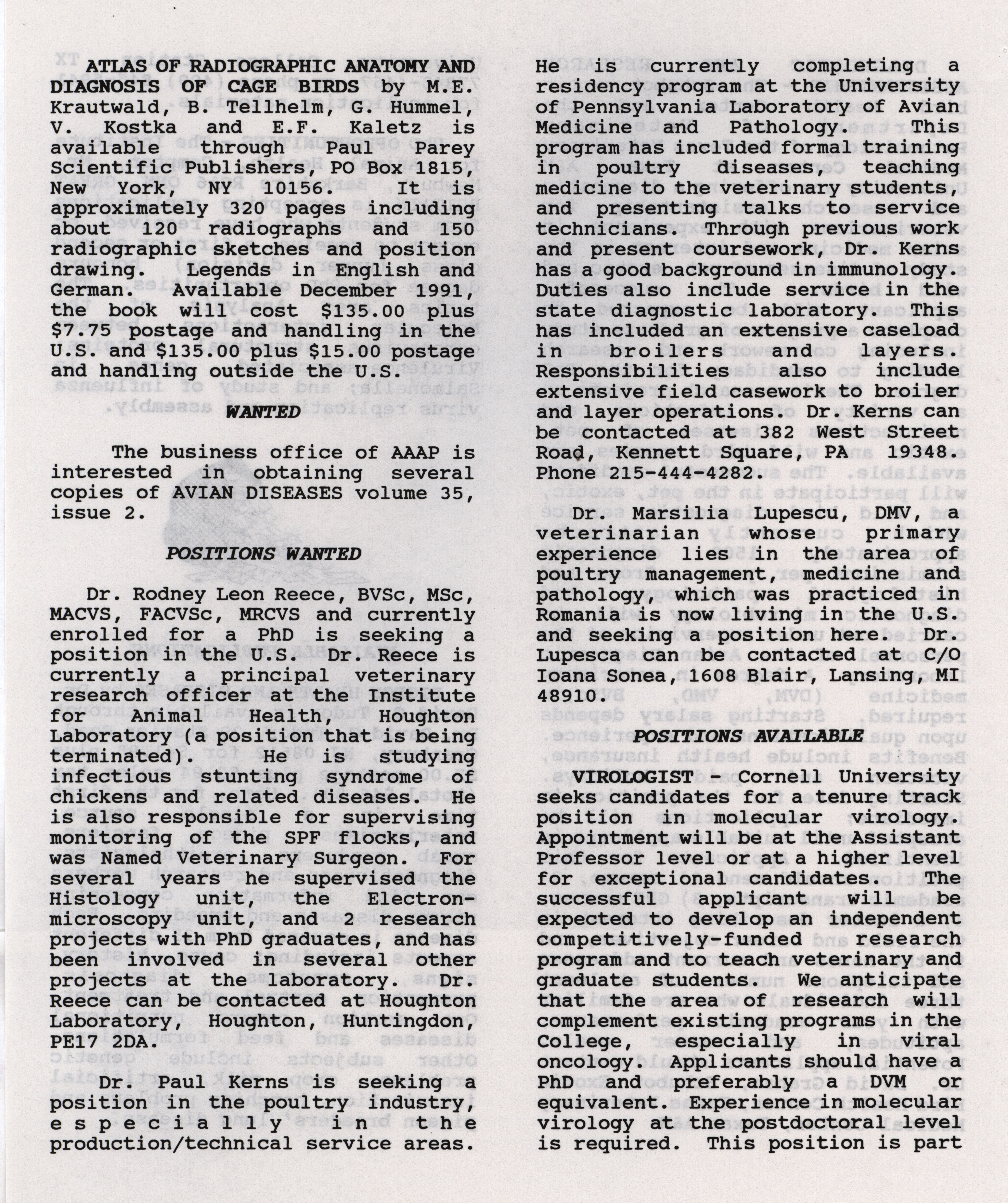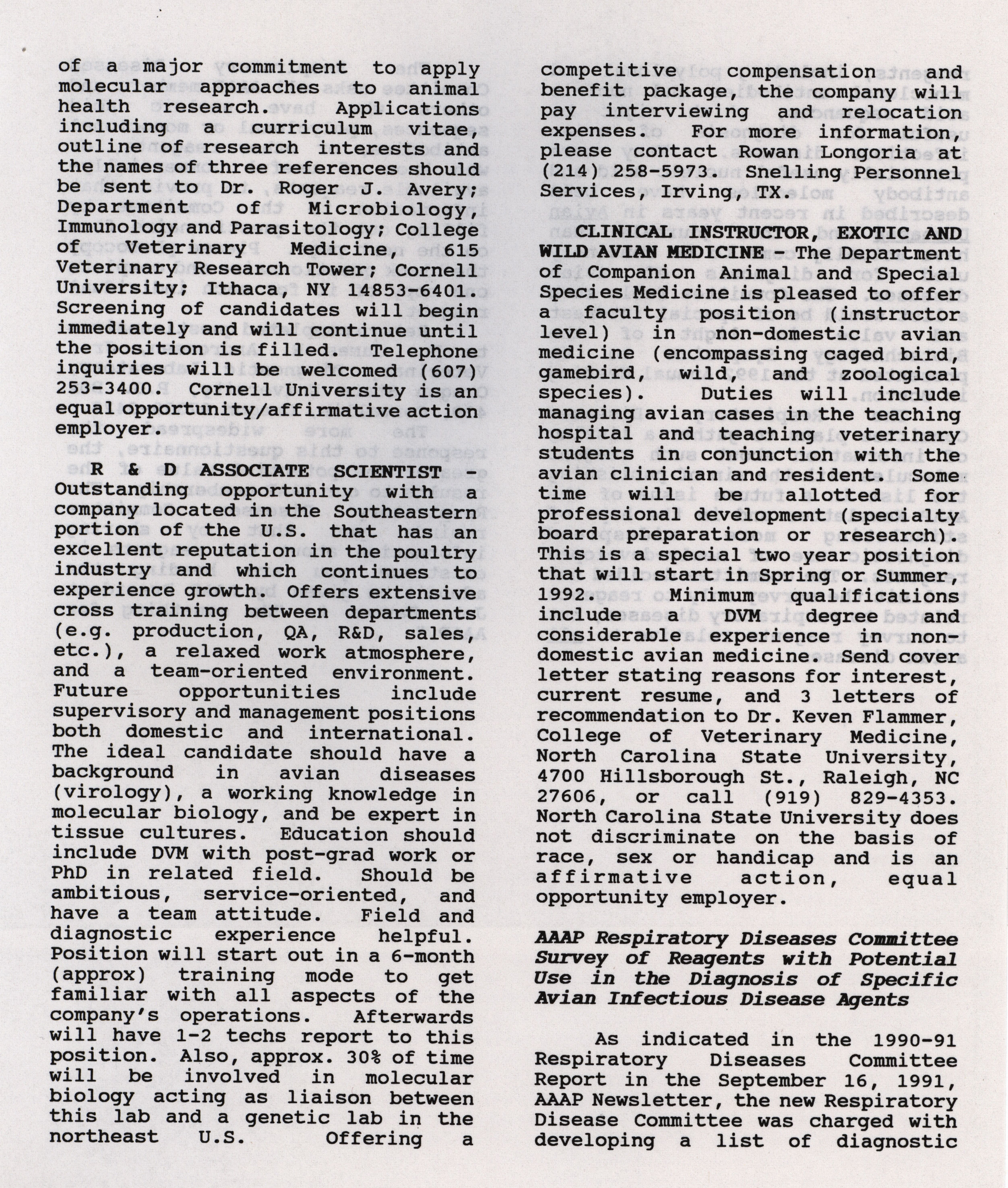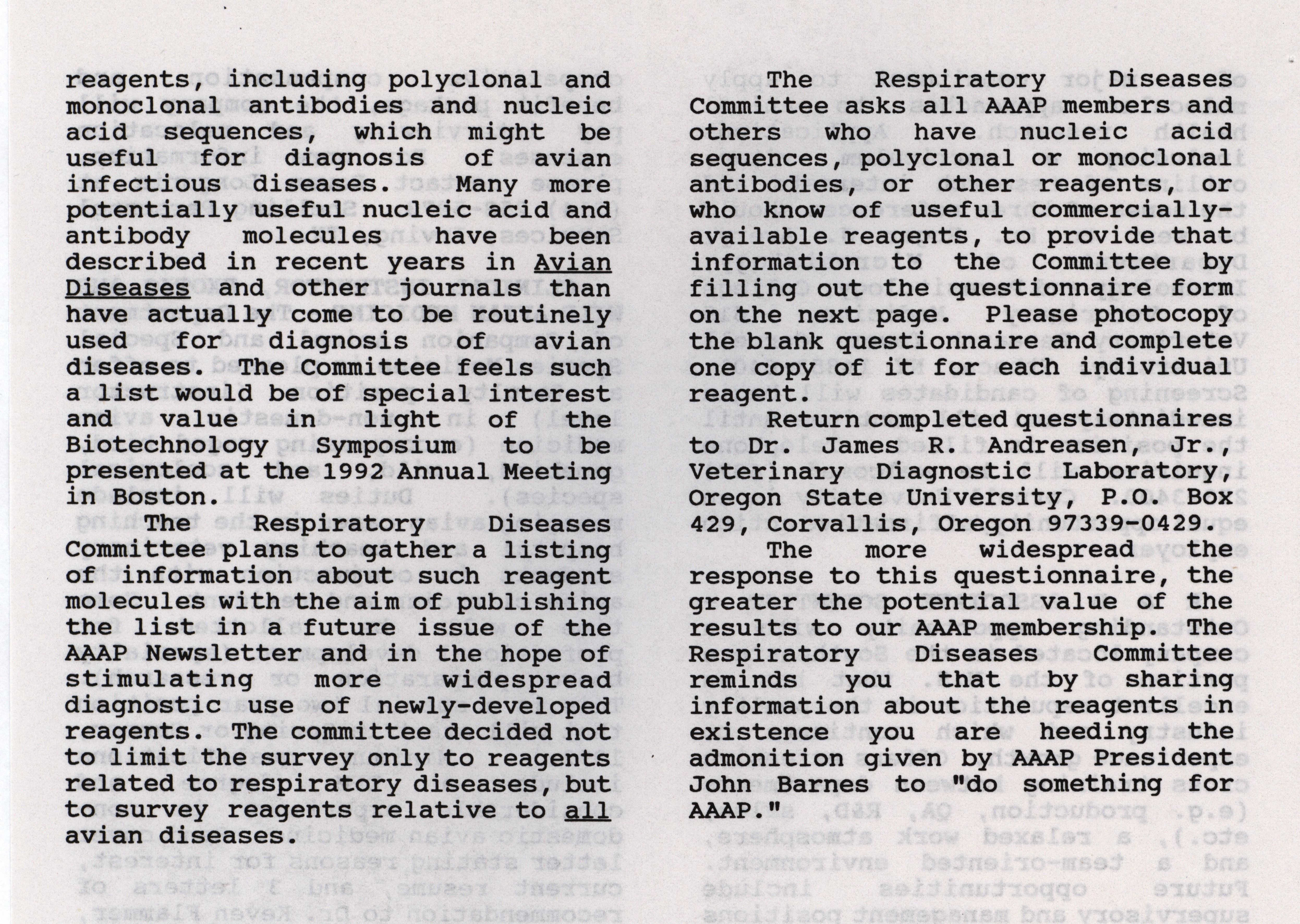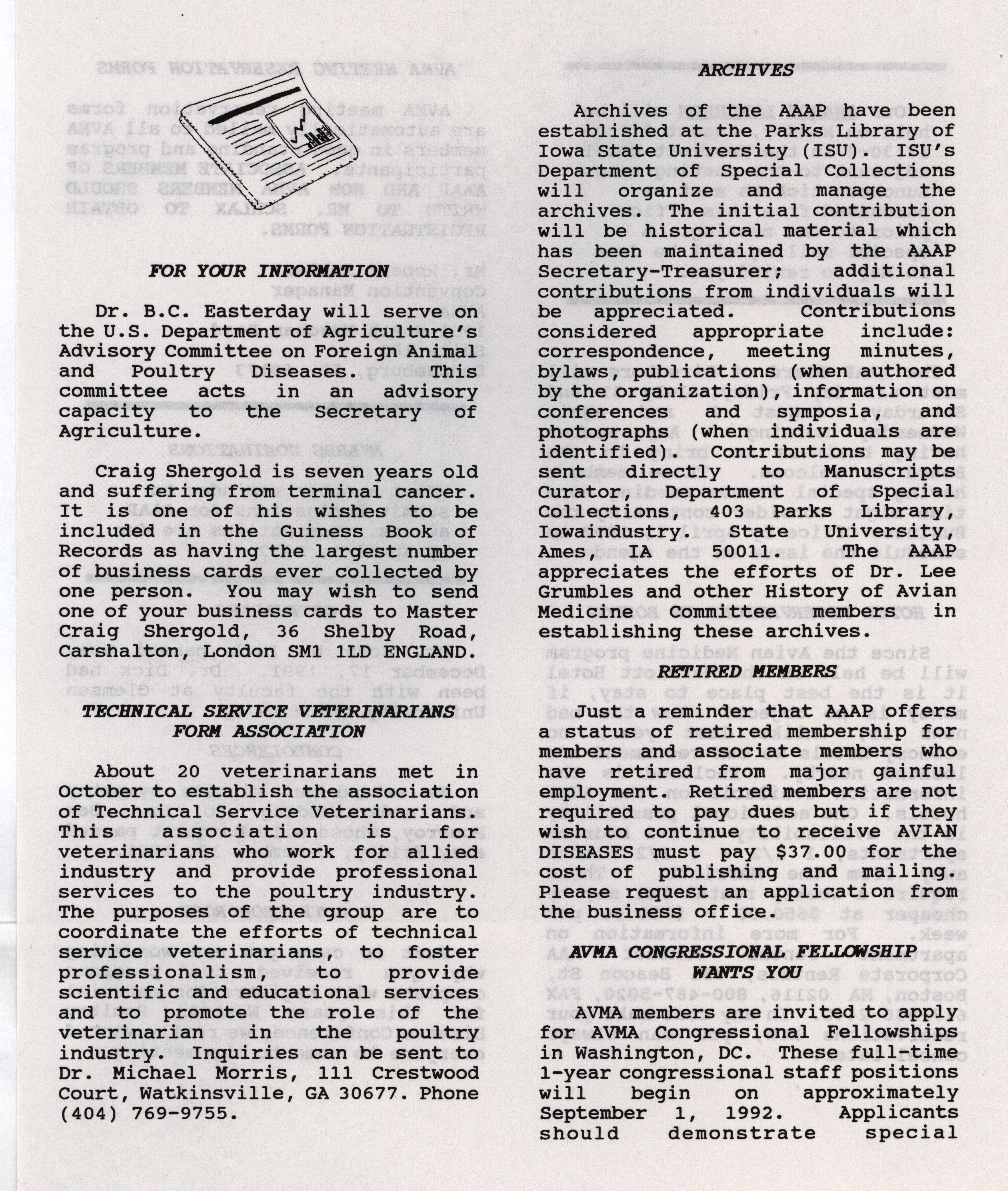 - "AAAP winter newsletter, February 17, 1992", American Association of Avian Pathologists Collection, Iowa State University Library Digital Collections