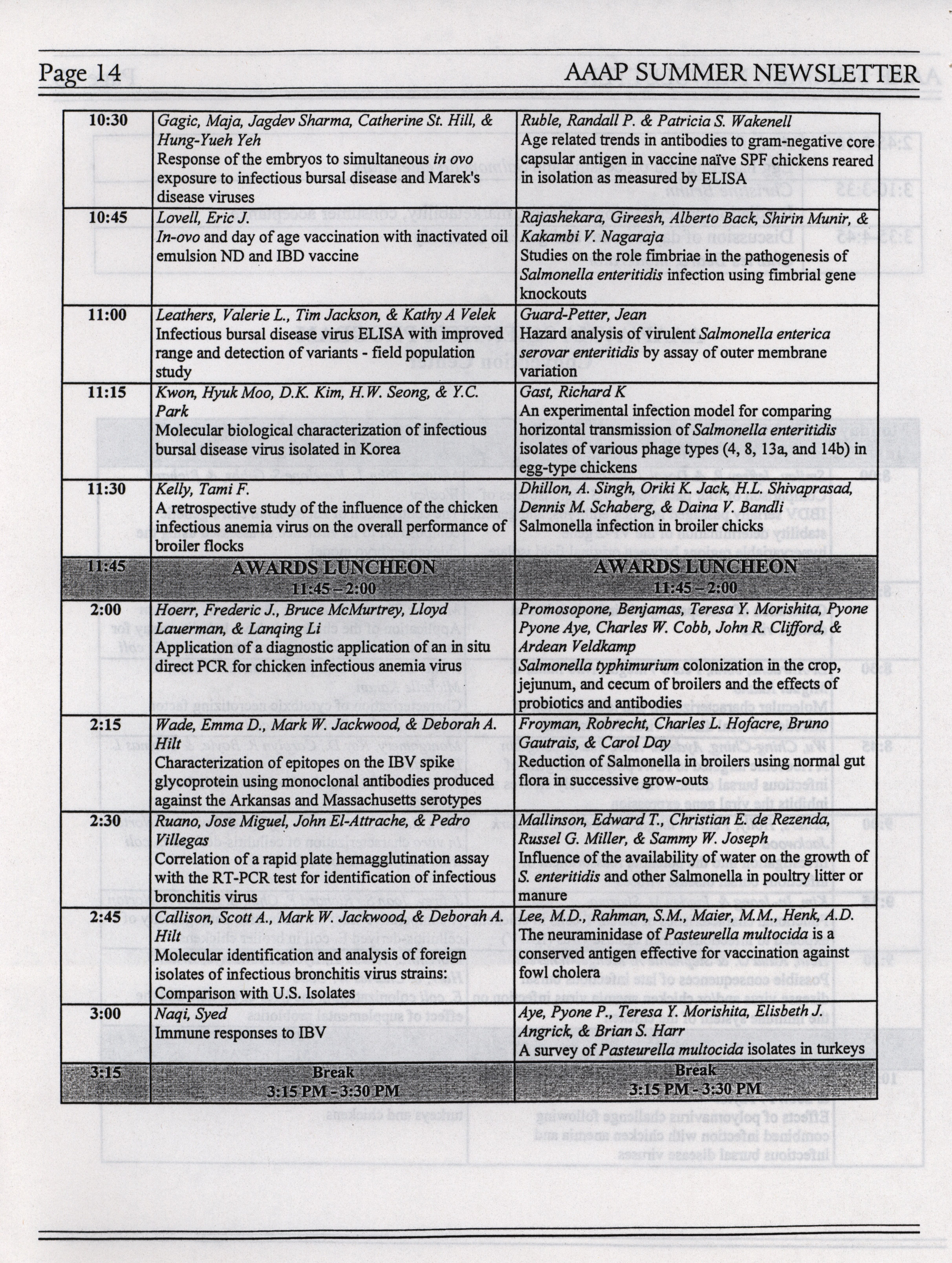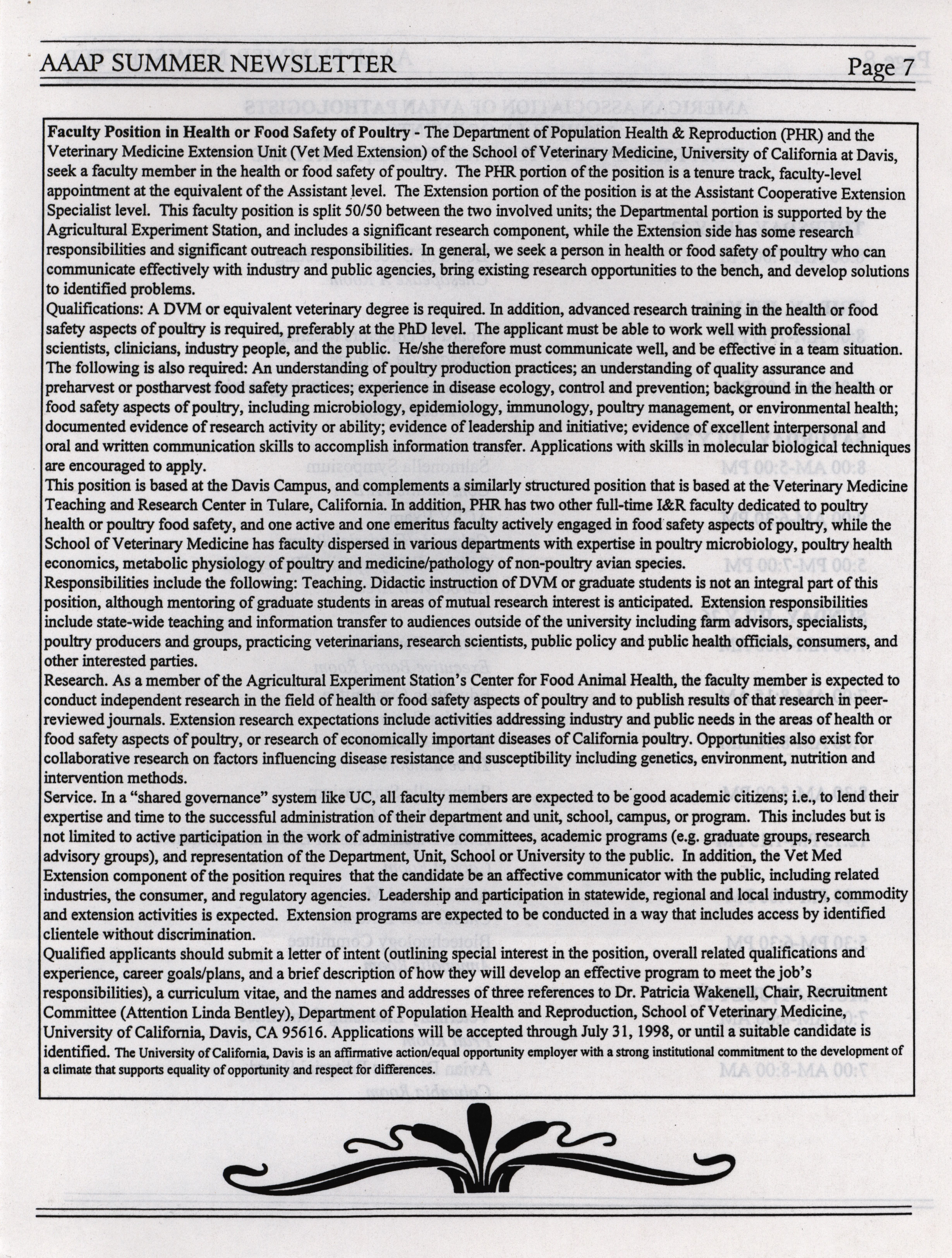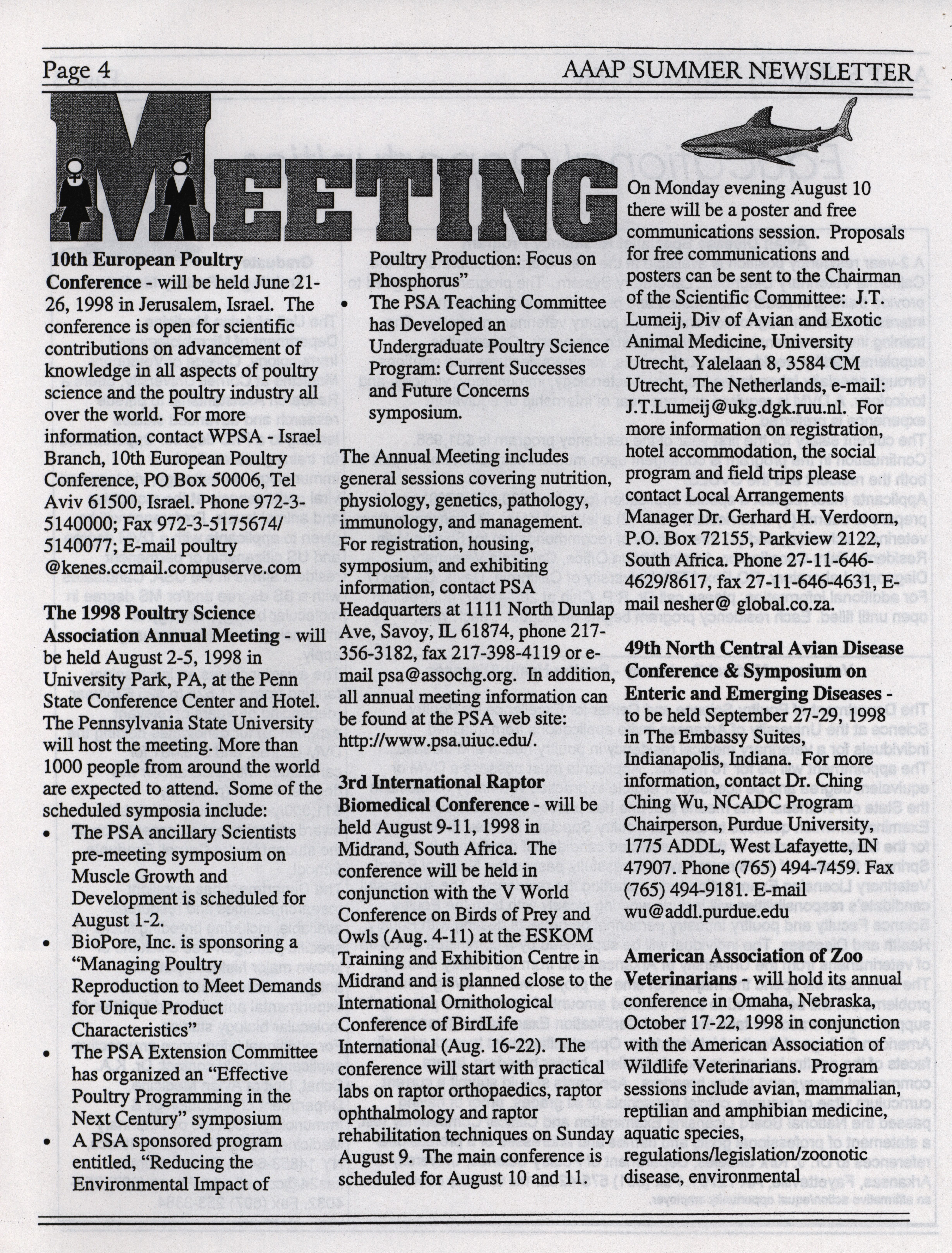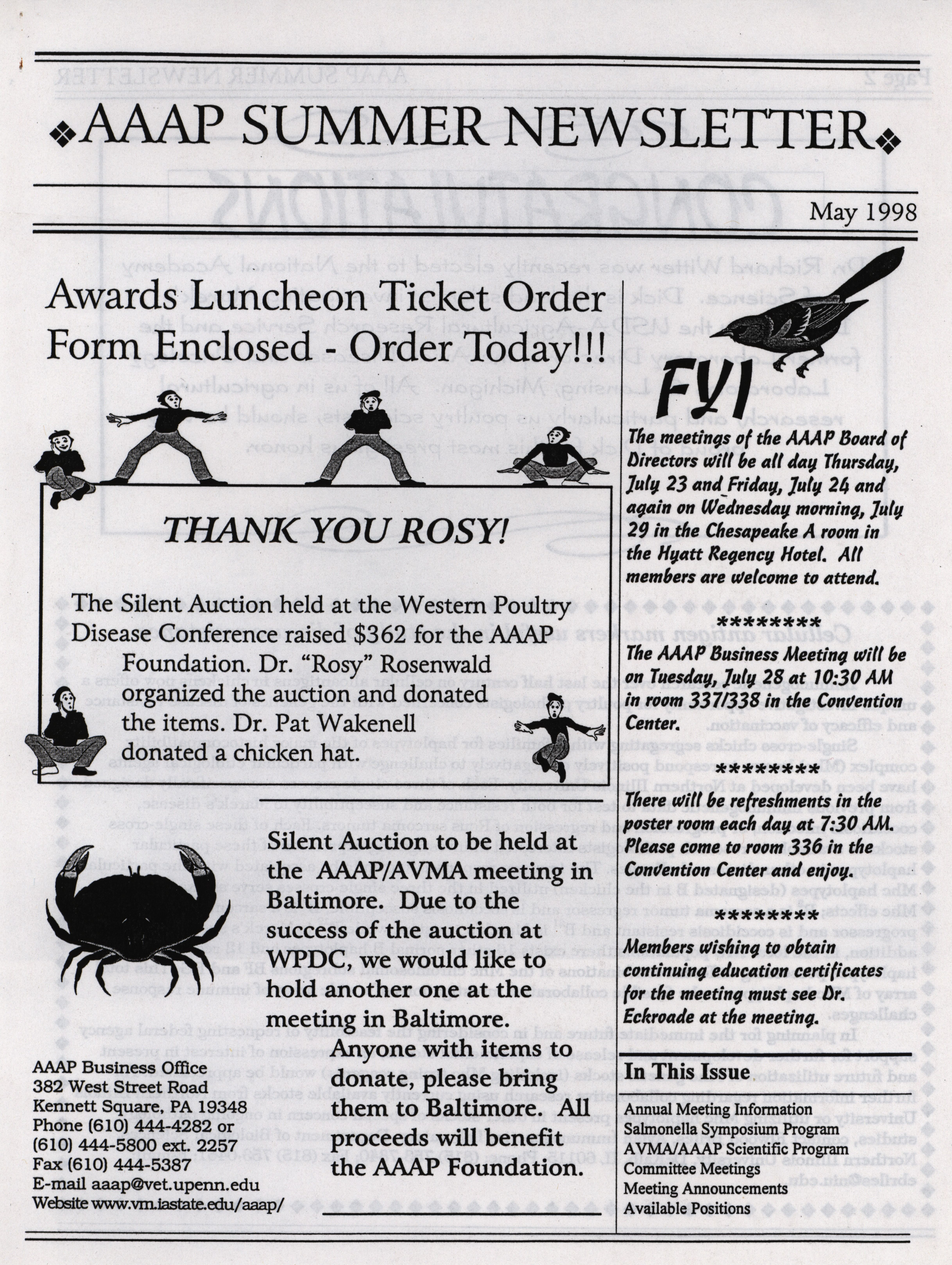 - Summer newsletter from the American Association of Avian Pathologists published in May 1998 including meeting information, programs and other news.