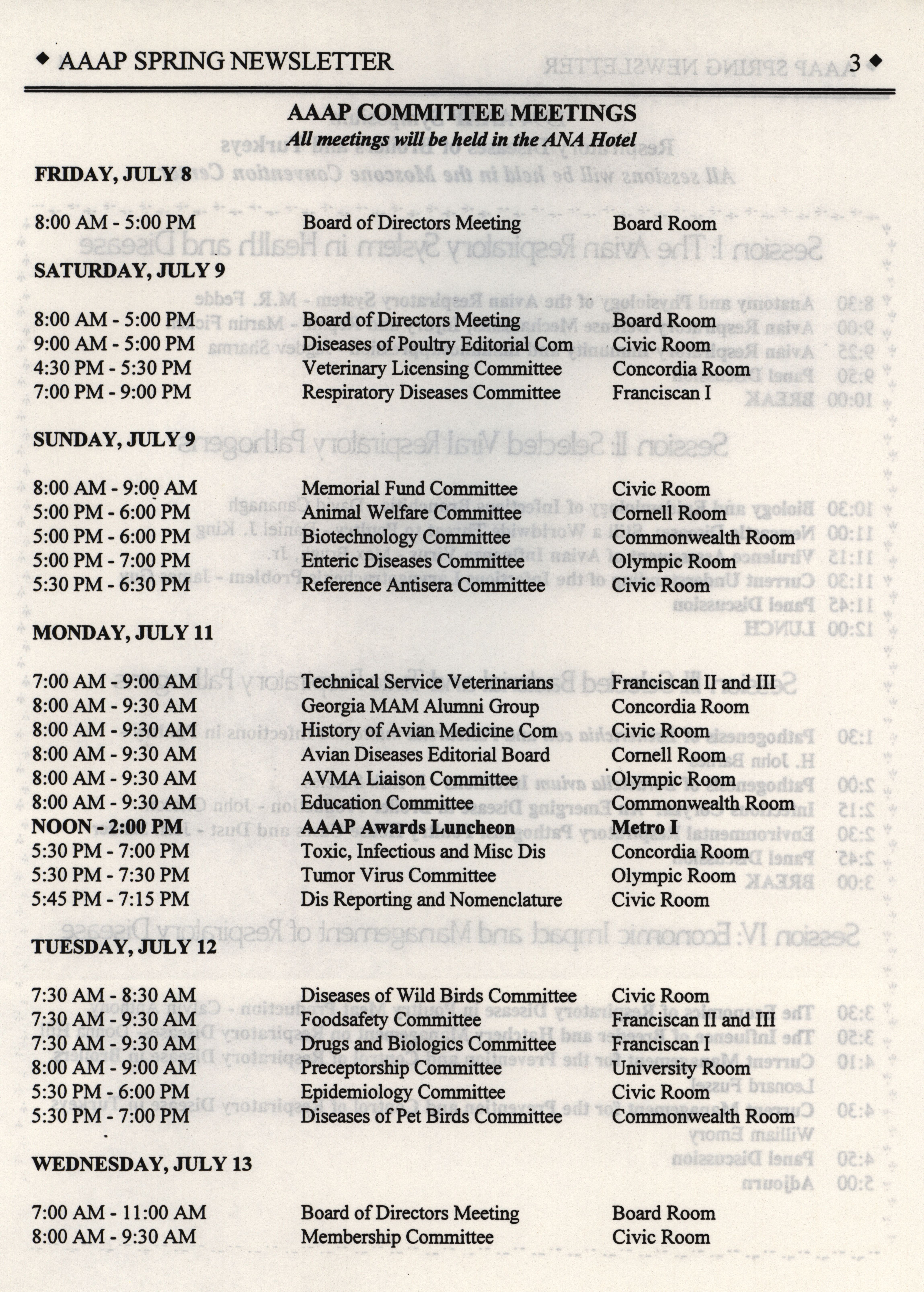 - The spring newsletter of the American Association of Avian Pathologists, April 1994. The quarterly newsletter features several different topics, including AVMA (American Veterinary Medical Association)-AAAP meeting information and scientific program, and committee meeting information.