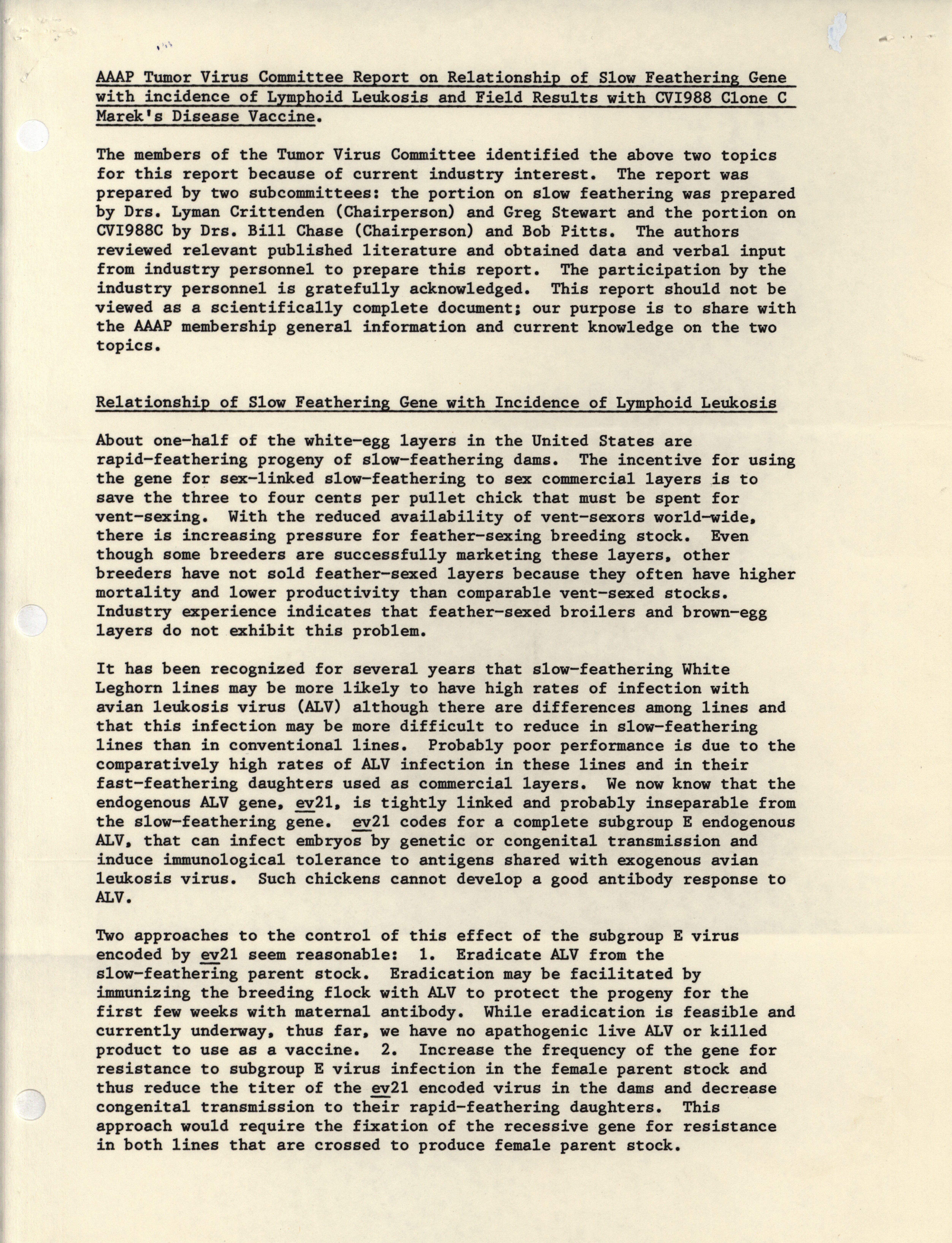 - "American Association of Avian Pathologists tumor virus committee report on relationship of slow feathering gene with incidence of lymphoid leukosis and field results with CVI988 Clonce C Marek's disease vaccine", American Association of Avian Pathologists Collection, Iowa State University Library Digital Collections