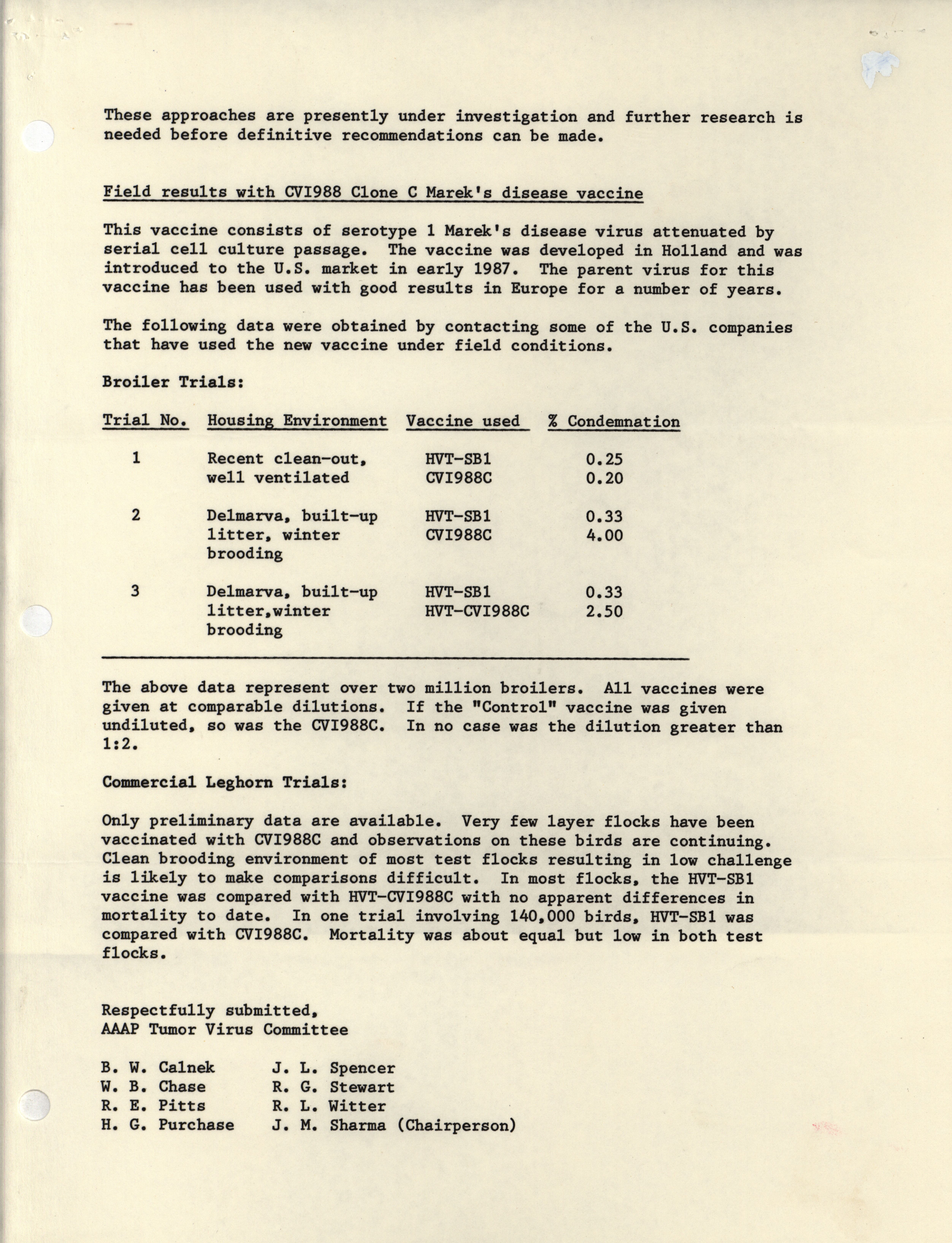 - Report by the Tumor Virus Committee of the American Association of Avian Pathologists describing the research conducted by the committee related to a Marek's Disease vaccine and lymphoid leukosis.