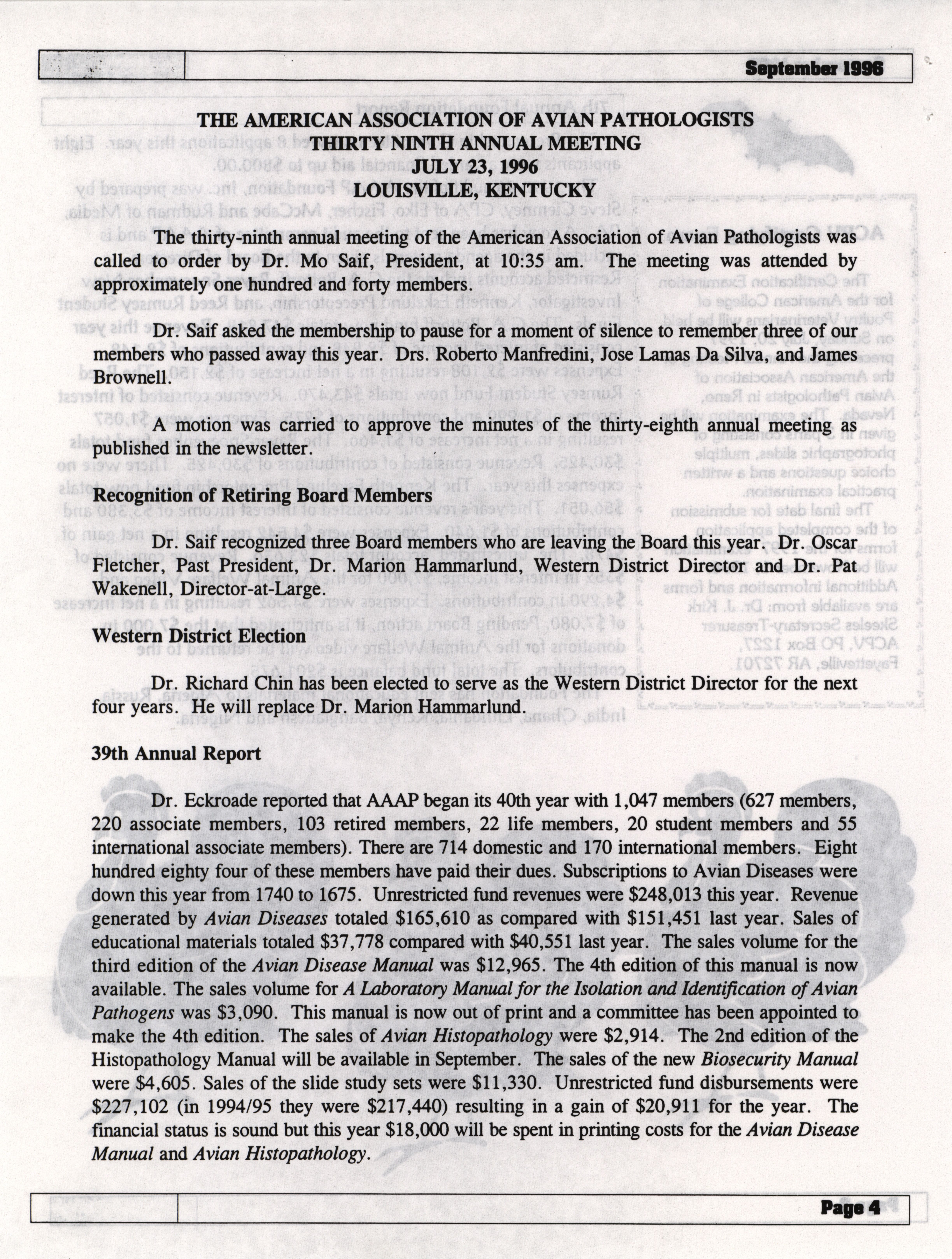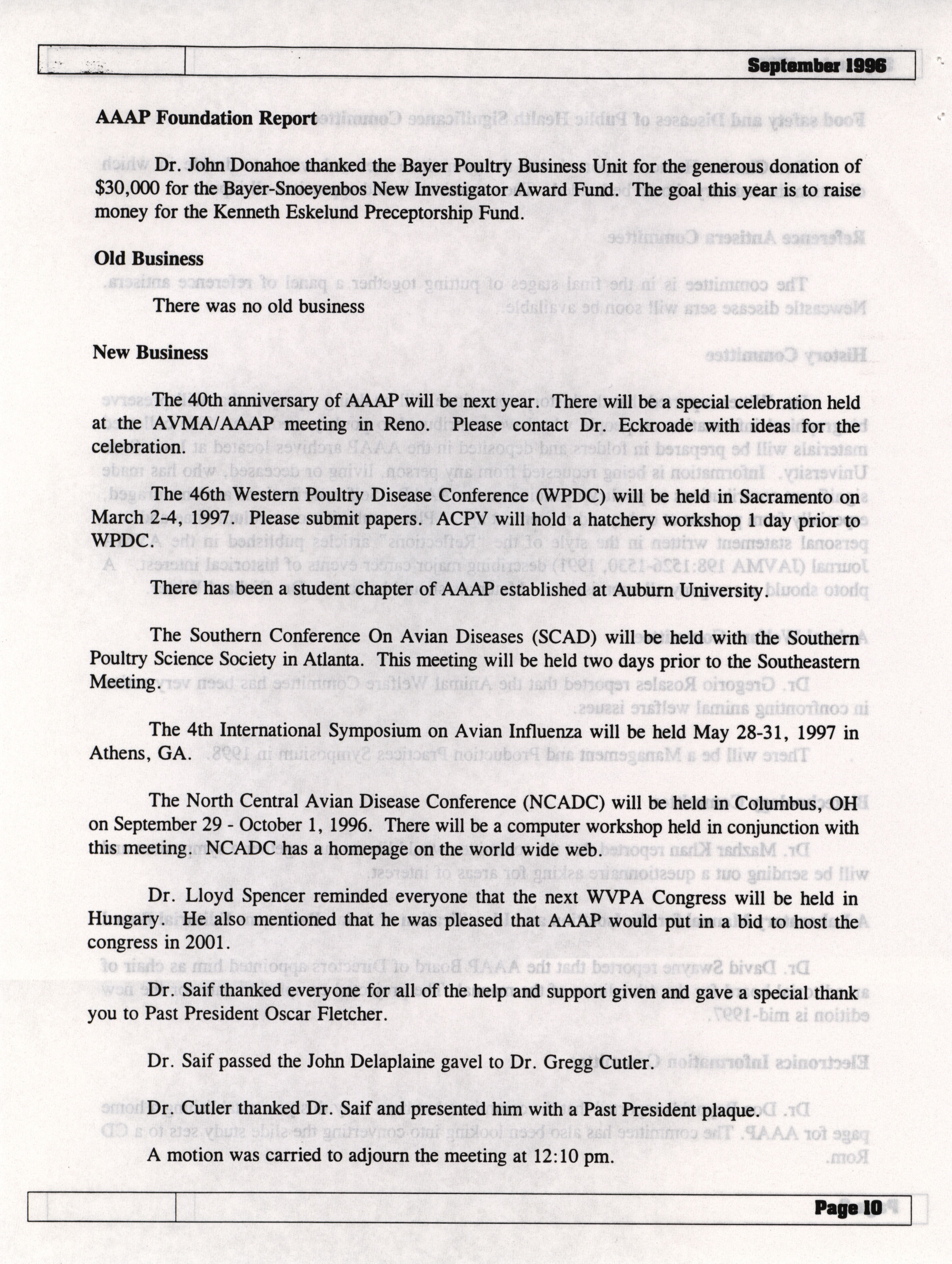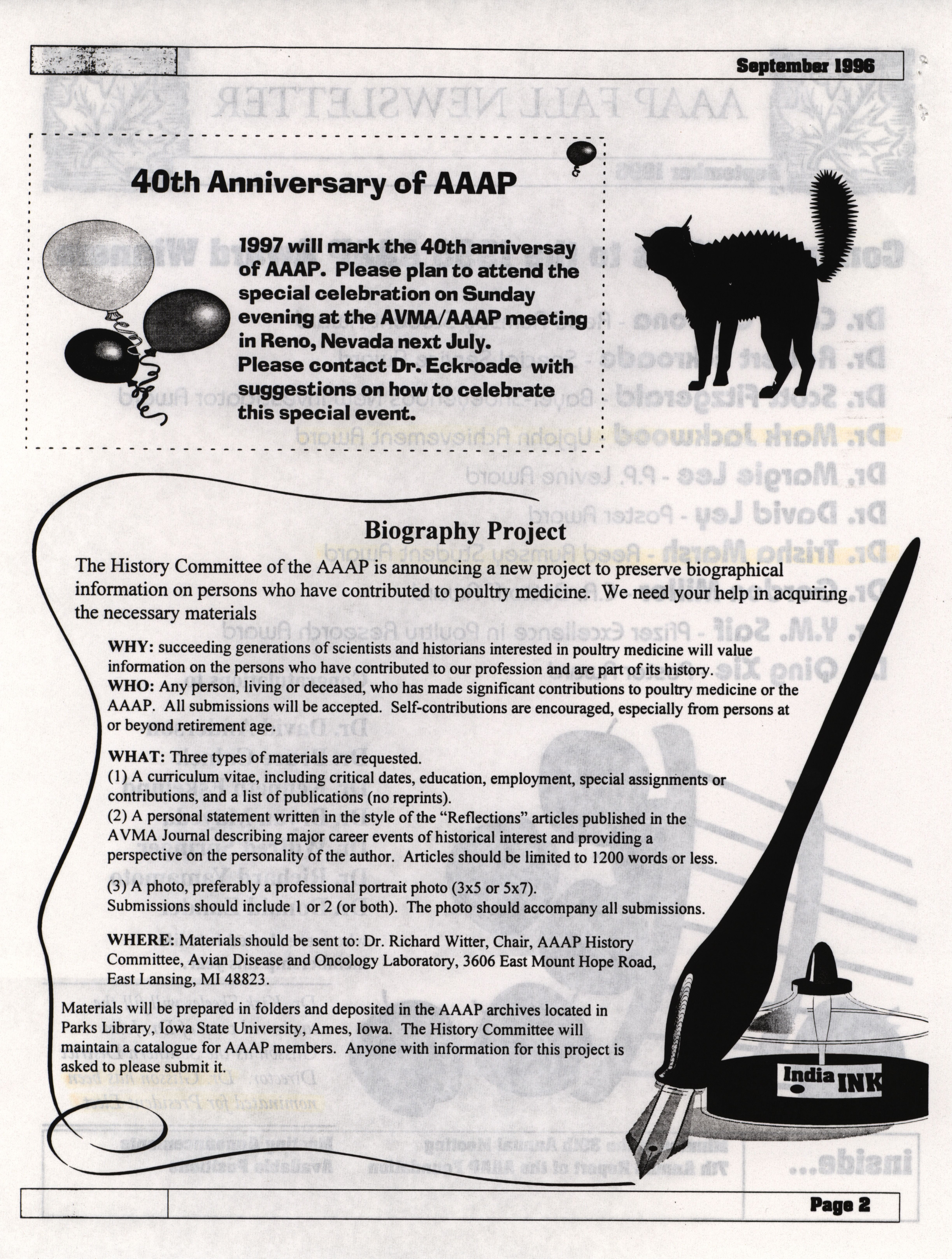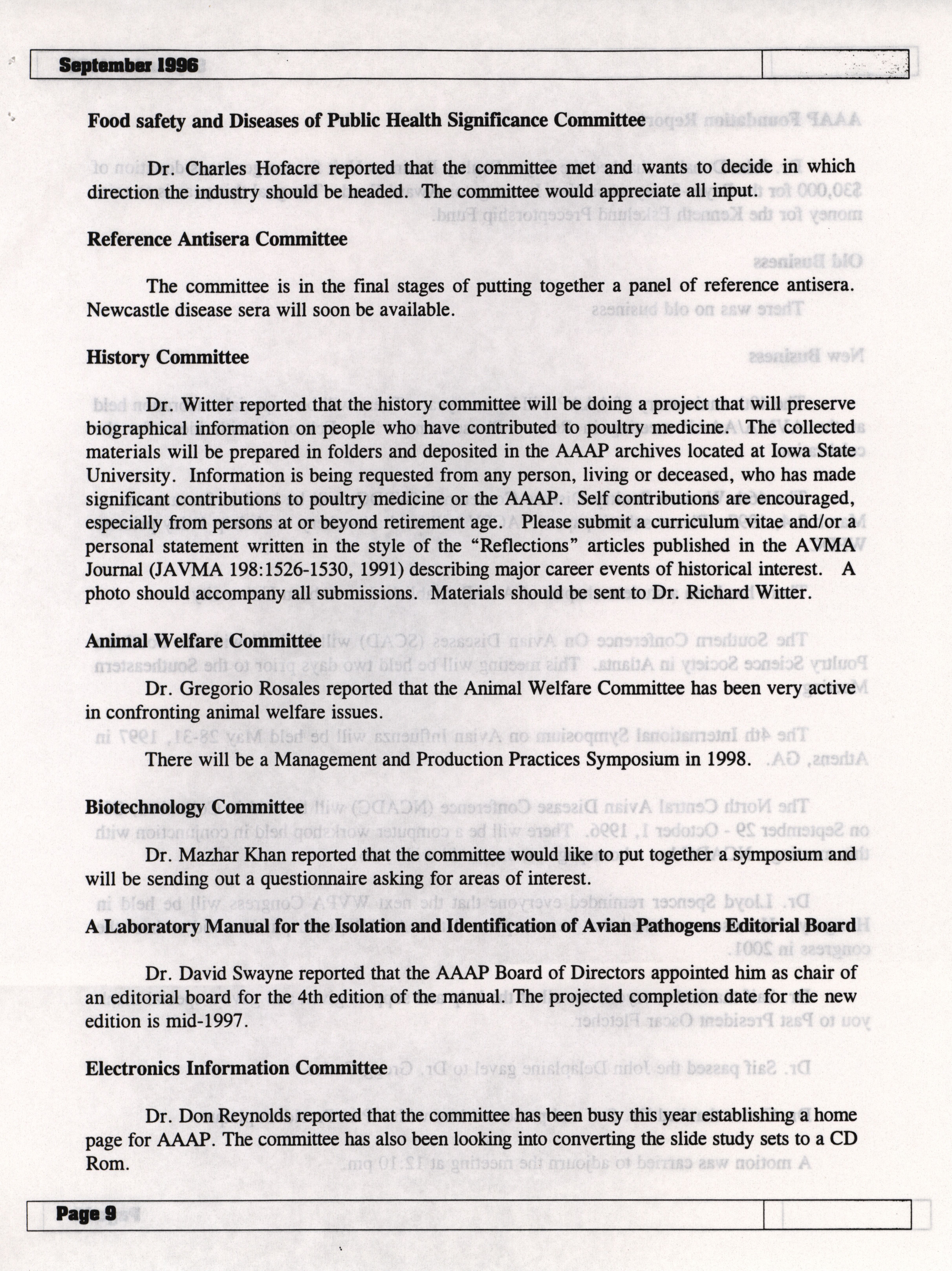 - The fall newsletter of the American Association of Avian Pathologists, September 1996. The quarterly newsletter features several different topics, including minutes of the 39th annual meeting of the AAAP and the 7th annual report of the AAAP foundation. Also included is an announcement from the History Committee of the AAAP about a new project to preserve biographical information on persons who have contributed to poultry medicine. The AAAP archives will be located in Parks Library, Iowa State University.