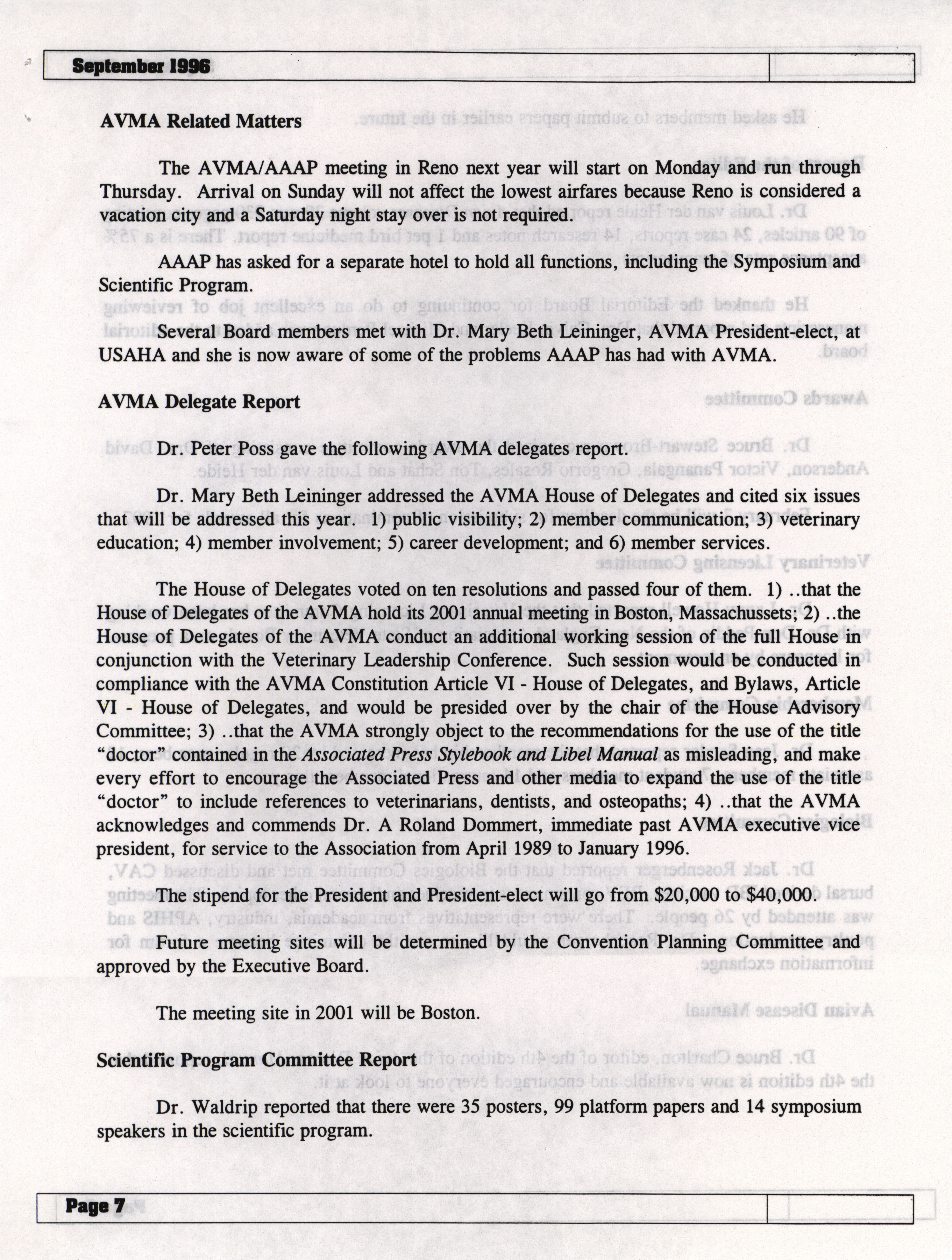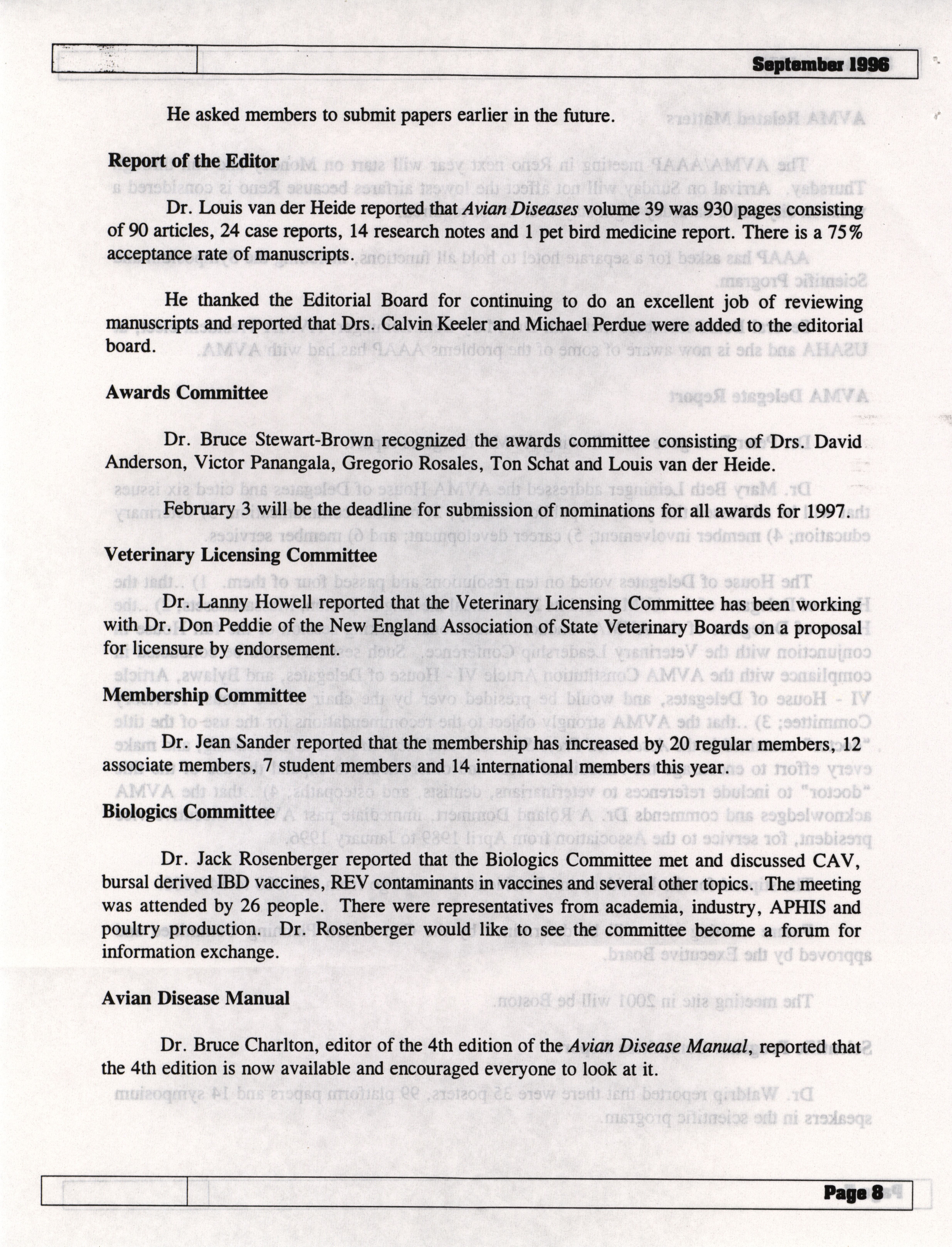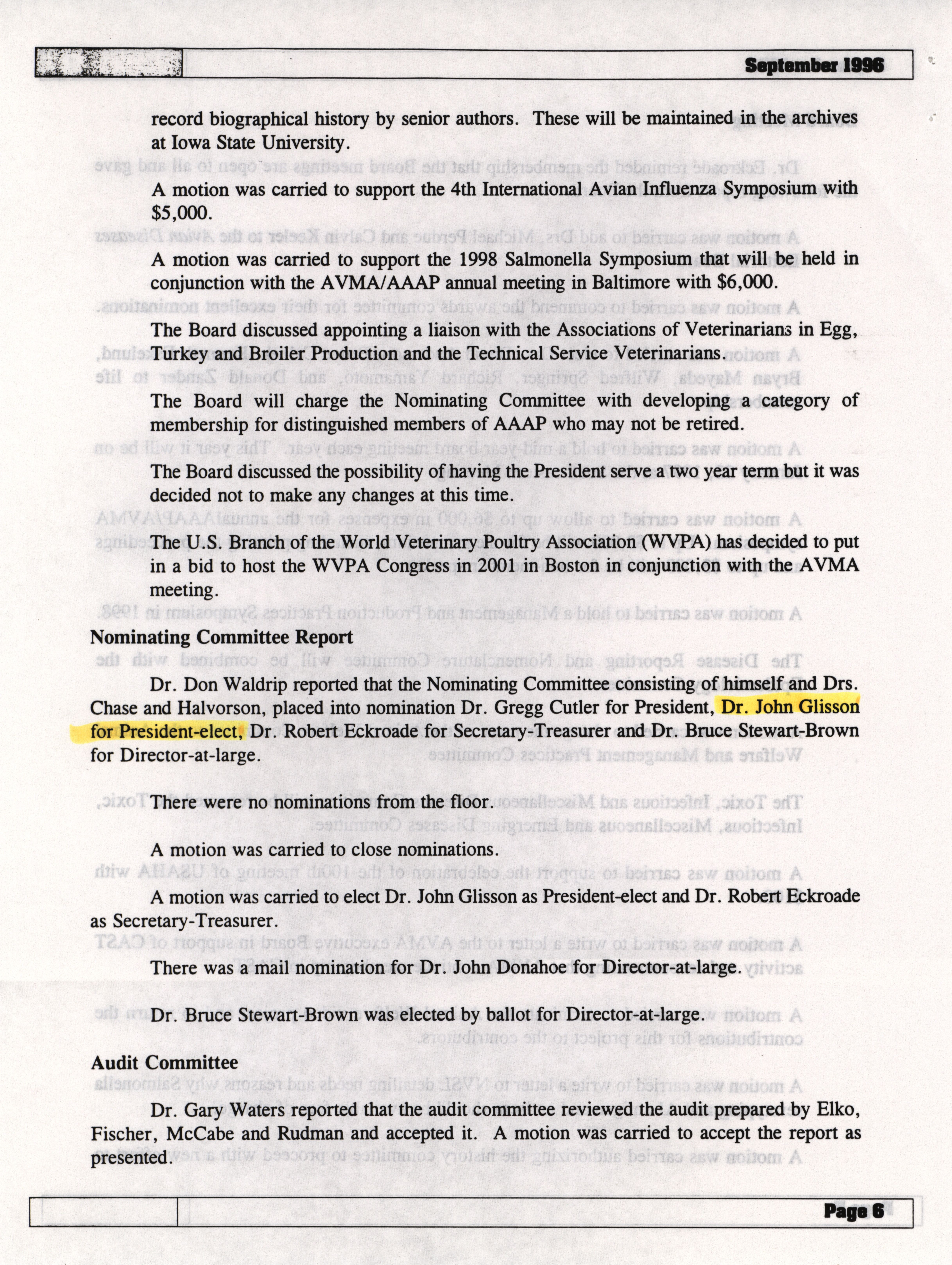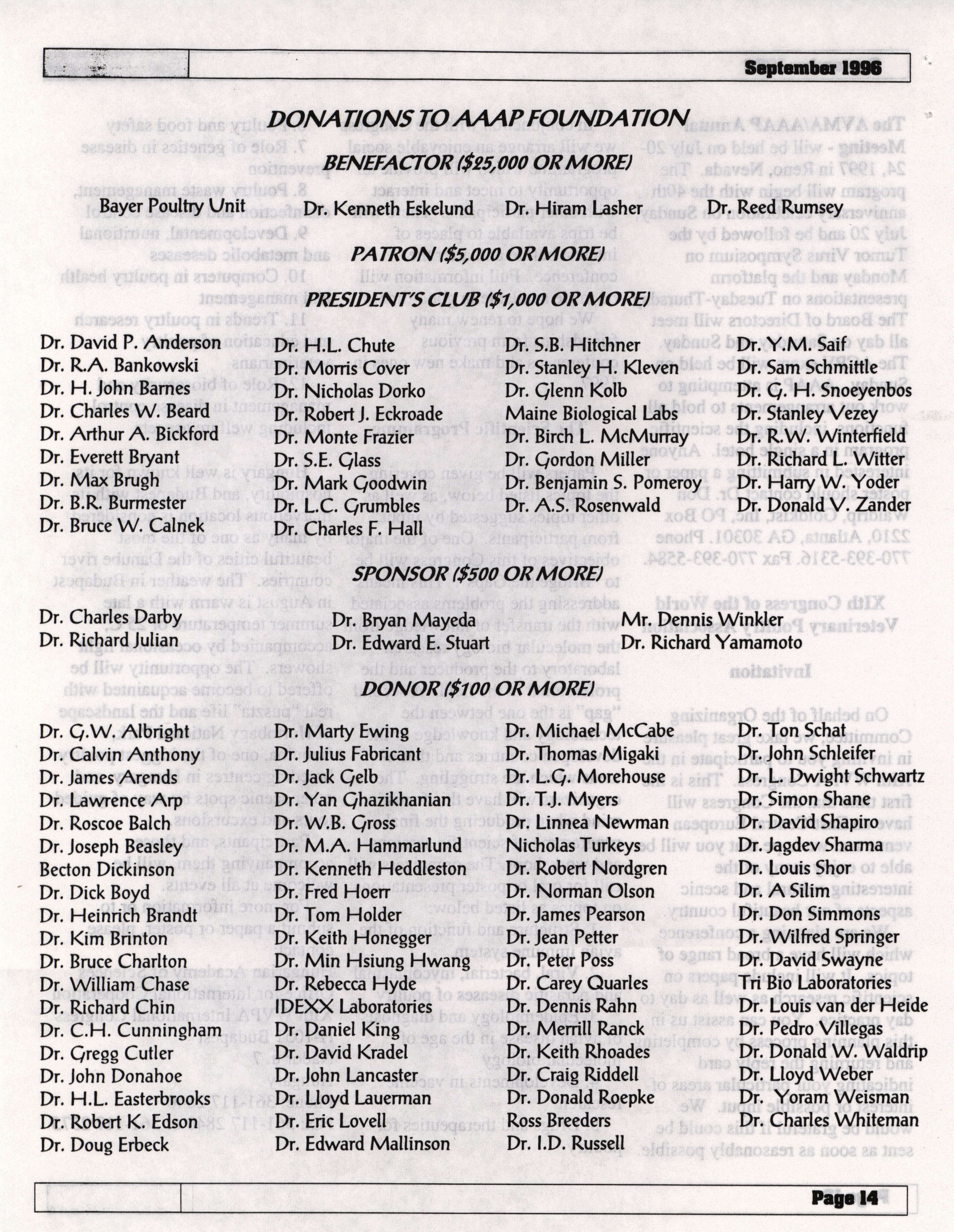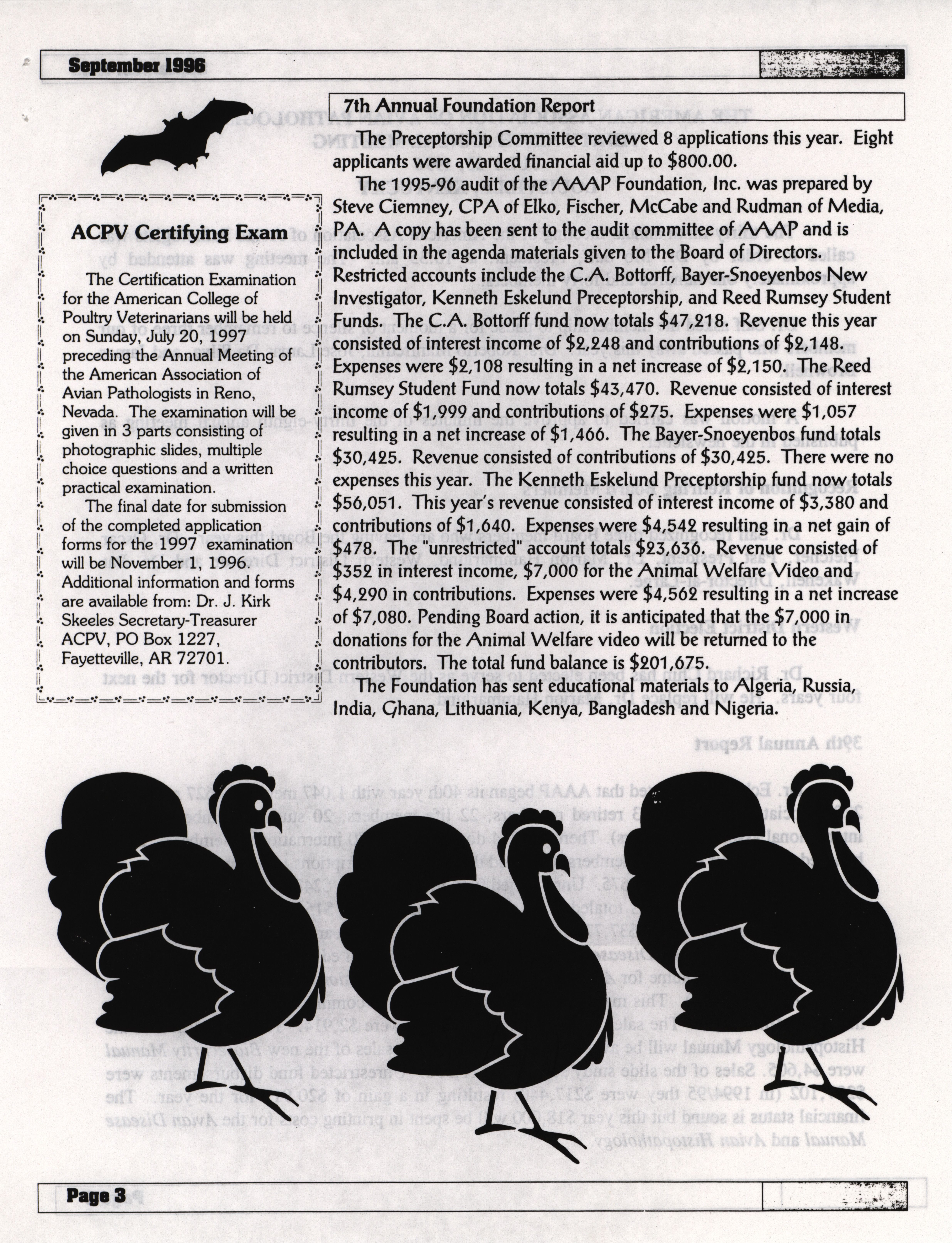 - The fall newsletter of the American Association of Avian Pathologists, September 1996. The quarterly newsletter features several different topics, including minutes of the 39th annual meeting of the AAAP and the 7th annual report of the AAAP foundation. Also included is an announcement from the History Committee of the AAAP about a new project to preserve biographical information on persons who have contributed to poultry medicine. The AAAP archives will be located in Parks Library, Iowa State University.