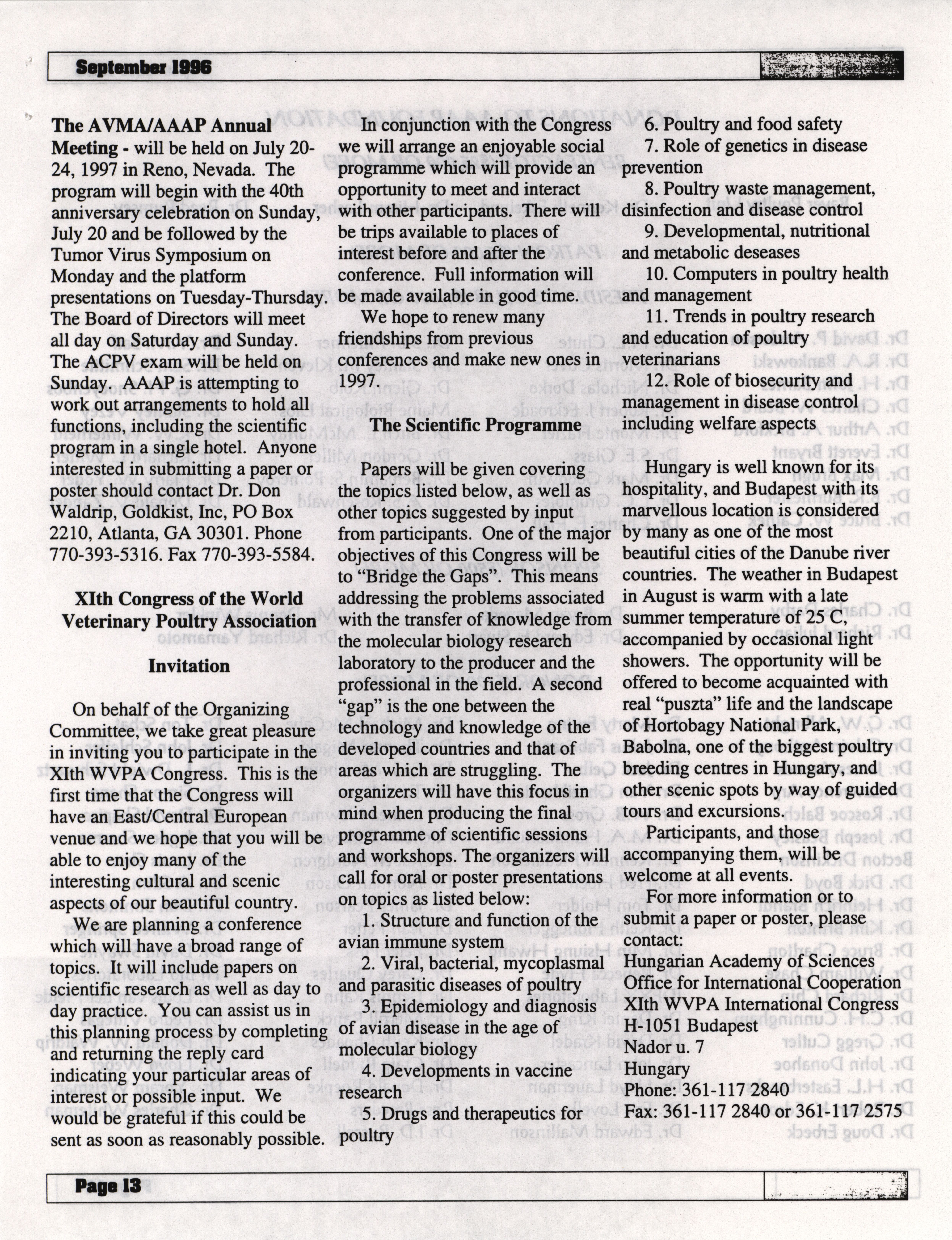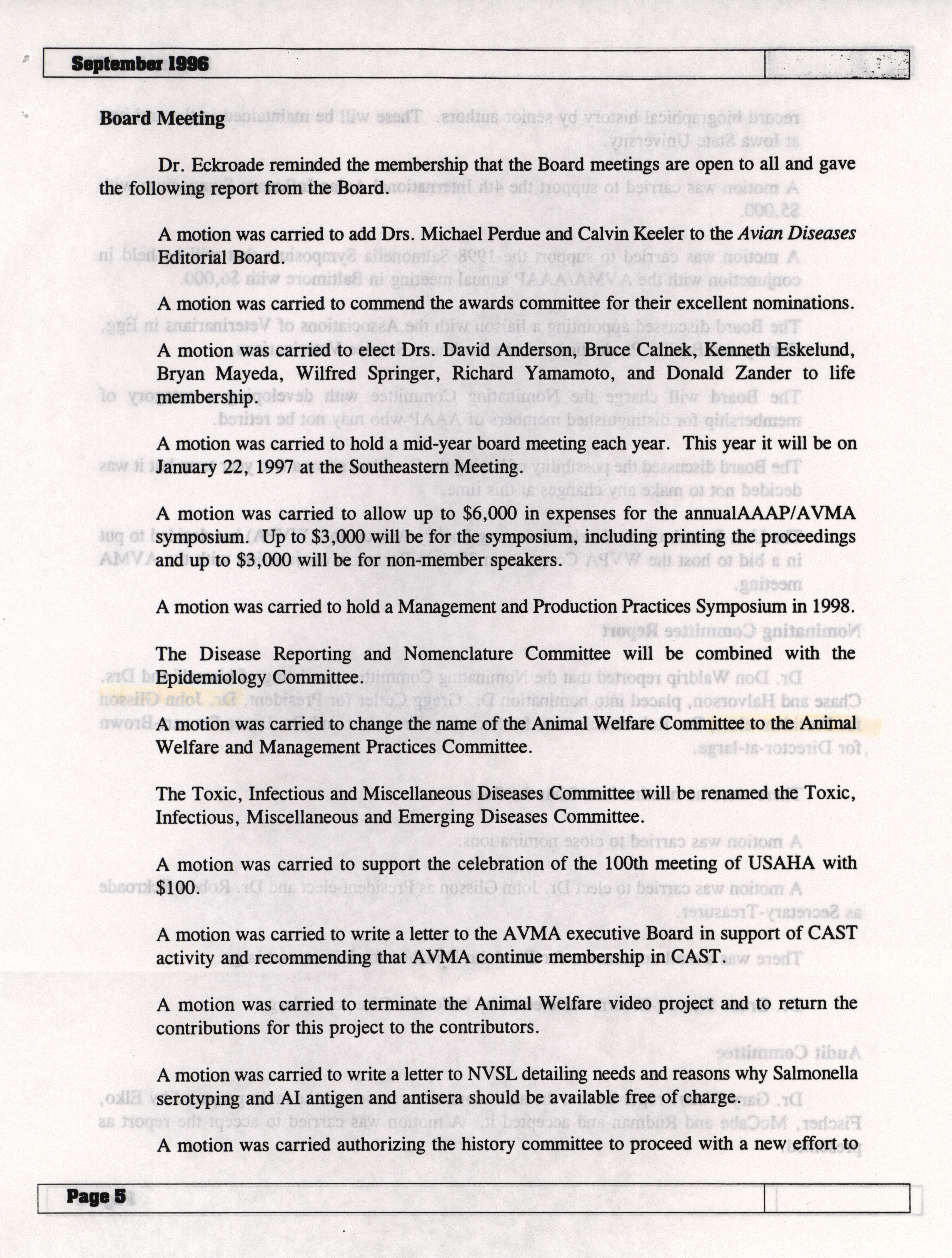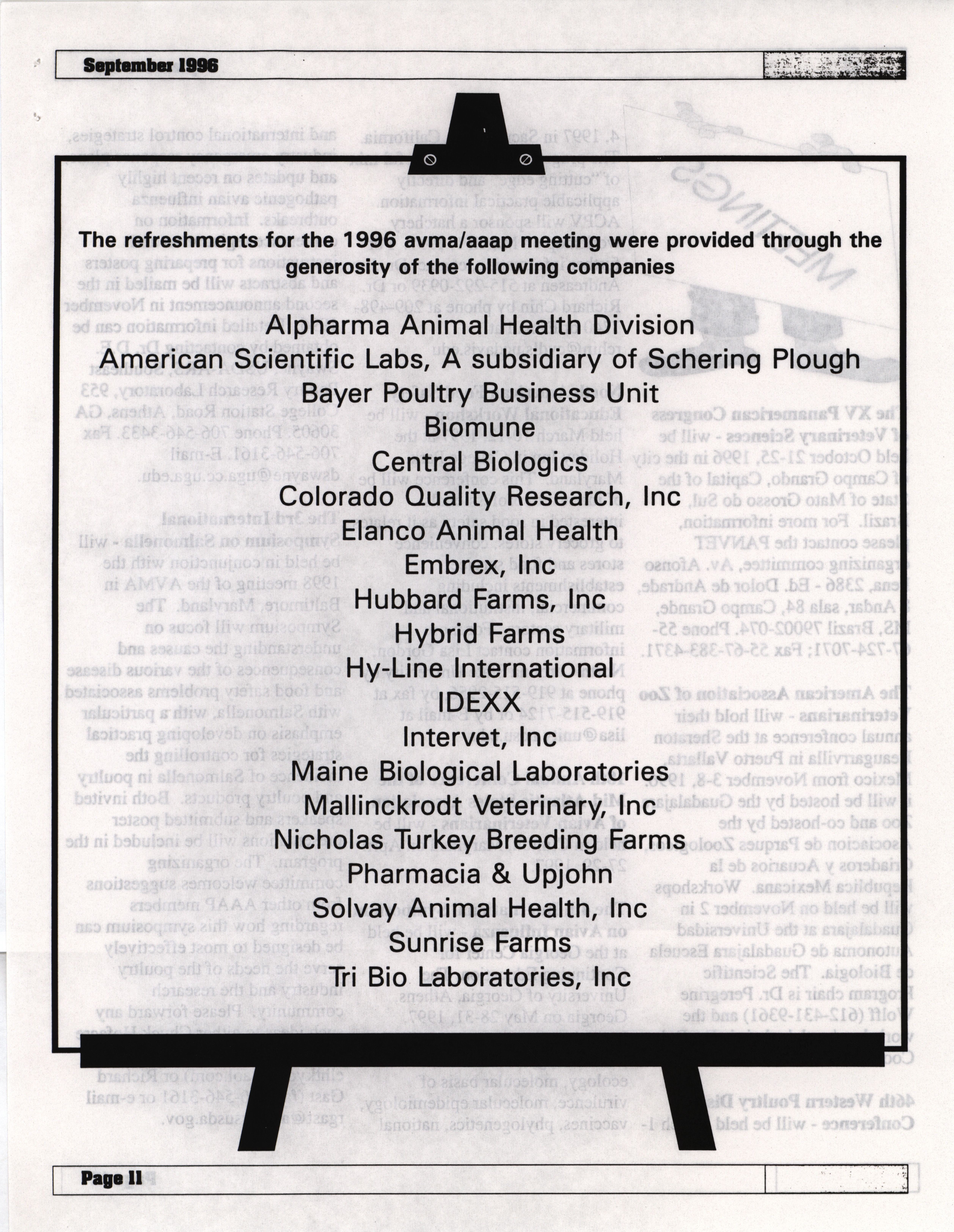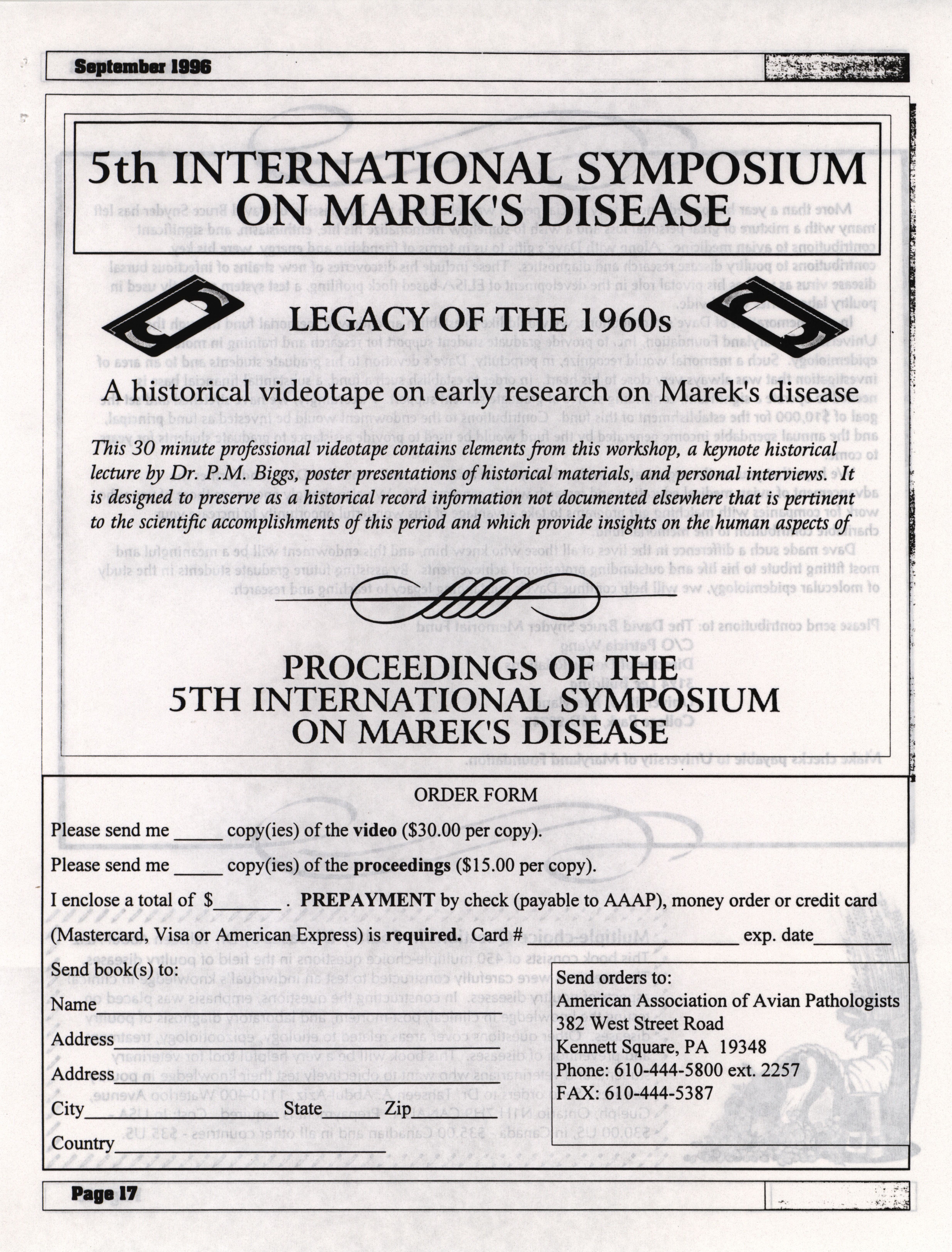 - The fall newsletter of the American Association of Avian Pathologists, September 1996. The quarterly newsletter features several different topics, including minutes of the 39th annual meeting of the AAAP and the 7th annual report of the AAAP foundation. Also included is an announcement from the History Committee of the AAAP about a new project to preserve biographical information on persons who have contributed to poultry medicine. The AAAP archives will be located in Parks Library, Iowa State University.