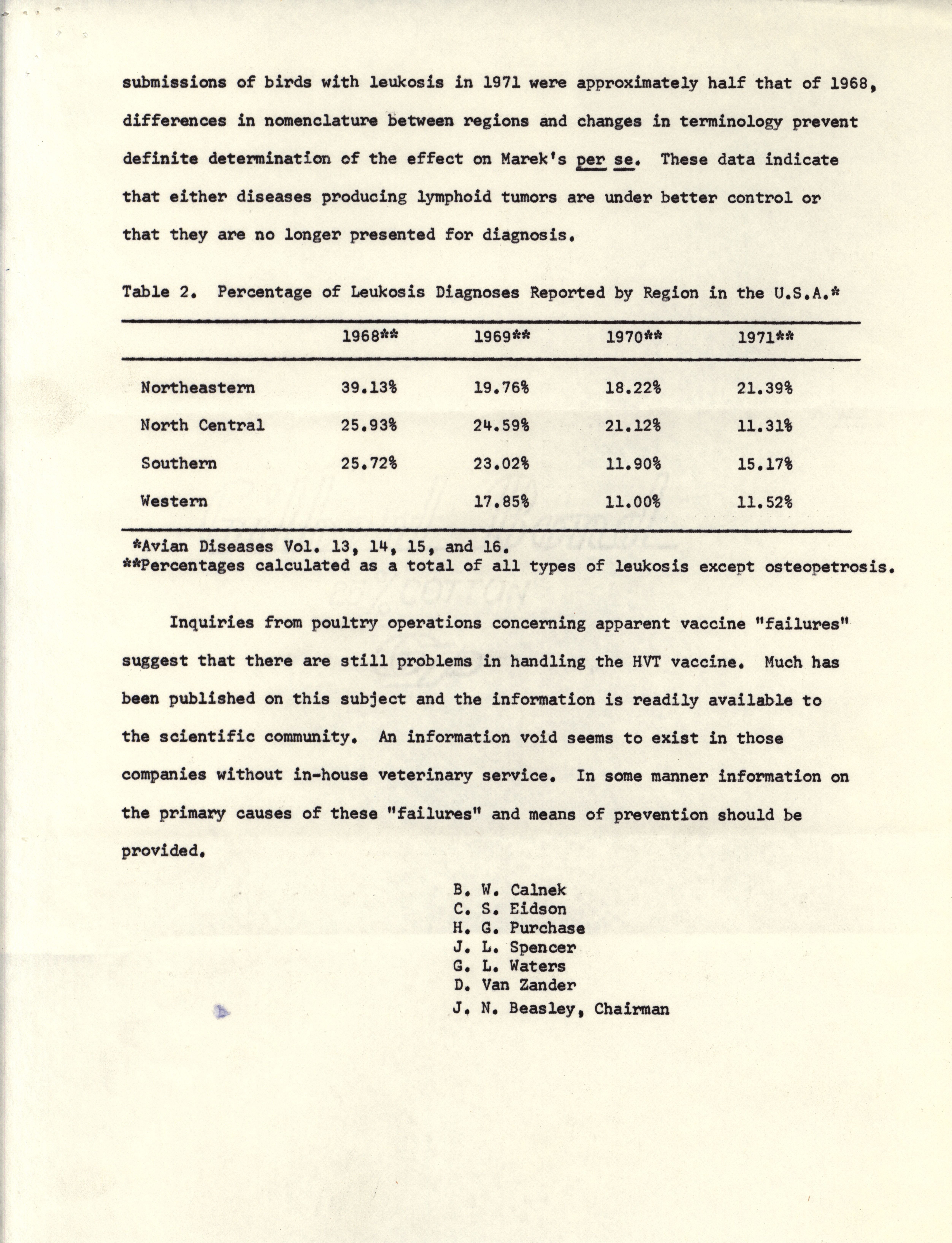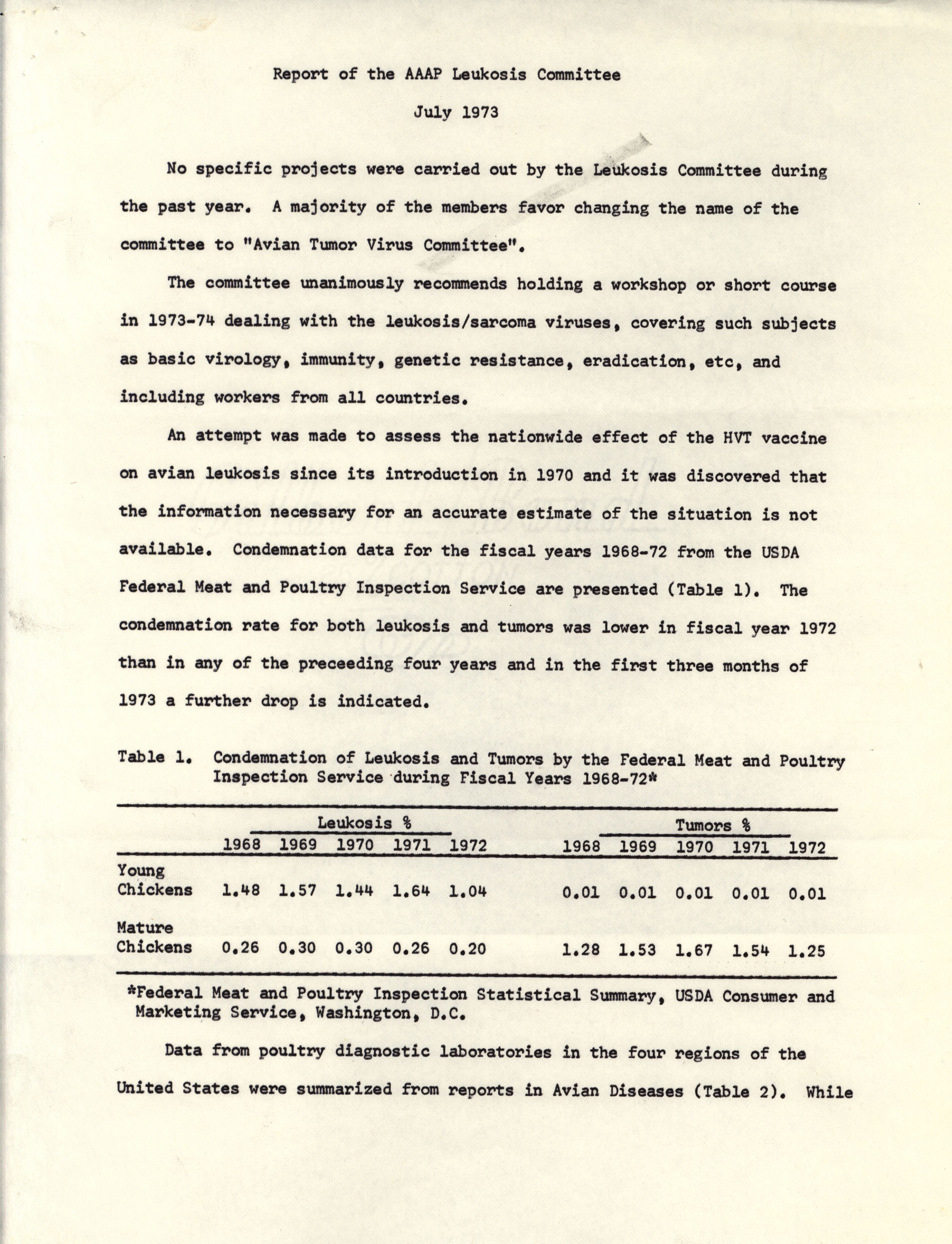 - Report from July 1973 by the American Association of Avian Pathologists Leukosis Committee describing the actions and goals of the committee.