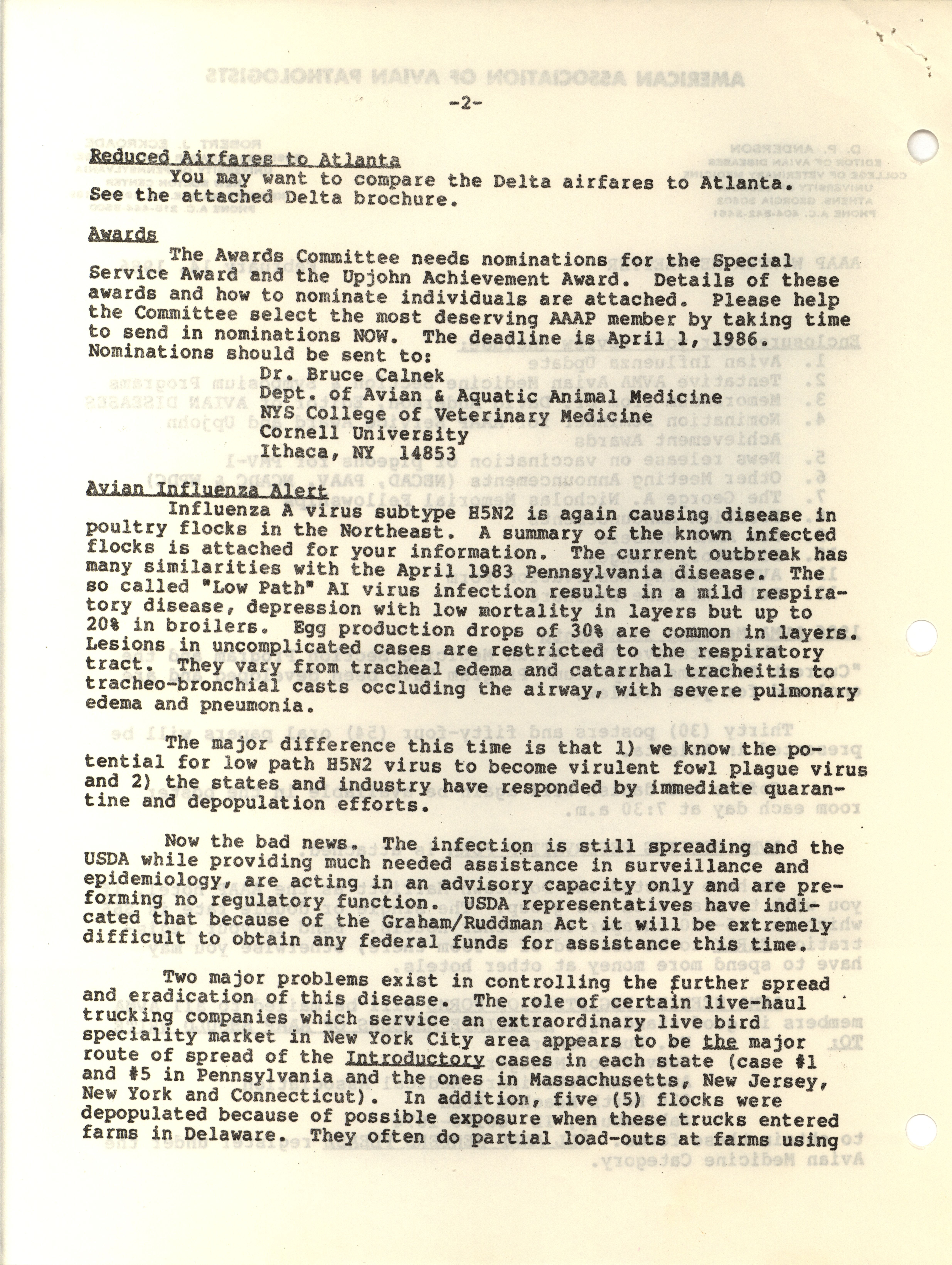 - Winter newsletter of the American Association of Avian Pathologists from February 14, 1986 including announcements, memorandums and other news.