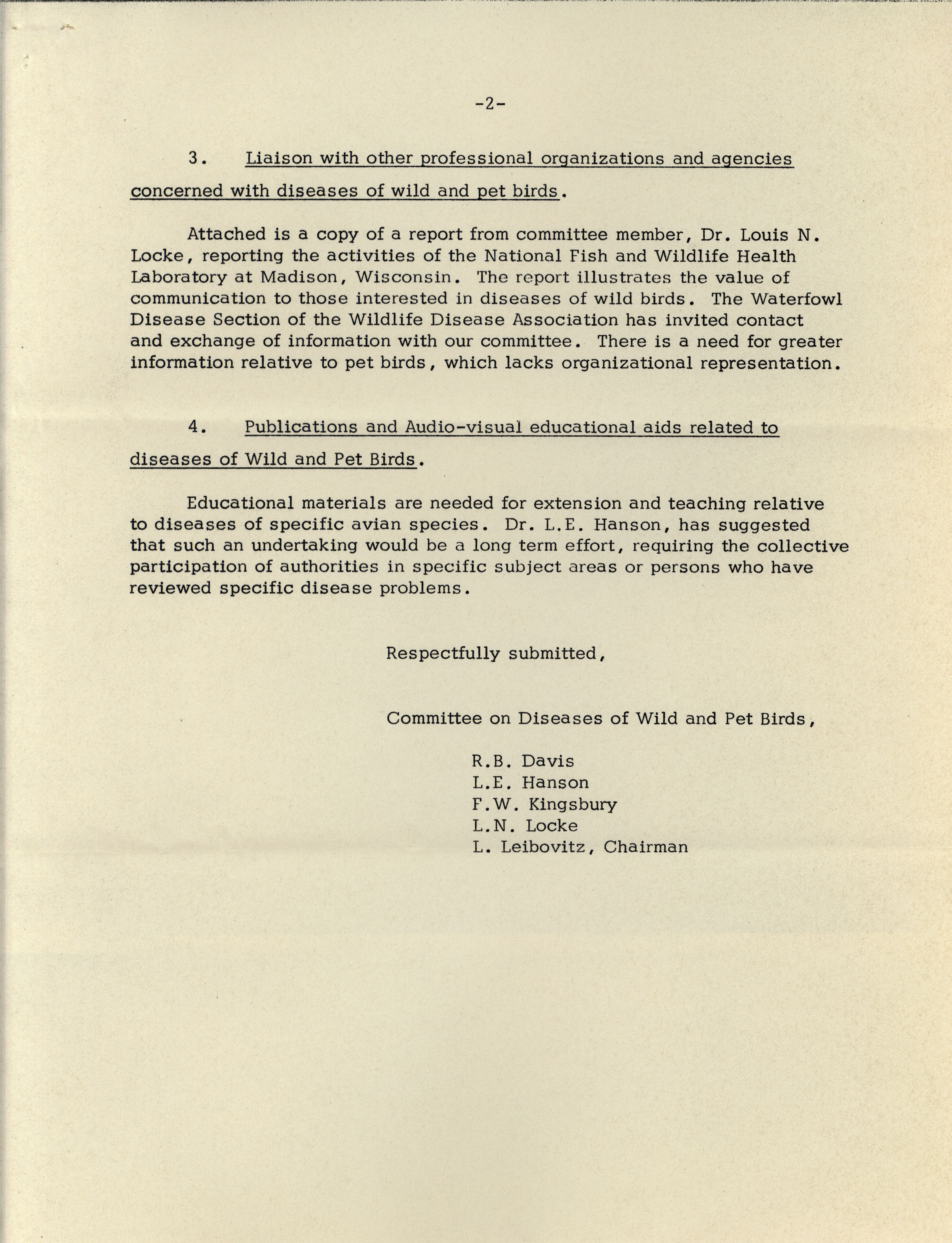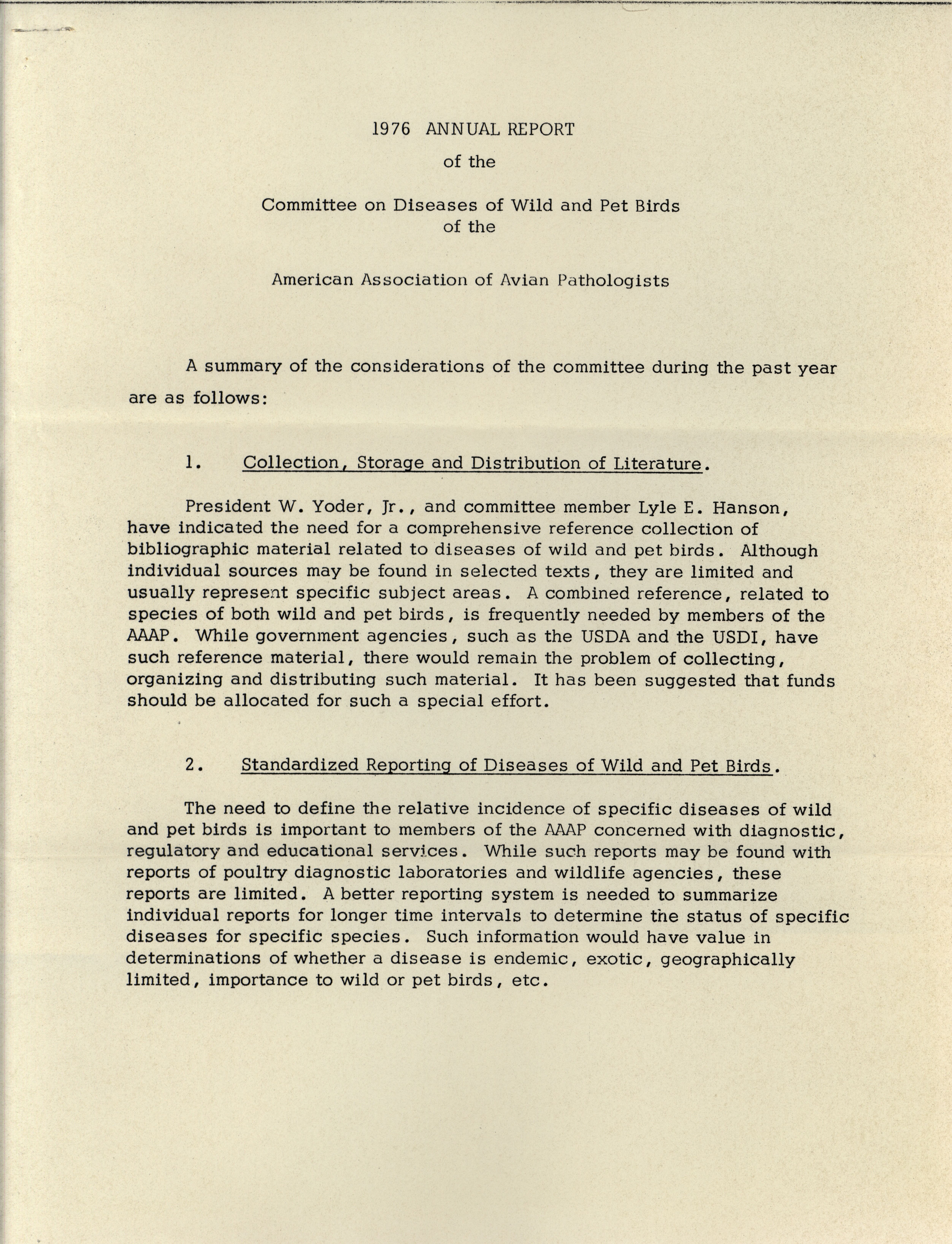 - "Report from the American Association of Avian Pathologists committee on diseases of wild and pet birds, 1976", American Association of Avian Pathologists Collection, Iowa State University Library Digital Collections