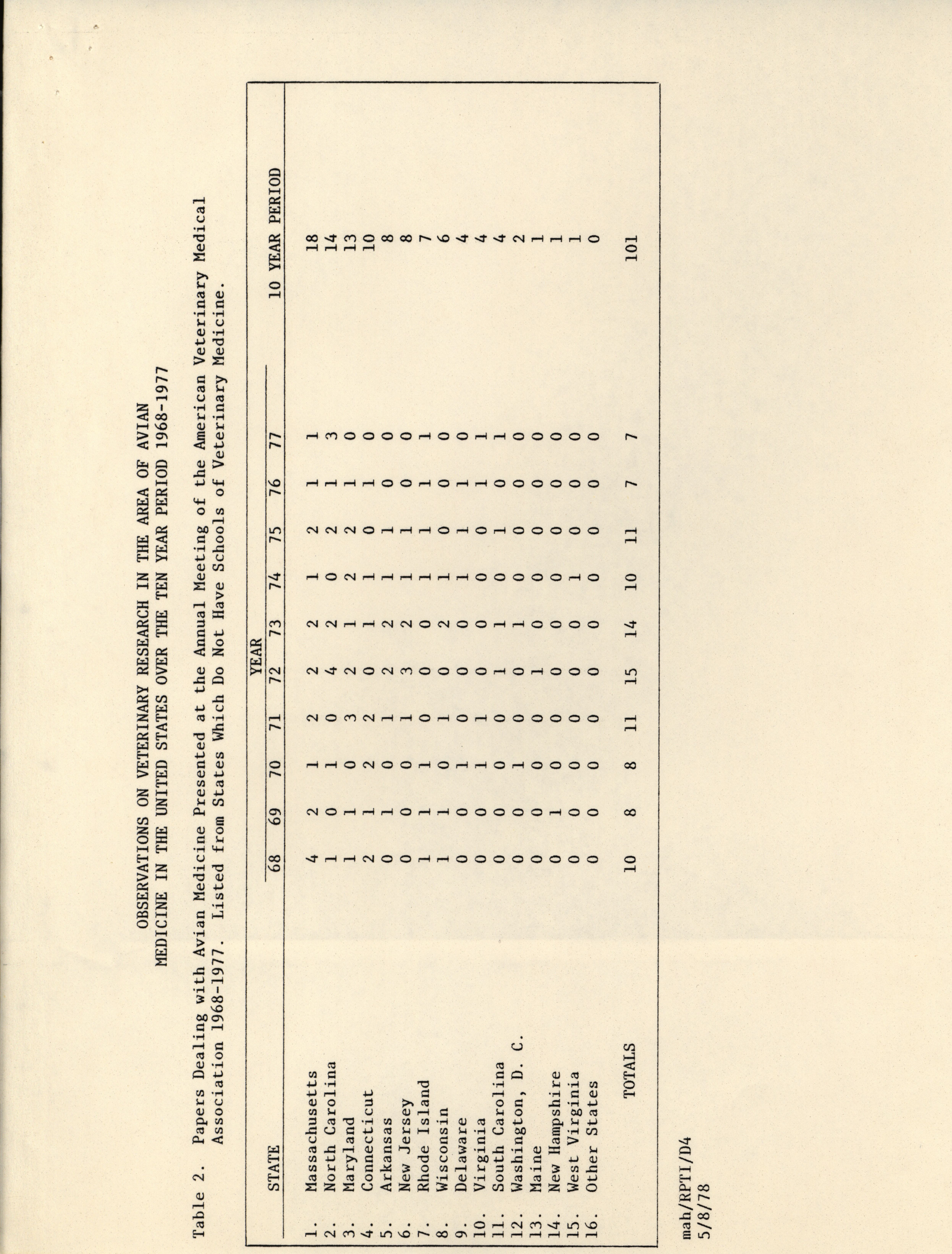 - Statistical tables analyzing veterinary research in avian medicine in the United States during 1968-1977.