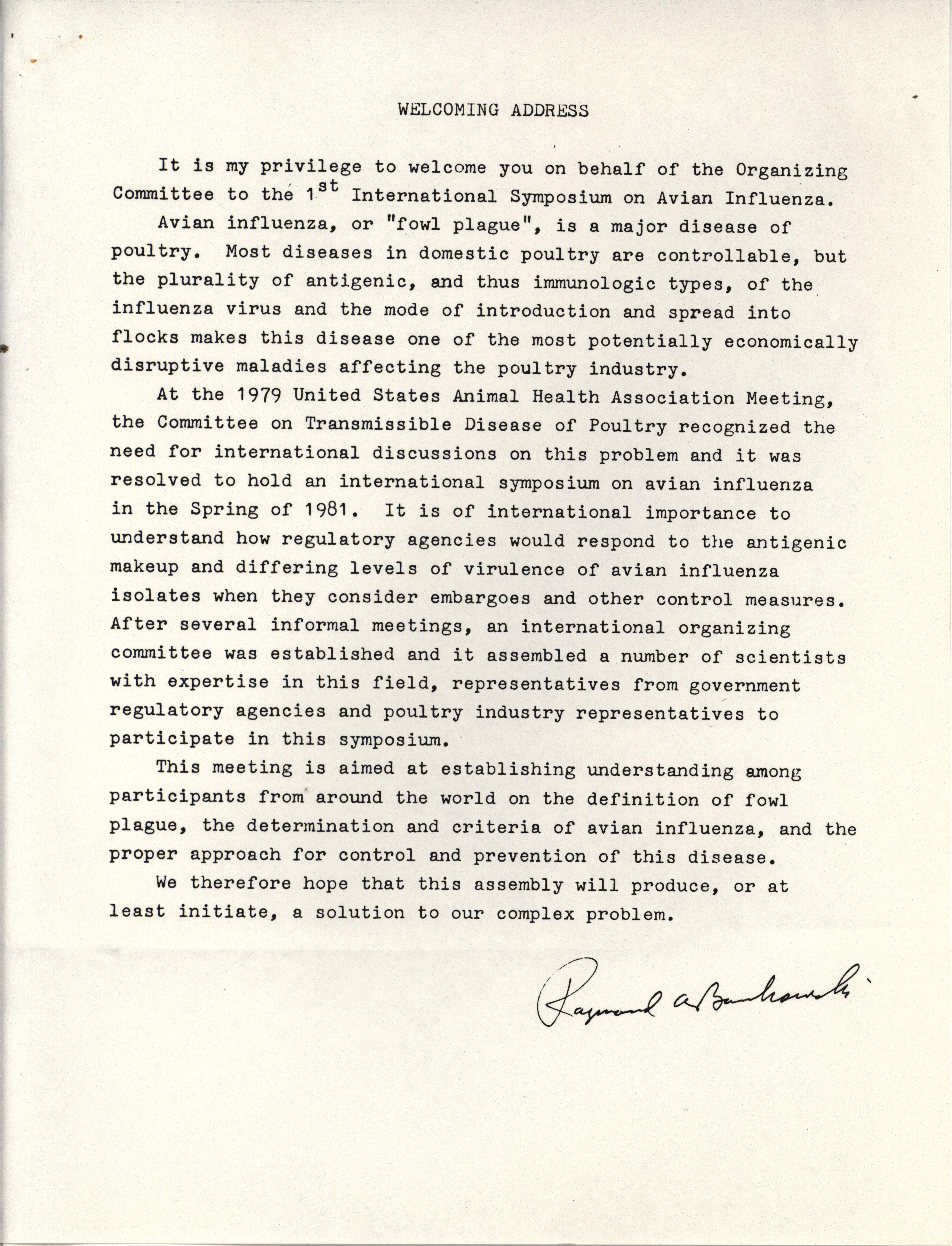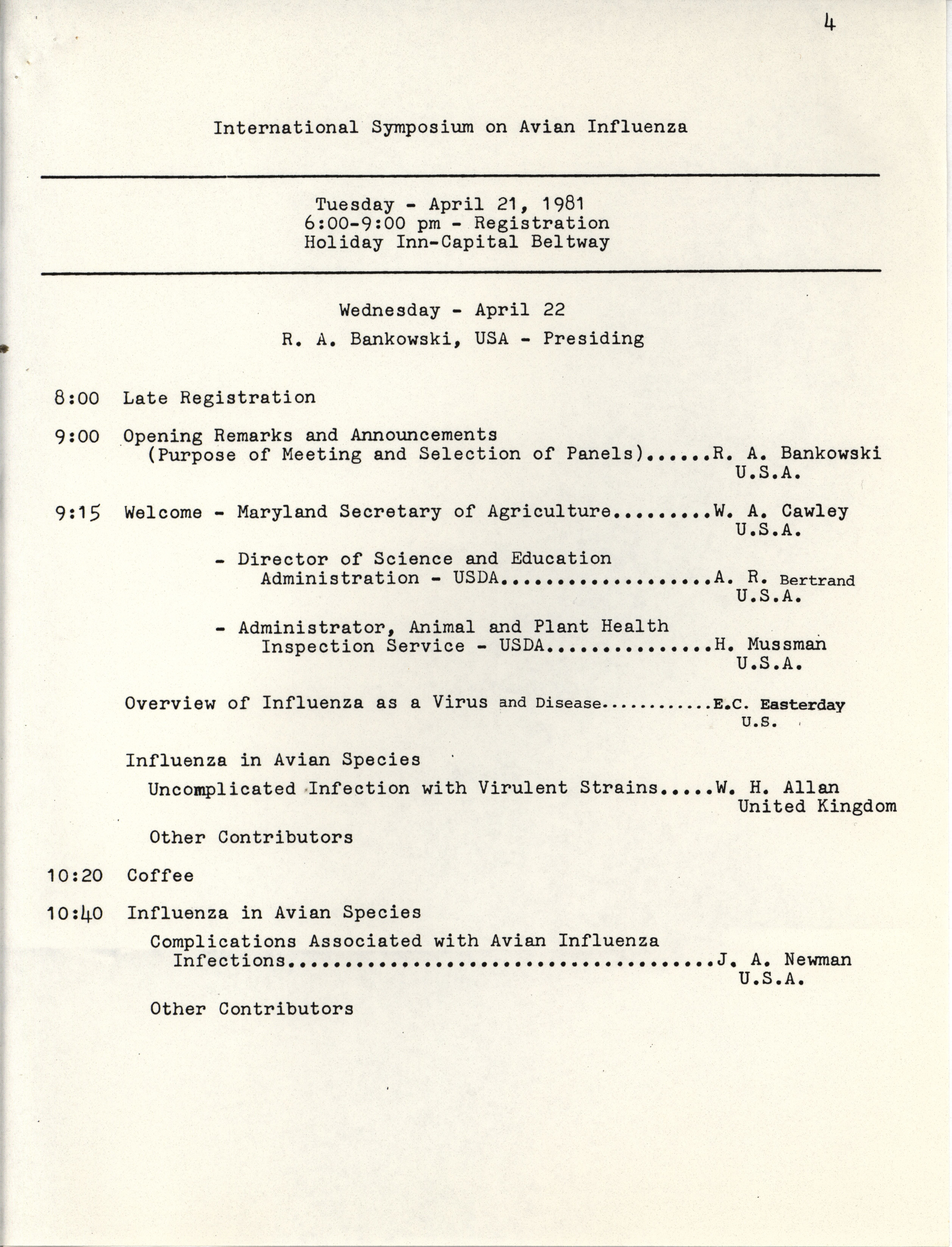 - Schedule of events and opening address for an international symposium on avian influenza in Beltsville, Maryland on April 22-24, 1981.