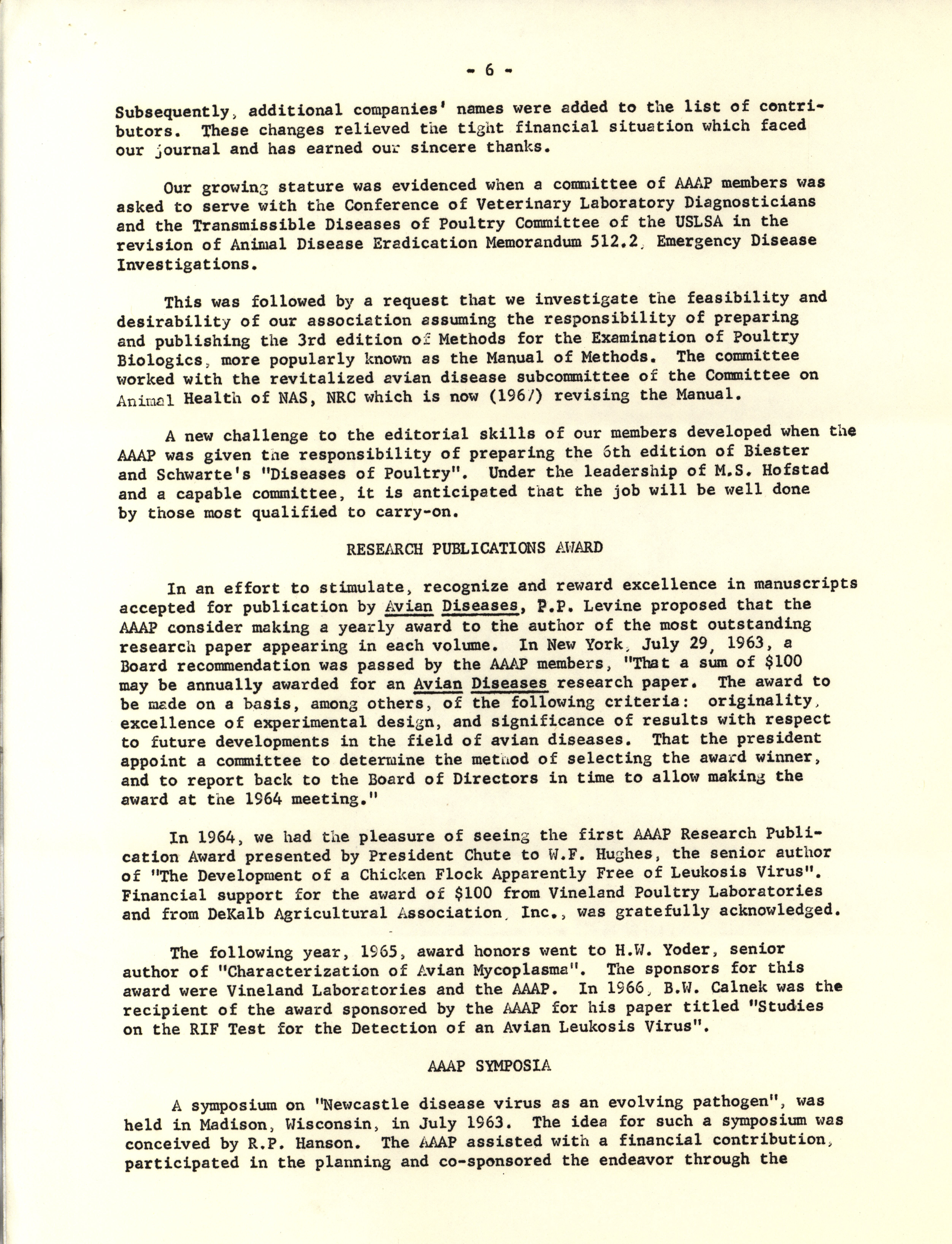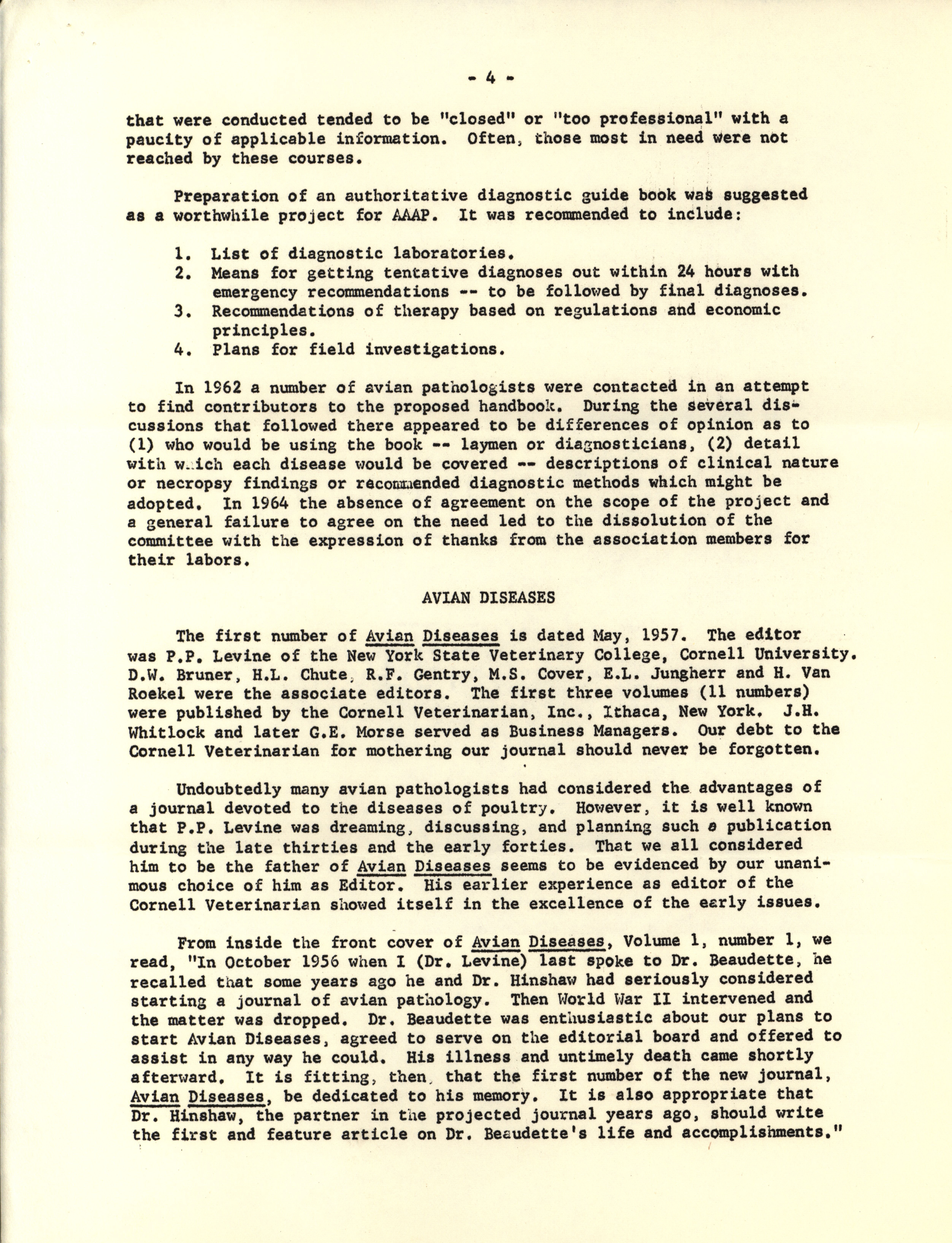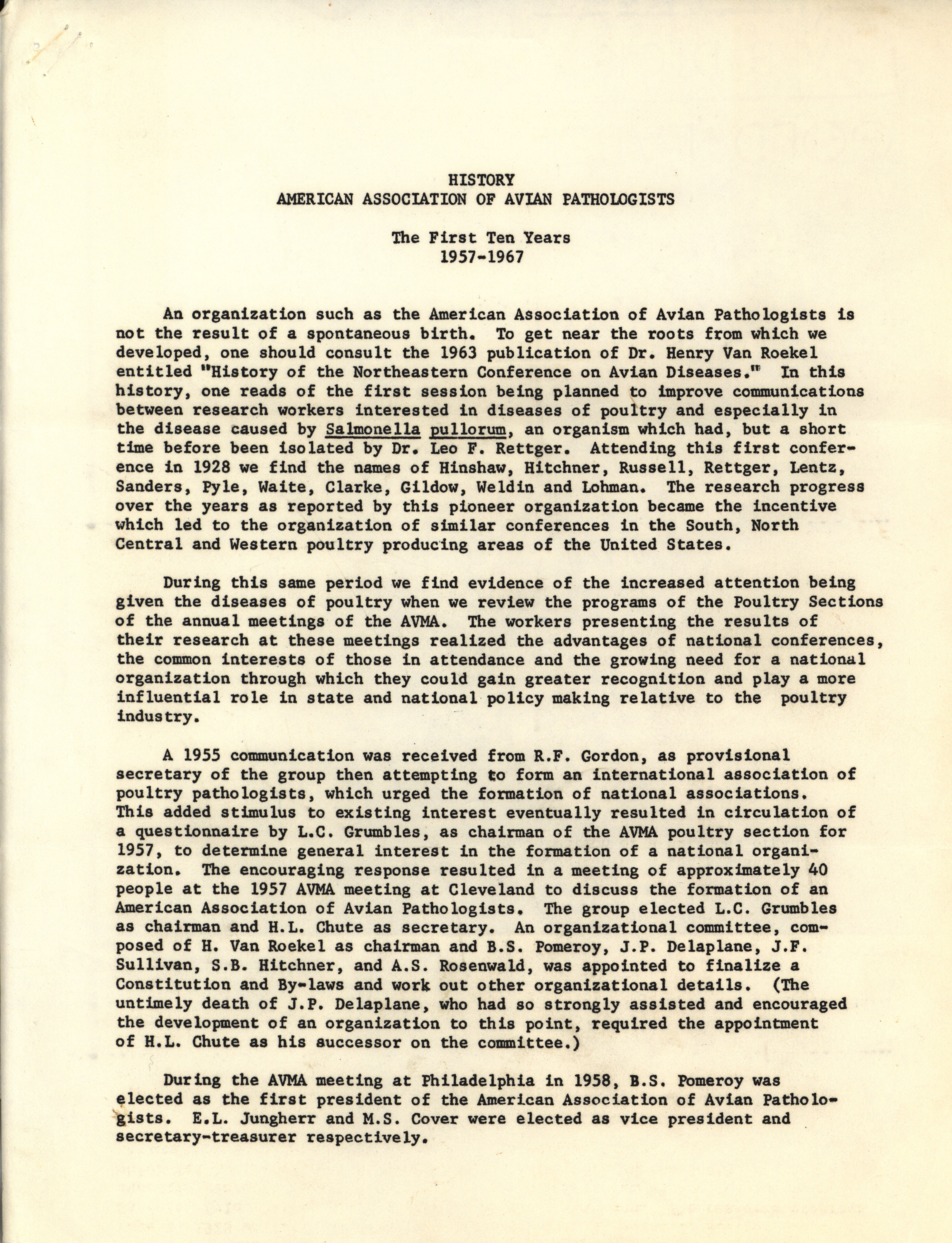 - "History of the first ten years of the American Association of Avian Pathologists, 1957-1967", American Association of Avian Pathologists Collection, Iowa State University Library Digital Collections