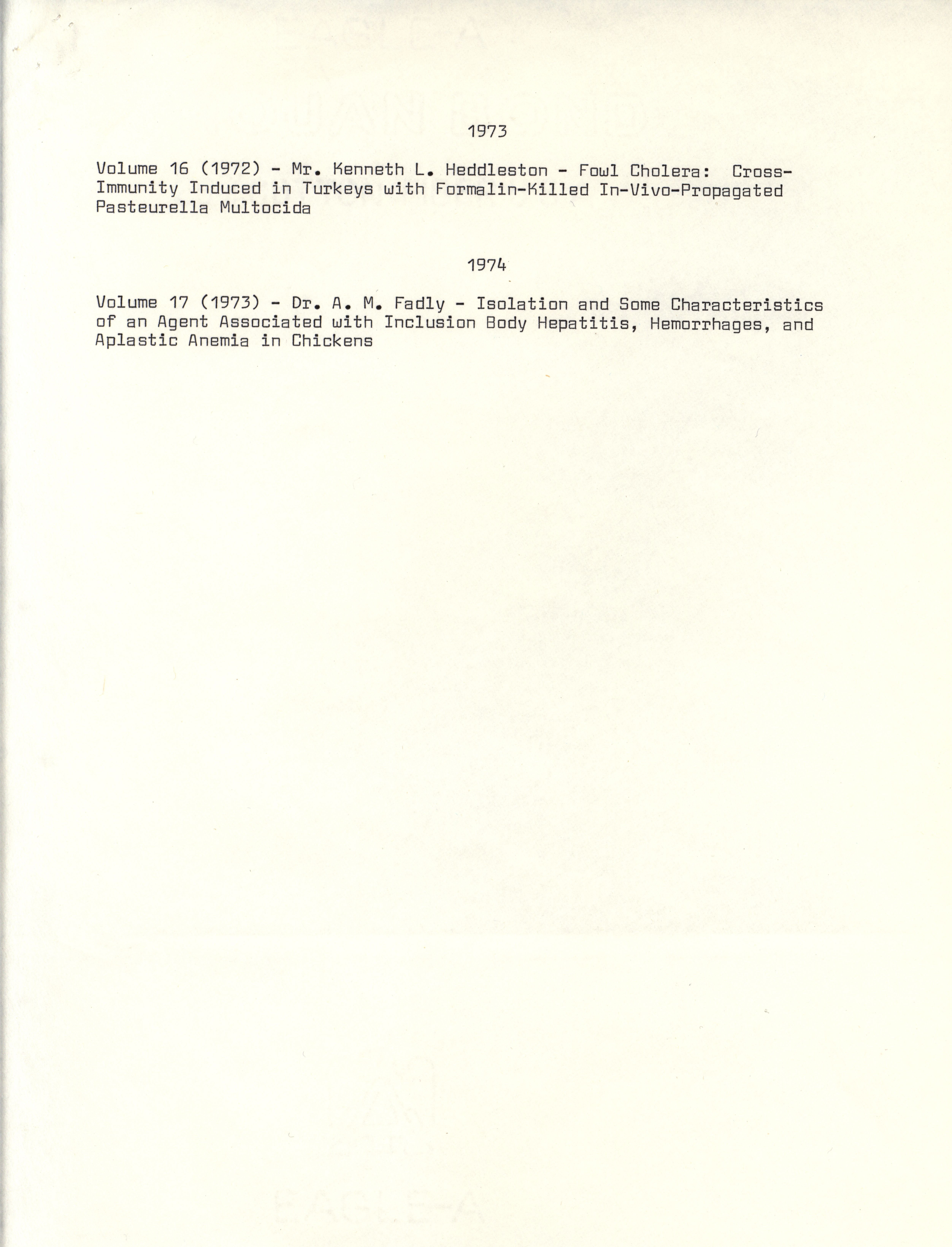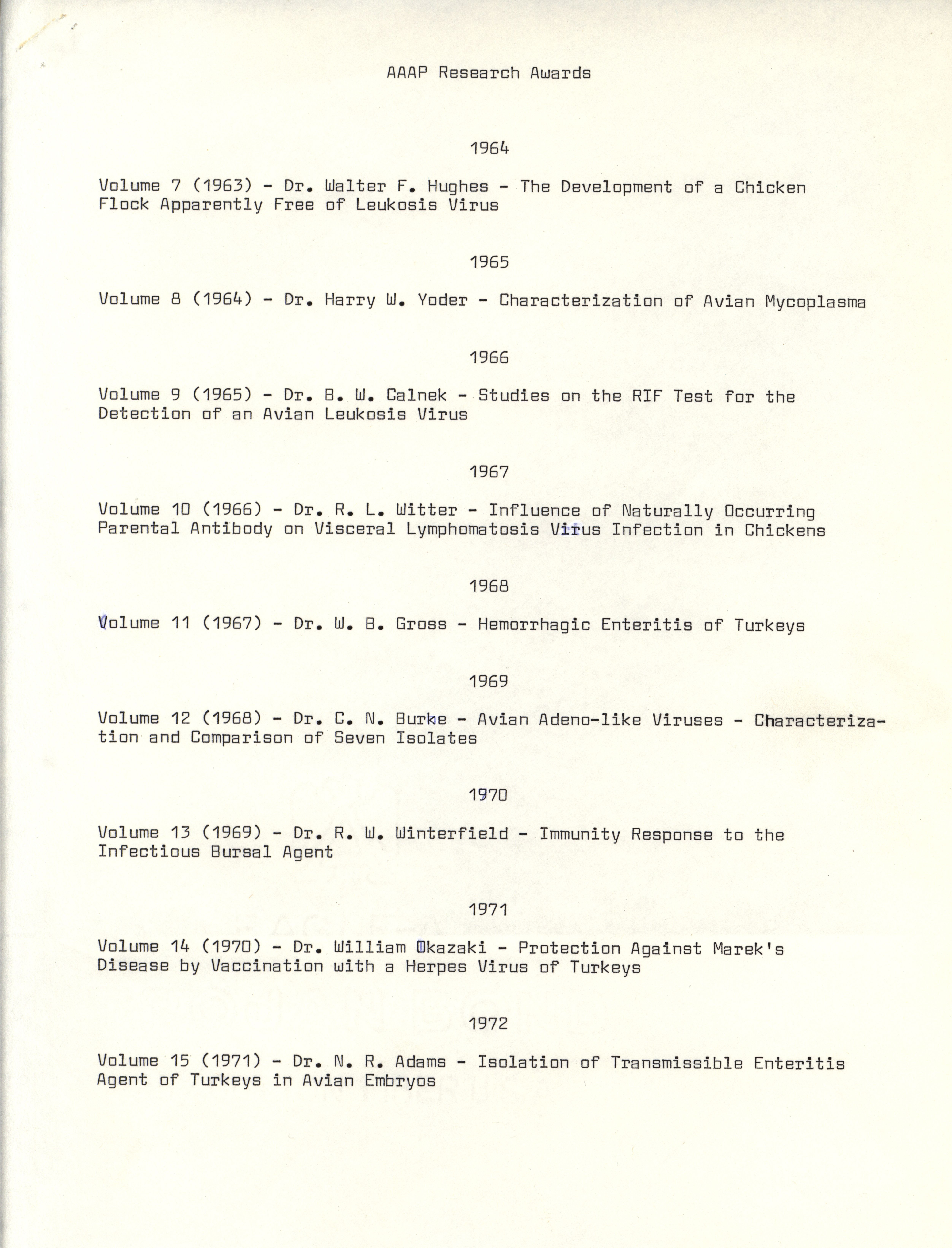 - "List of American Association of Avian Pathologists research awards, 1964-1974", American Association of Avian Pathologists Collection, Iowa State University Library Digital Collections