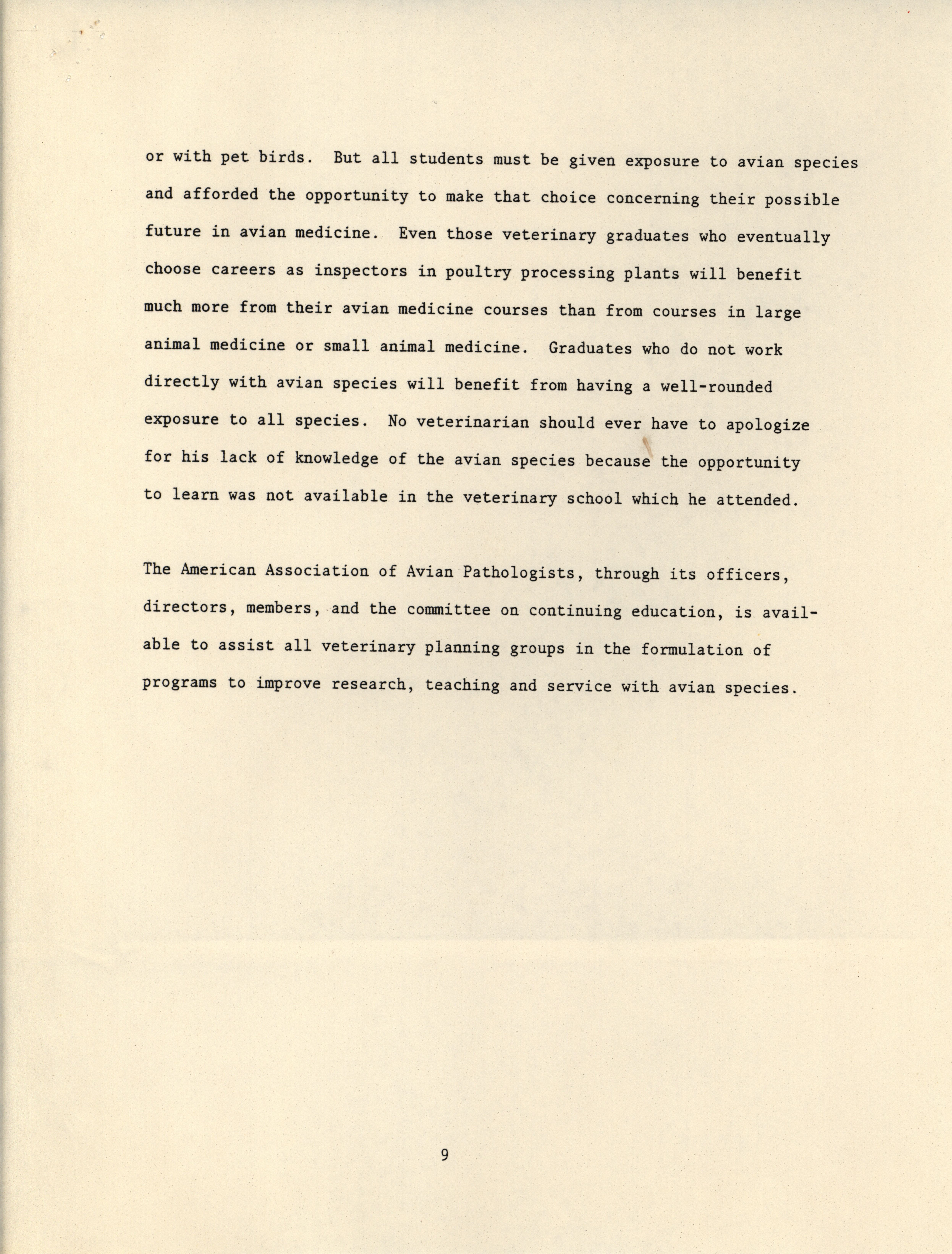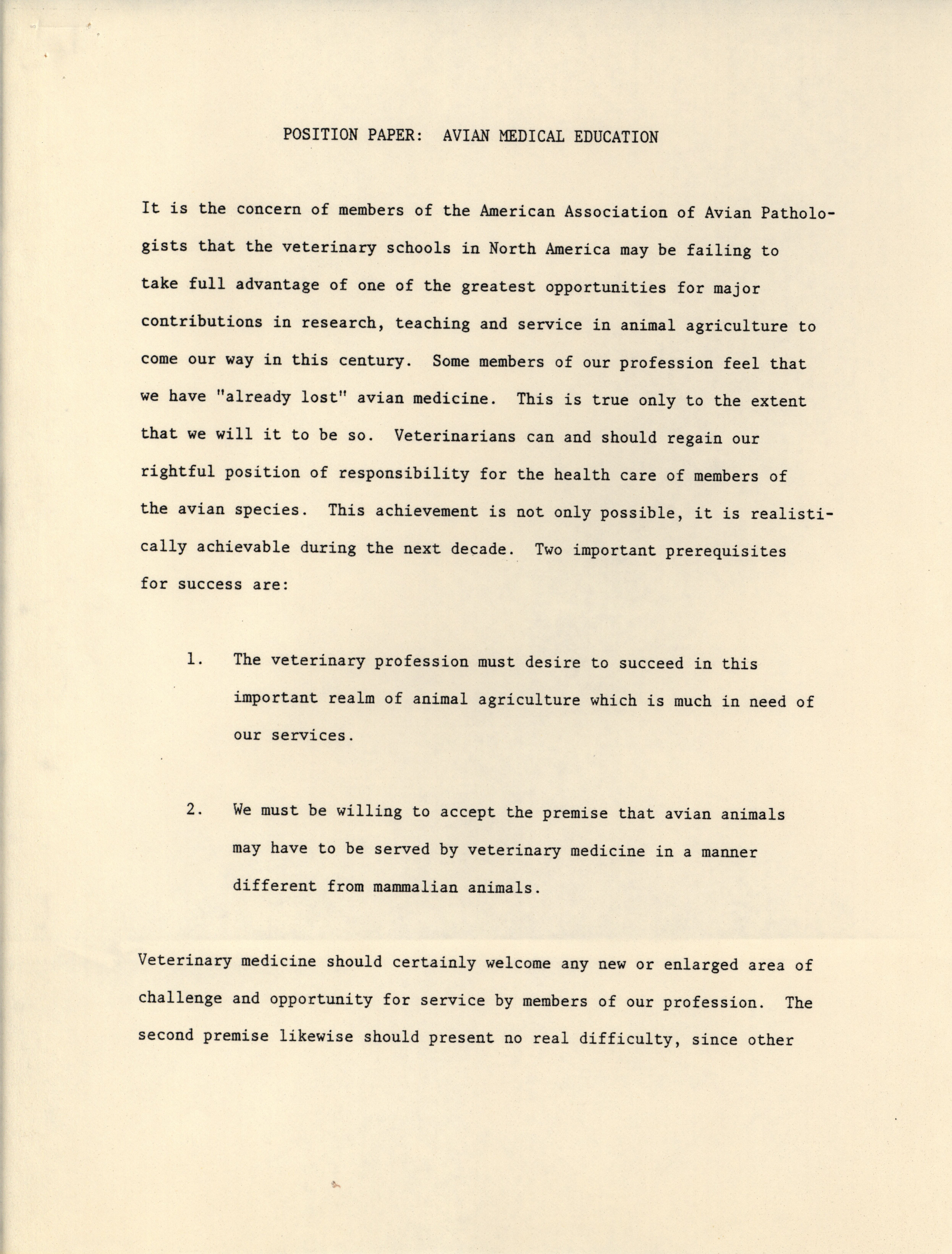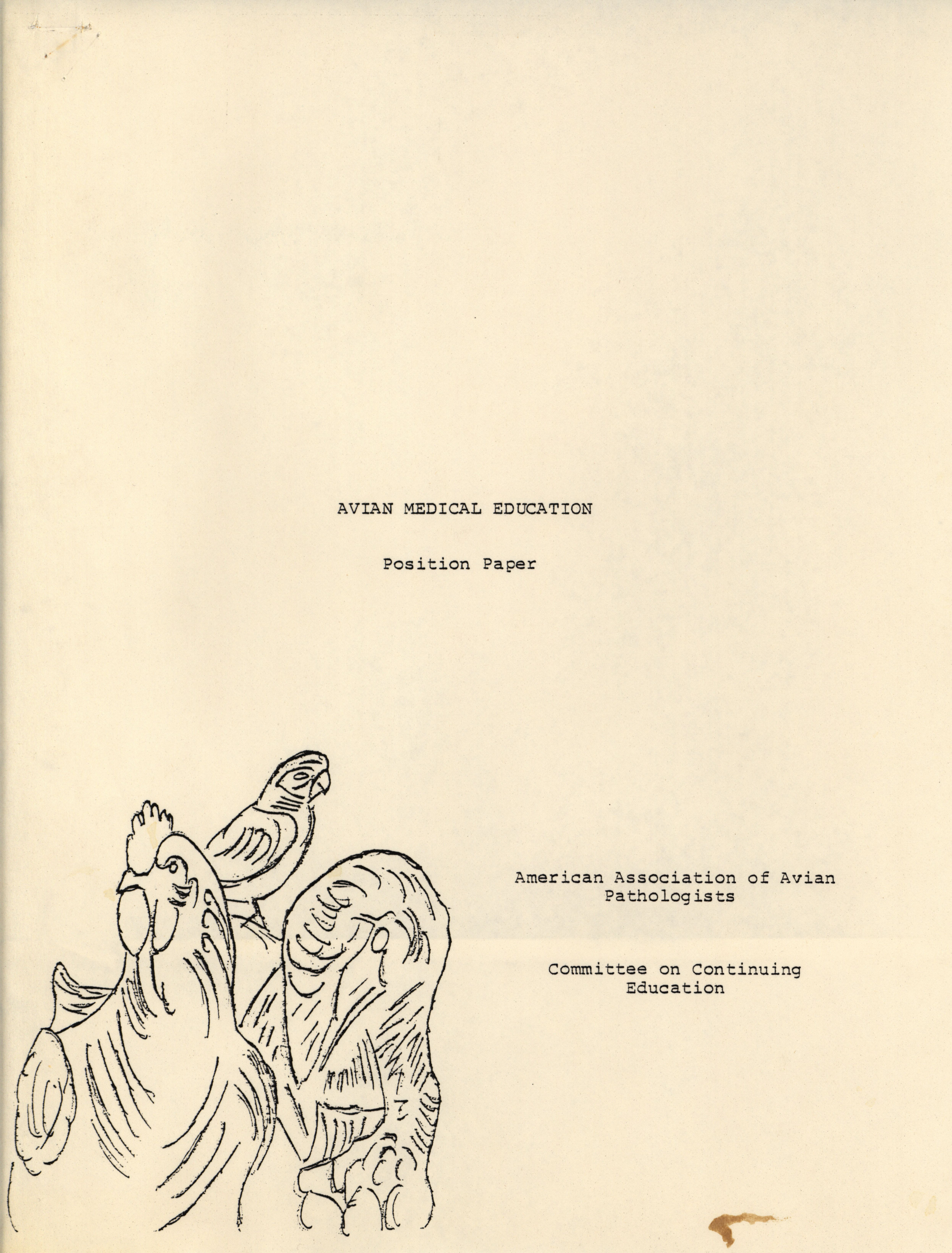 - Position paper arguing for a greater emphasis on avian medical education in veterinary schools, prepared by the Continuing Education Committee of the American Association of Avian Pathologists.