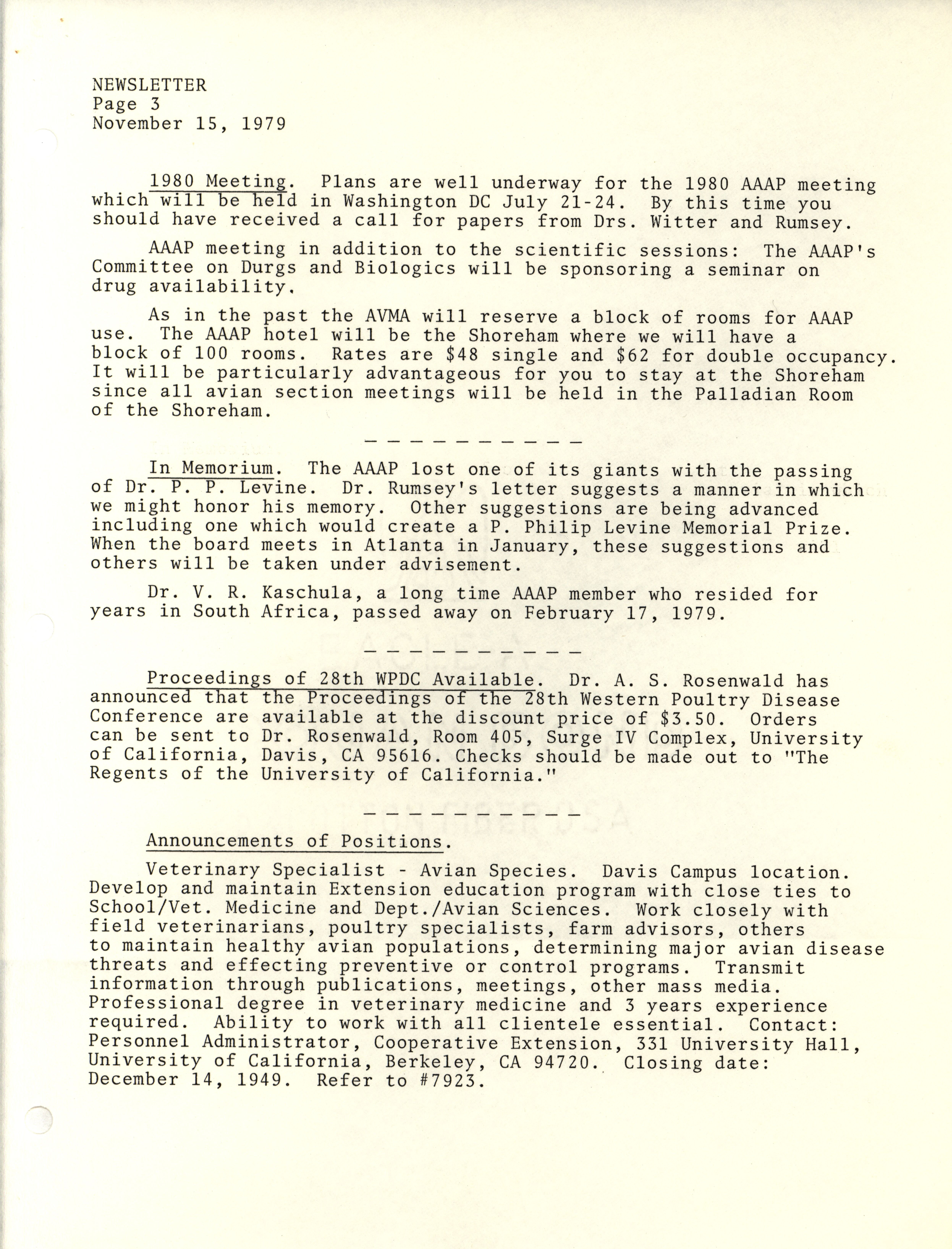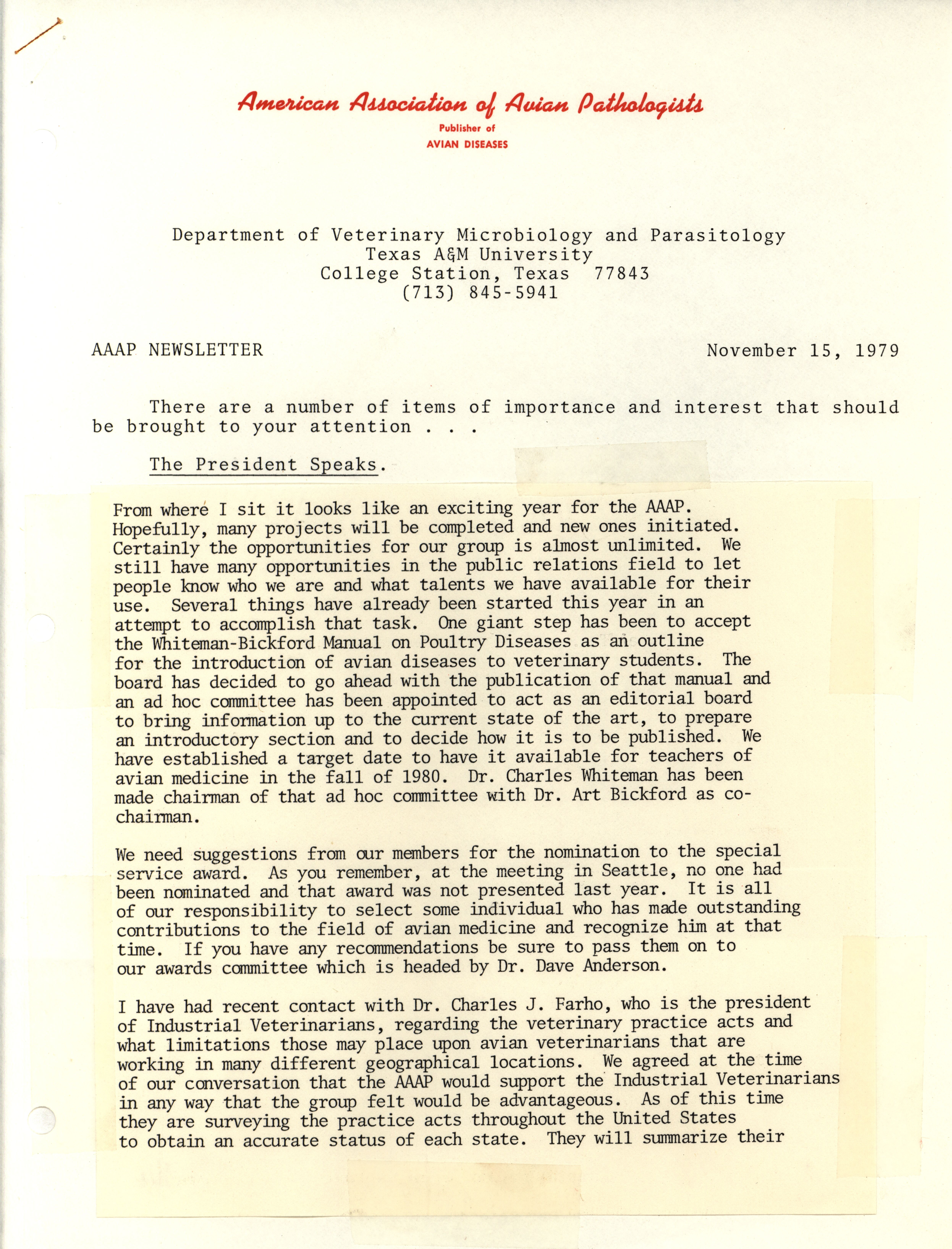 - "AAAP newsletter, November 15, 1979", American Association of Avian Pathologists Collection, Iowa State University Library Digital Collections