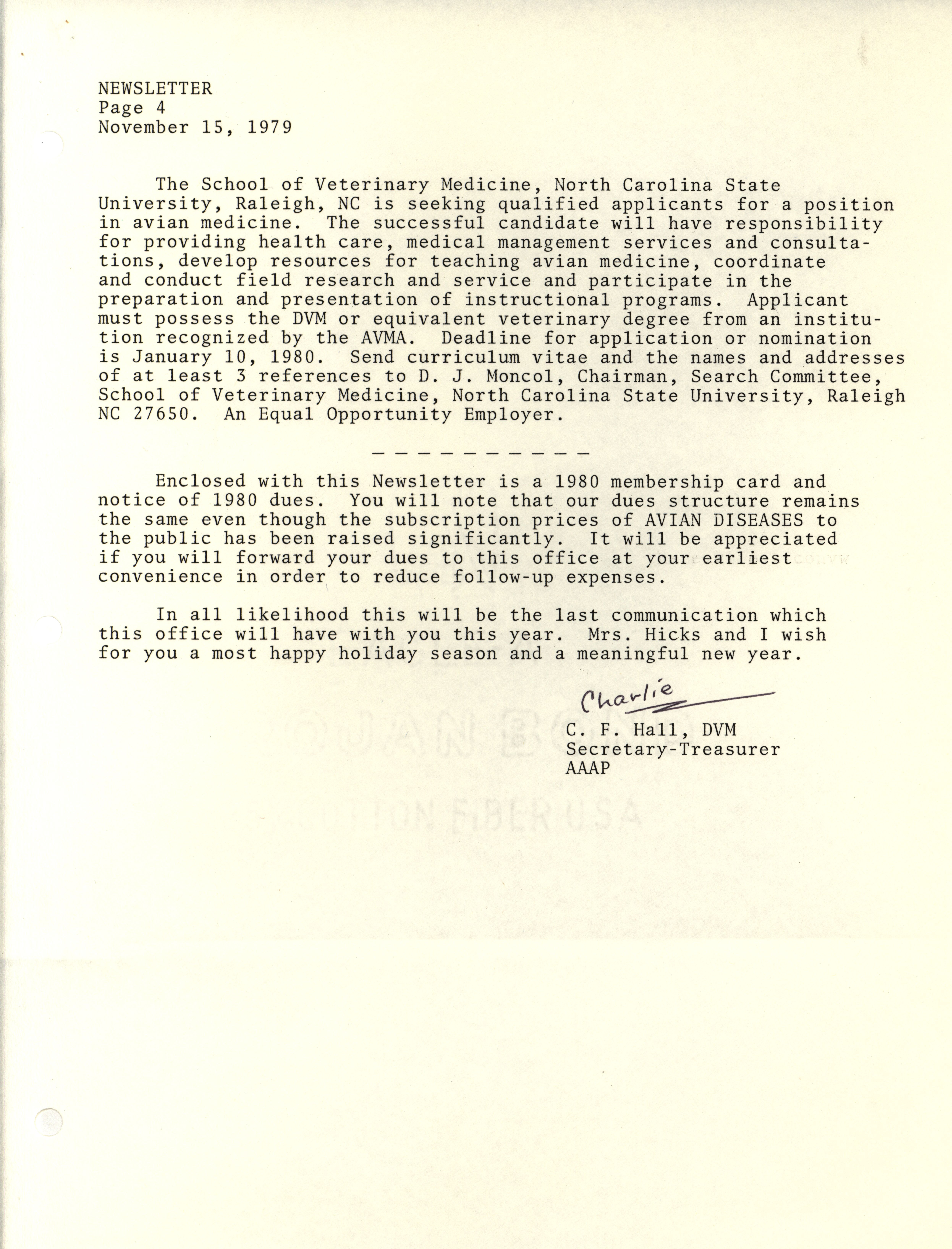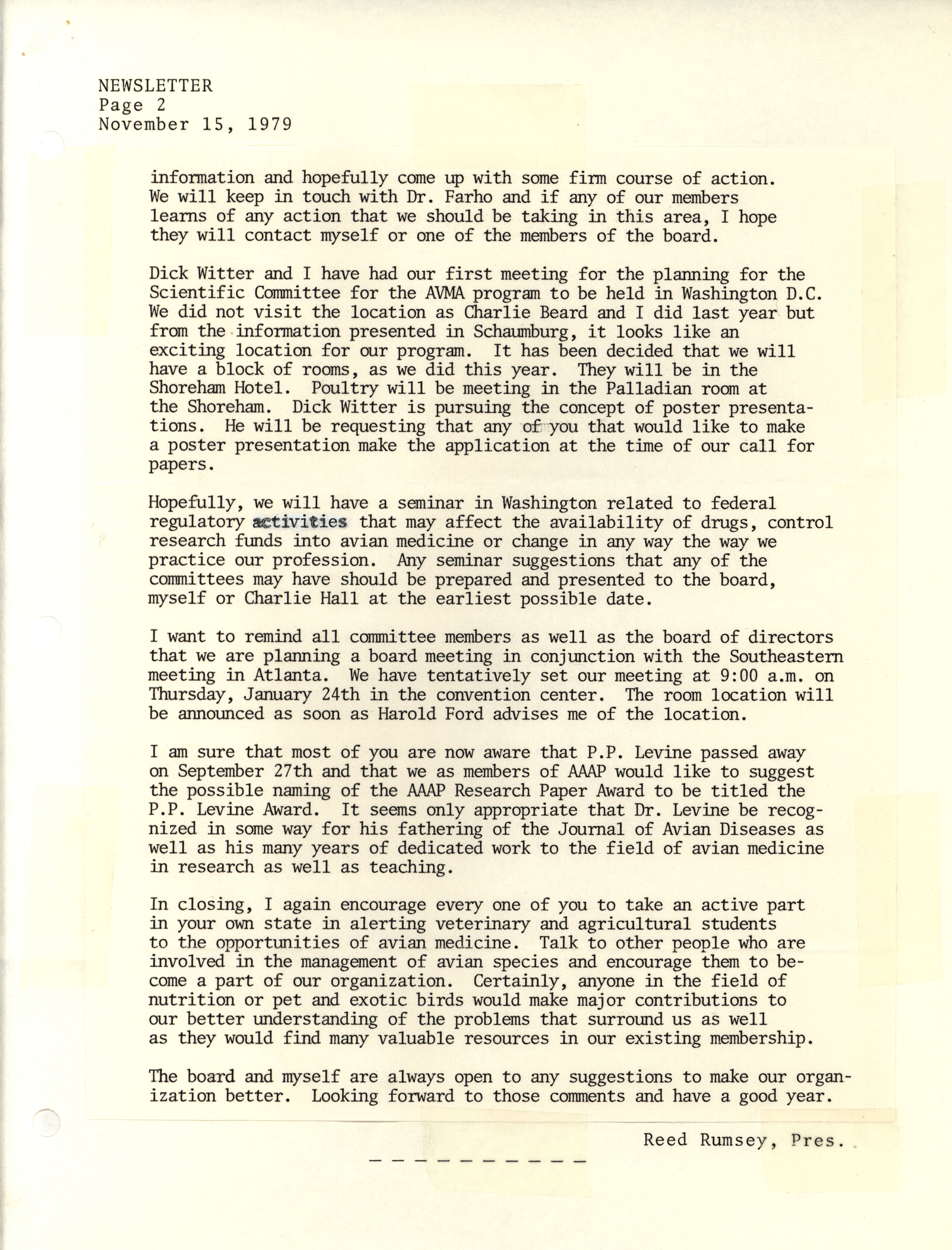 - Newsletter for the American Association of Avian Pathologists from November 15, 1979 including a letter from the president of the organization, upcoming meetings and other information.