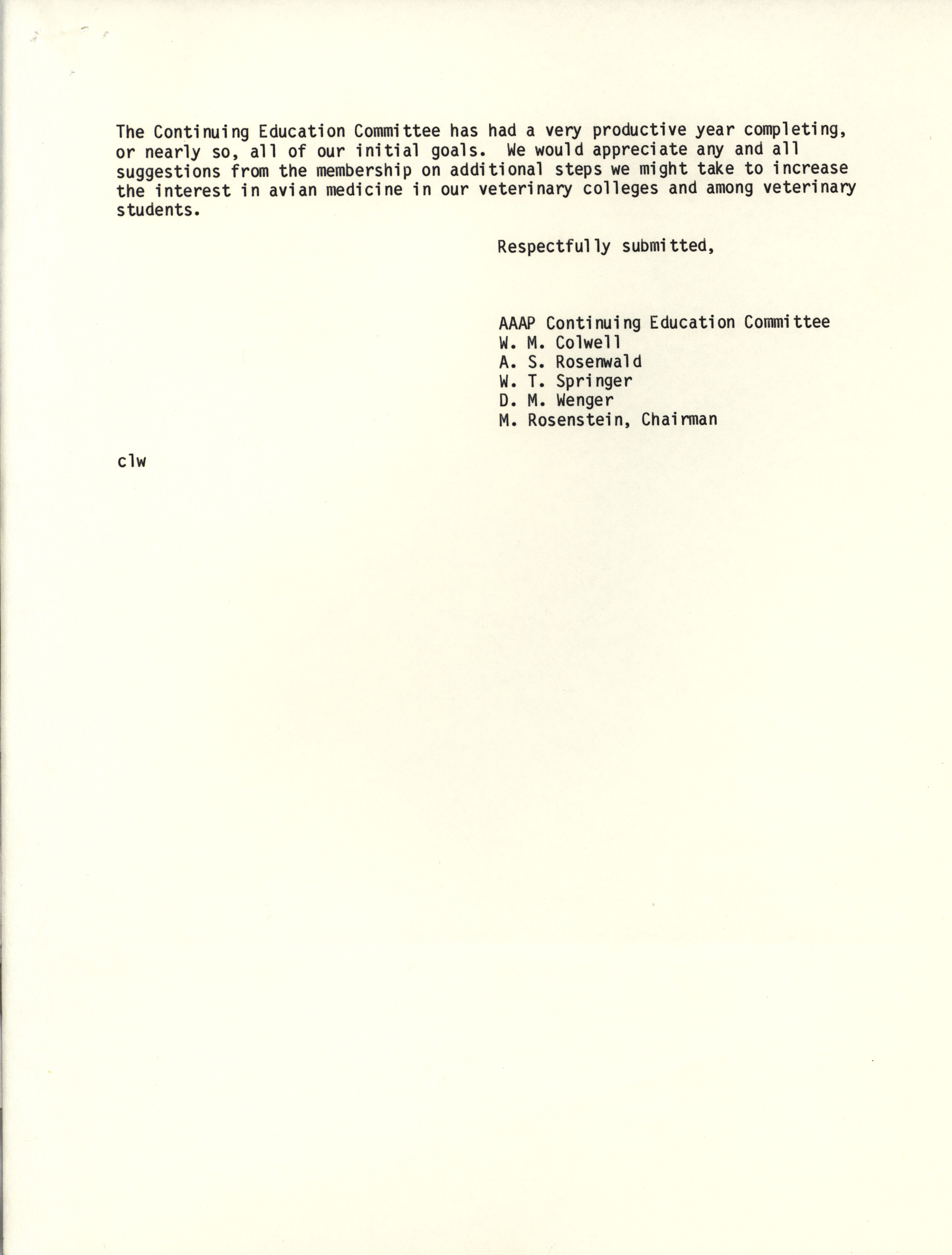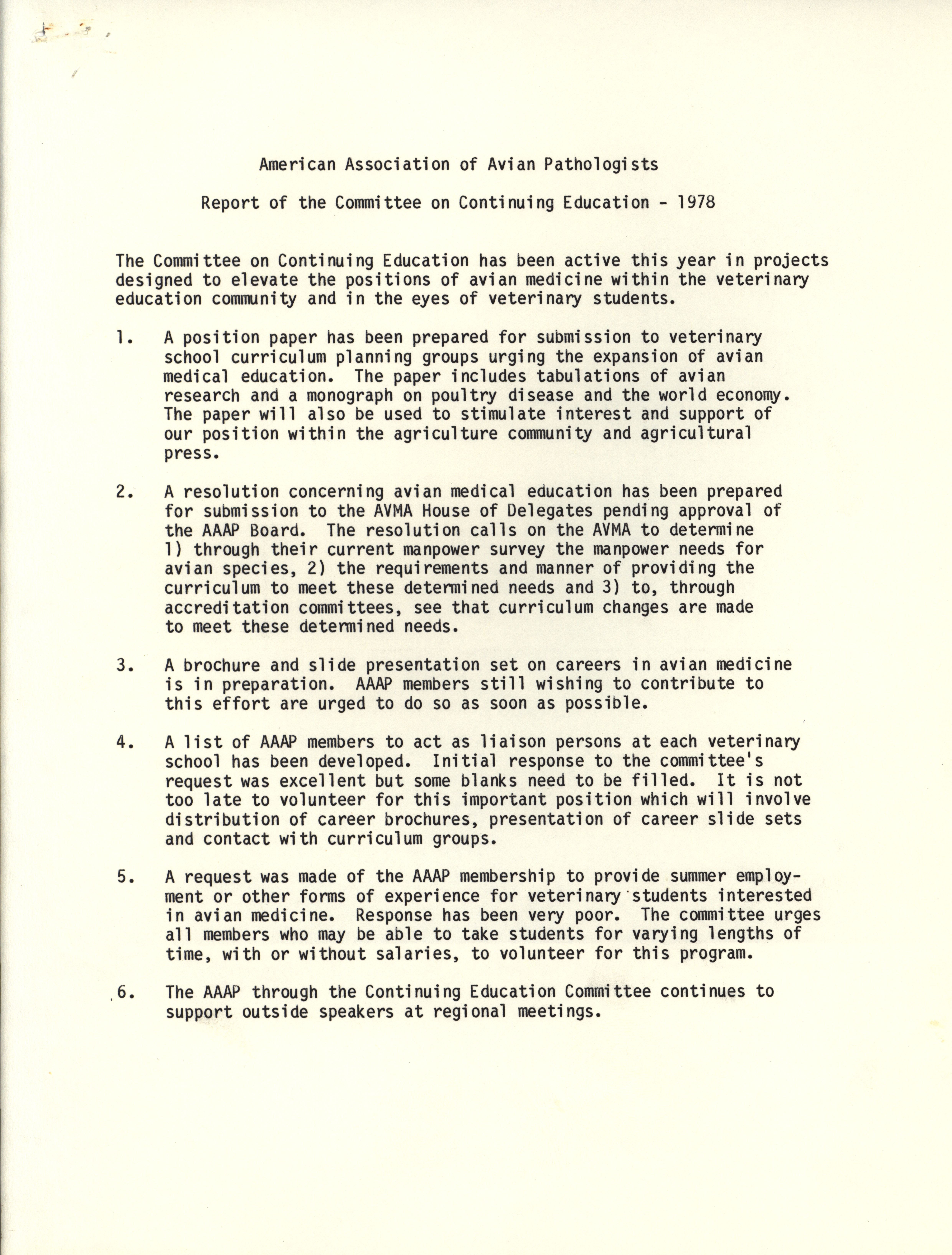 - "American Association of Avian Pathologists report of the committee on continuing education, 1978", American Association of Avian Pathologists Collection, Iowa State University Library Digital Collections