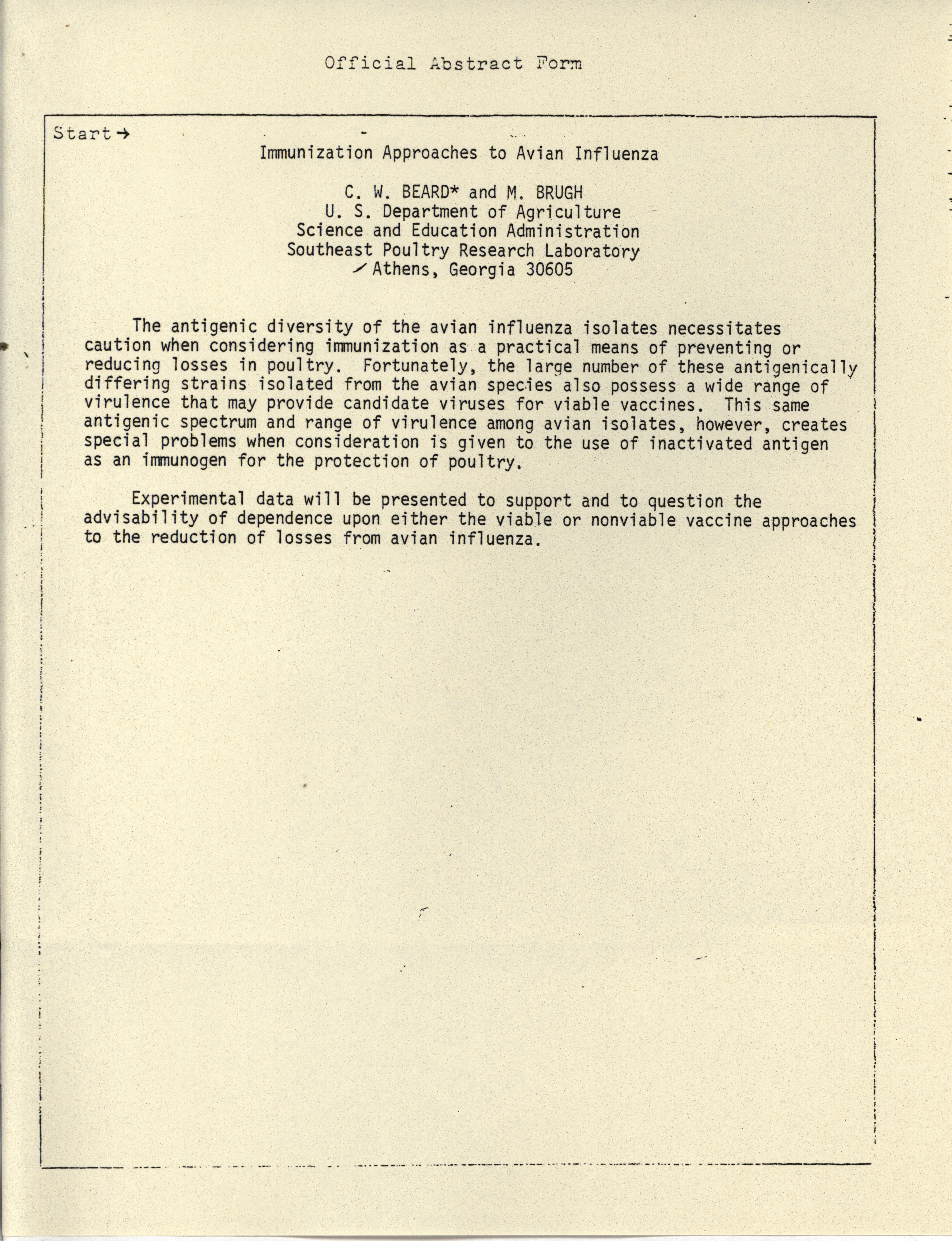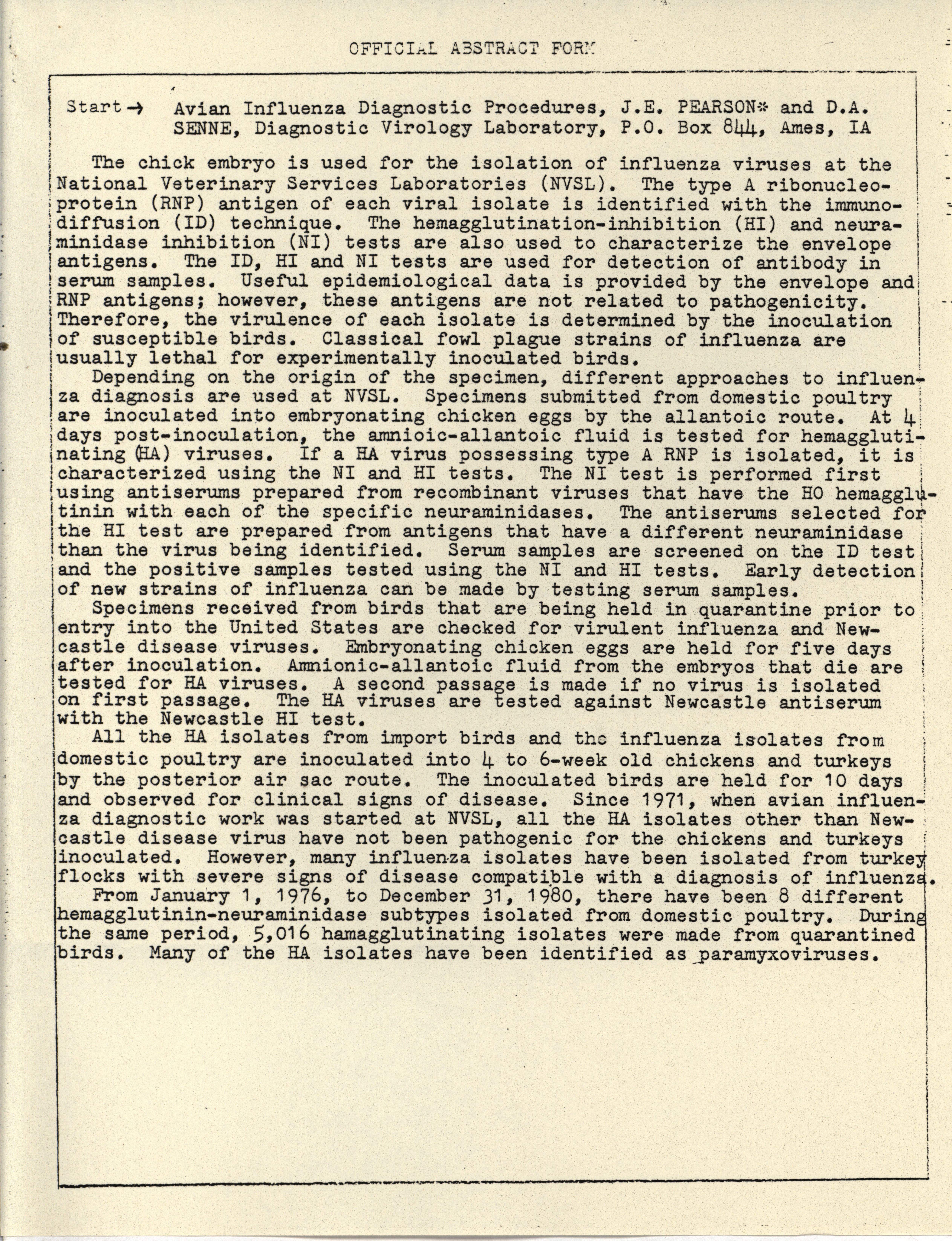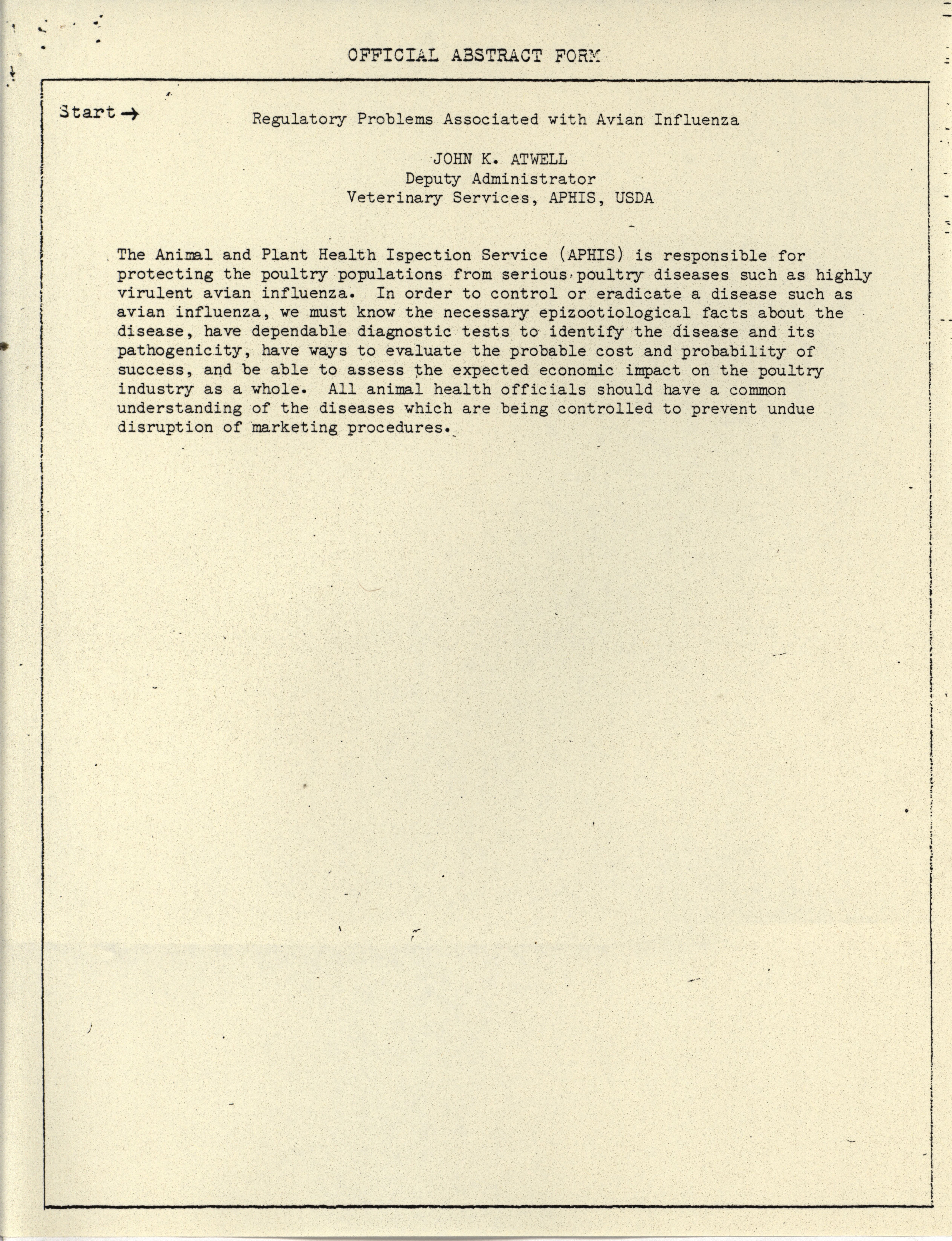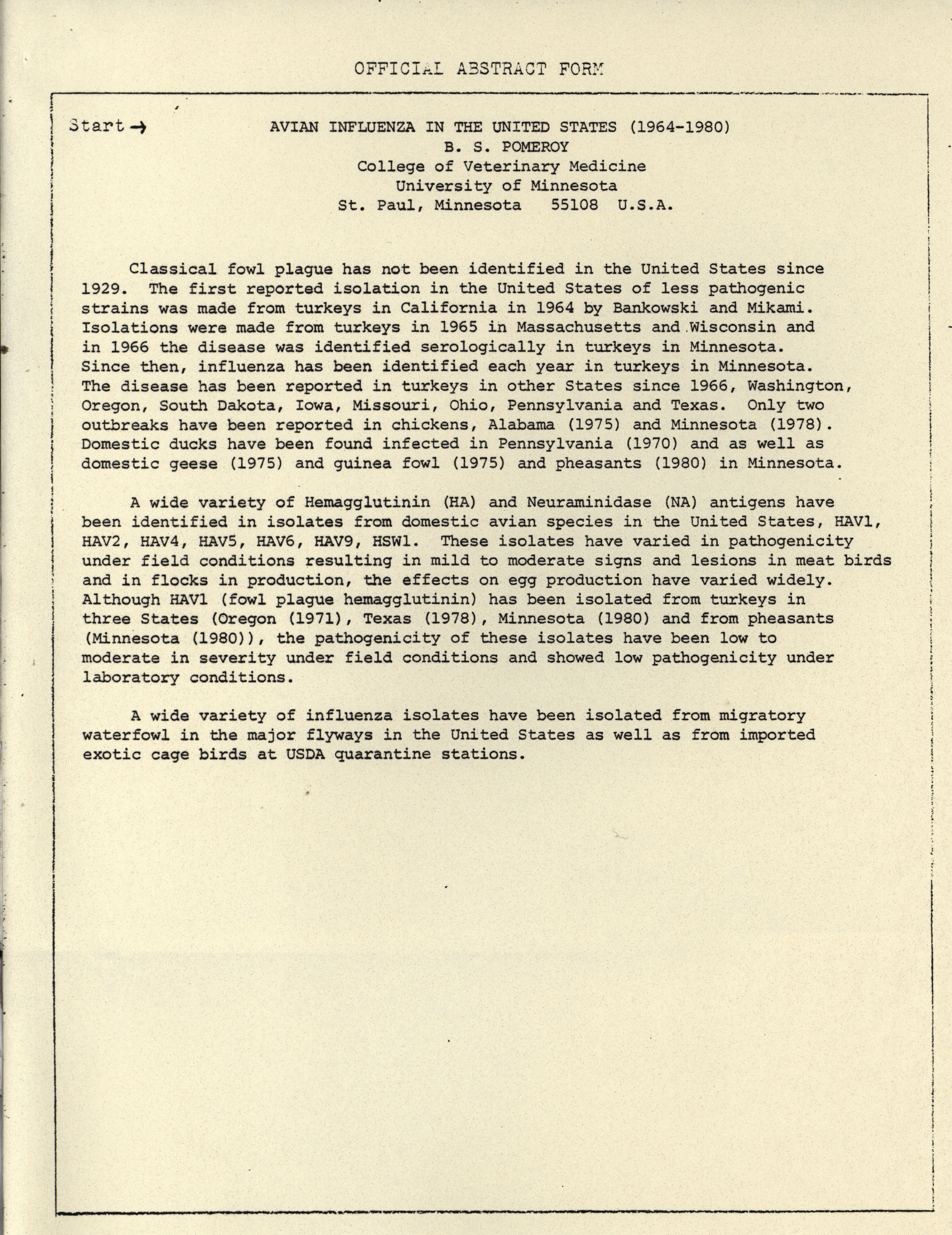 - "American Association of Avian Pathologists first international symposium on avian influenza abstracts, April 22-24, 1981", American Association of Avian Pathologists Collection, Iowa State University Library Digital Collections