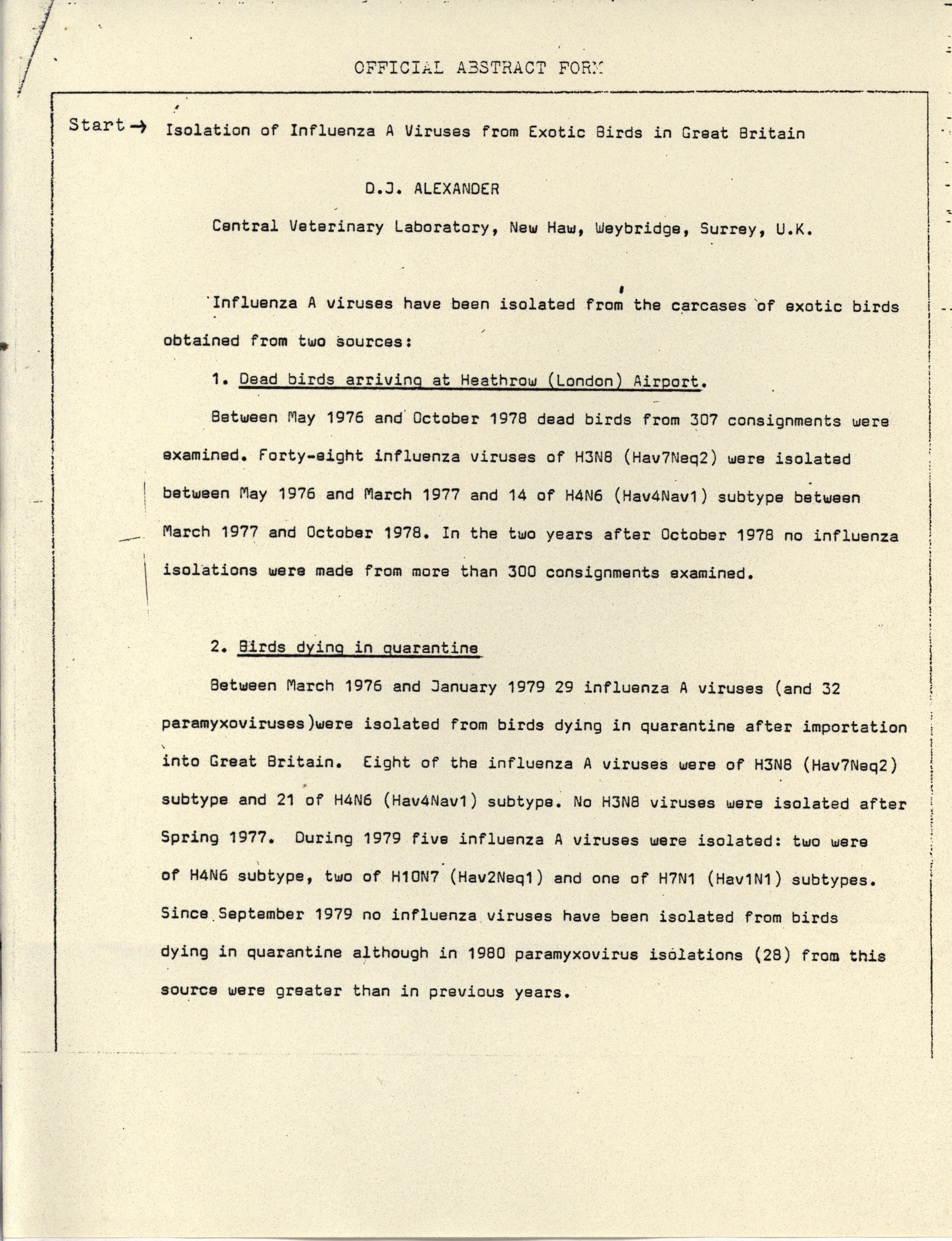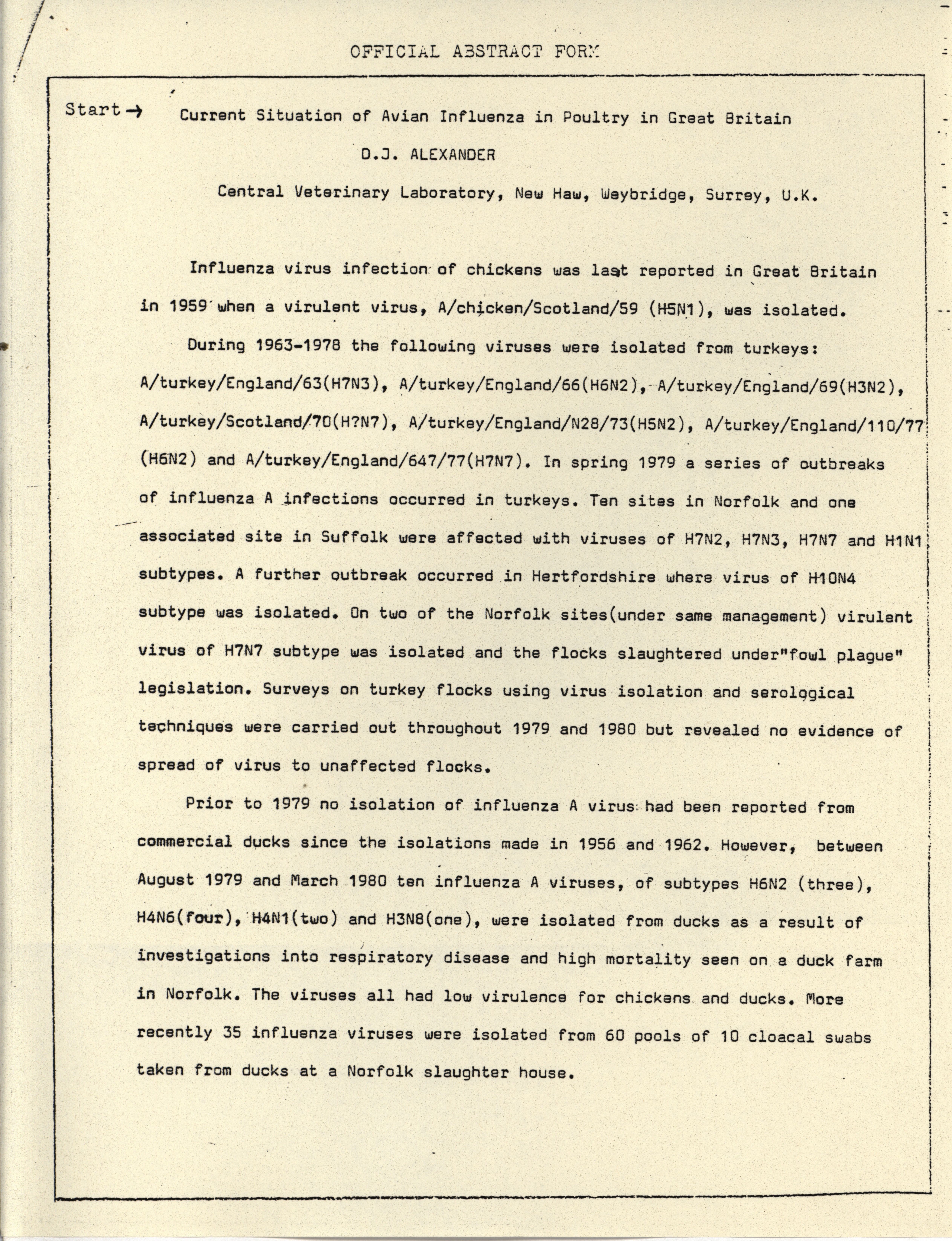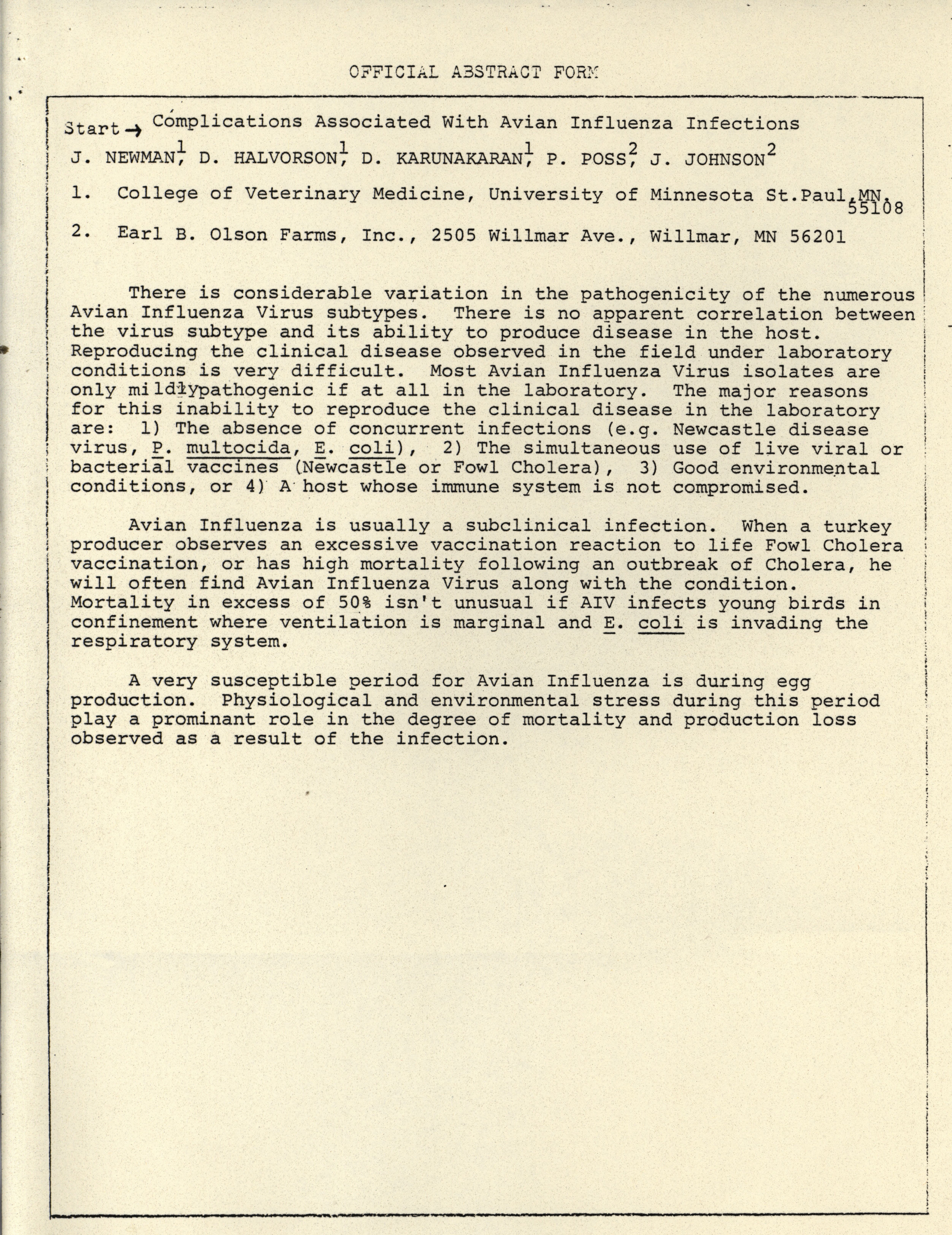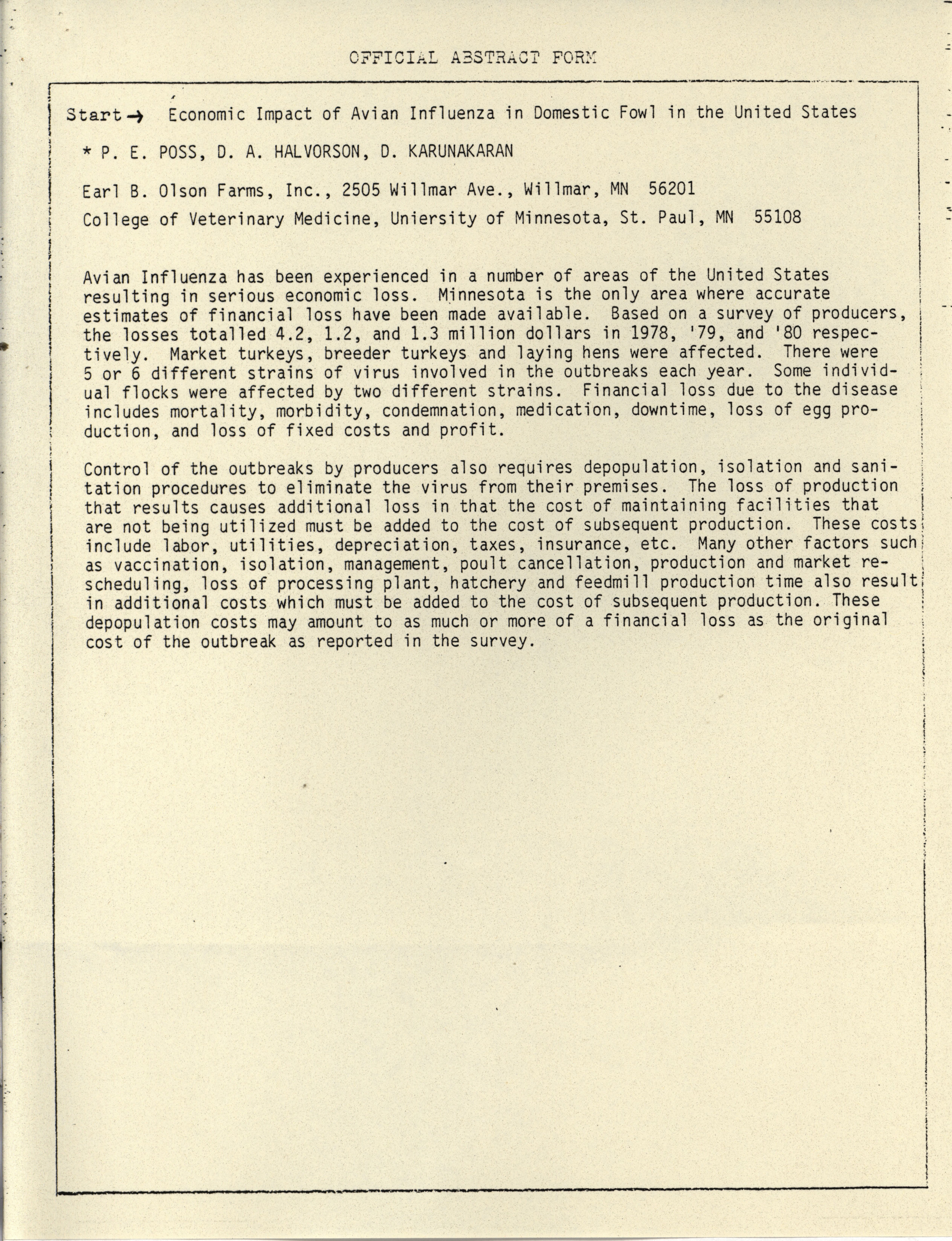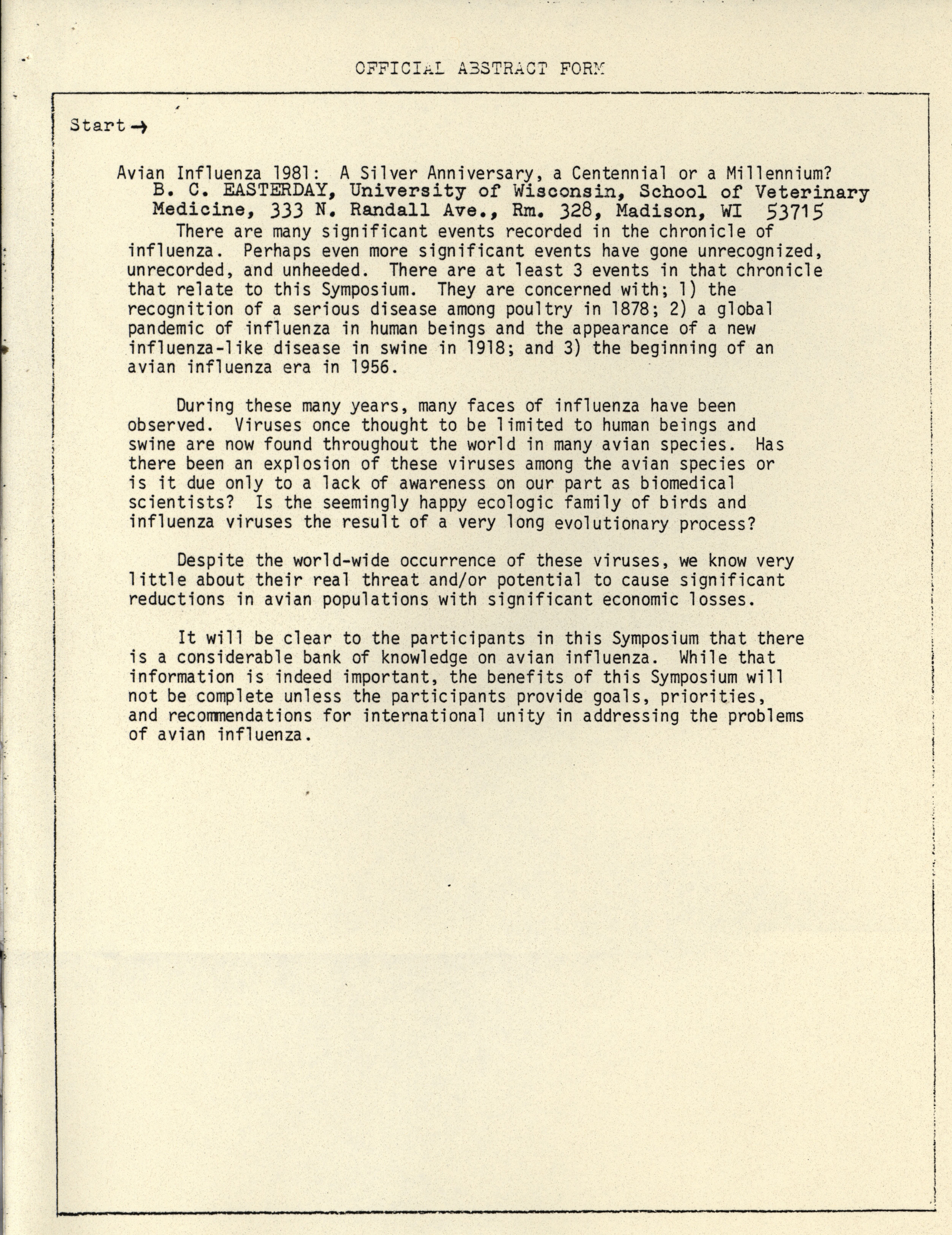 - "American Association of Avian Pathologists first international symposium on avian influenza abstracts, April 22-24, 1981", American Association of Avian Pathologists Collection, Iowa State University Library Digital Collections