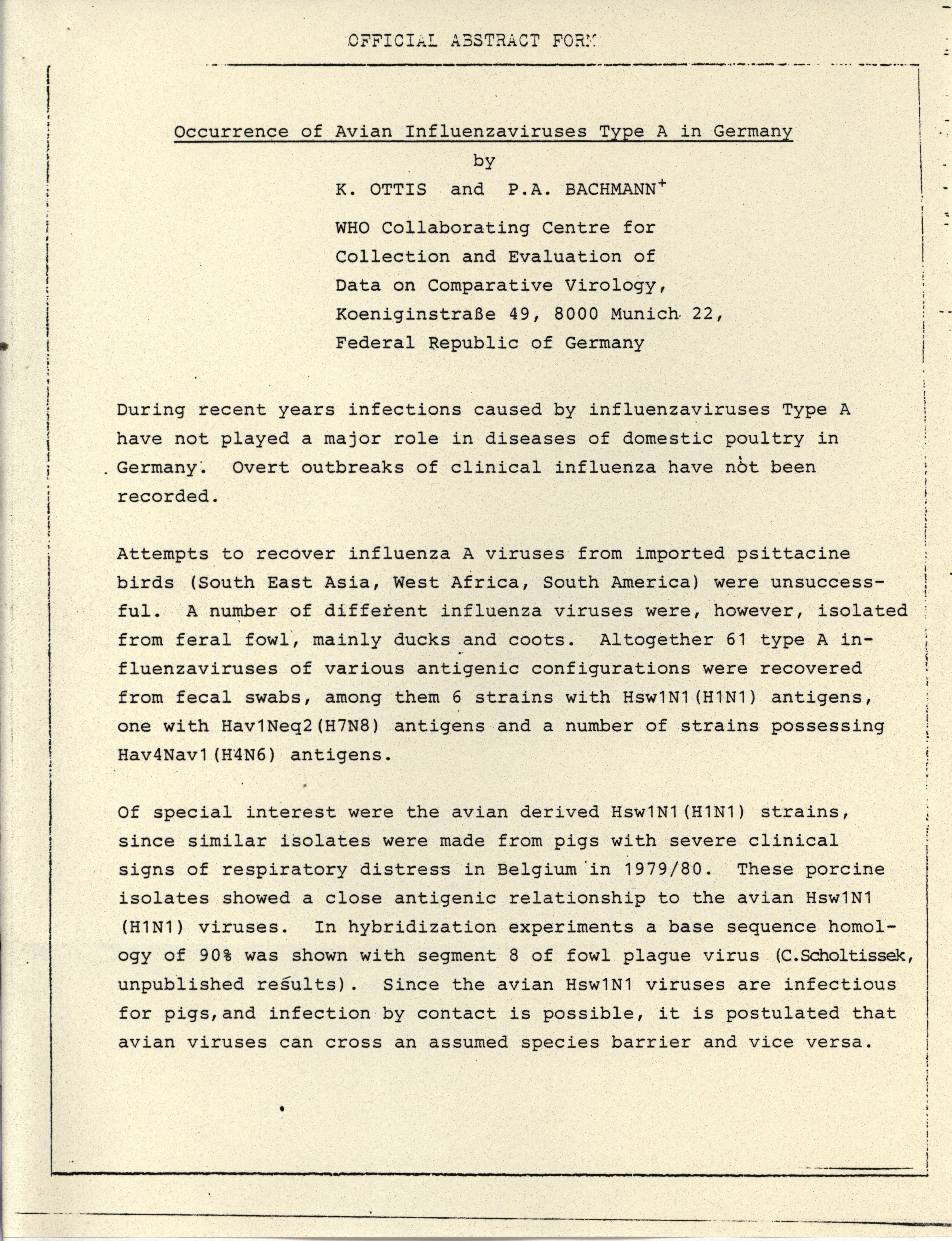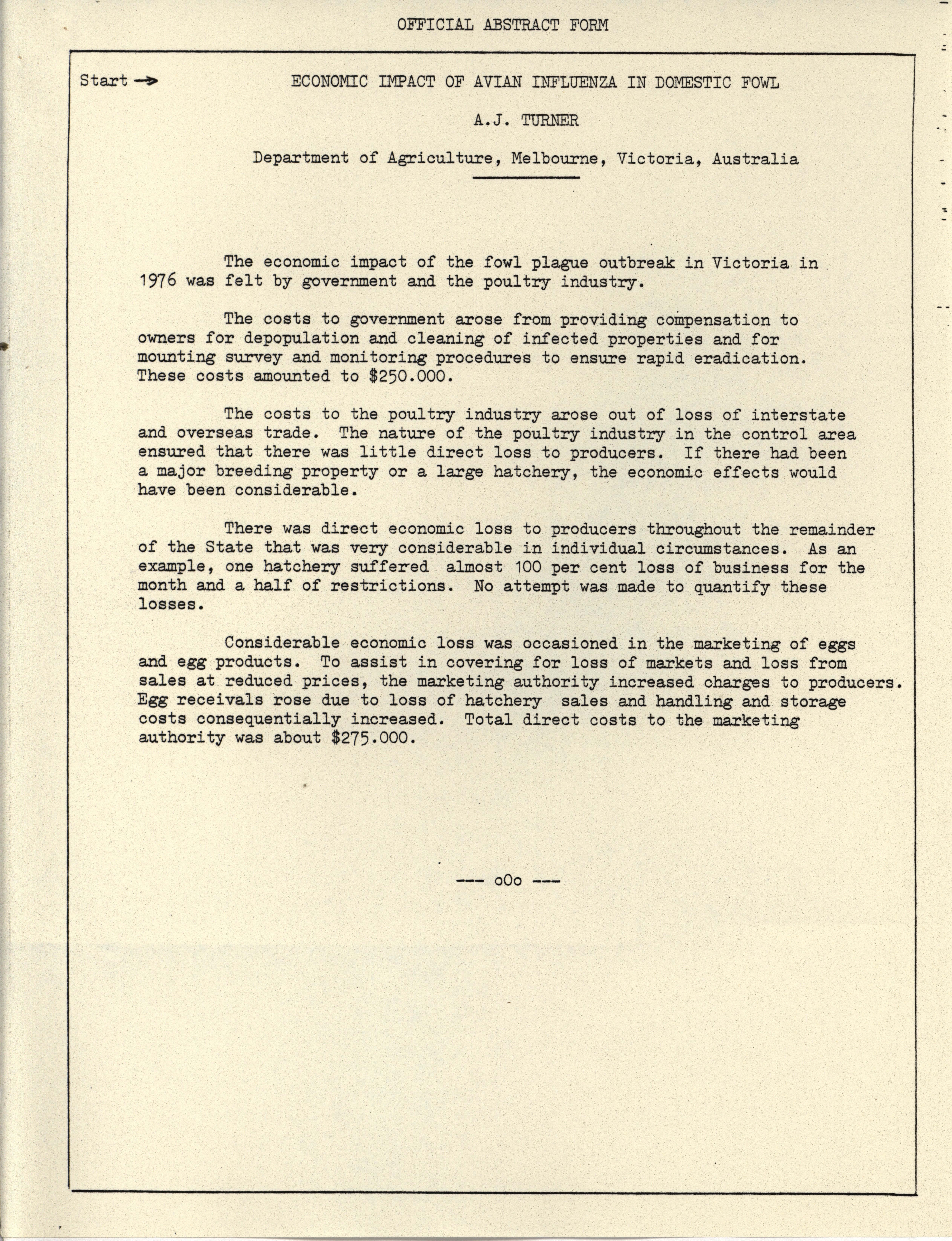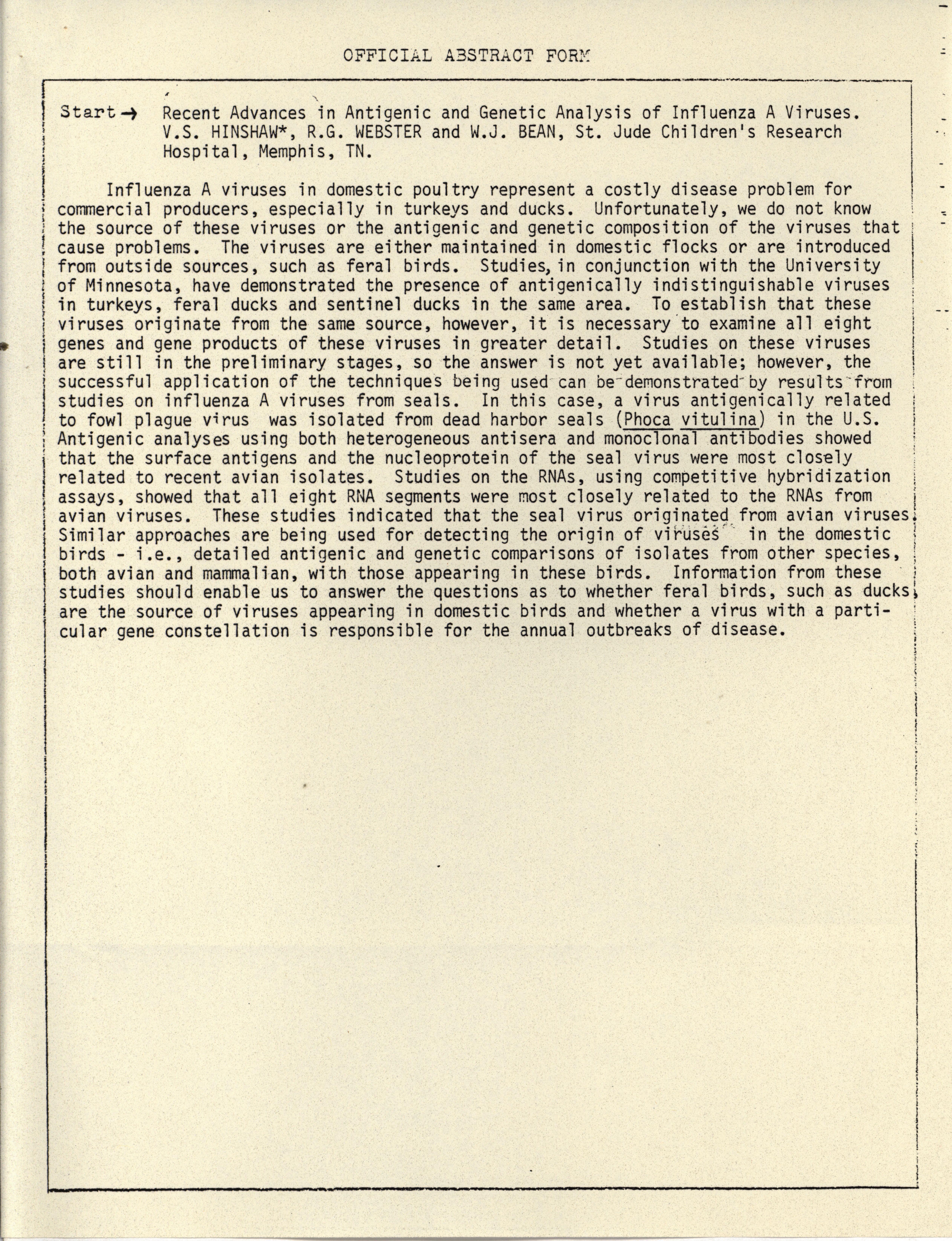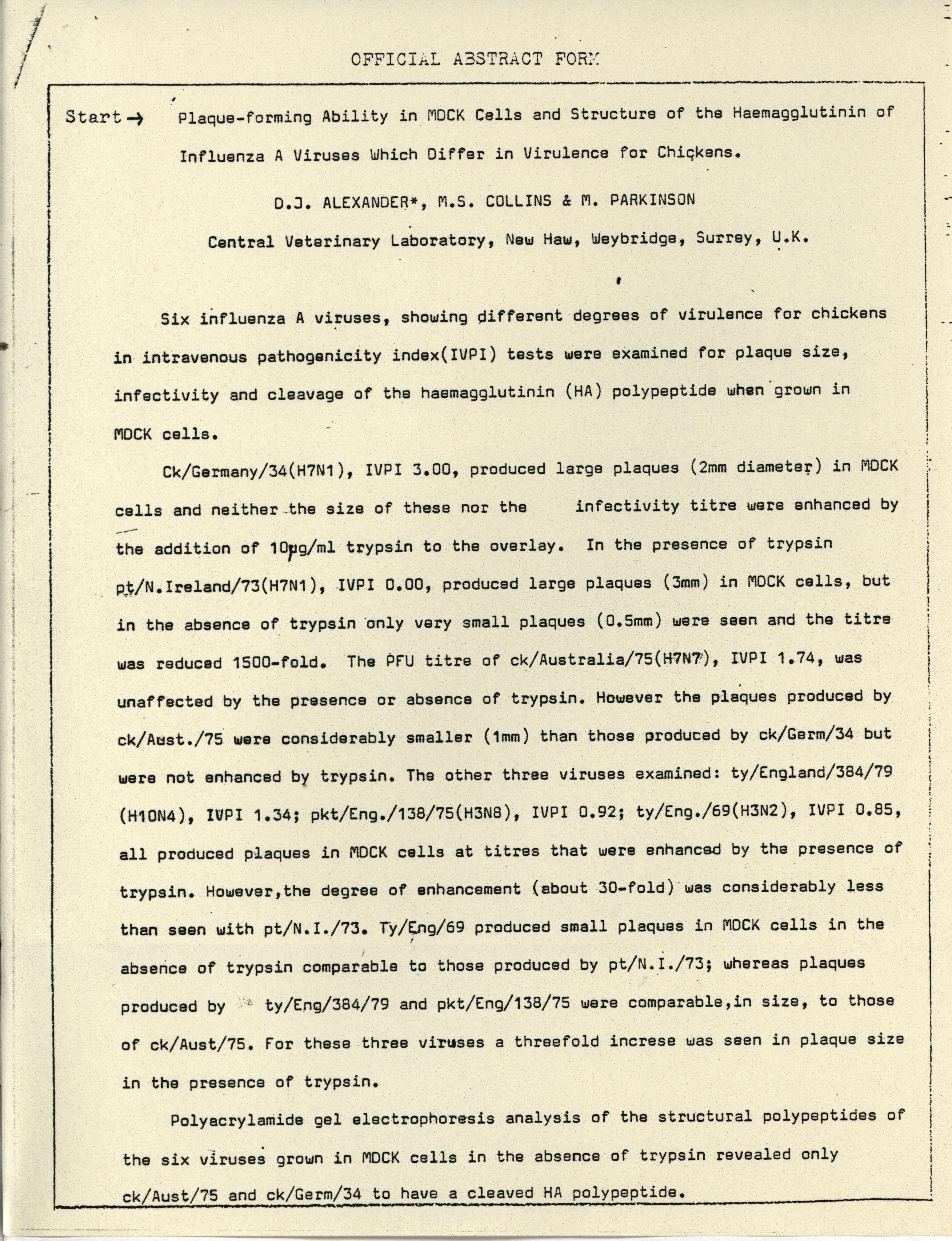 - "American Association of Avian Pathologists first international symposium on avian influenza abstracts, April 22-24, 1981", American Association of Avian Pathologists Collection, Iowa State University Library Digital Collections