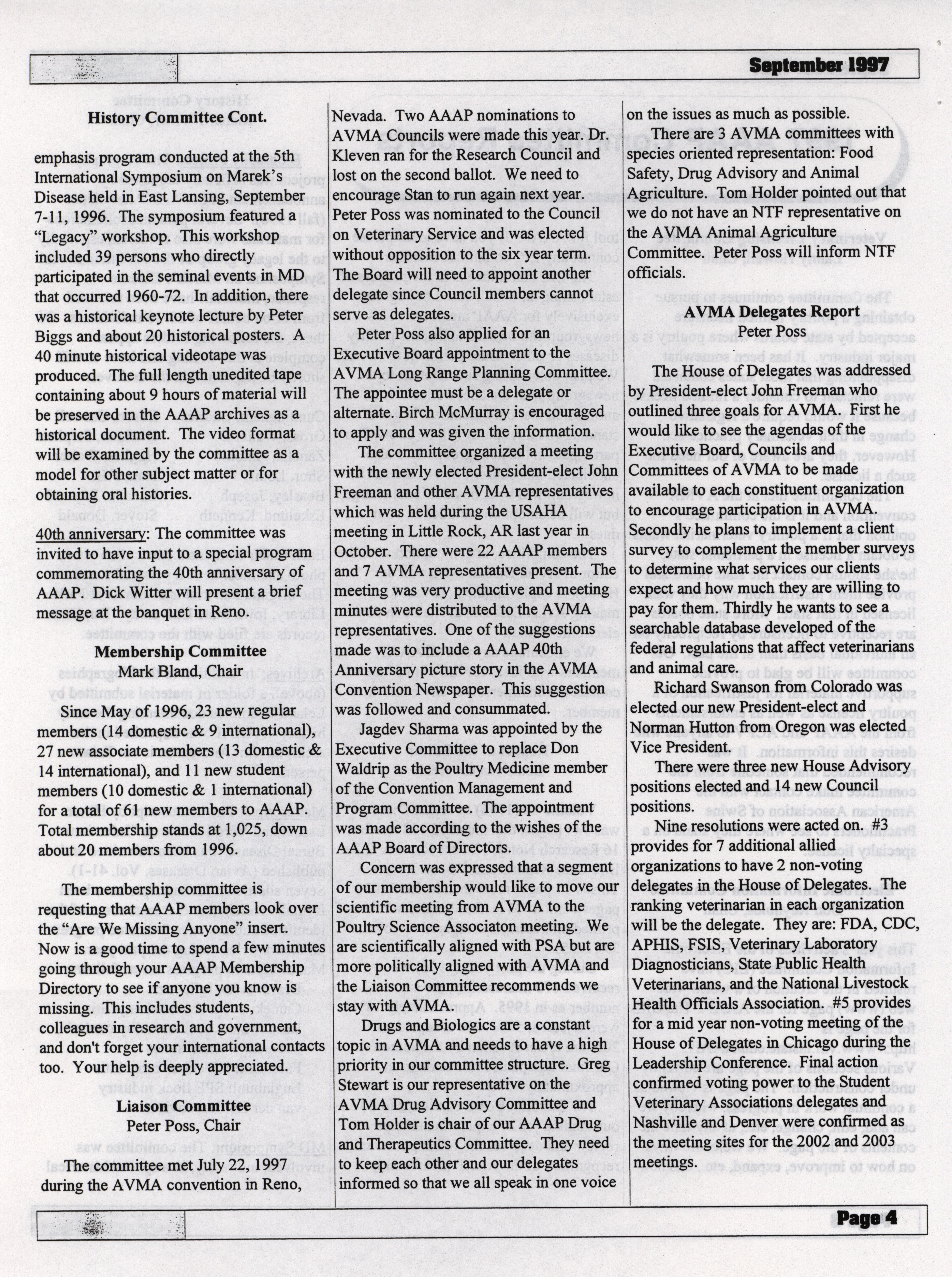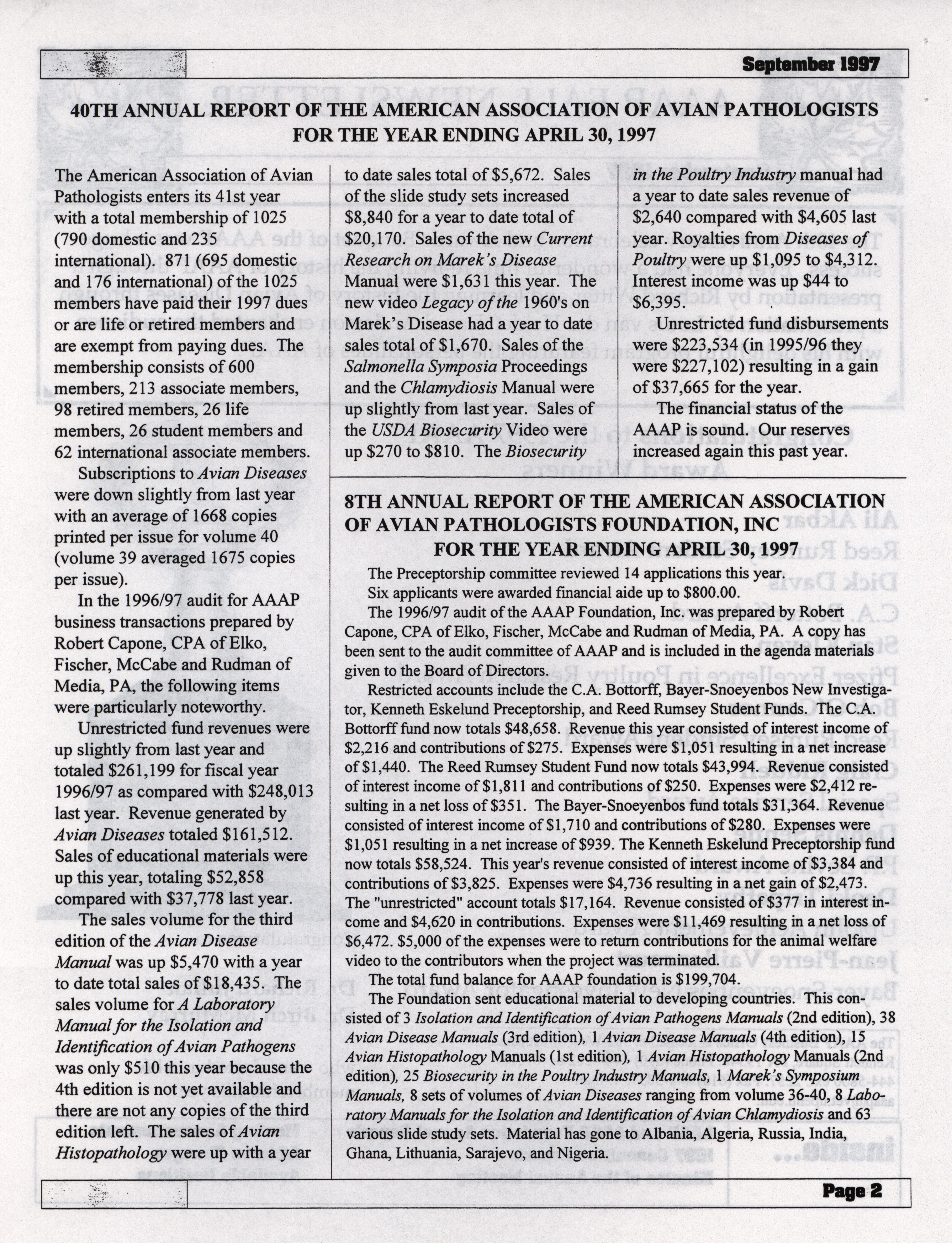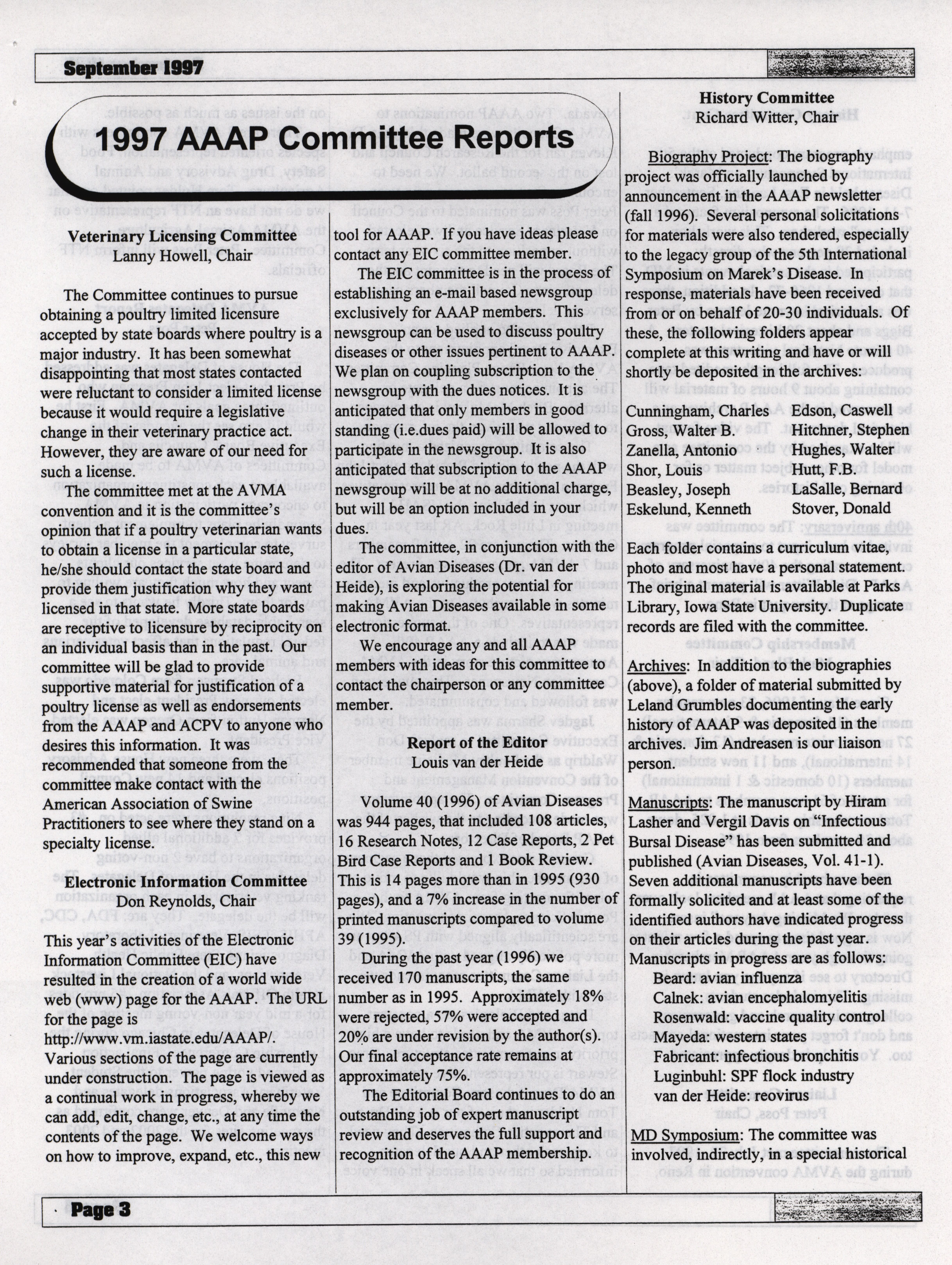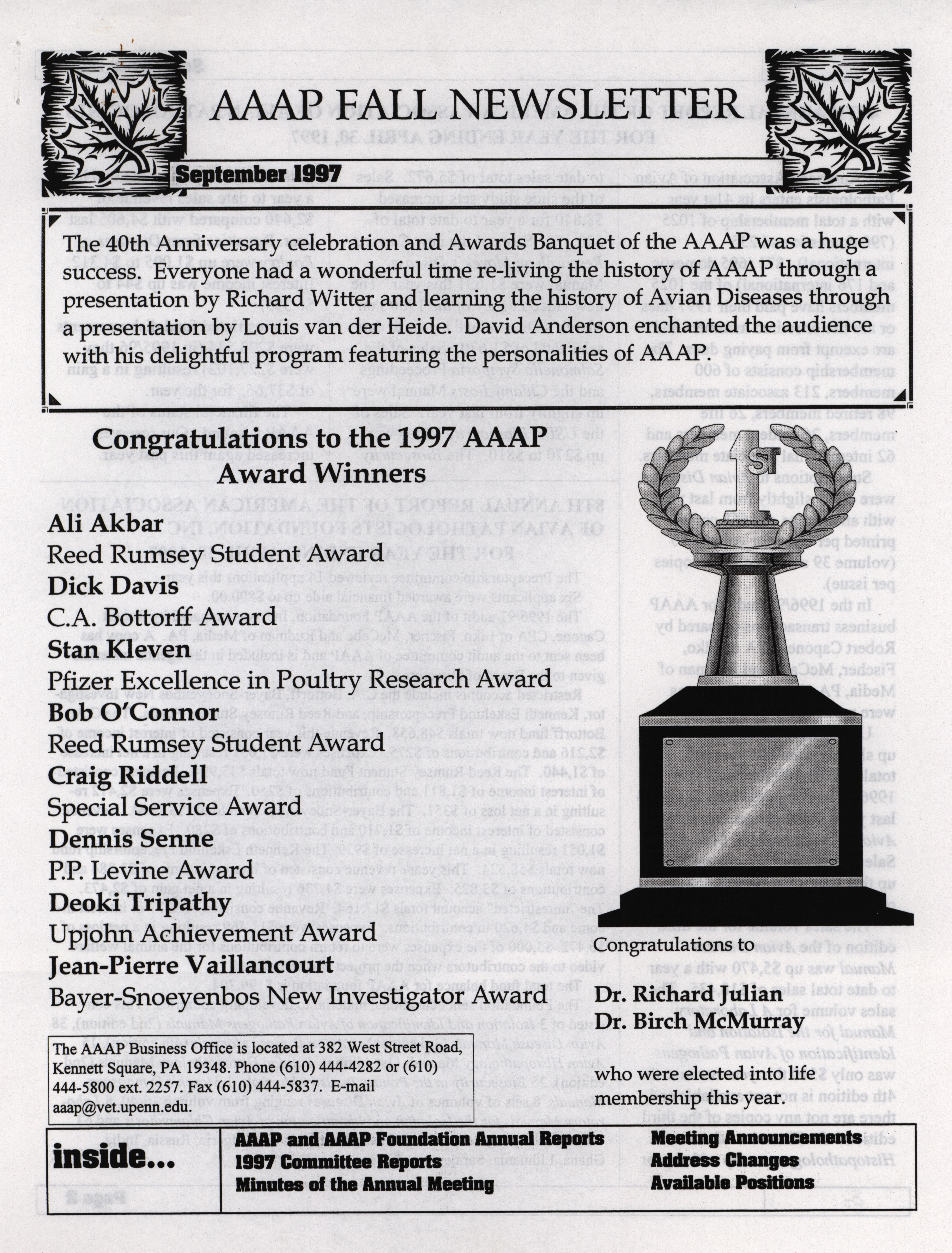 - The fall newsletter of the American Association of Avian Pathologists, September 1997. The quarterly newsletter features several different topics, including AAAP and AAAP foundation annual reports, 1997 committee reports, and minutes of the 40th annual meeting of the AAAP.