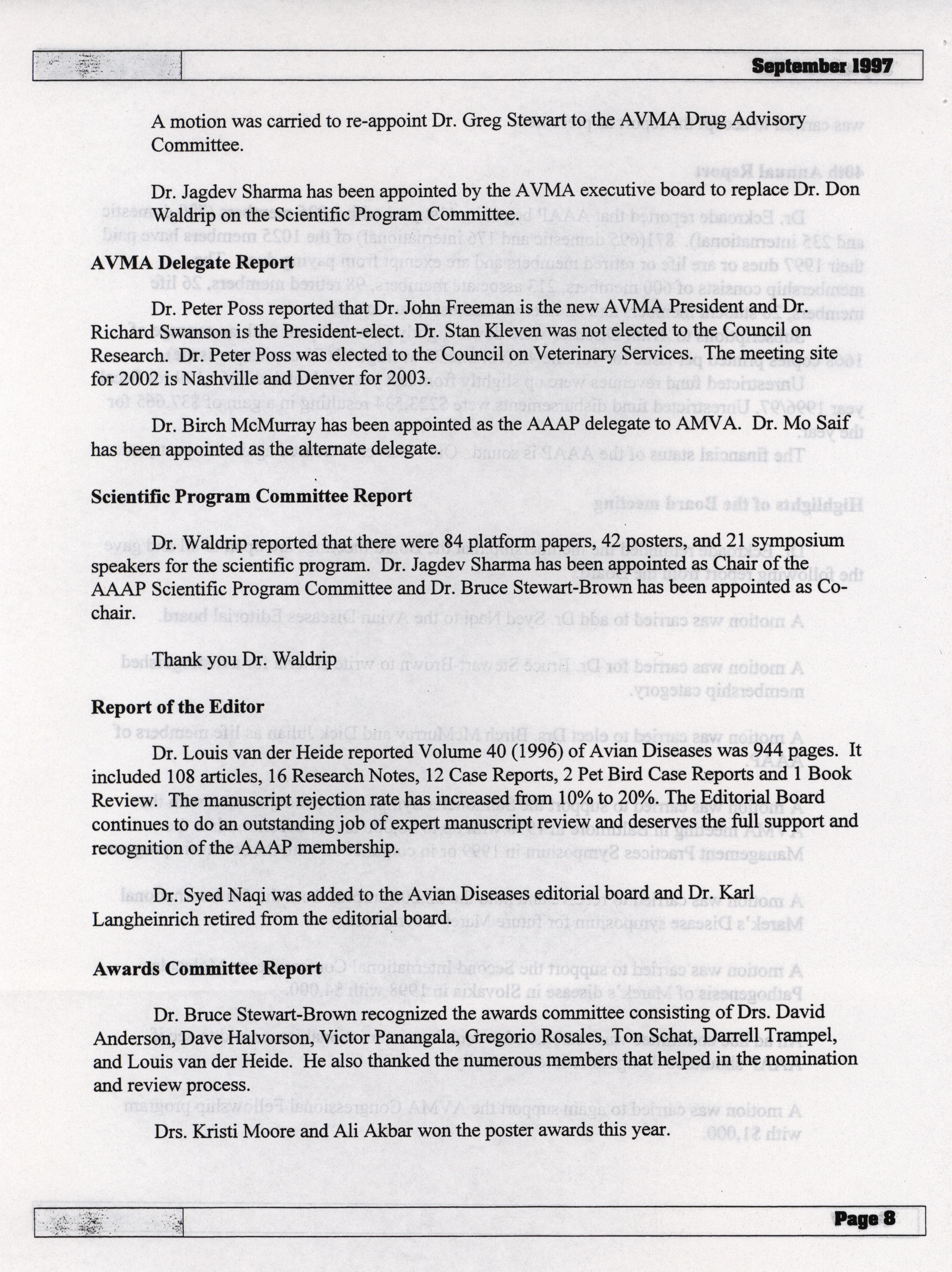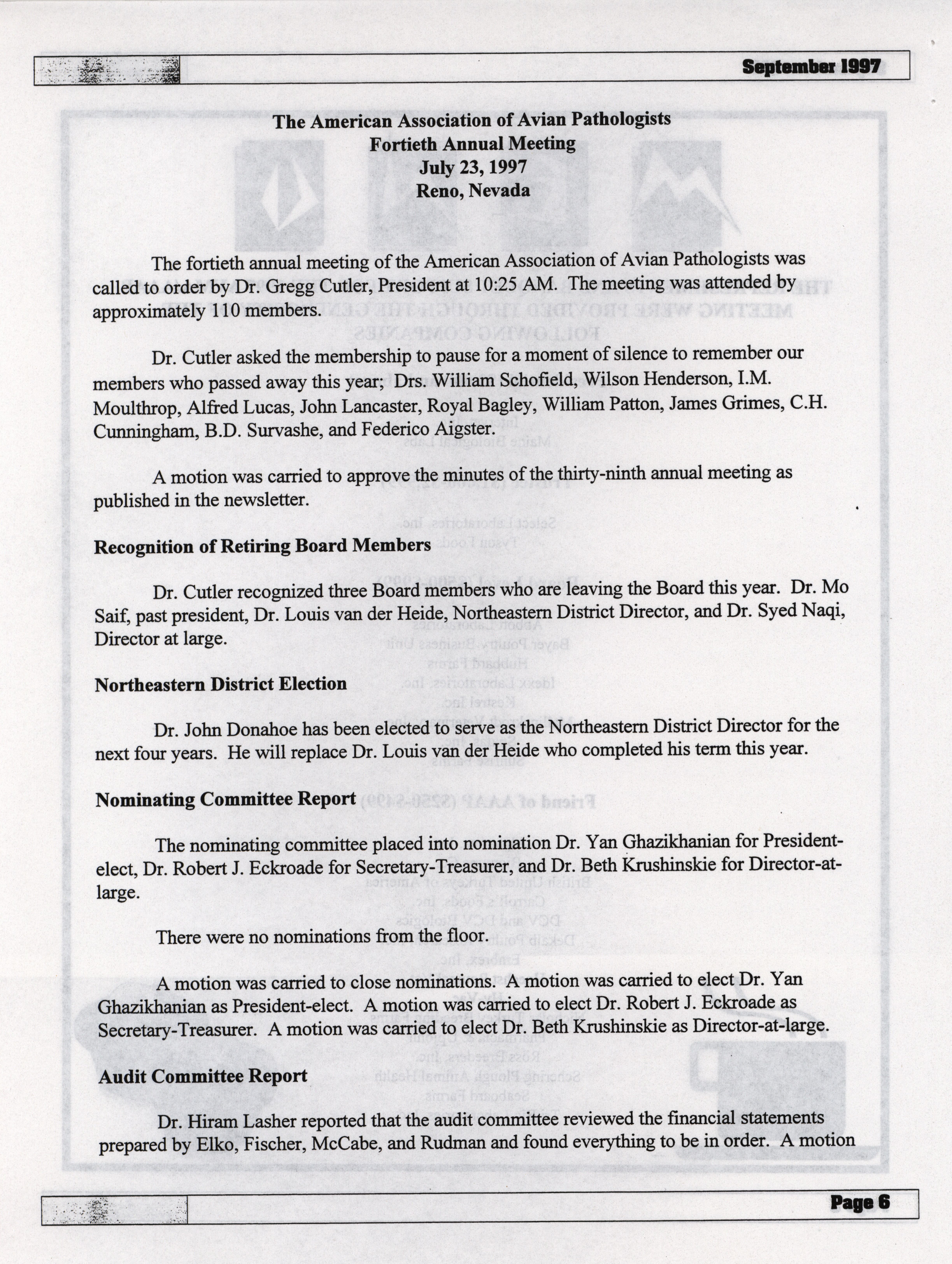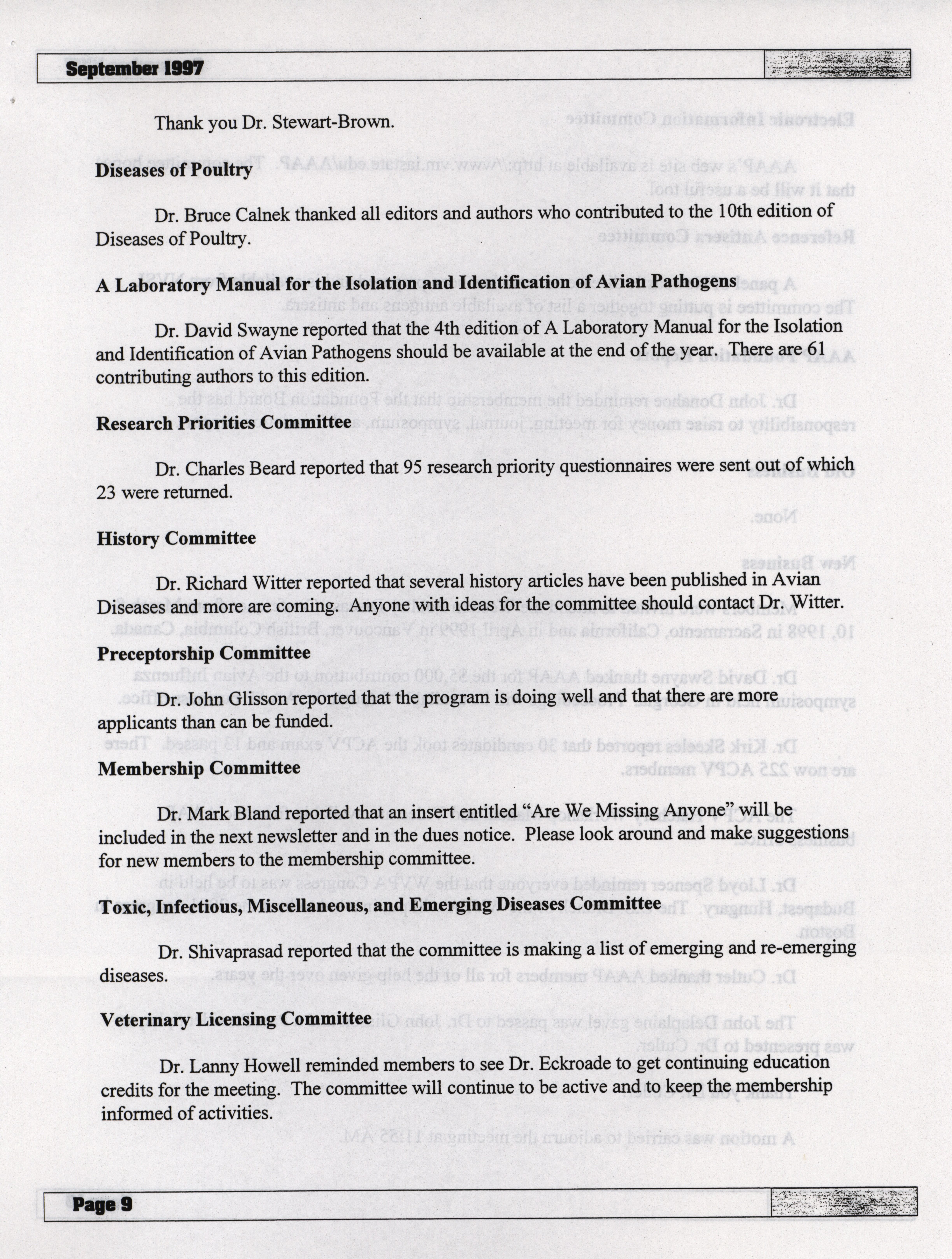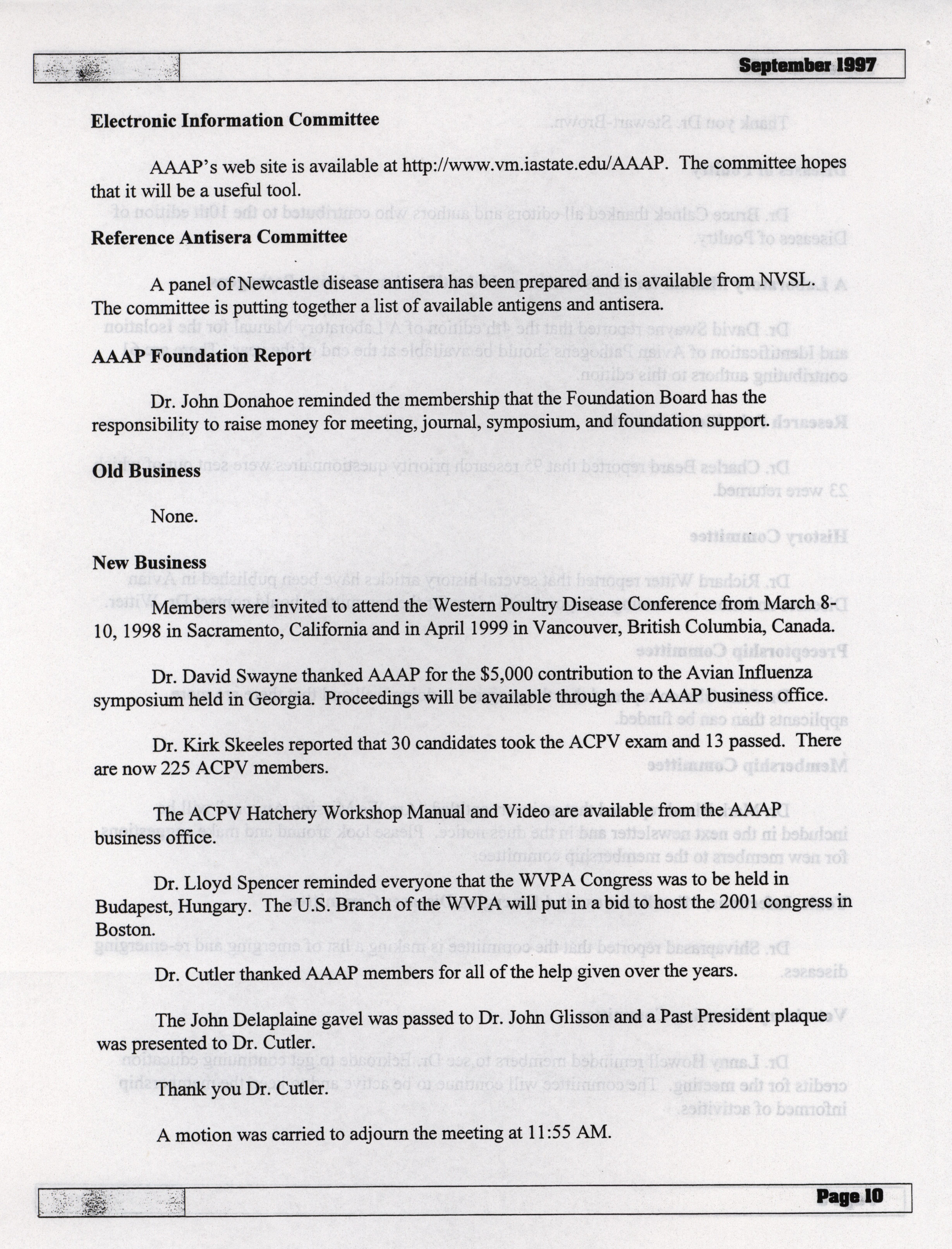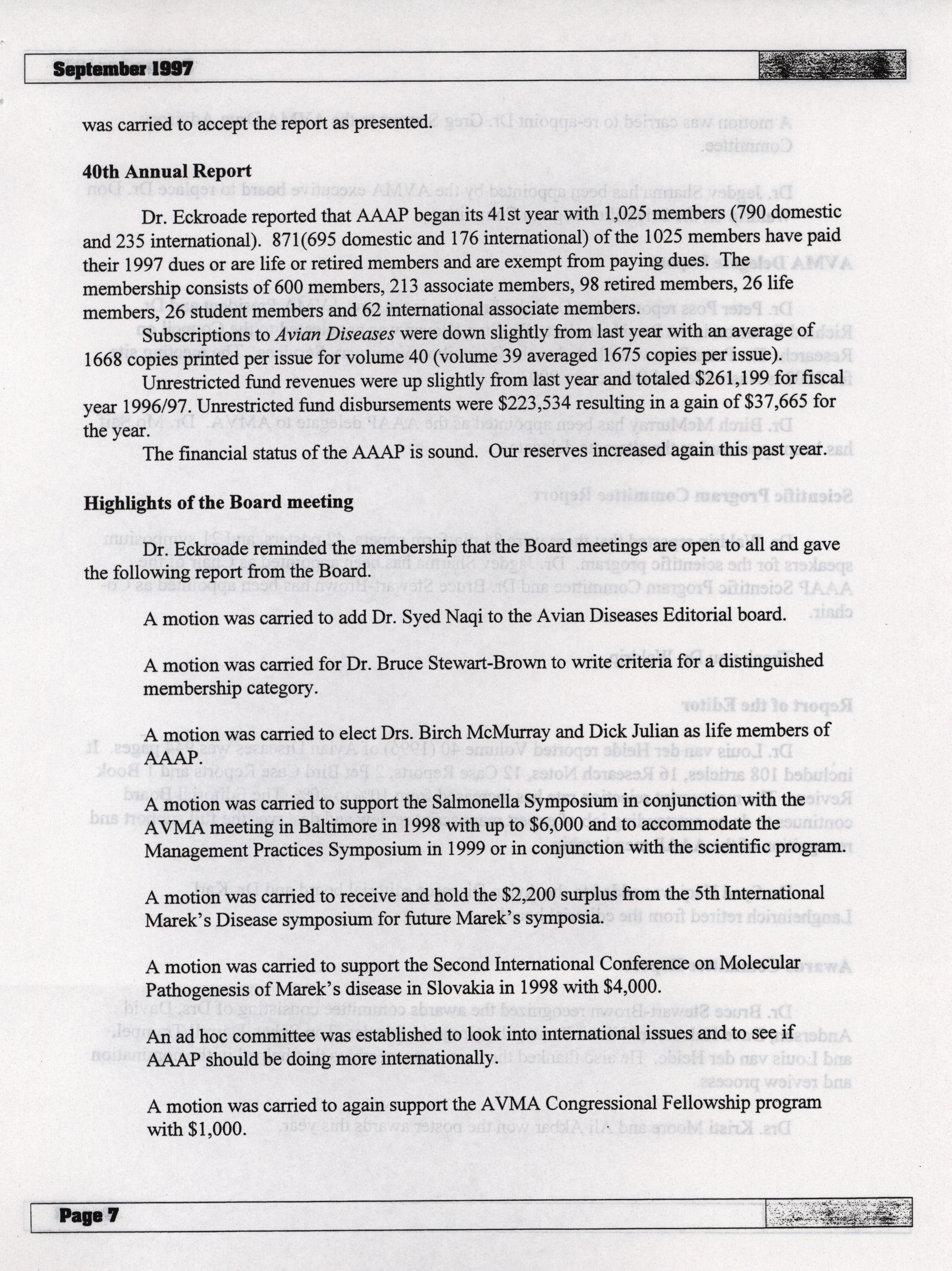 - The fall newsletter of the American Association of Avian Pathologists, September 1997. The quarterly newsletter features several different topics, including AAAP and AAAP foundation annual reports, 1997 committee reports, and minutes of the 40th annual meeting of the AAAP.