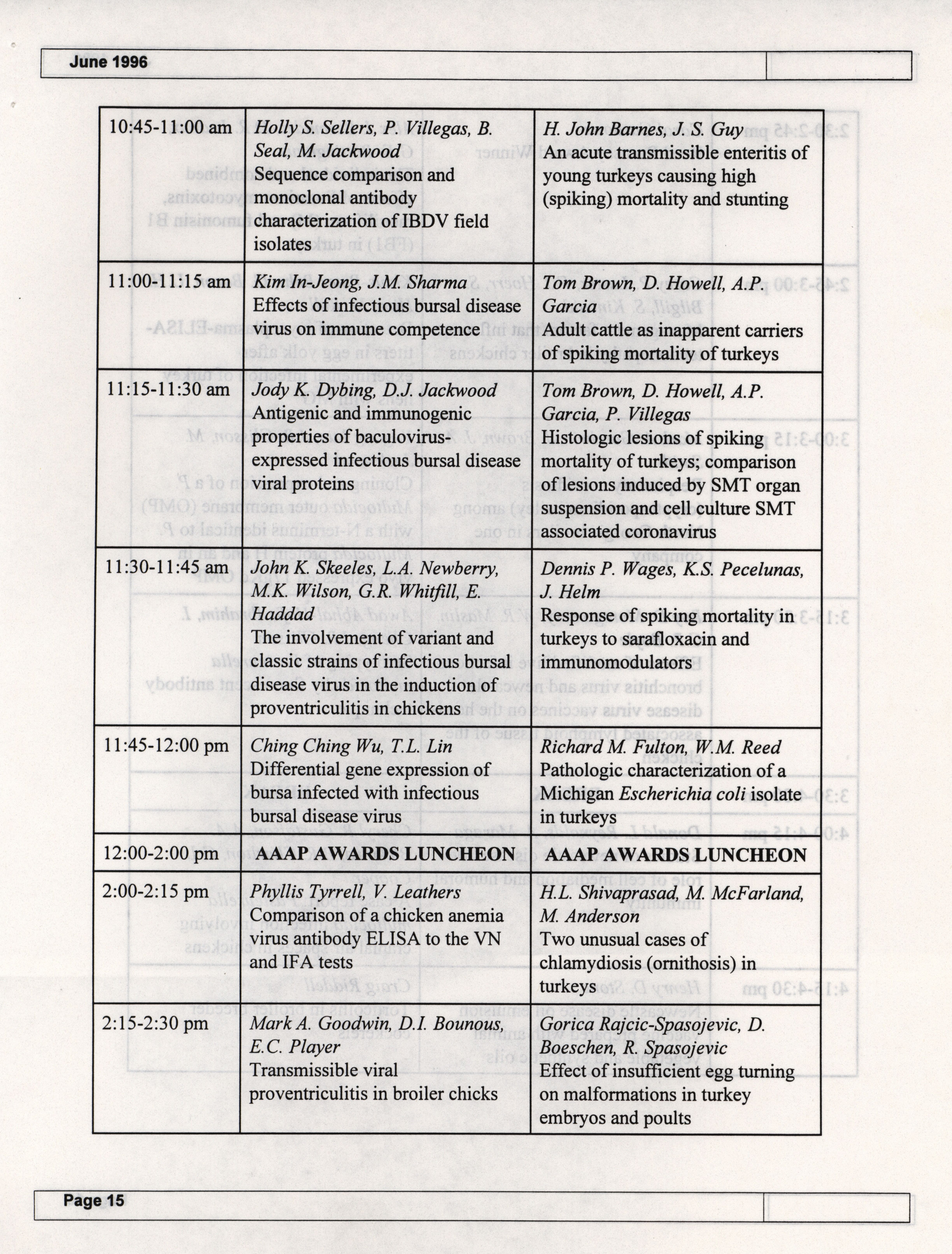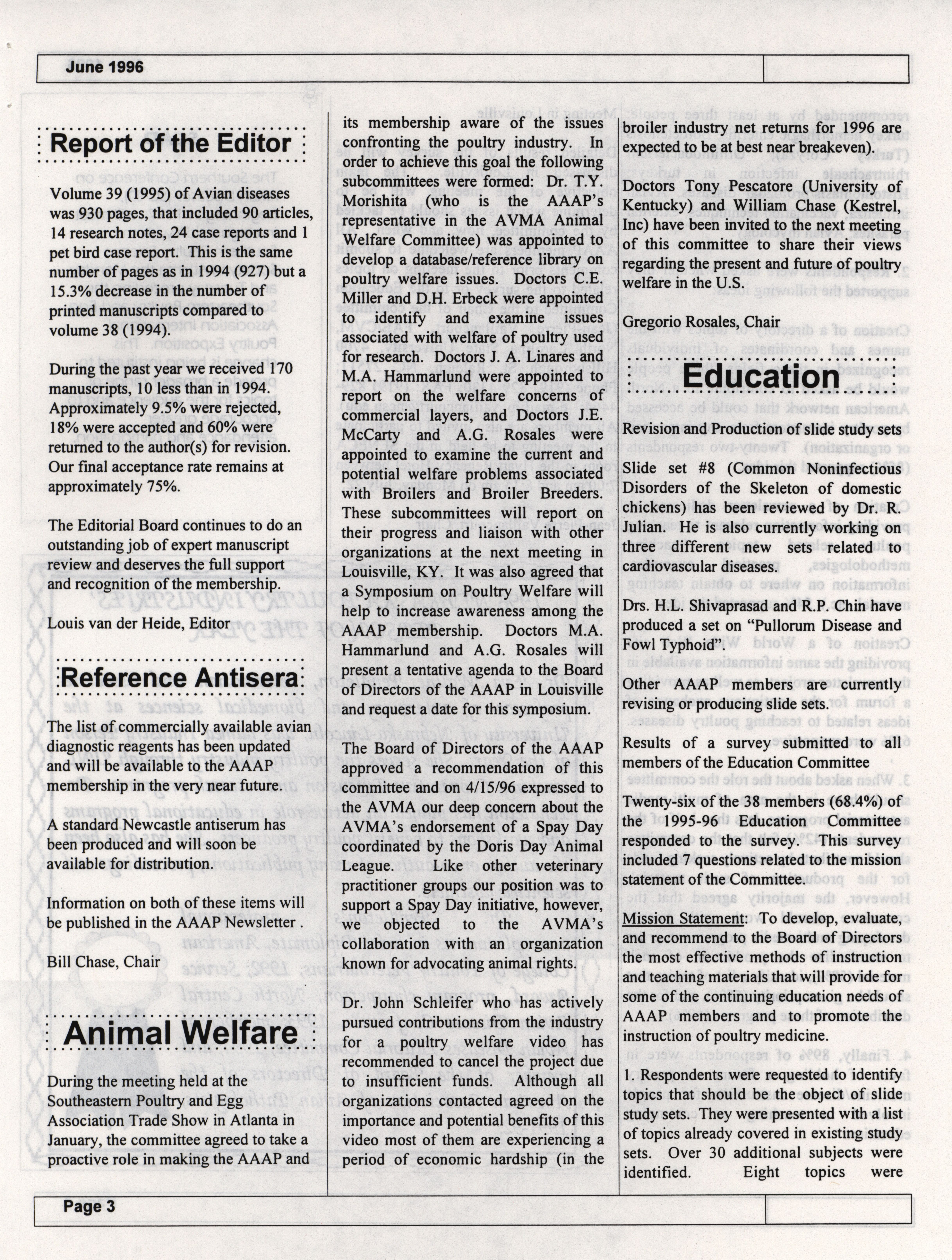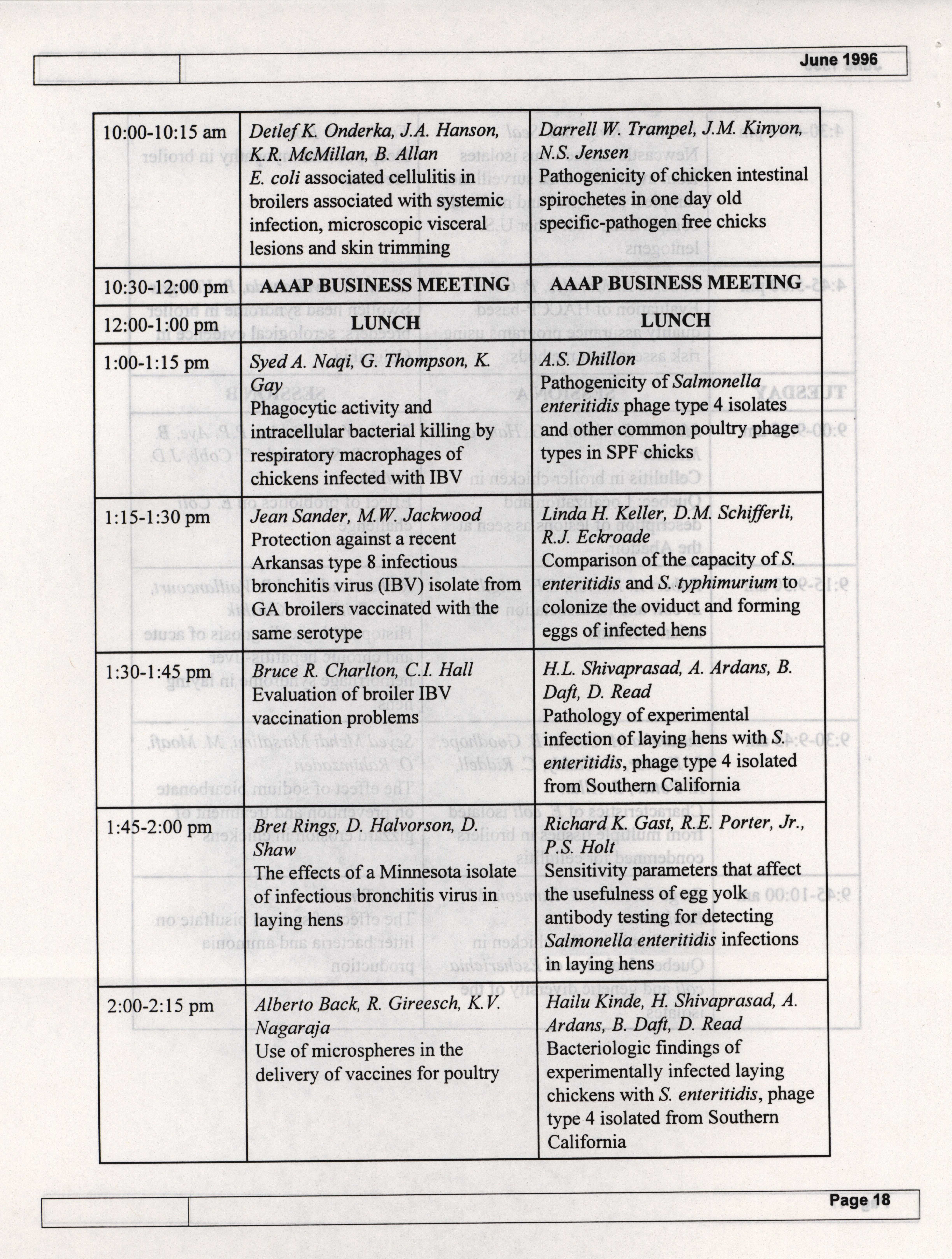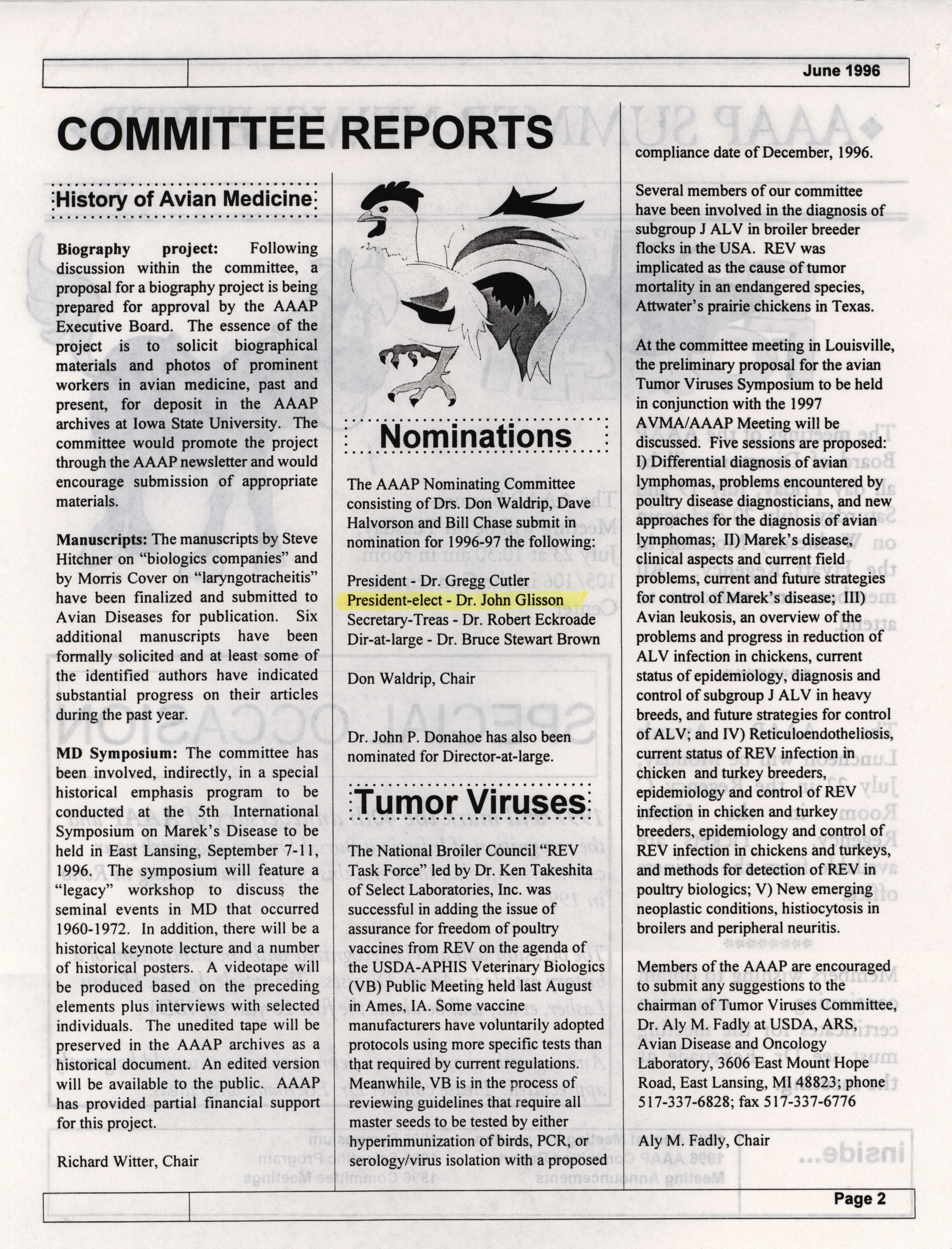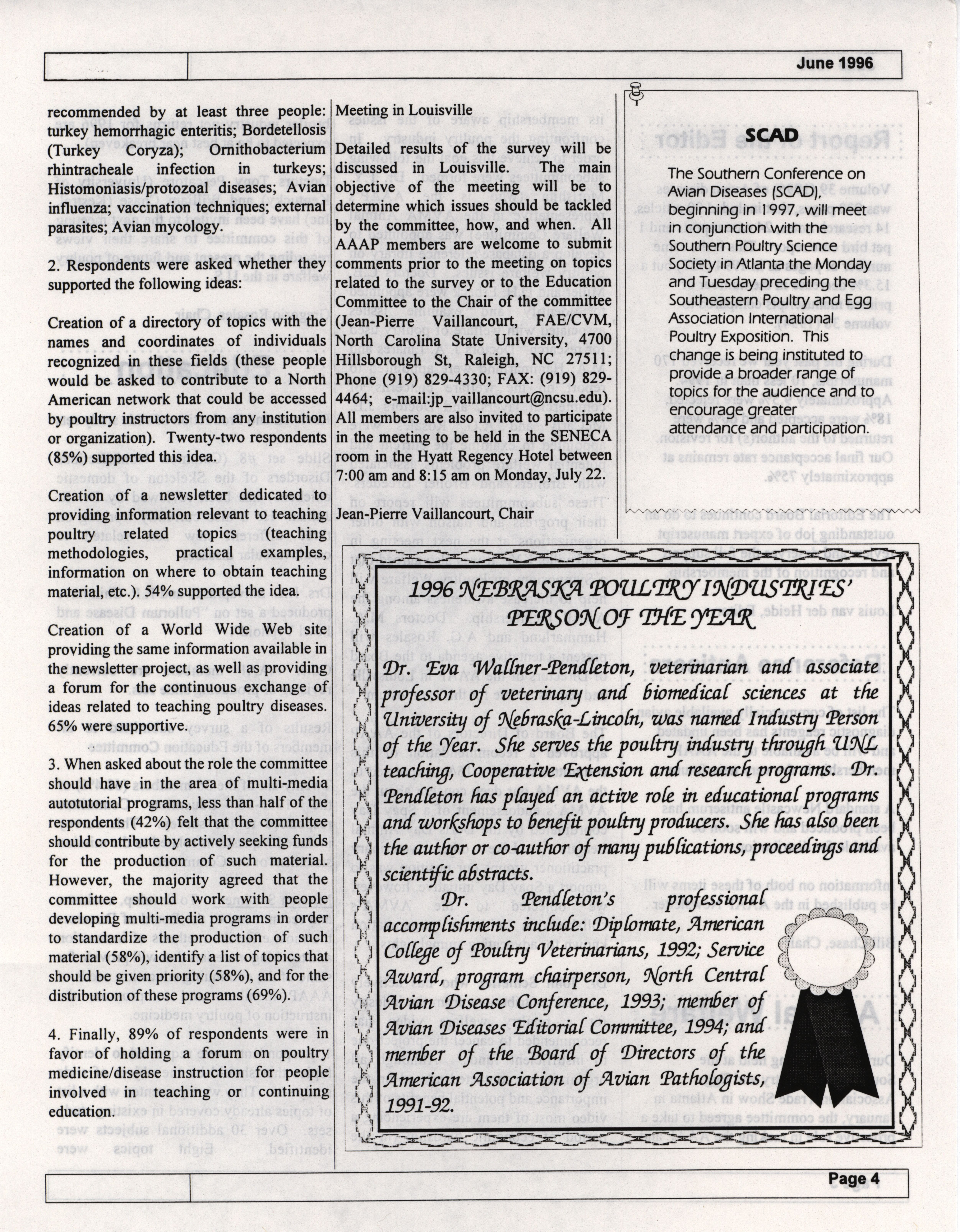 - The summer newsletter of the American Association of Avian Pathologists, June 1996. The quarterly newsletter features several different topics, including 1996 annual meeting information and scientific program, 1996 AAAP committee reports and 1996 committee meetings.
